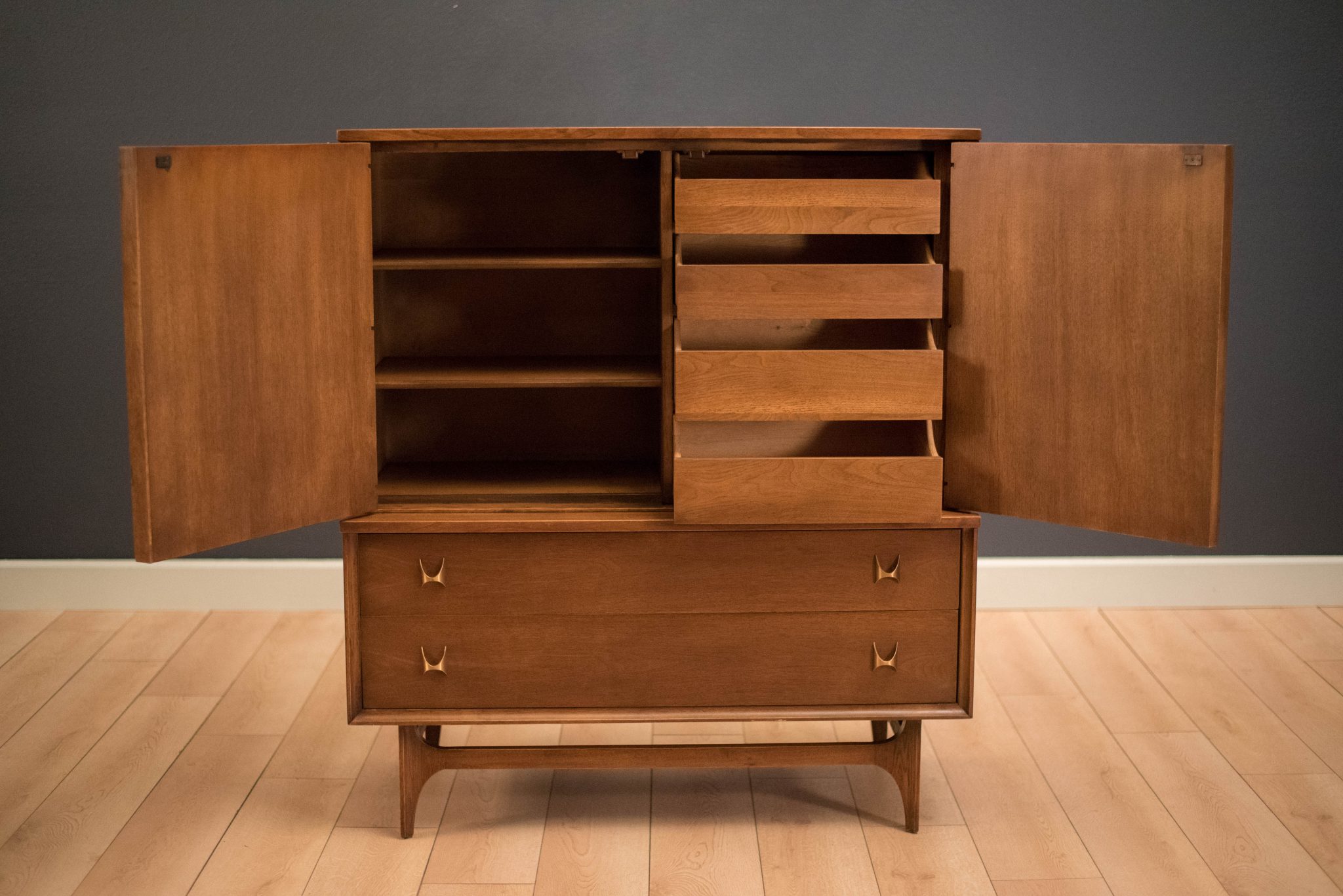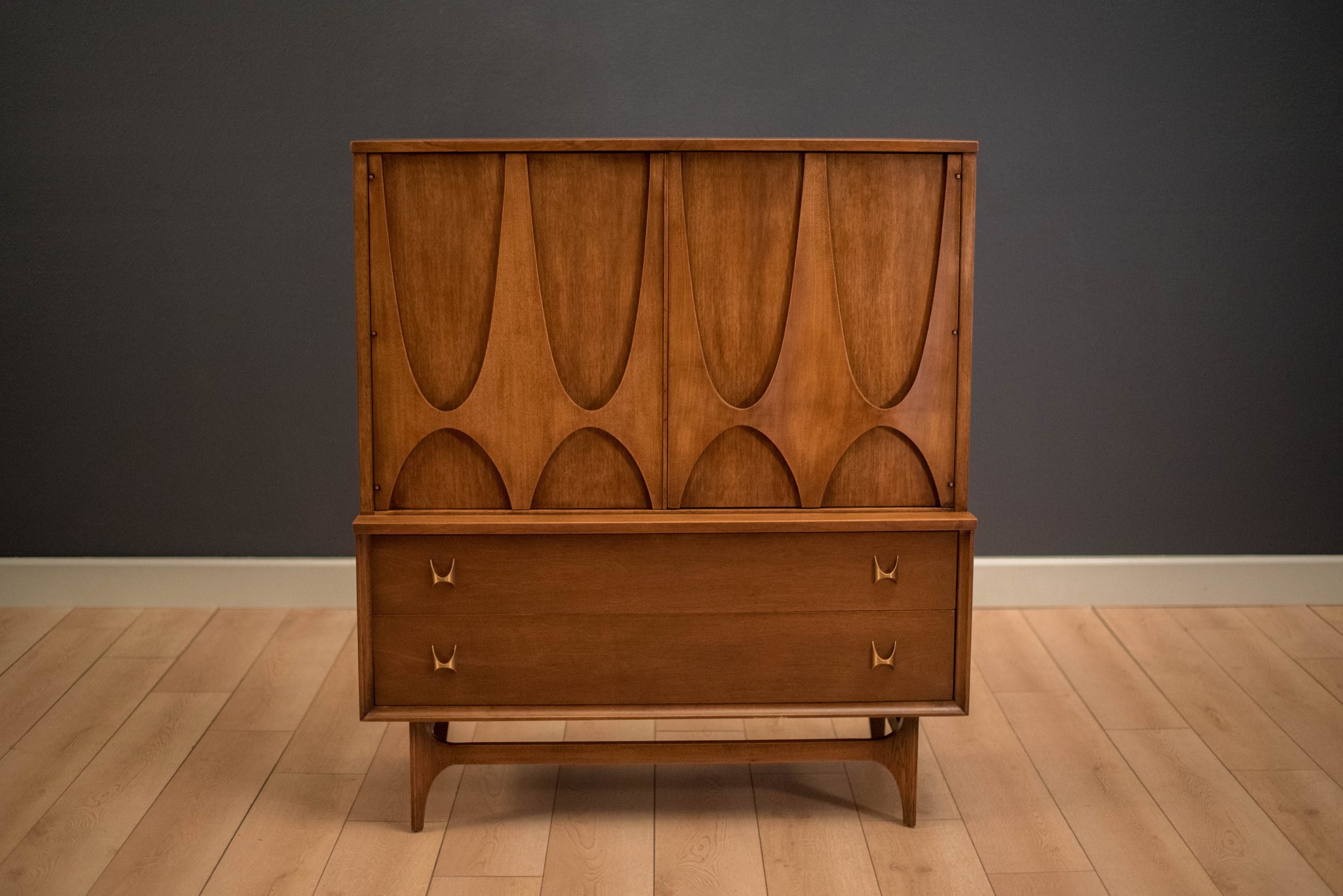 Mid-Century highboy door chest from the Broyhill Brasilia line, circa 1960s. This piece is equipped with two lower dovetailed drawers accessorized with signature brass handles. Includes open storage with two fixed shelves and four additional drawers behind sculpted arched doors.