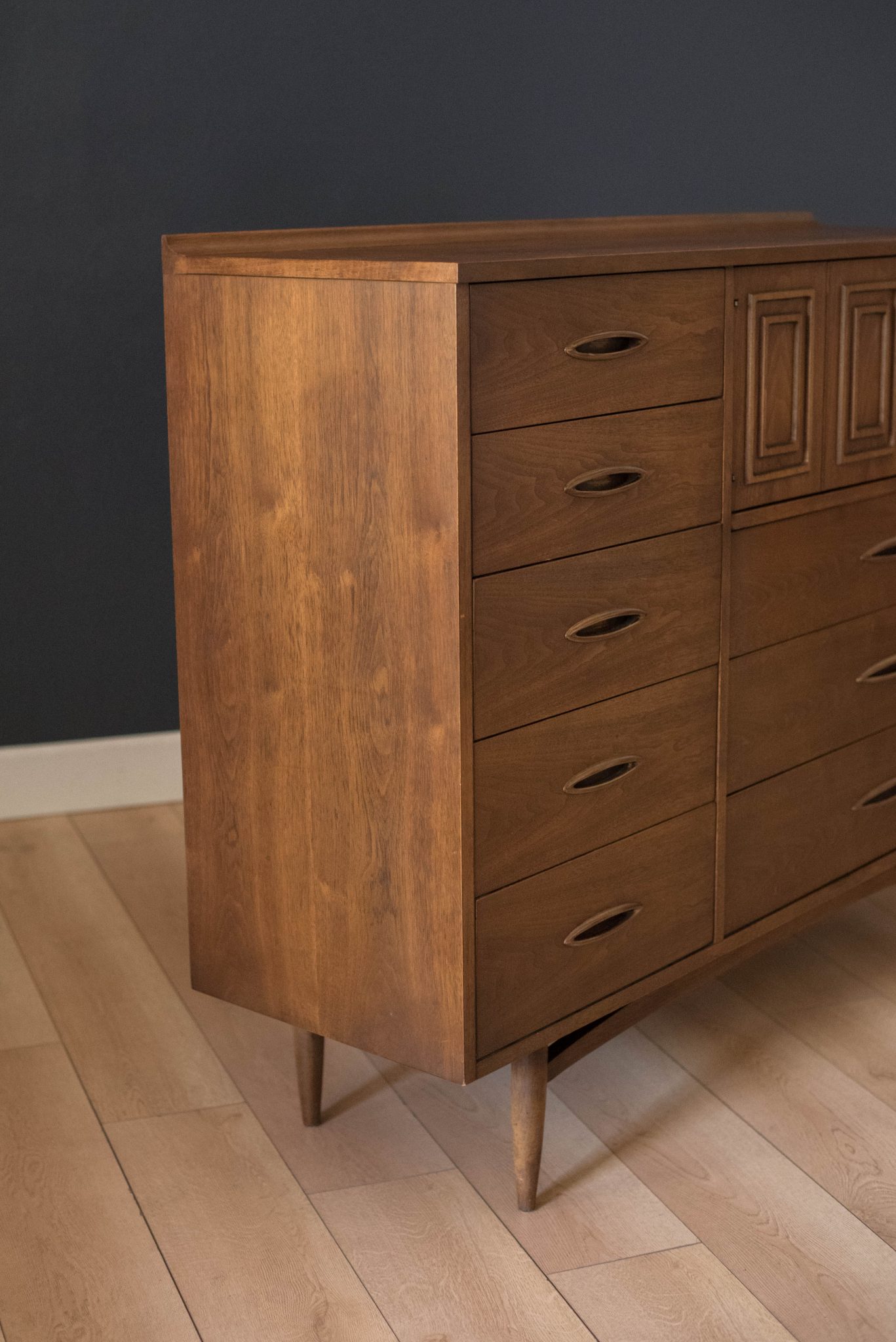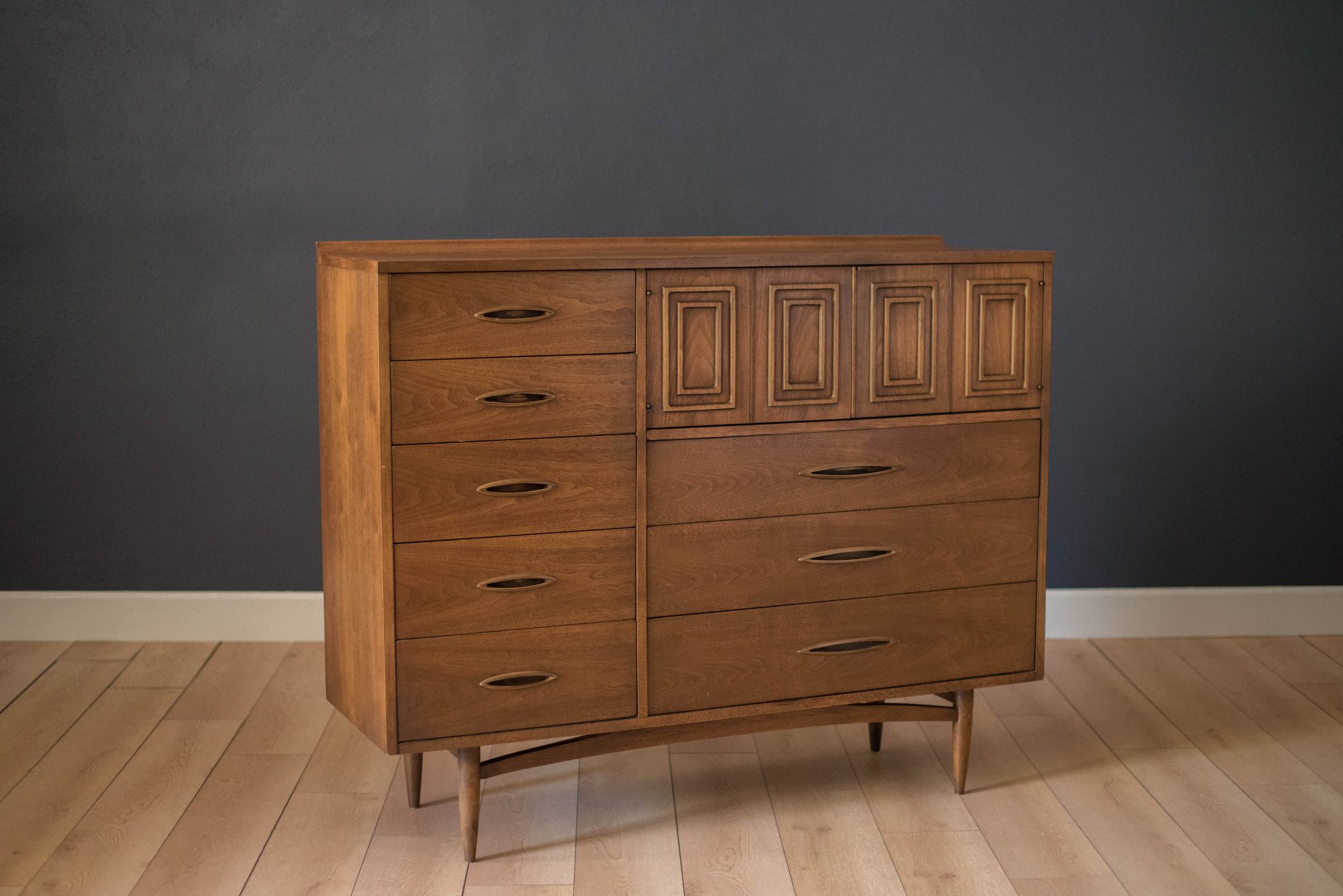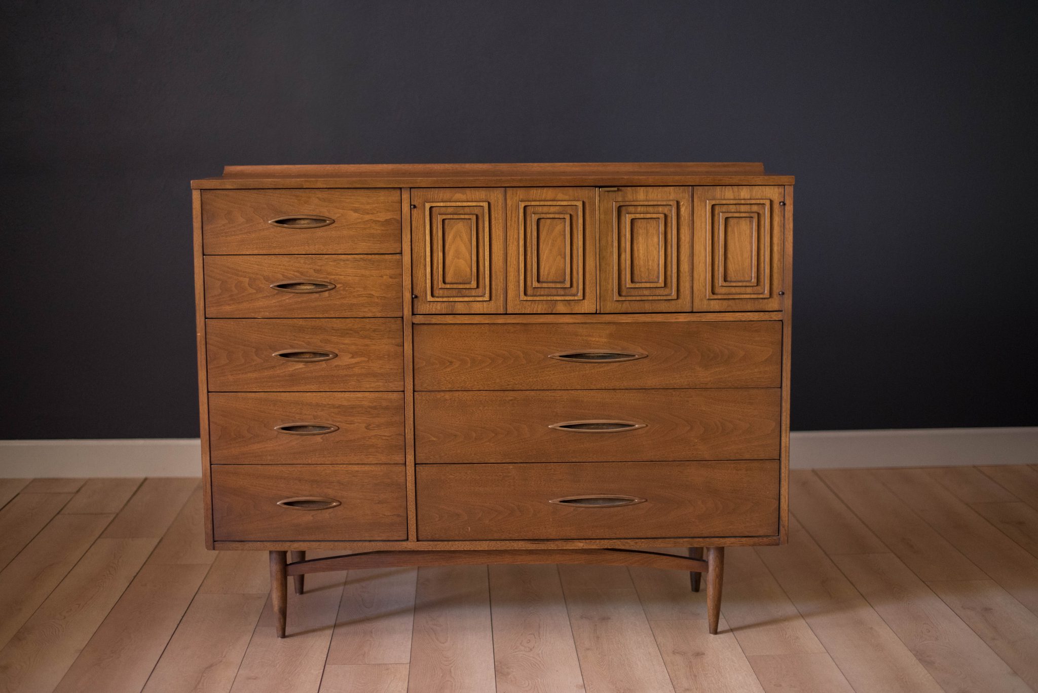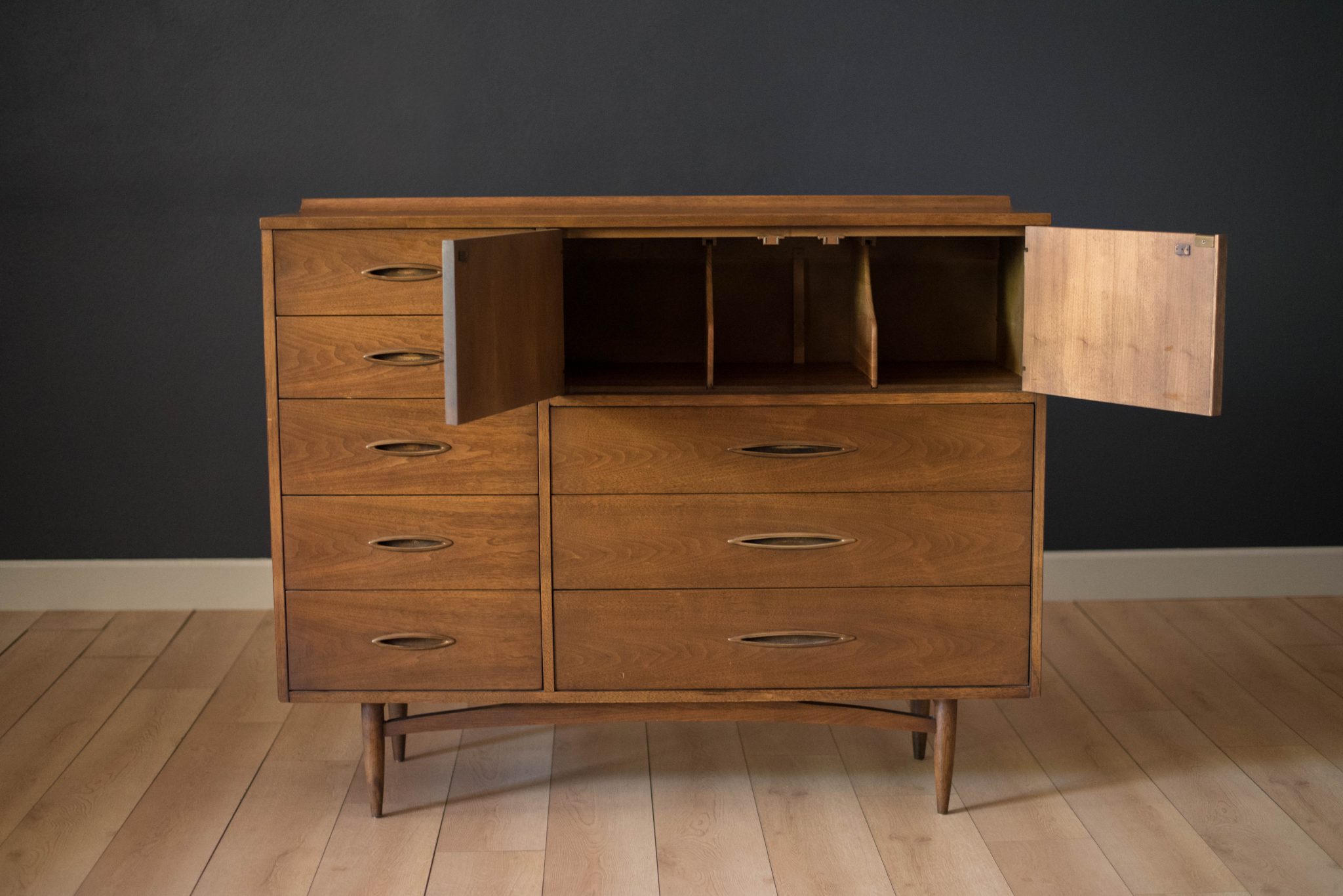 Vintage Broyhill Premier Sculptra Magna chest in walnut and oak. This piece offers plenty of storage space with eight drawers and an open cabinet with two dividers. Features the line’s signature cat eye pulls and sculpted raised lip.