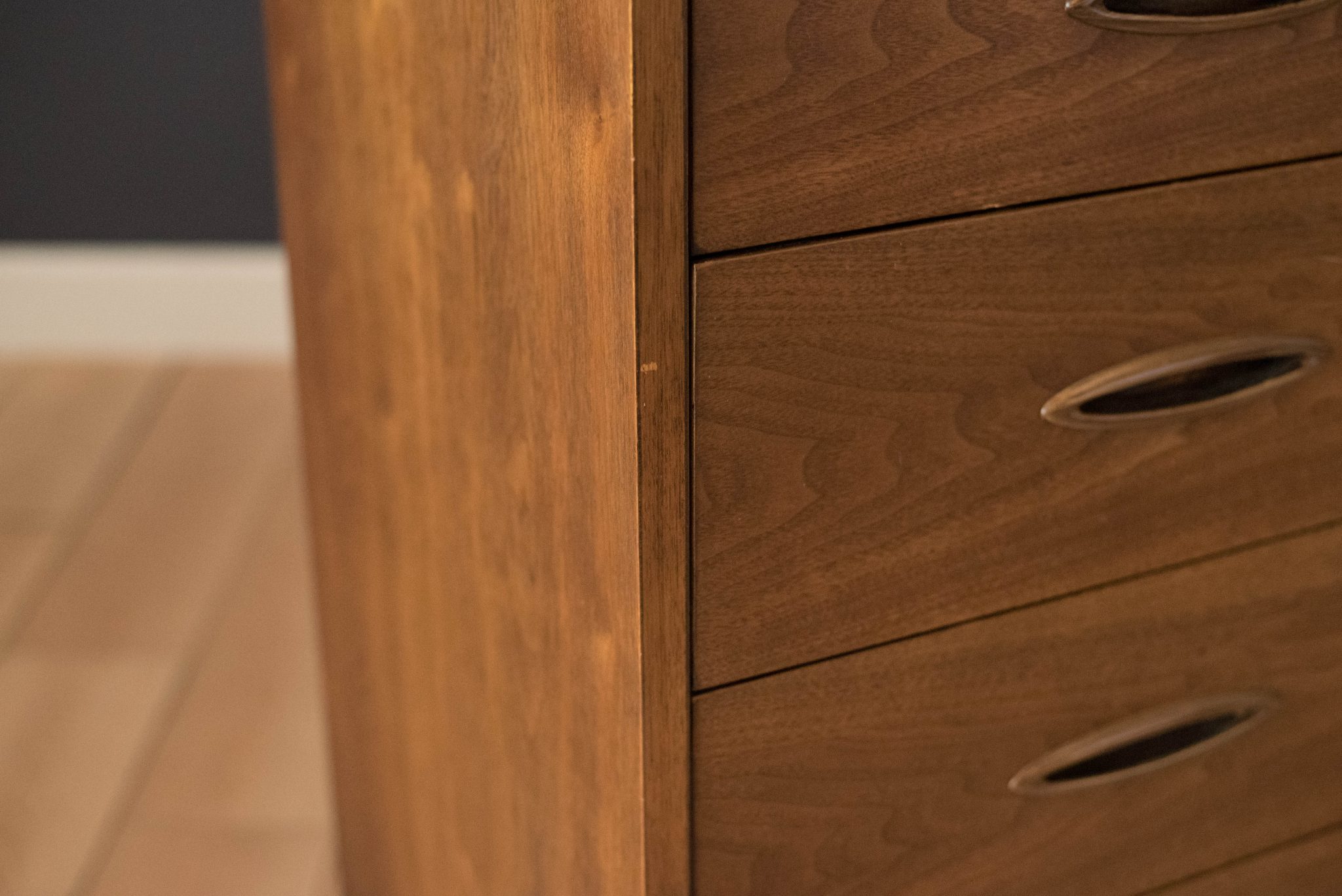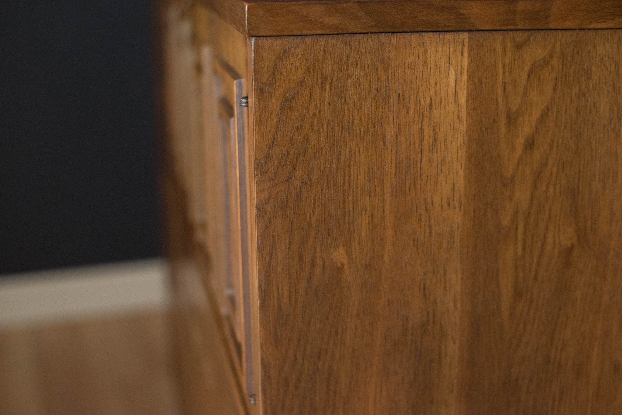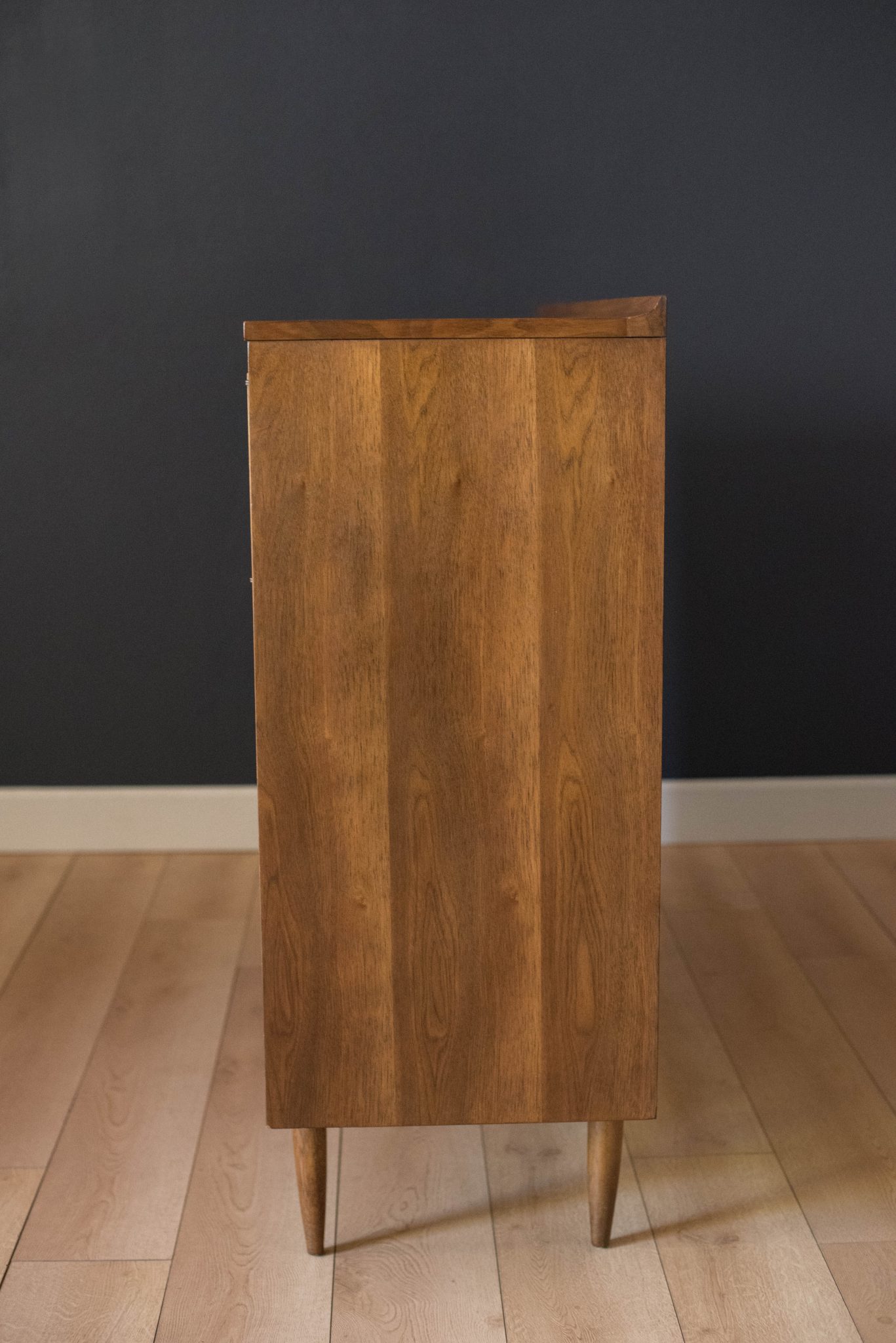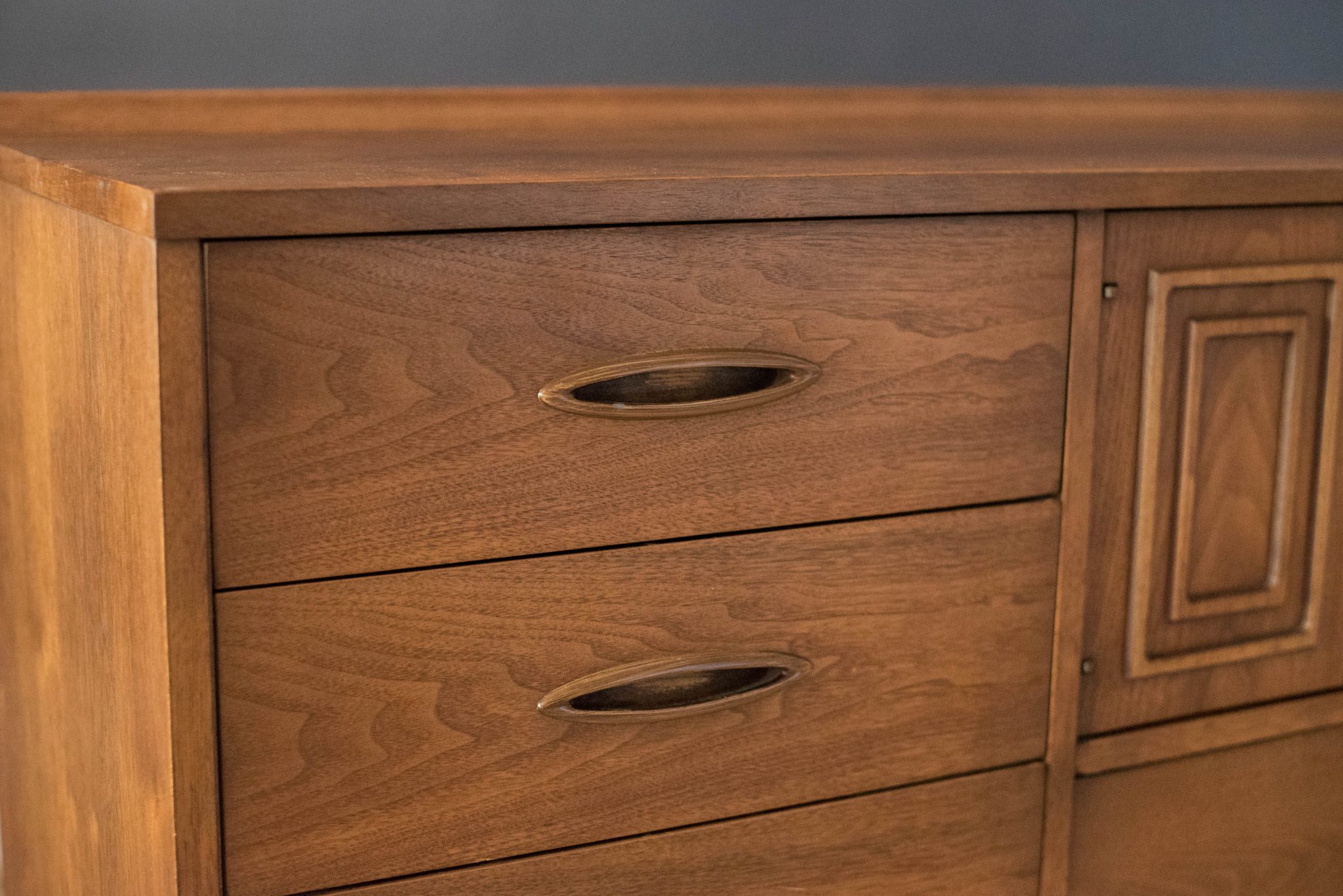Vintage Broyhill Premier Sculptra Magna chest in walnut and oak. This piece offers plenty of storage space with eight drawers and an open cabinet with two dividers. Features the line’s signature cat eye pulls and sculpted raised lip.
