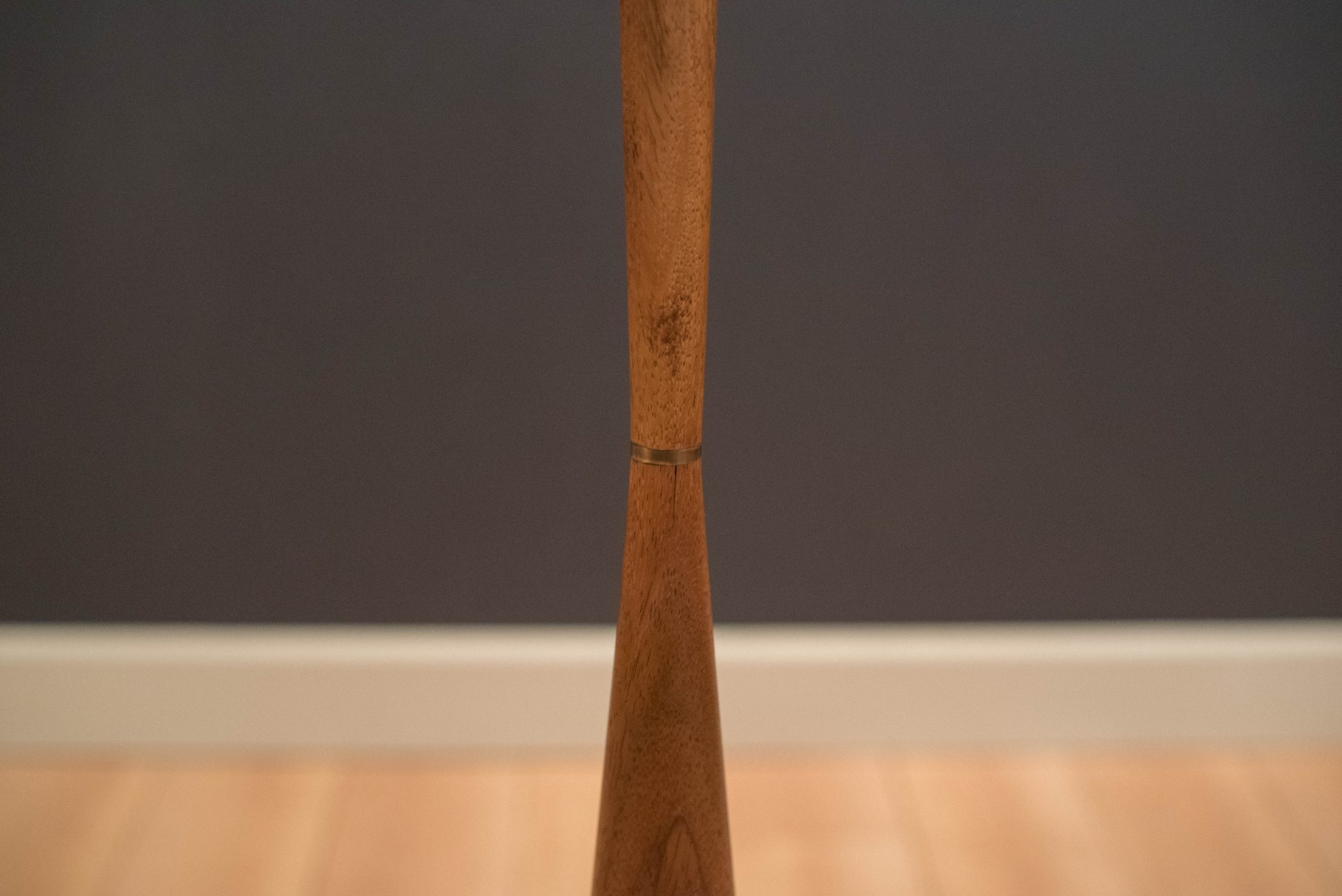 Vintage solid mahogany floor lamp designed by Raymond Pfennig for Zina Lamp Co. This sculptural piece is accented with a brass ring and includes the original shade. Functions with a three way switch.