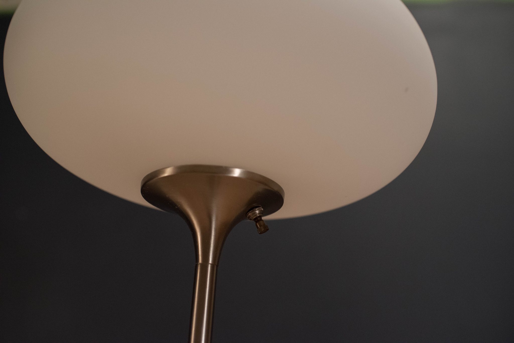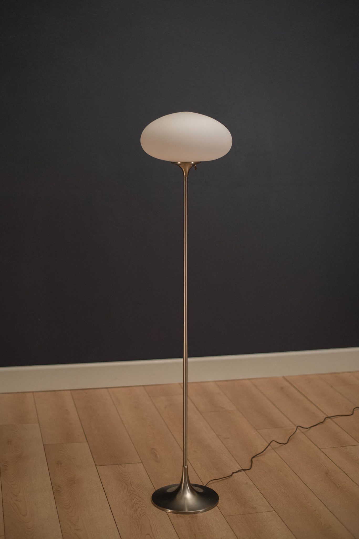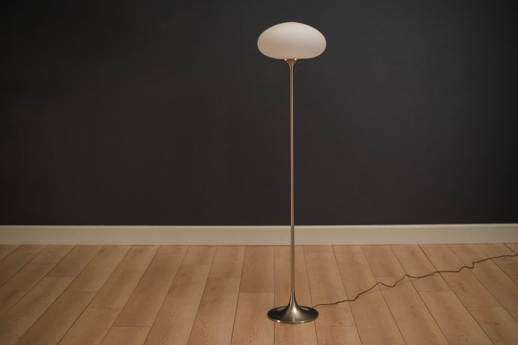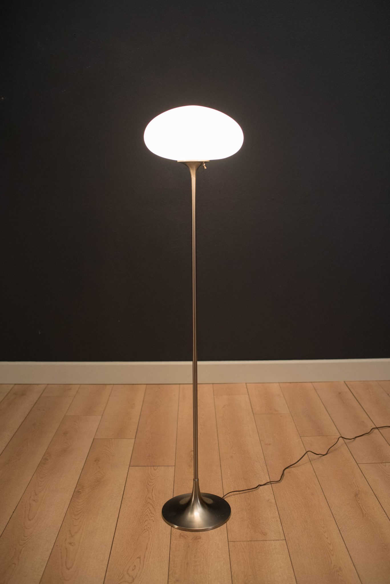 Mid-Century Modern Laurel floor lamp in chrome. This piece features a frosted glass shade and functions with a three-way switch.