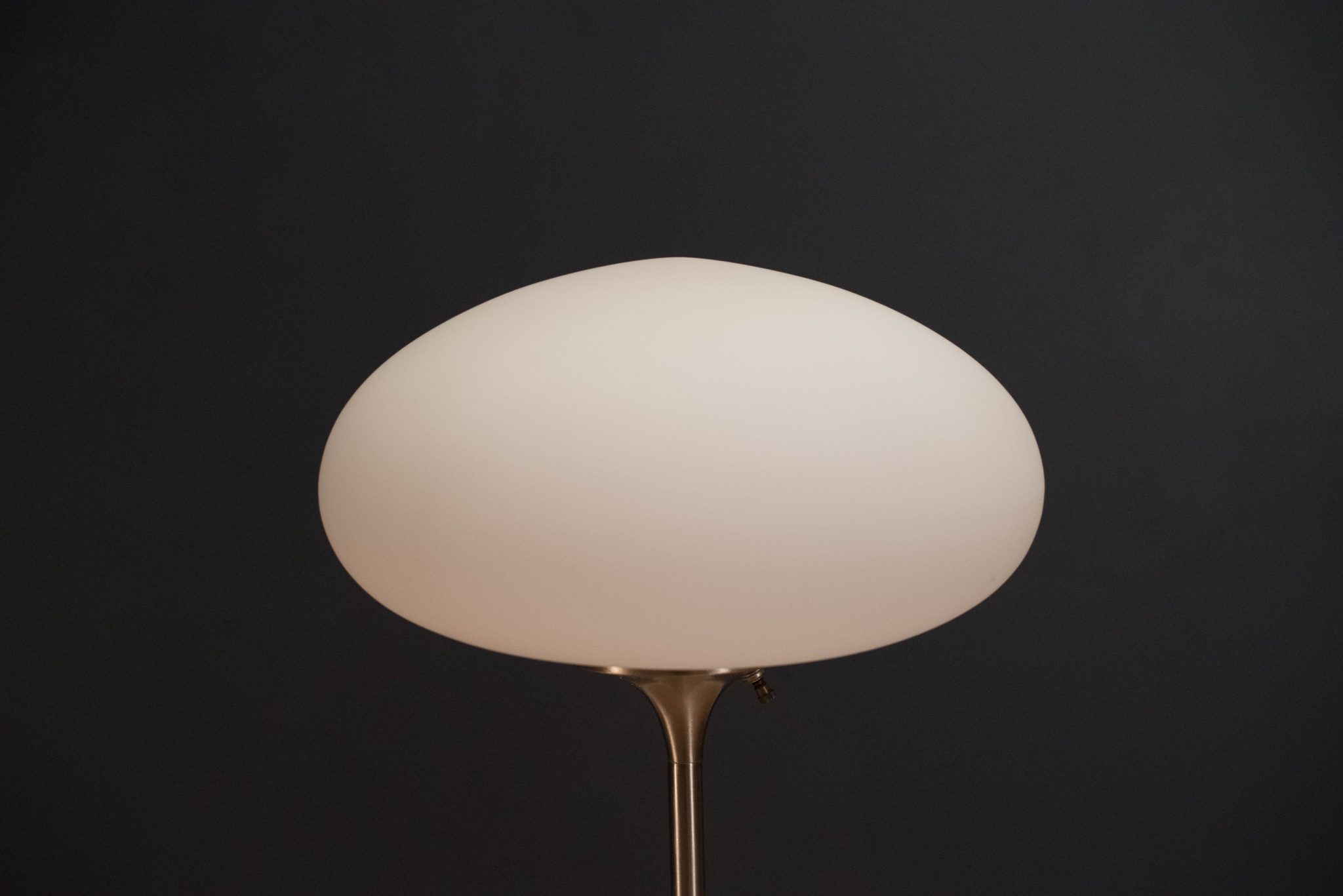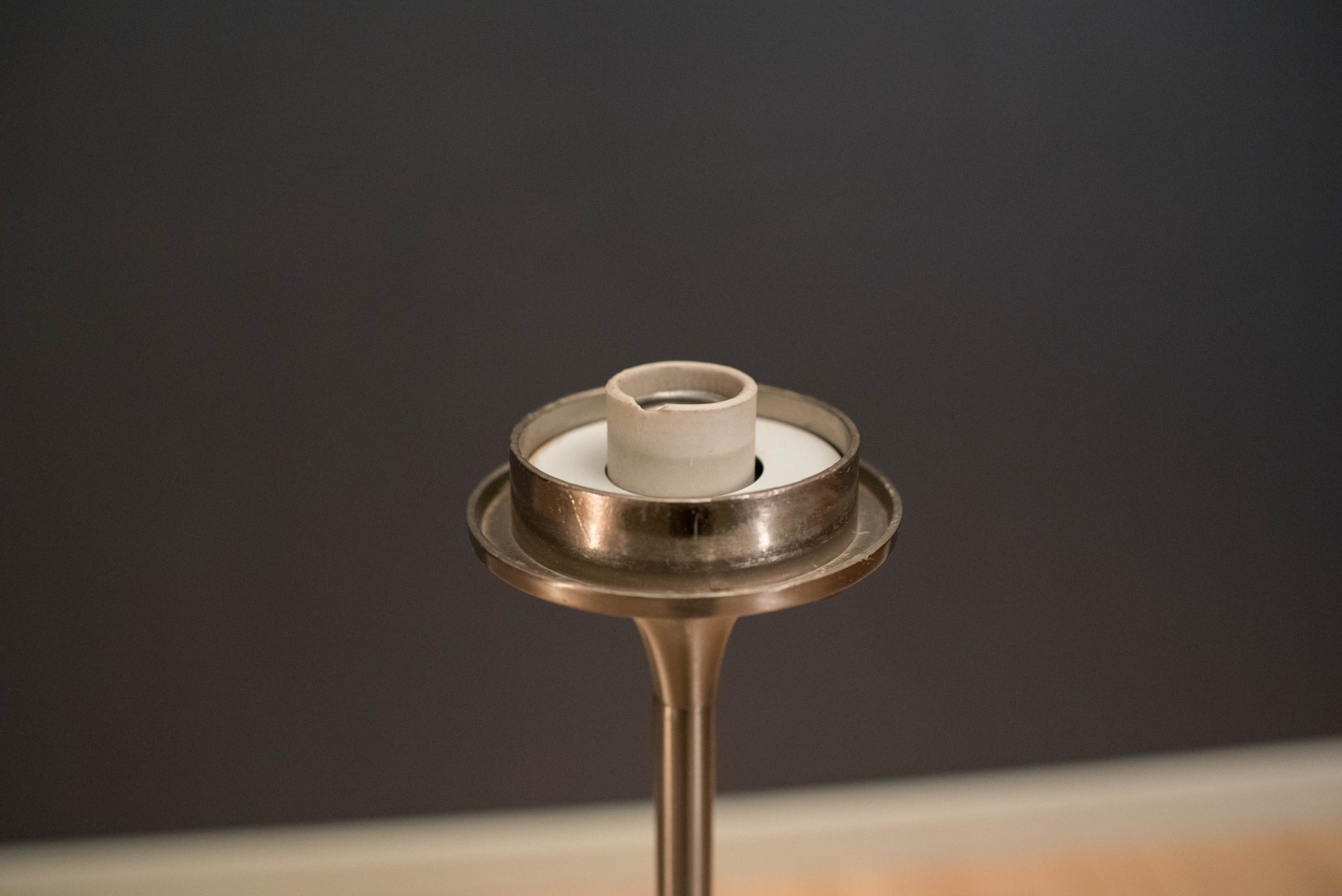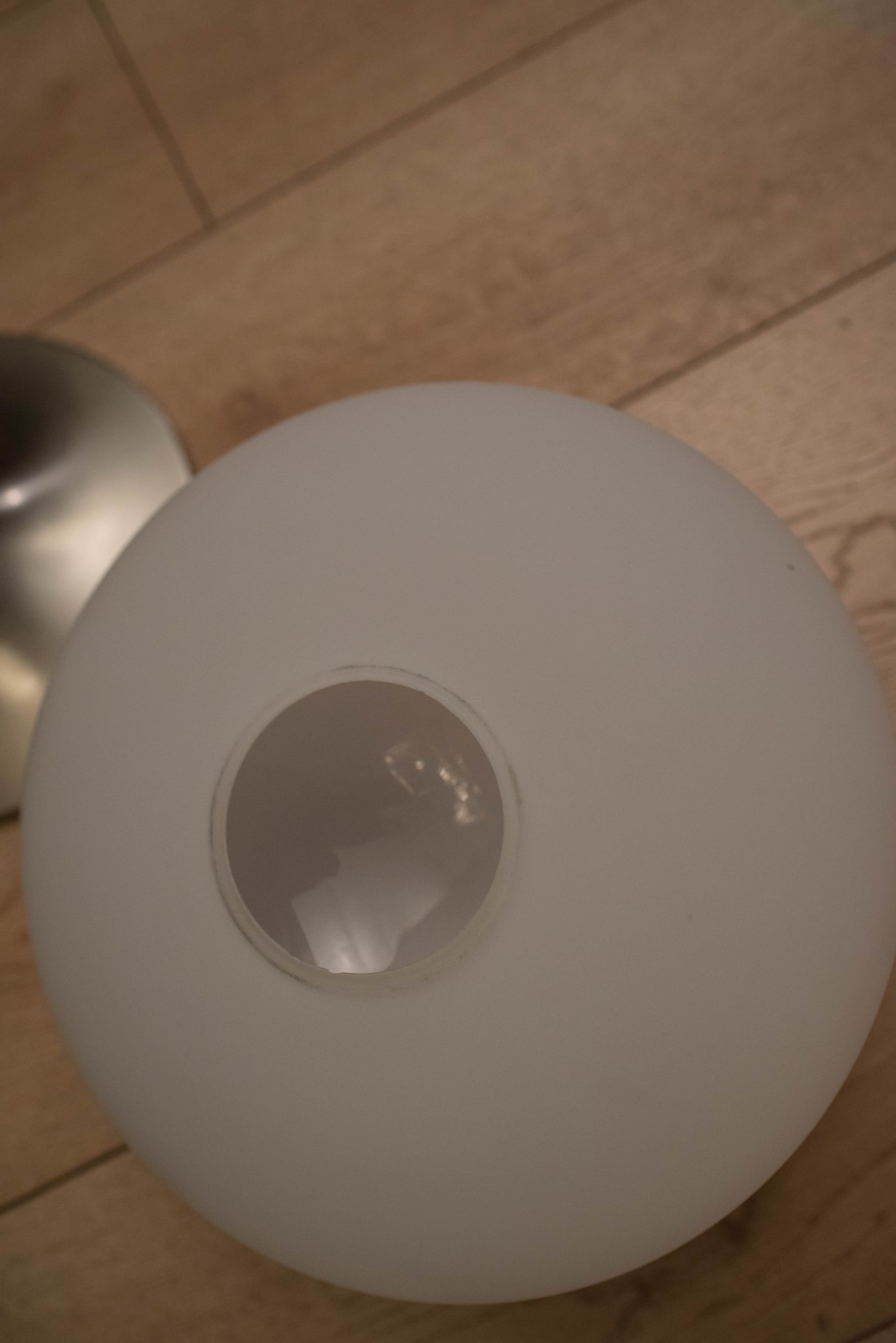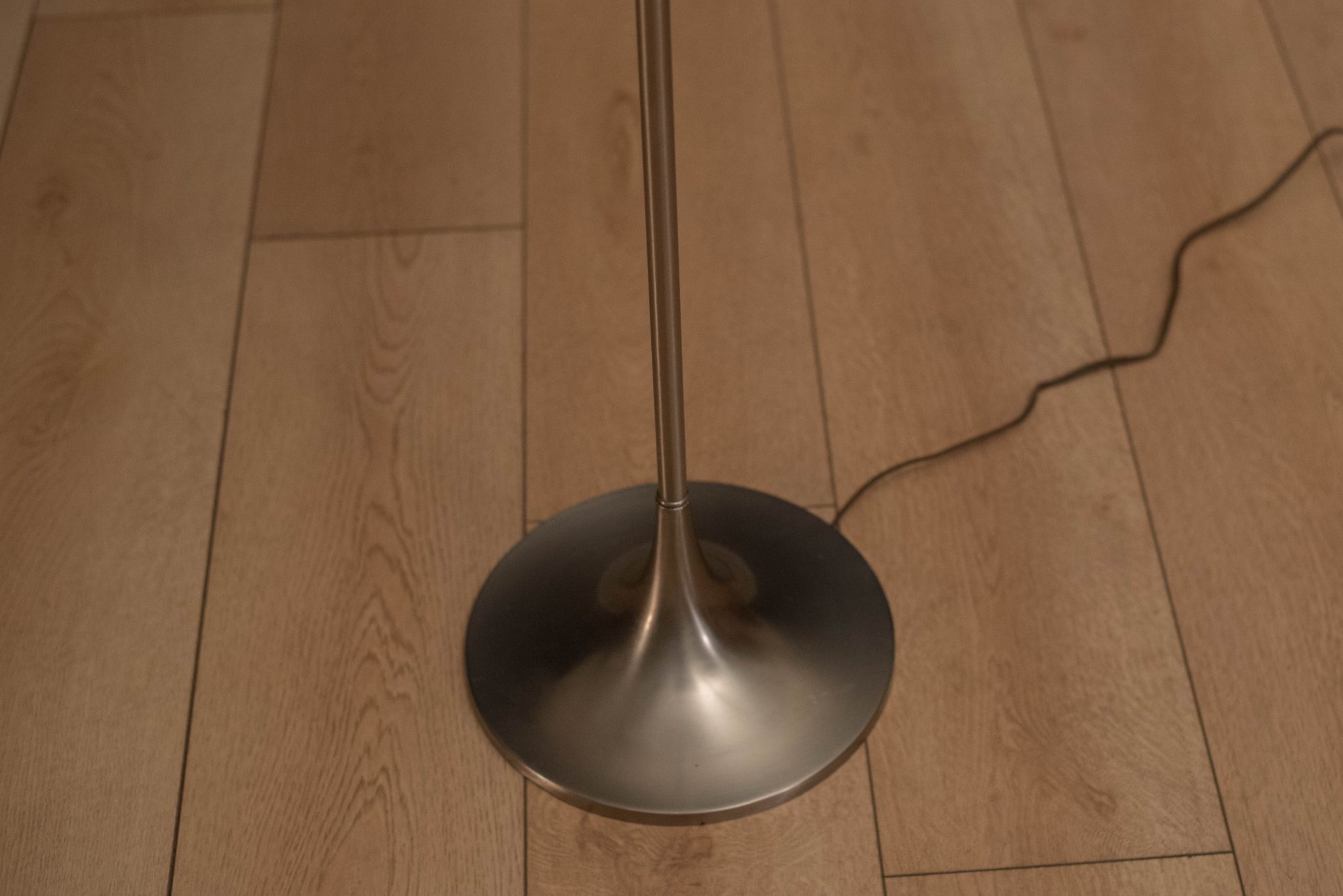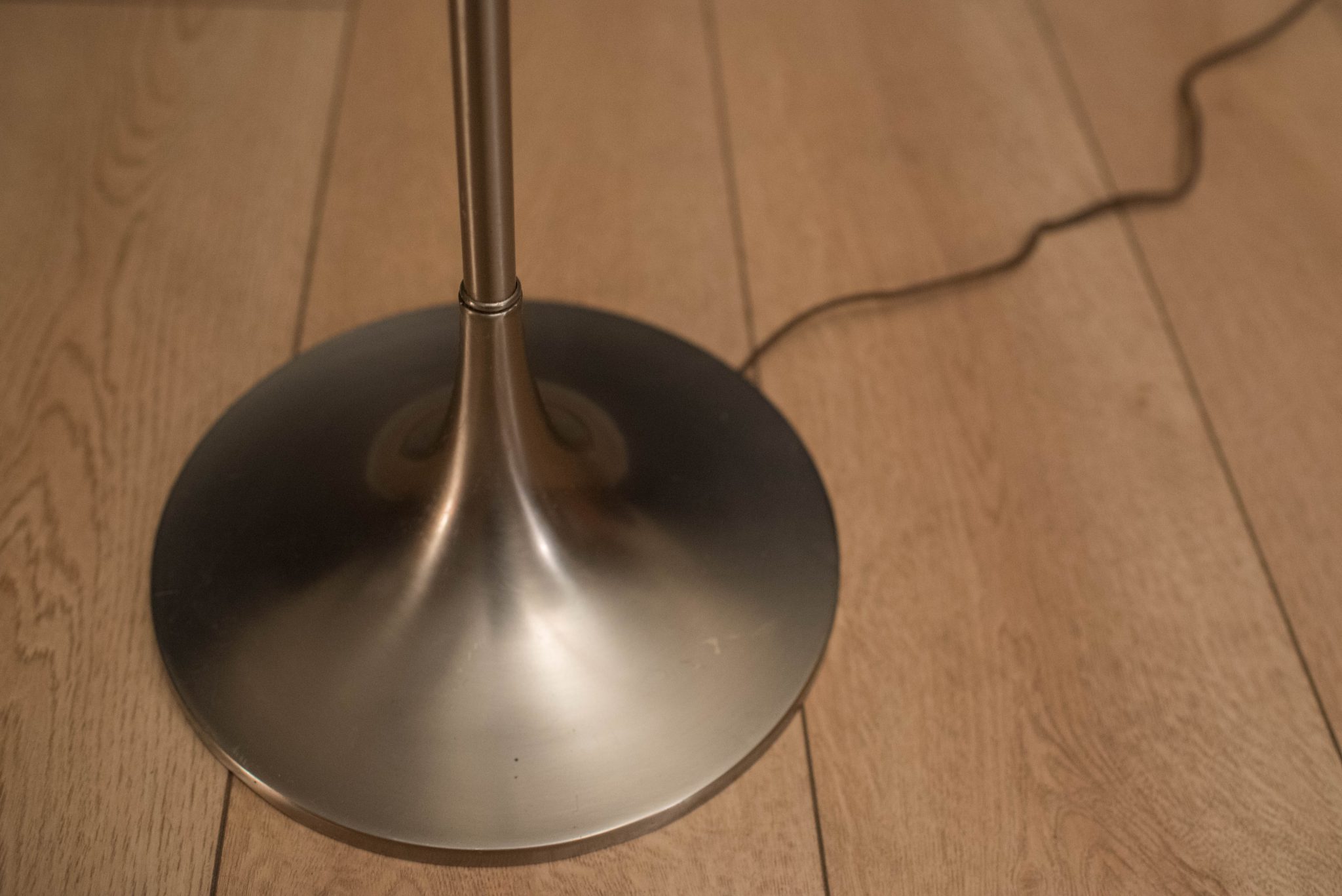 Mid-Century Modern Laurel floor lamp in chrome. This piece features a frosted glass shade and functions with a three-way switch.