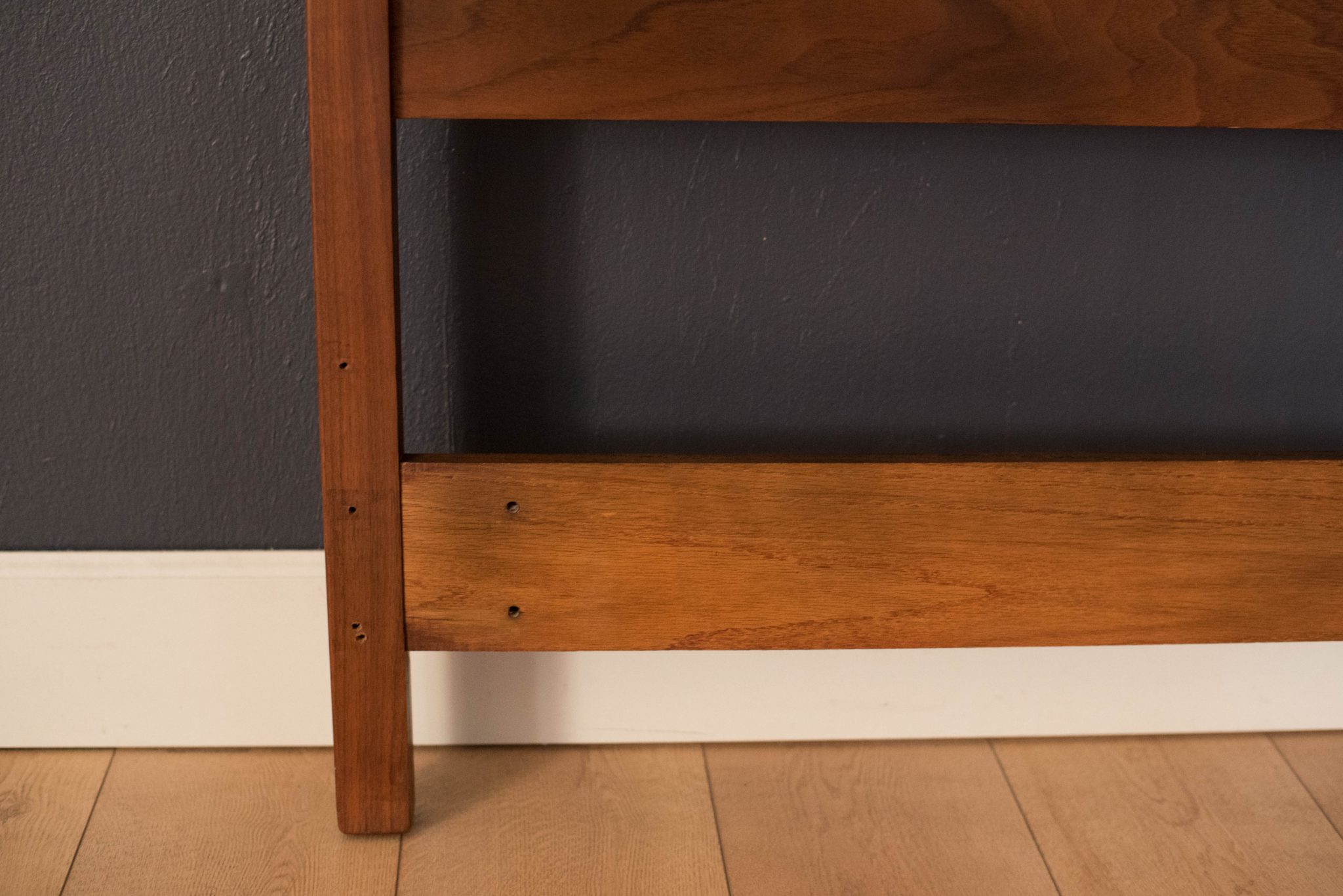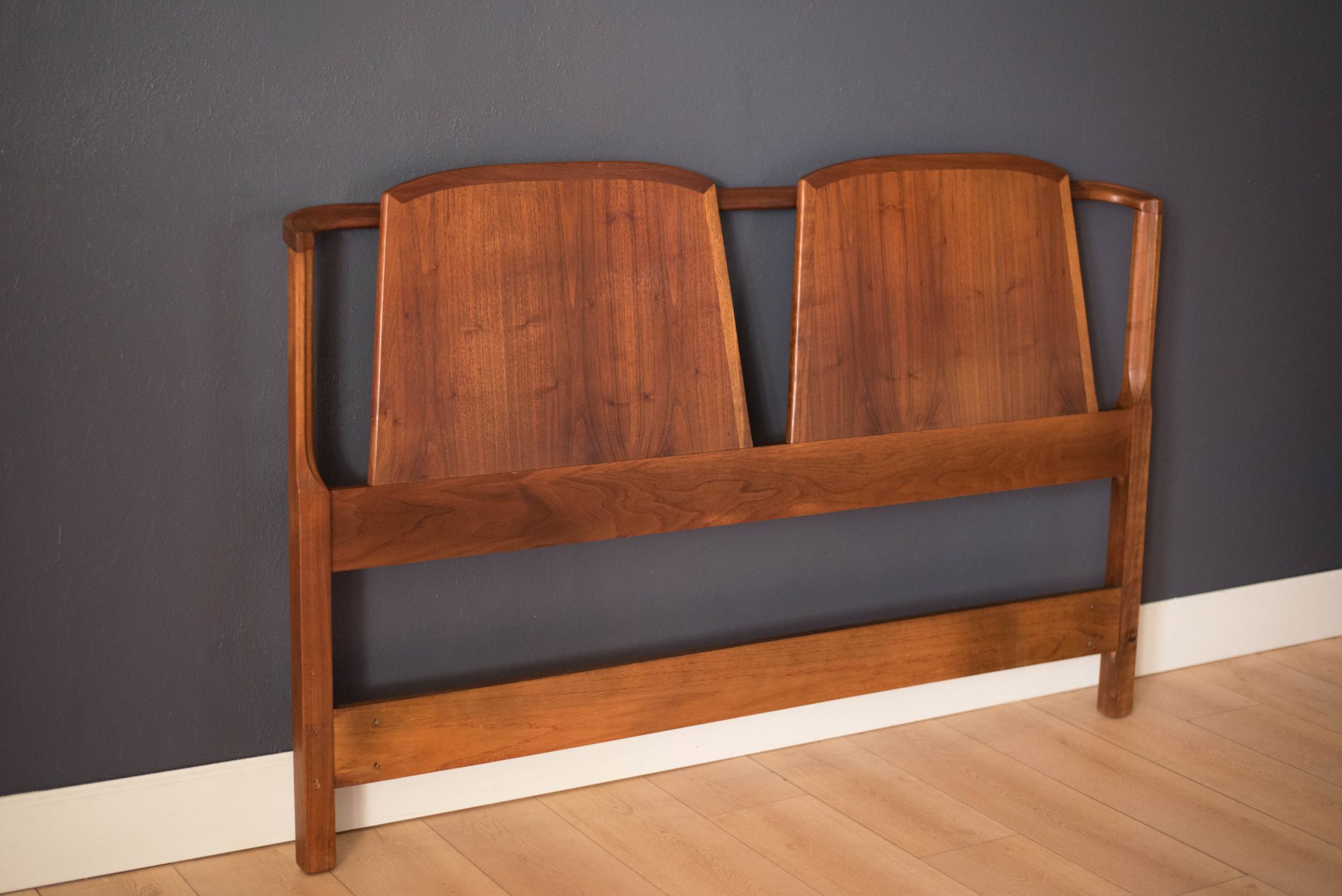 Vintage queen size headboard by Dillingham Manufacturing Co., circa 1960s. This piece features a walnut double back panel with a slim curved frame. Pre-drilled settings in place for bed frame attachments.