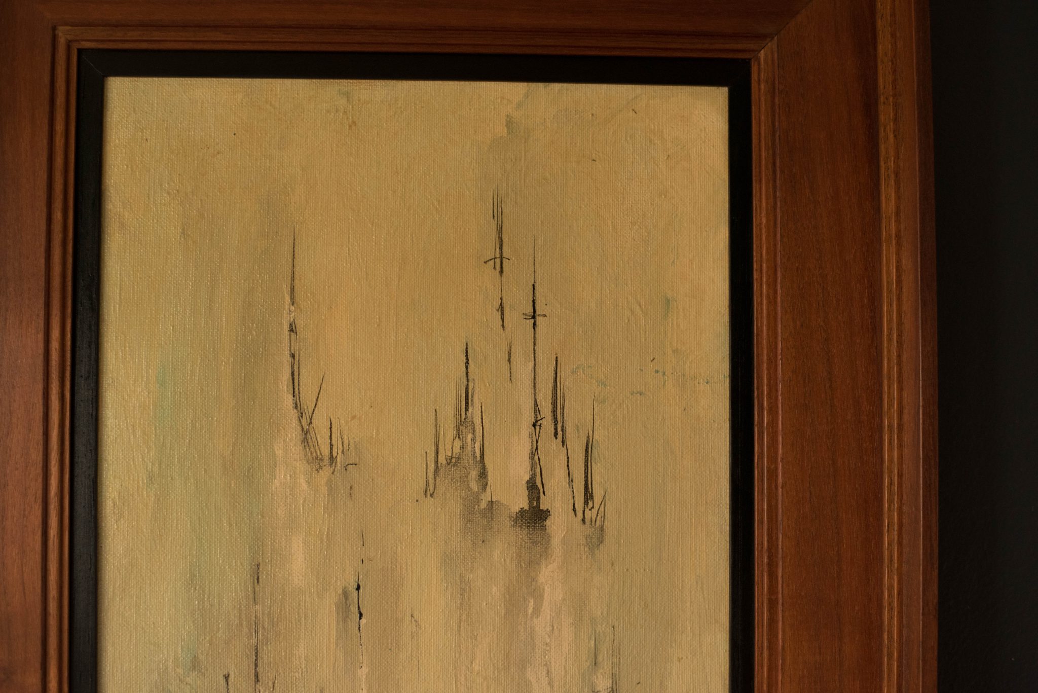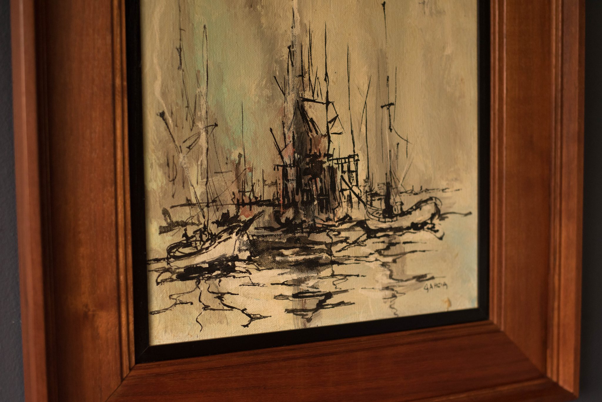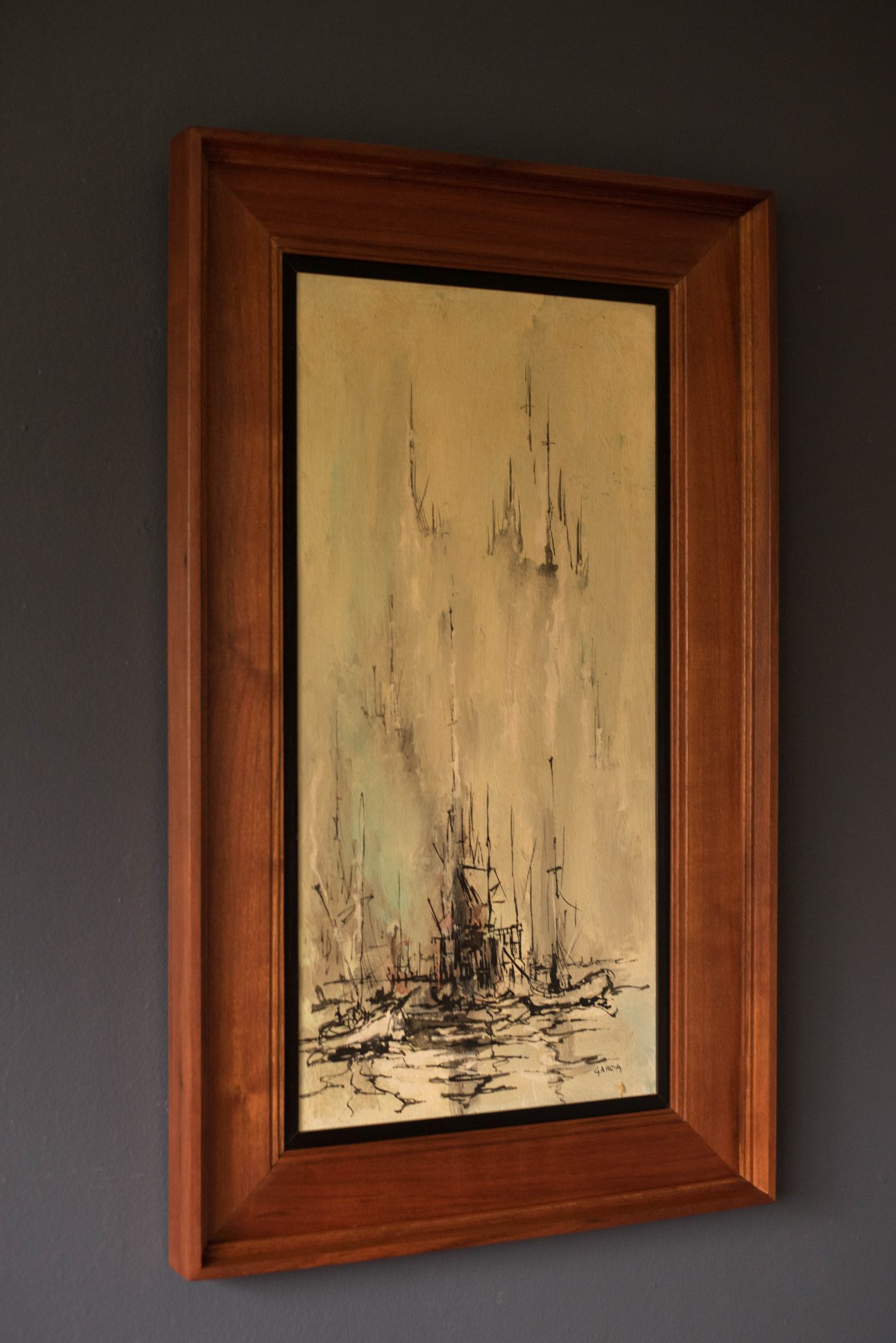 Mid century Nautical Abstract painting by artist Danny Garcia c. 1966 . This is an original acrylic on canvas with walnut frame. Garcia was born and raised in Monterey, California and shows his influence of the area in many of his paintings.