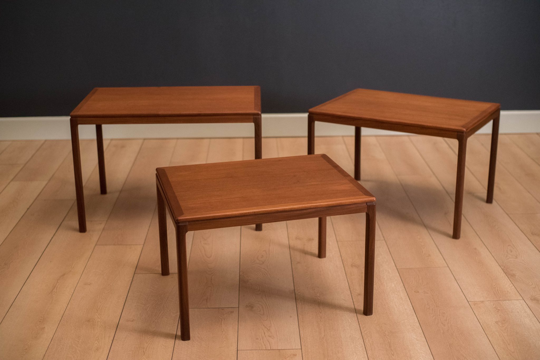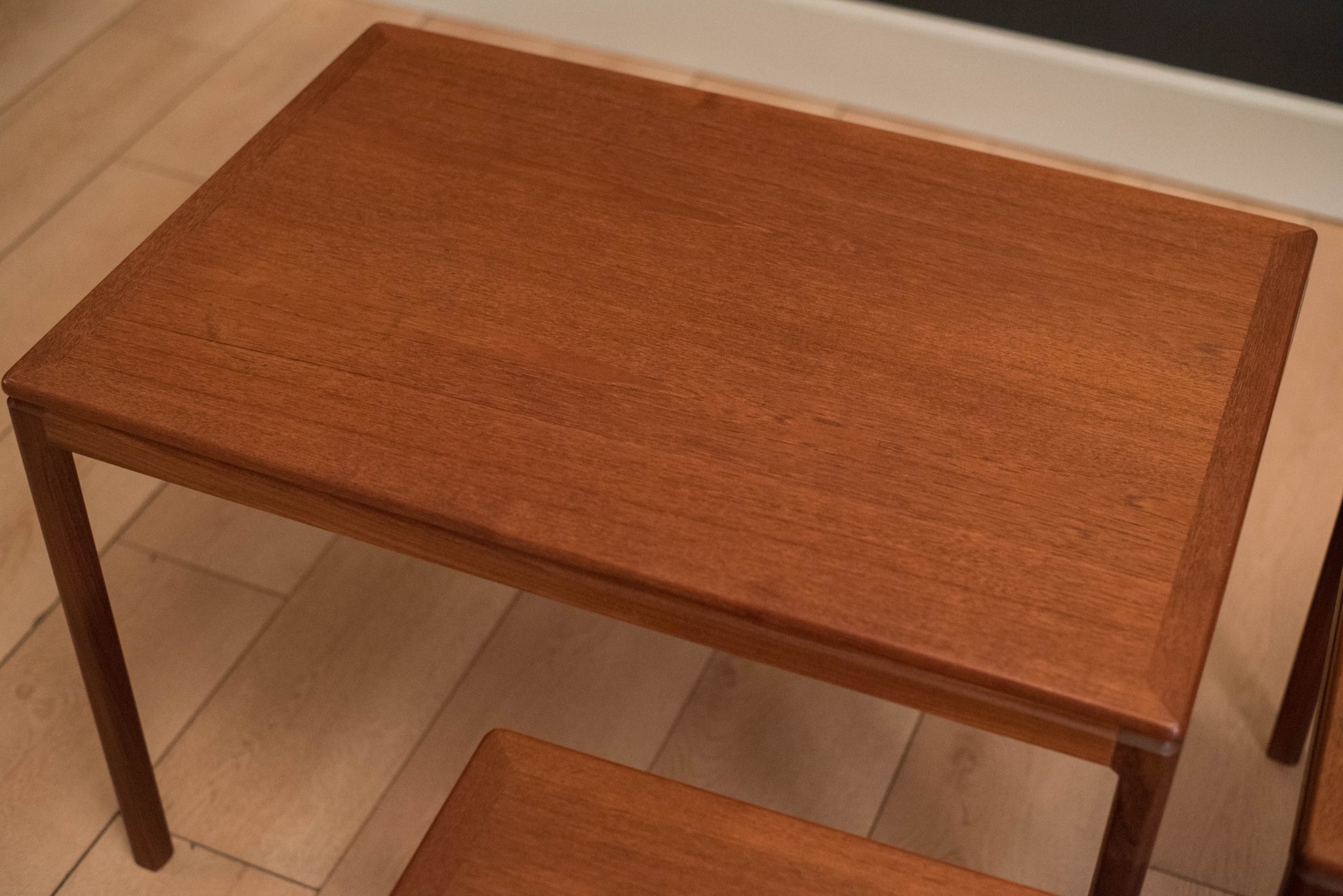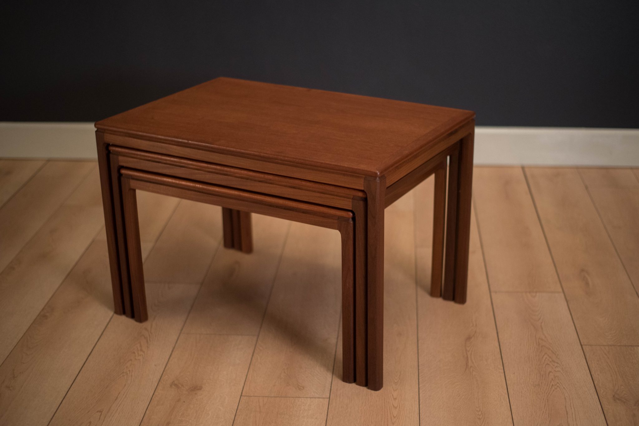 Mid-Century teak nesting tables by DUX. This rare set includes three separate tables that tuck underneath each other making it perfect for small spaces. It is in good condition with minimal vintage wear.