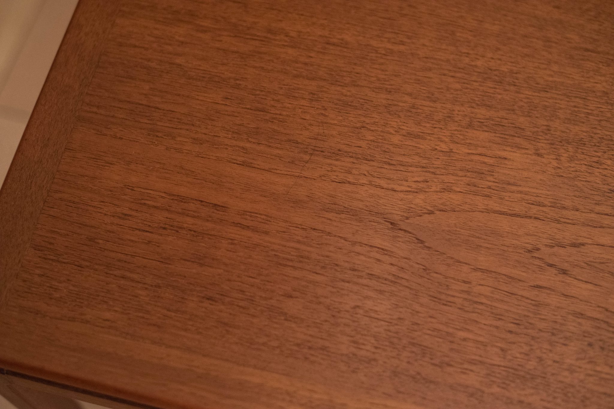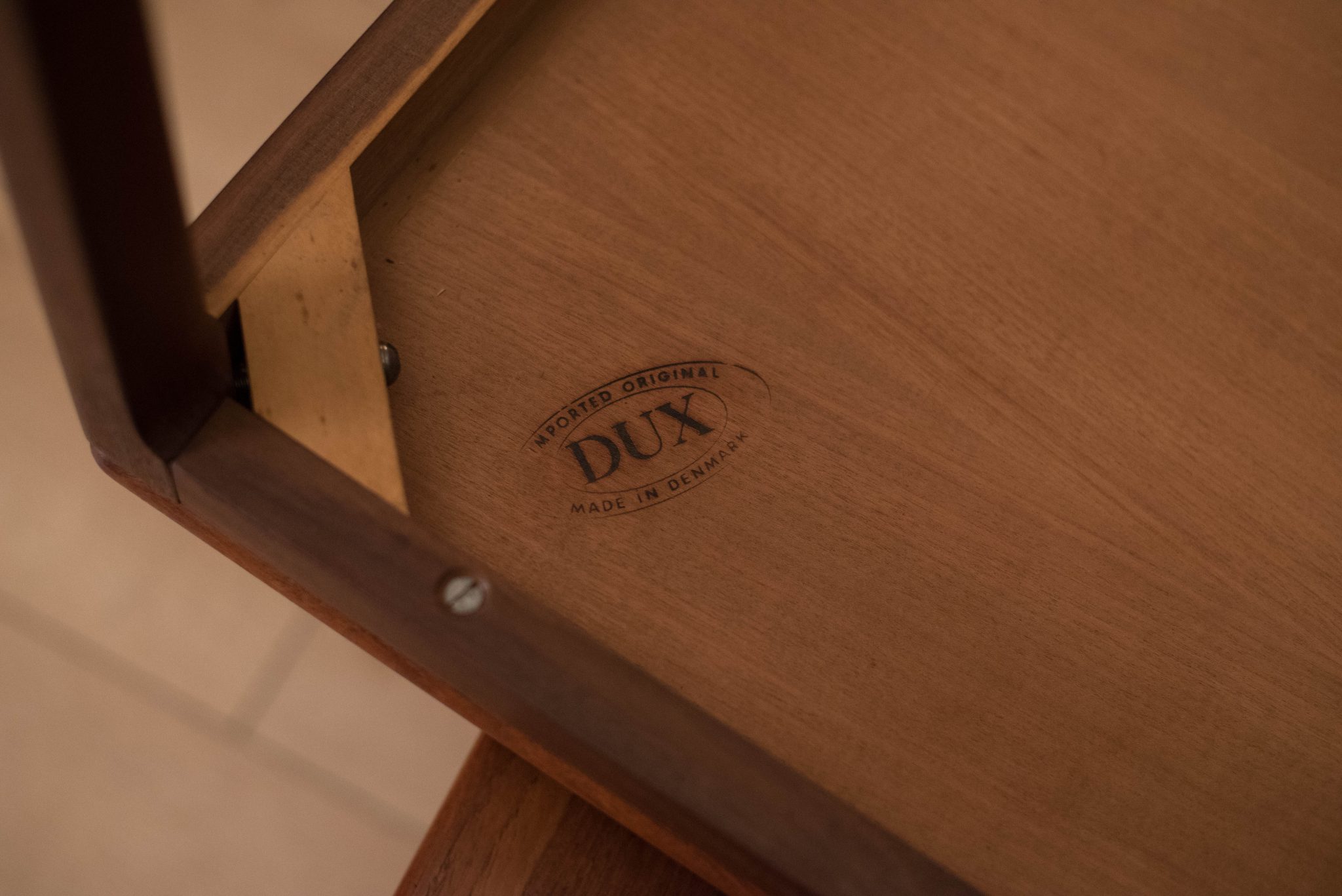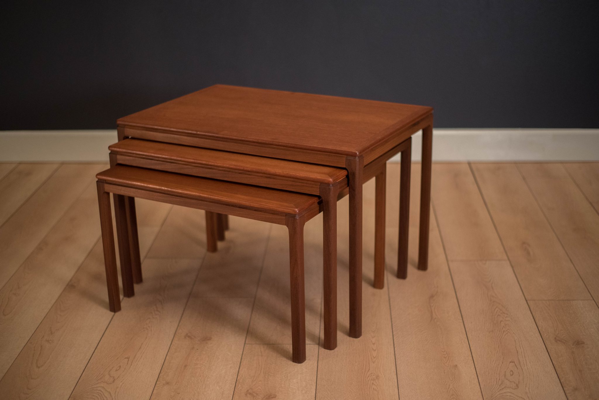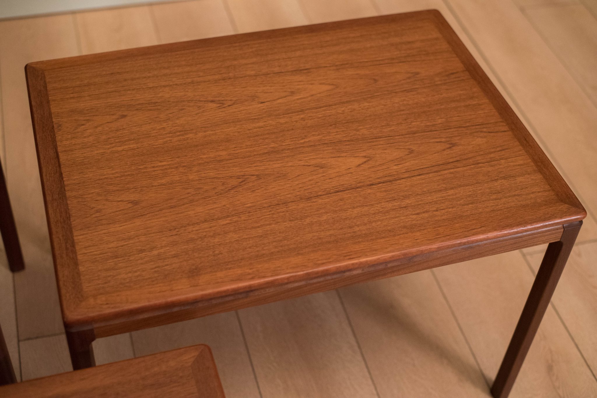 Mid-Century teak nesting tables by DUX. This rare set includes three separate tables that tuck underneath each other making it perfect for small spaces. It is in good condition with minimal vintage wear.