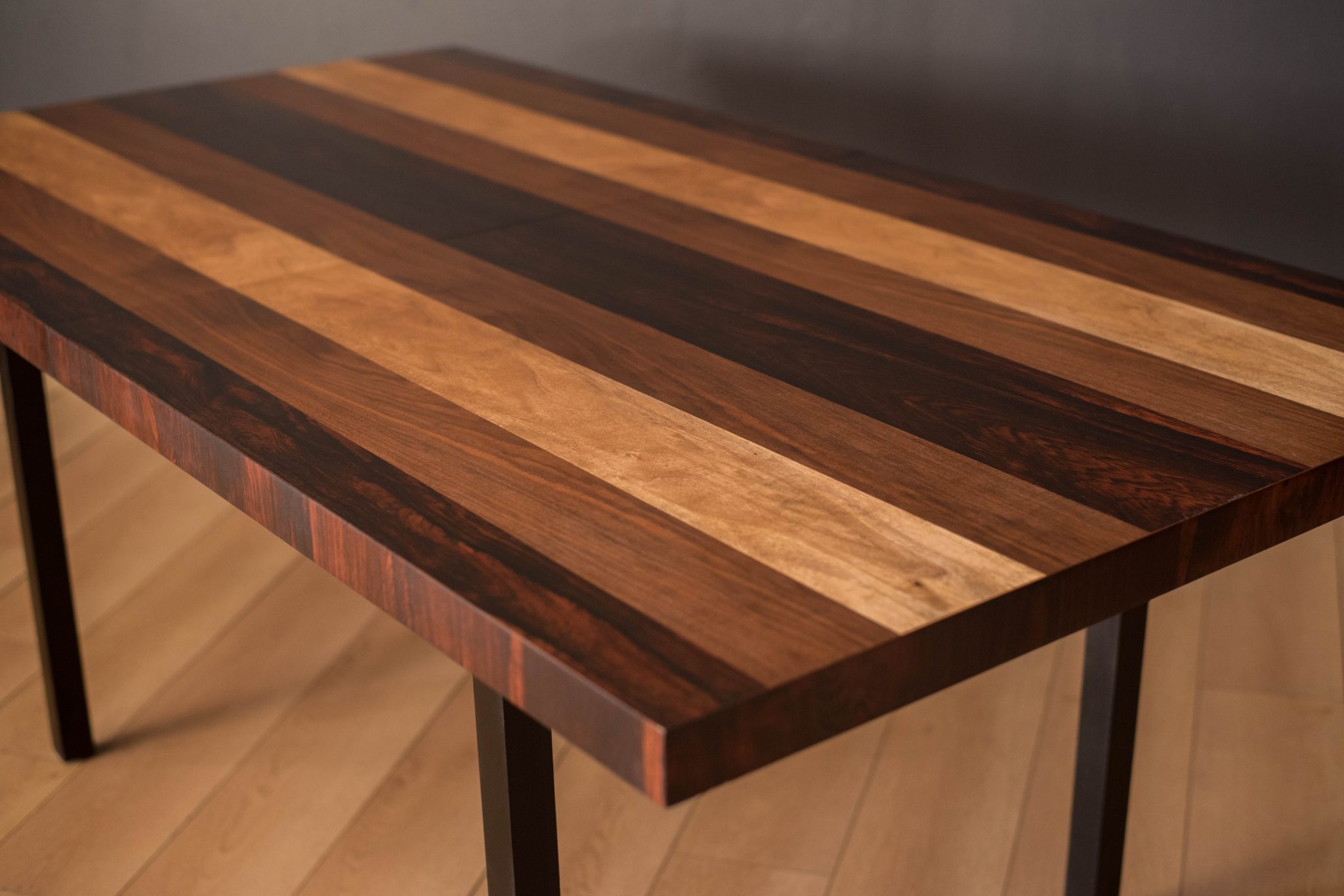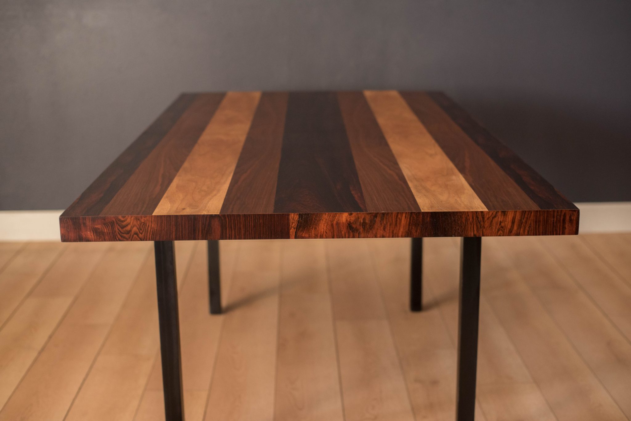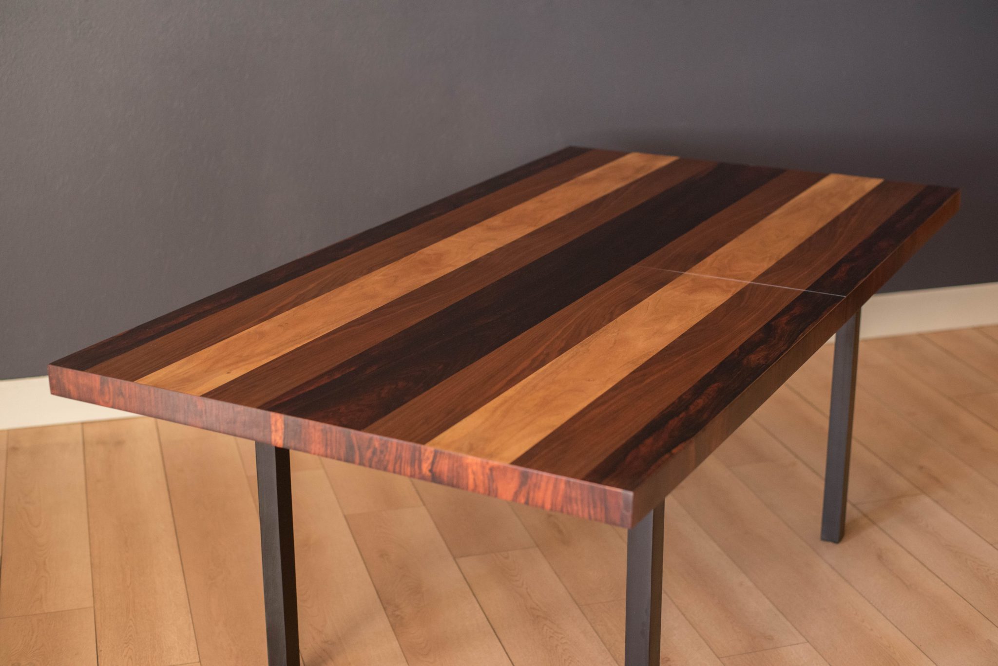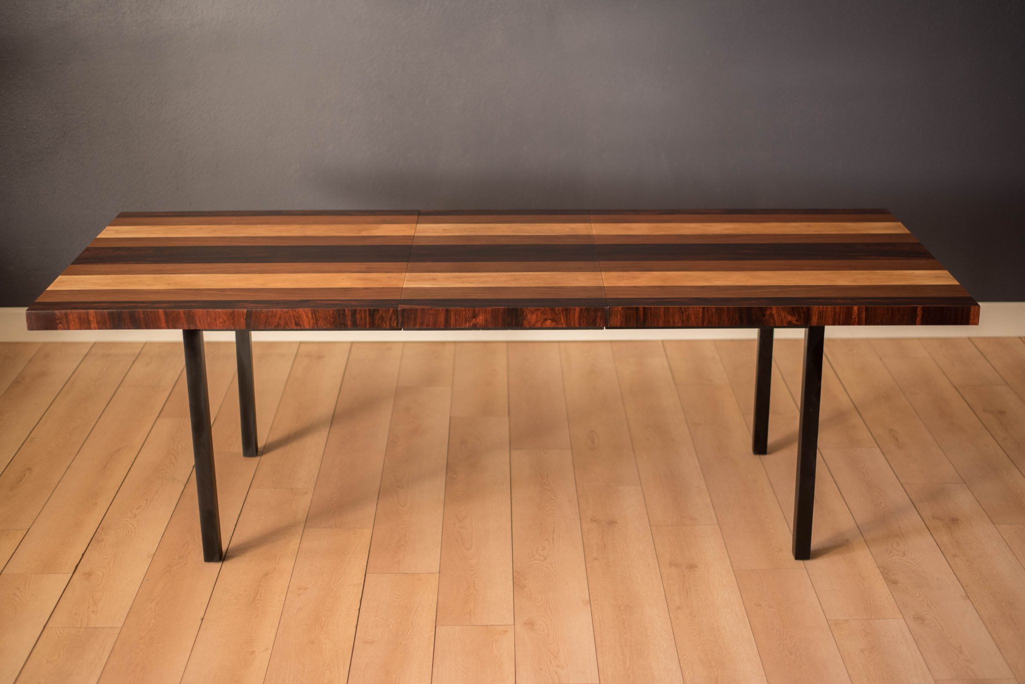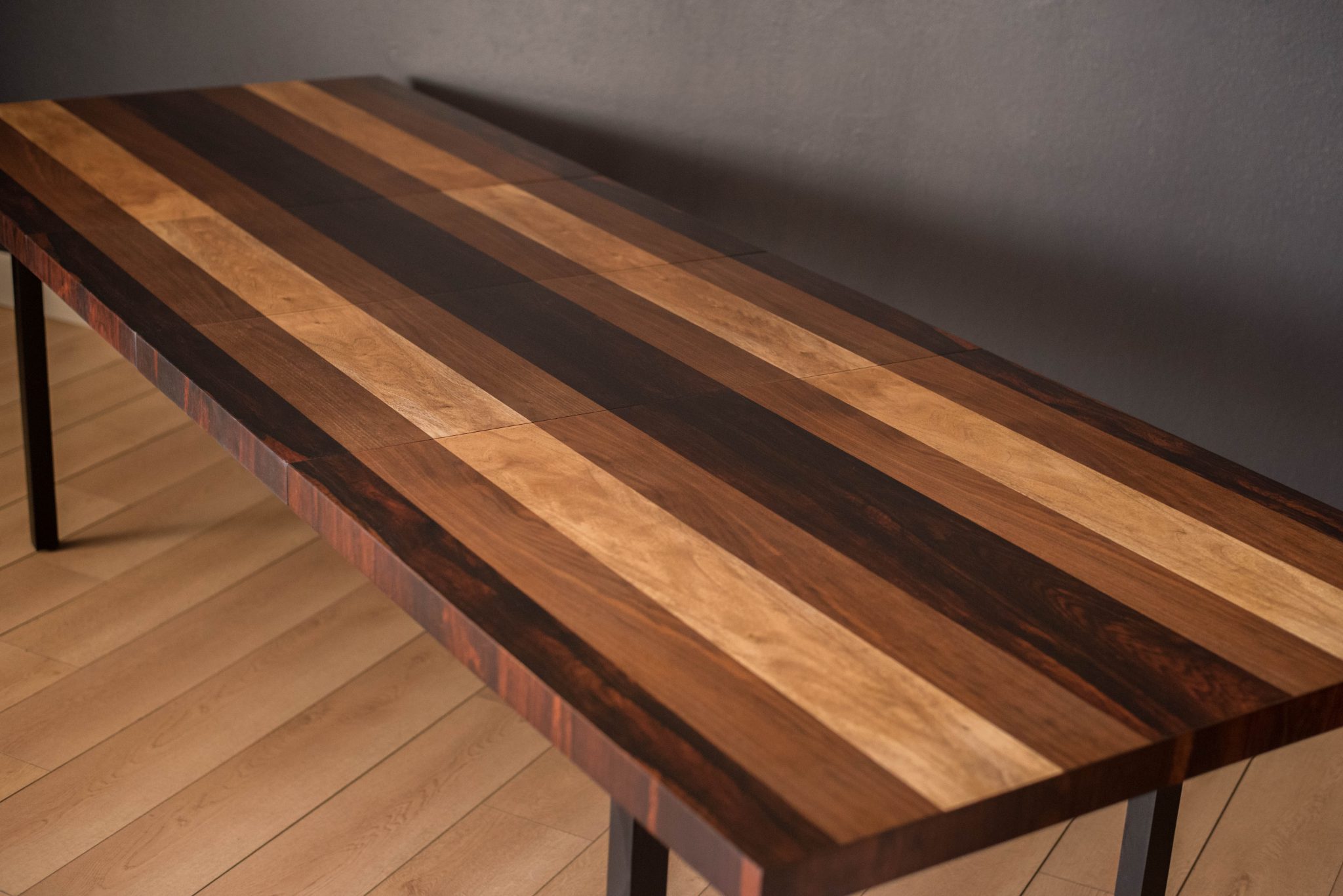 Vintage extendable dining table designed by Milo Baughman for Directional. This classic contemporary piece is comprised of 3 different contrasting wood tones: rosewood, ash, and walnut. Supported by four black ebonized square legs and includes two additional leaves that fit up to 10 seats.