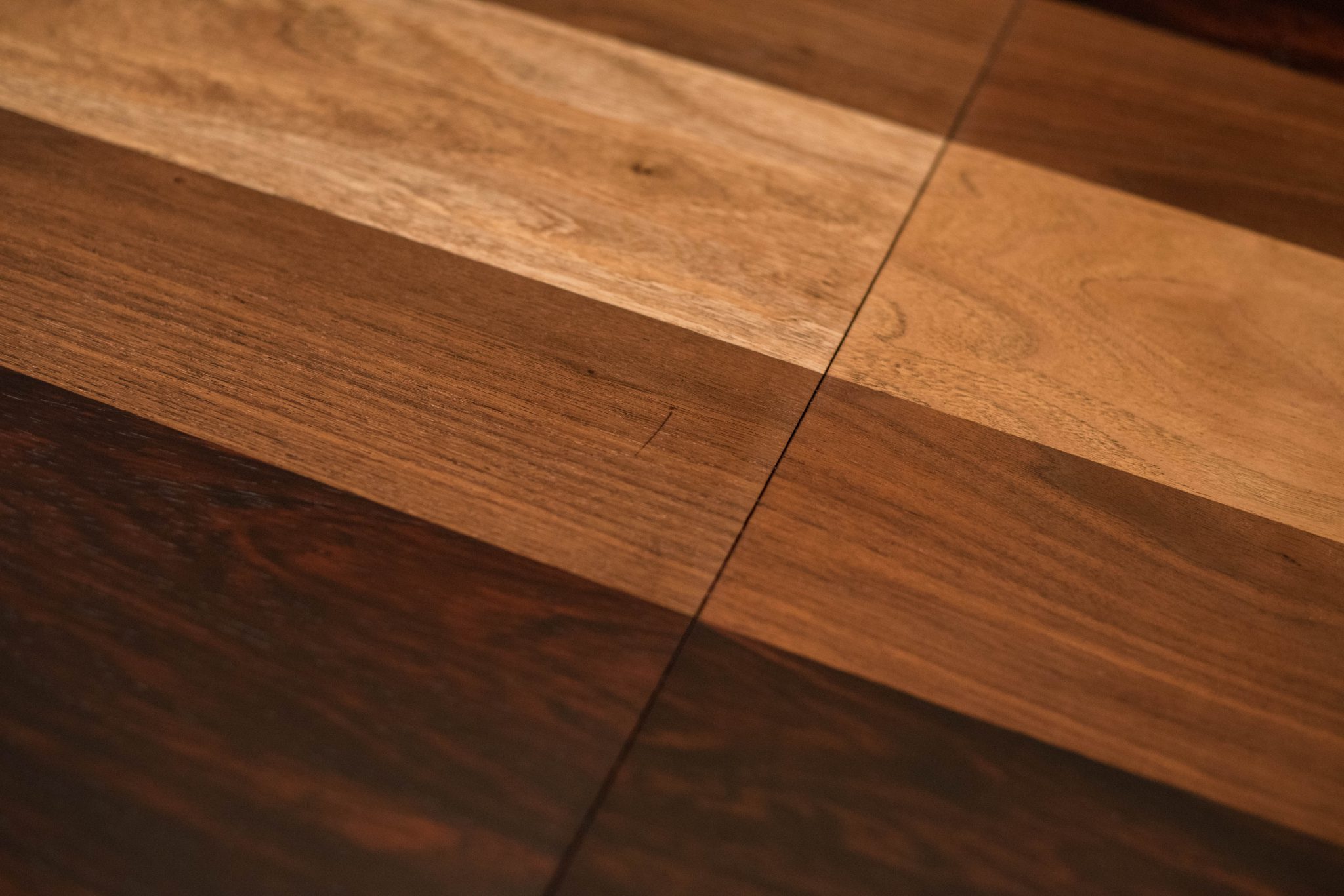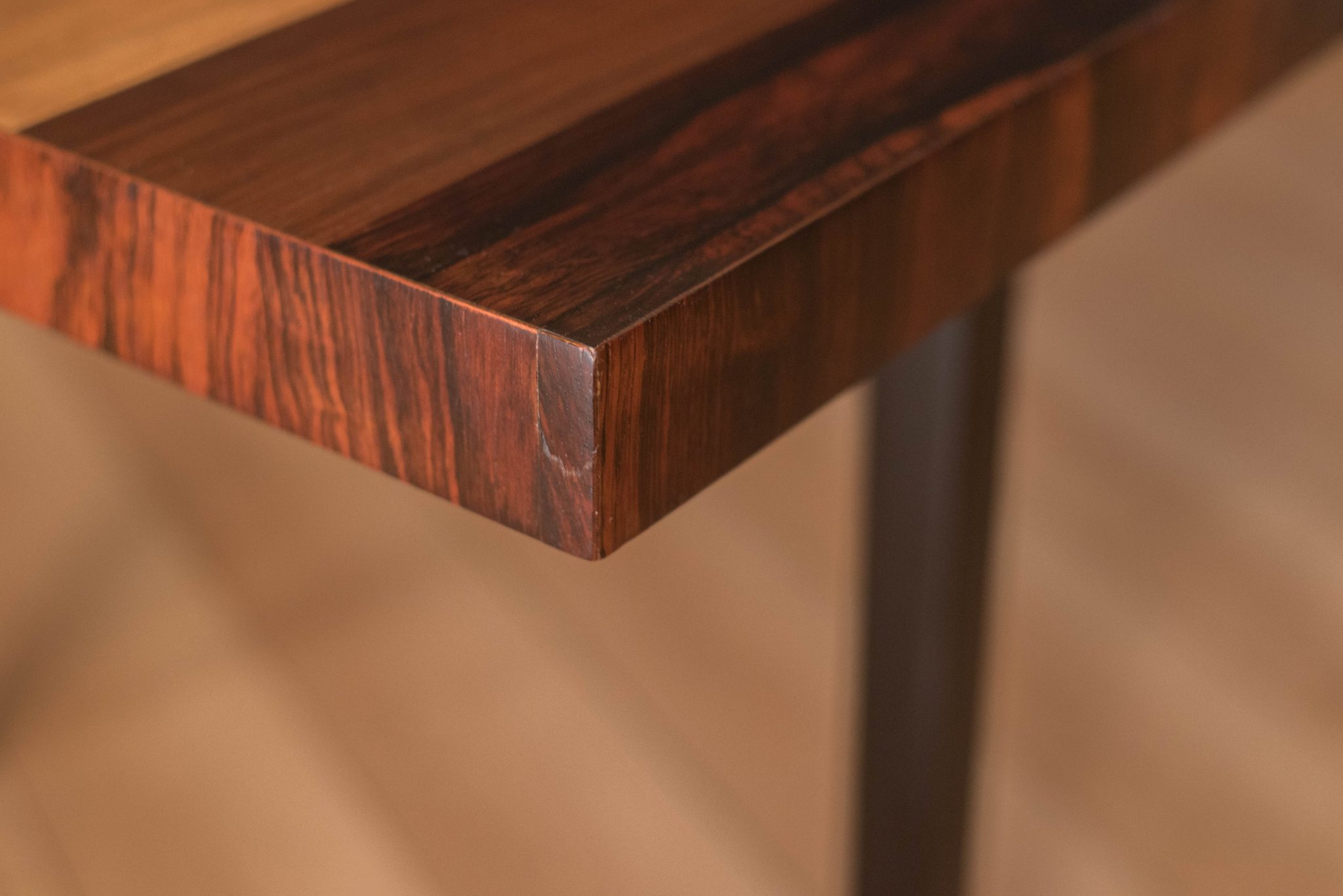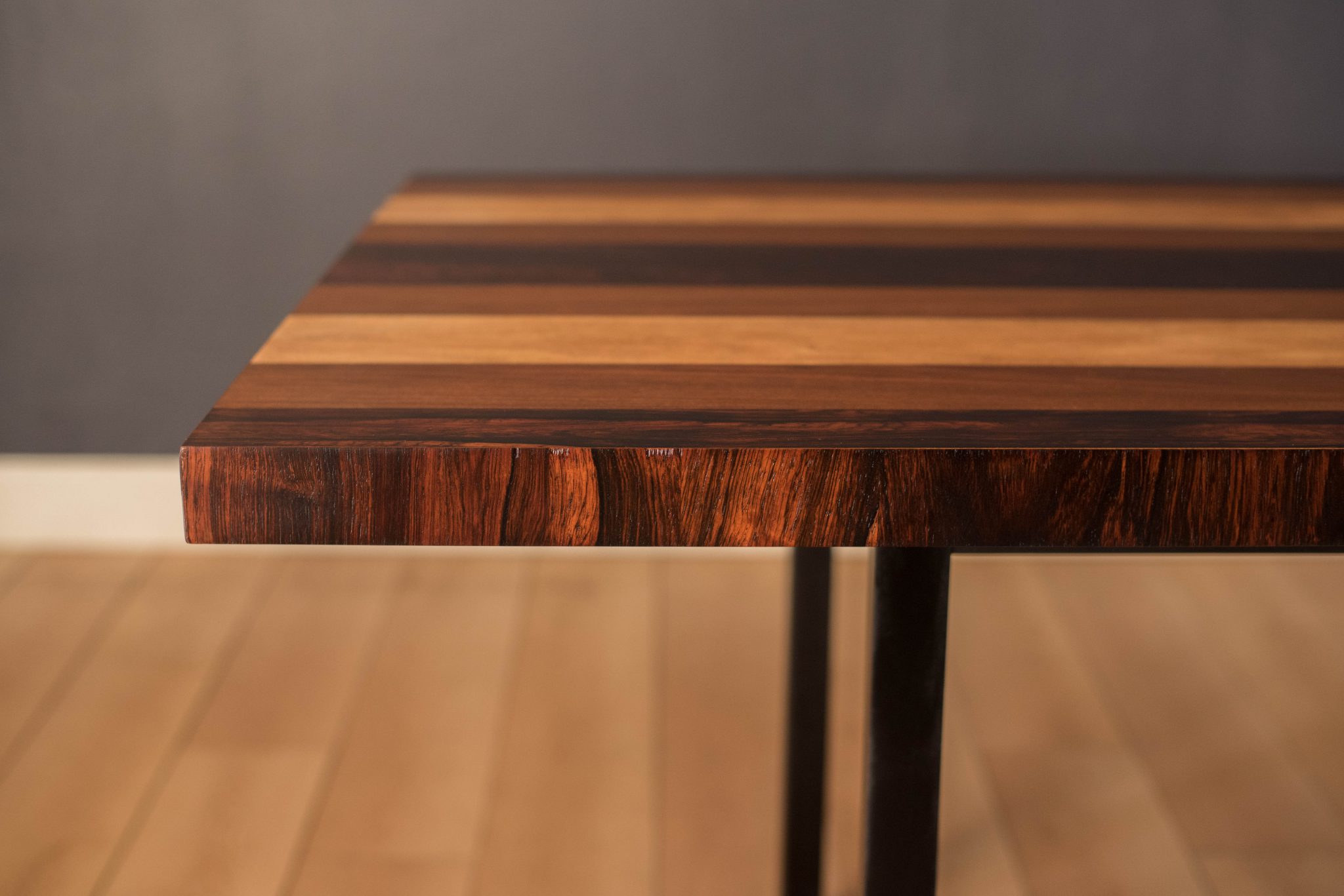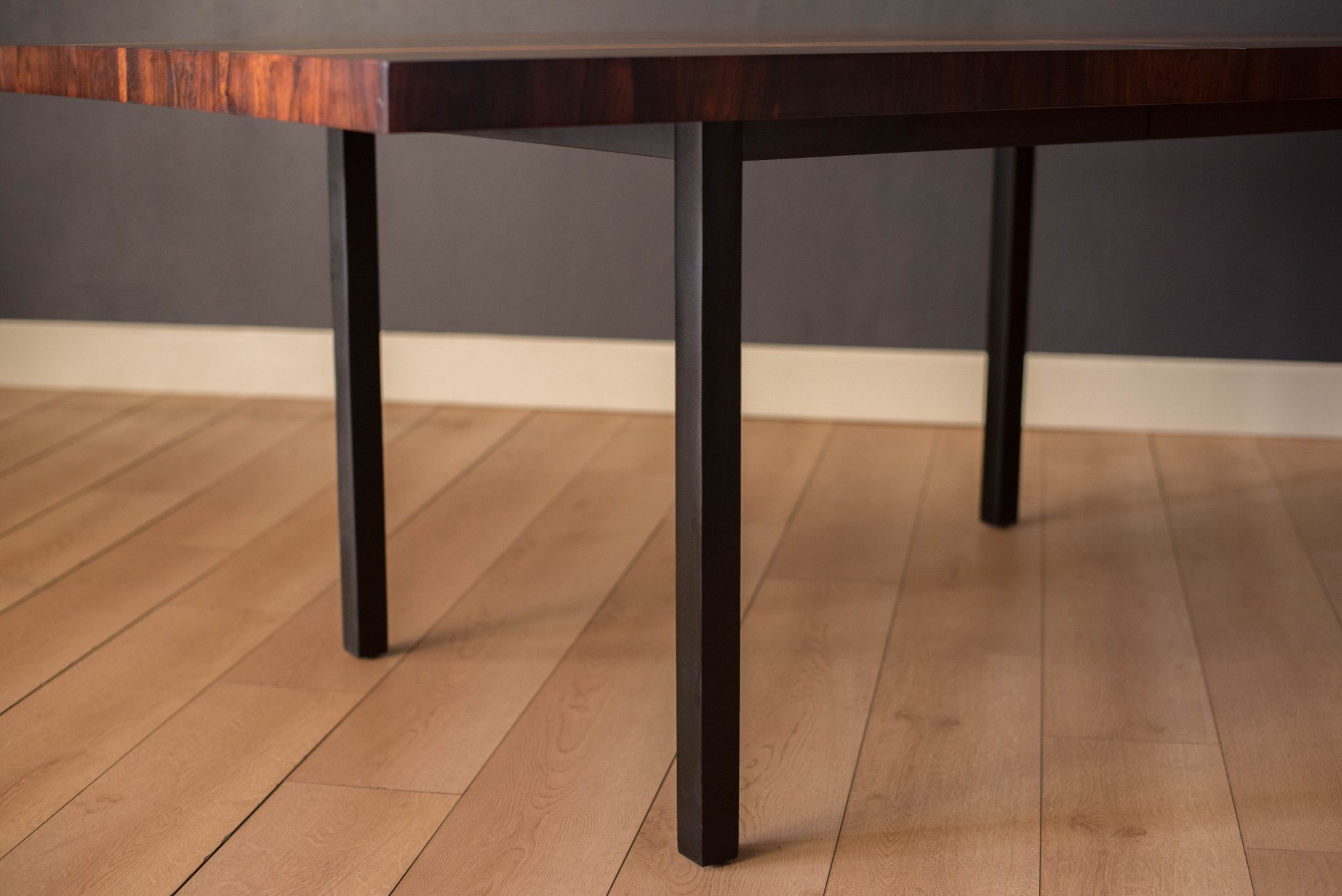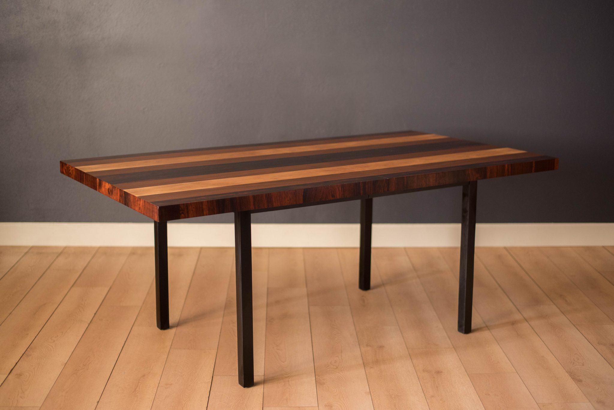 Vintage extendable dining table designed by Milo Baughman for Directional. This classic contemporary piece is comprised of 3 different contrasting wood tones: rosewood, ash, and walnut. Supported by four black ebonized square legs and includes two additional leaves that fit up to 10 seats.
