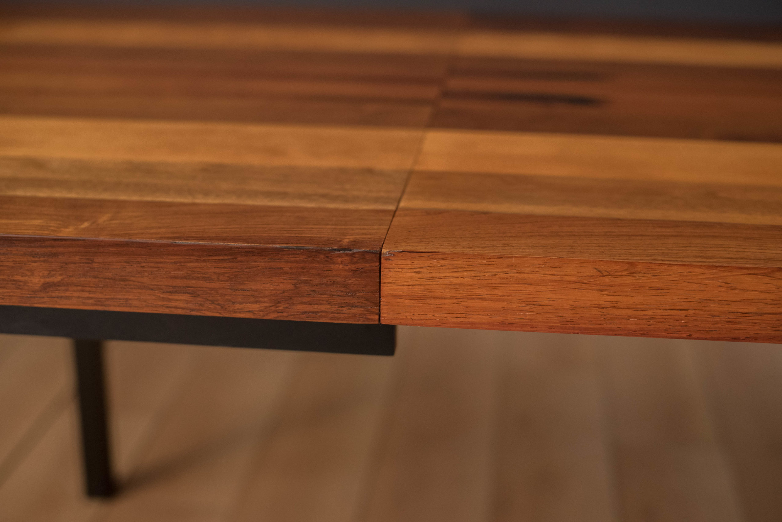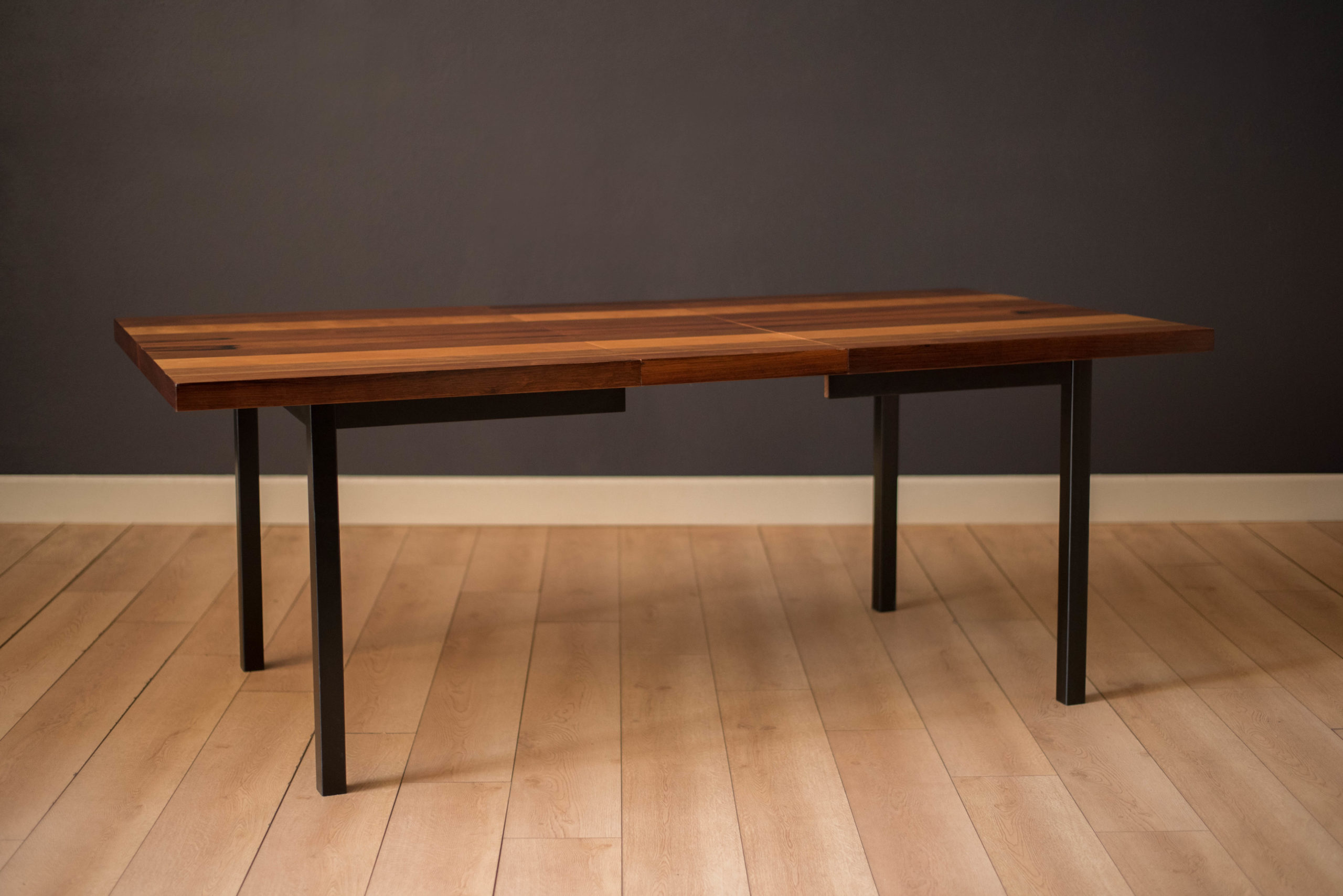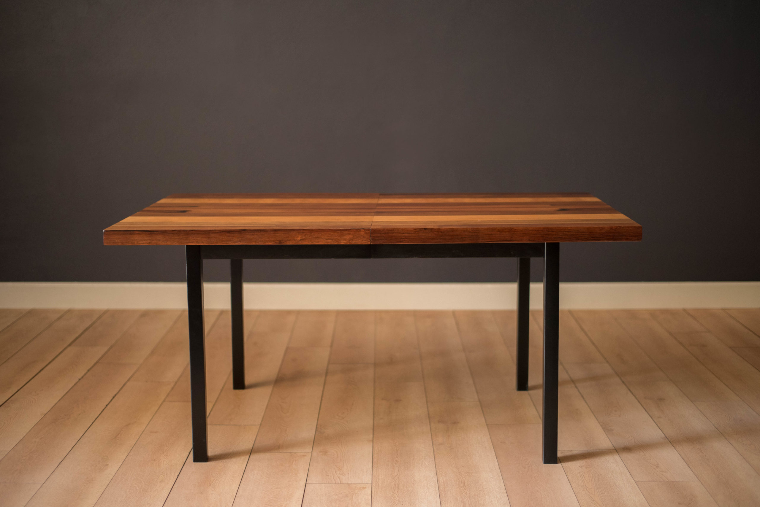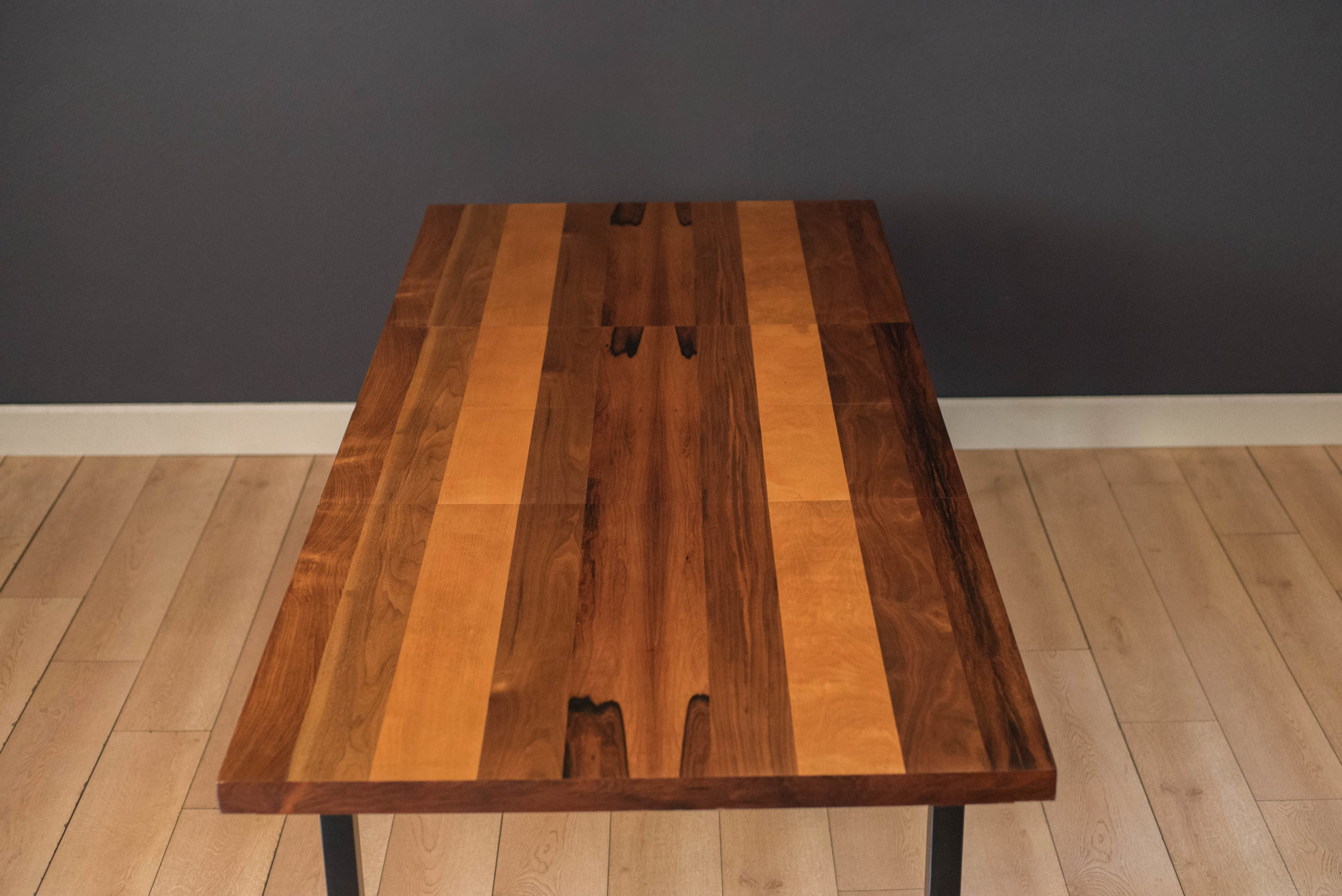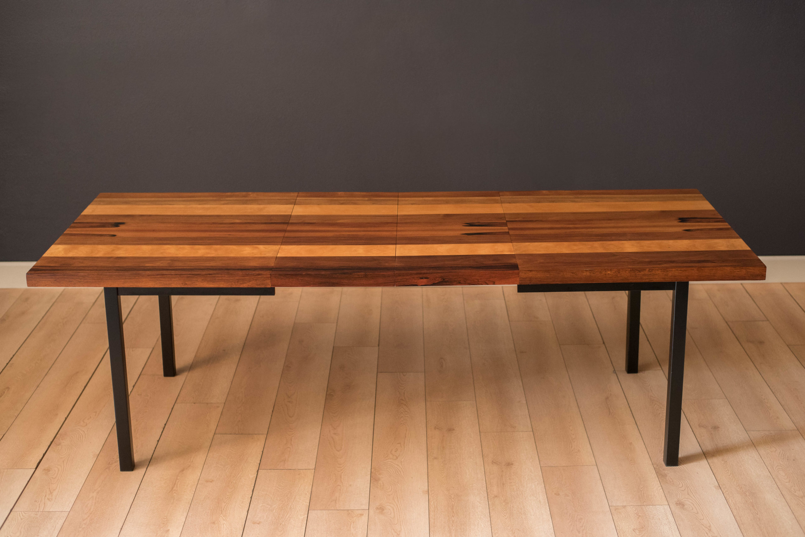 Vintage extendable dining table designed by Milo Baughman for Directional. This classic contemporary piece is comprised of 3 different contrasting wood tones: Rosewood, ash, and walnut. Supported by four black ebonized square legs and includes two additional leaves that seats up to 8-10 guests.
