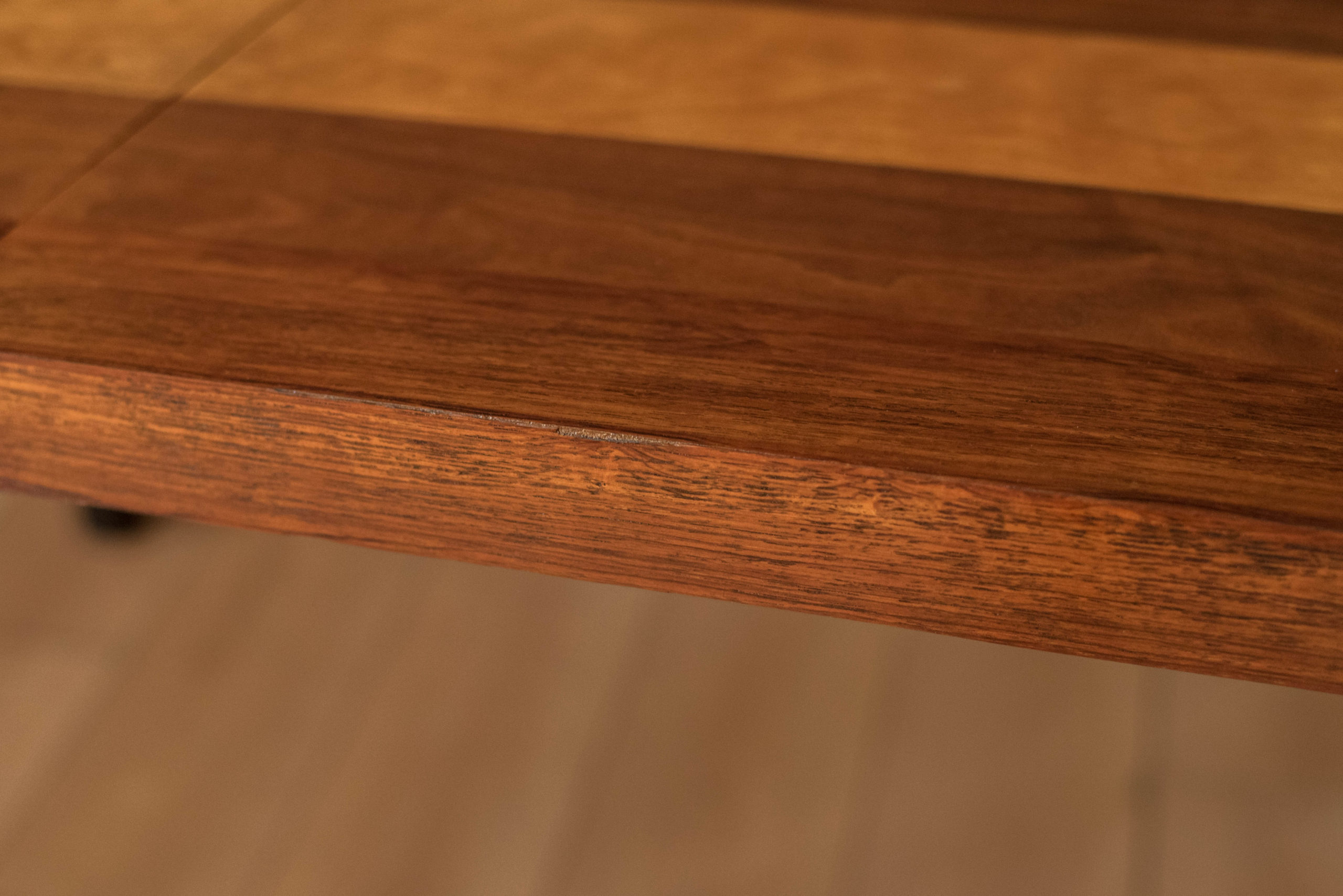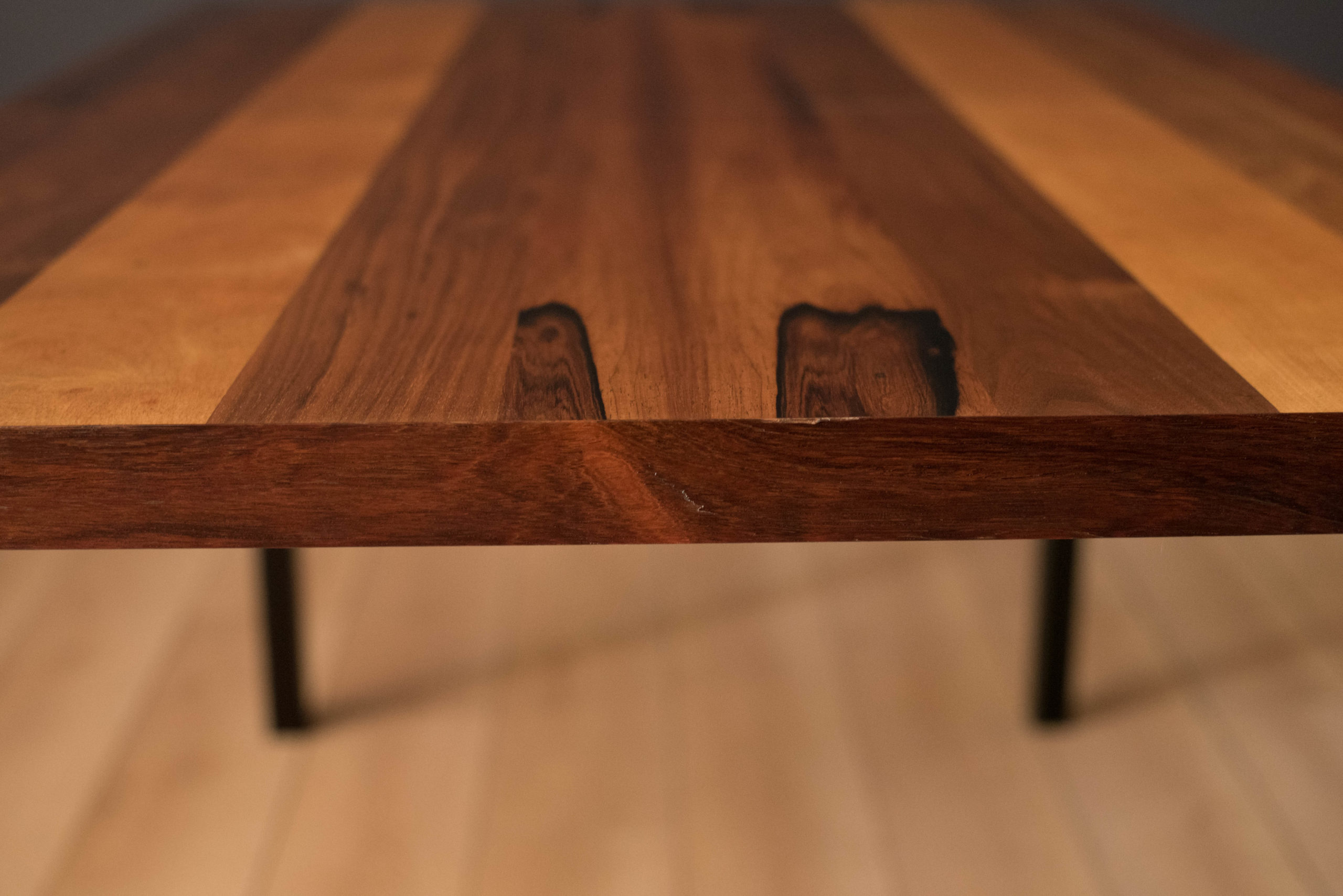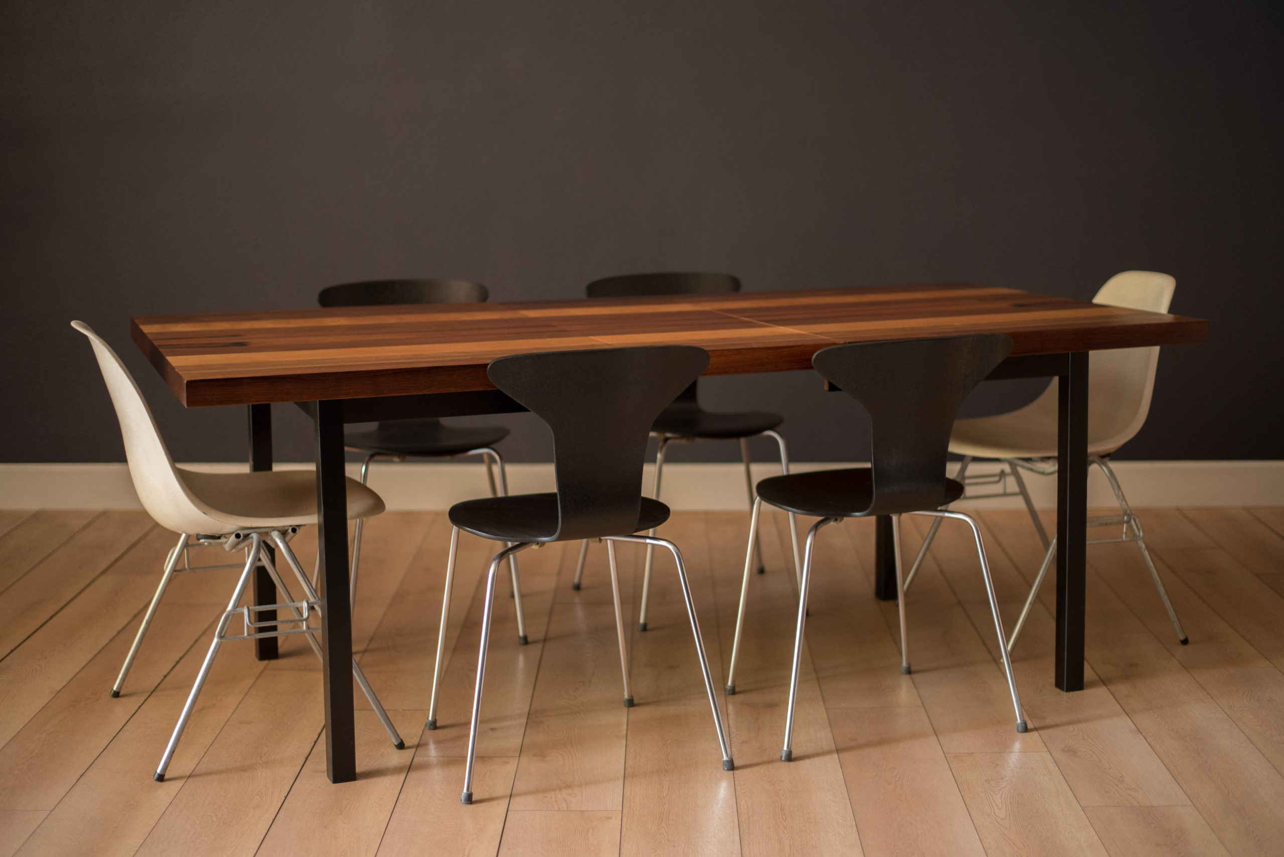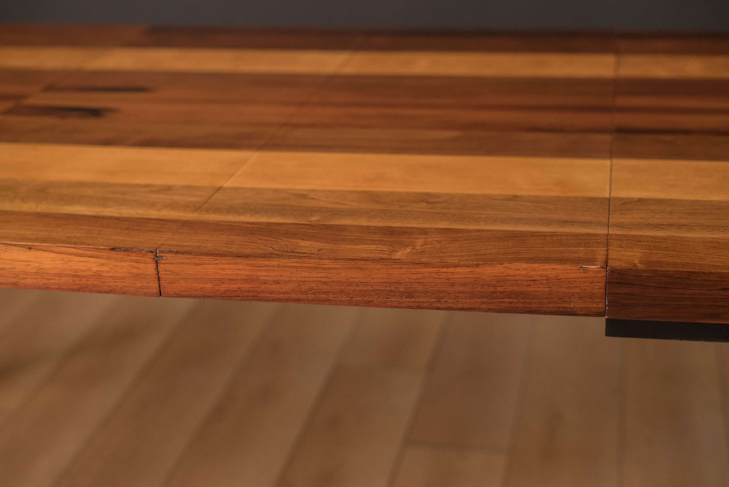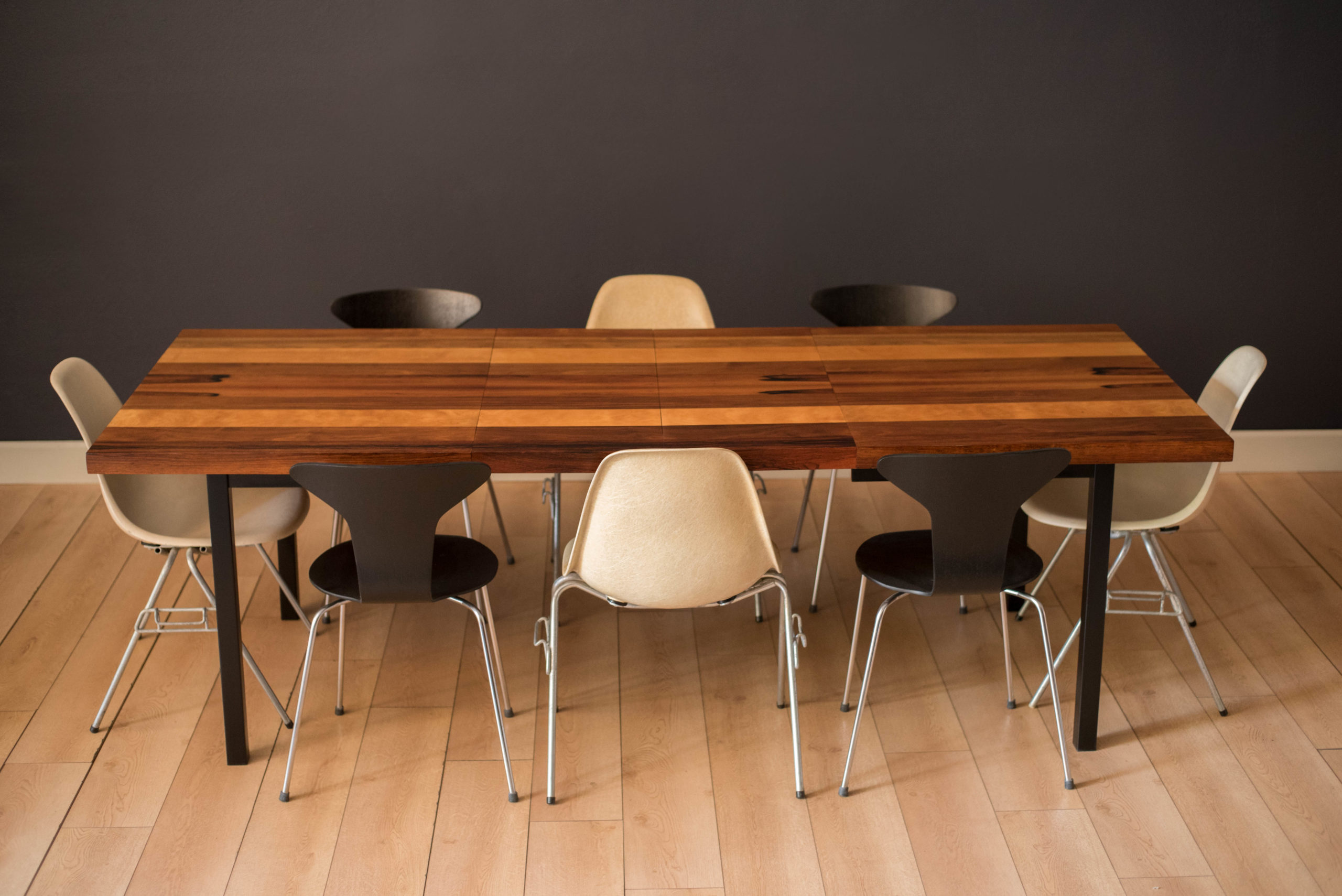 Vintage extendable dining table designed by Milo Baughman for Directional. This classic contemporary piece is comprised of 3 different contrasting wood tones: Rosewood, ash, and walnut. Supported by four black ebonized square legs and includes two additional leaves that seats up to 8-10 guests.