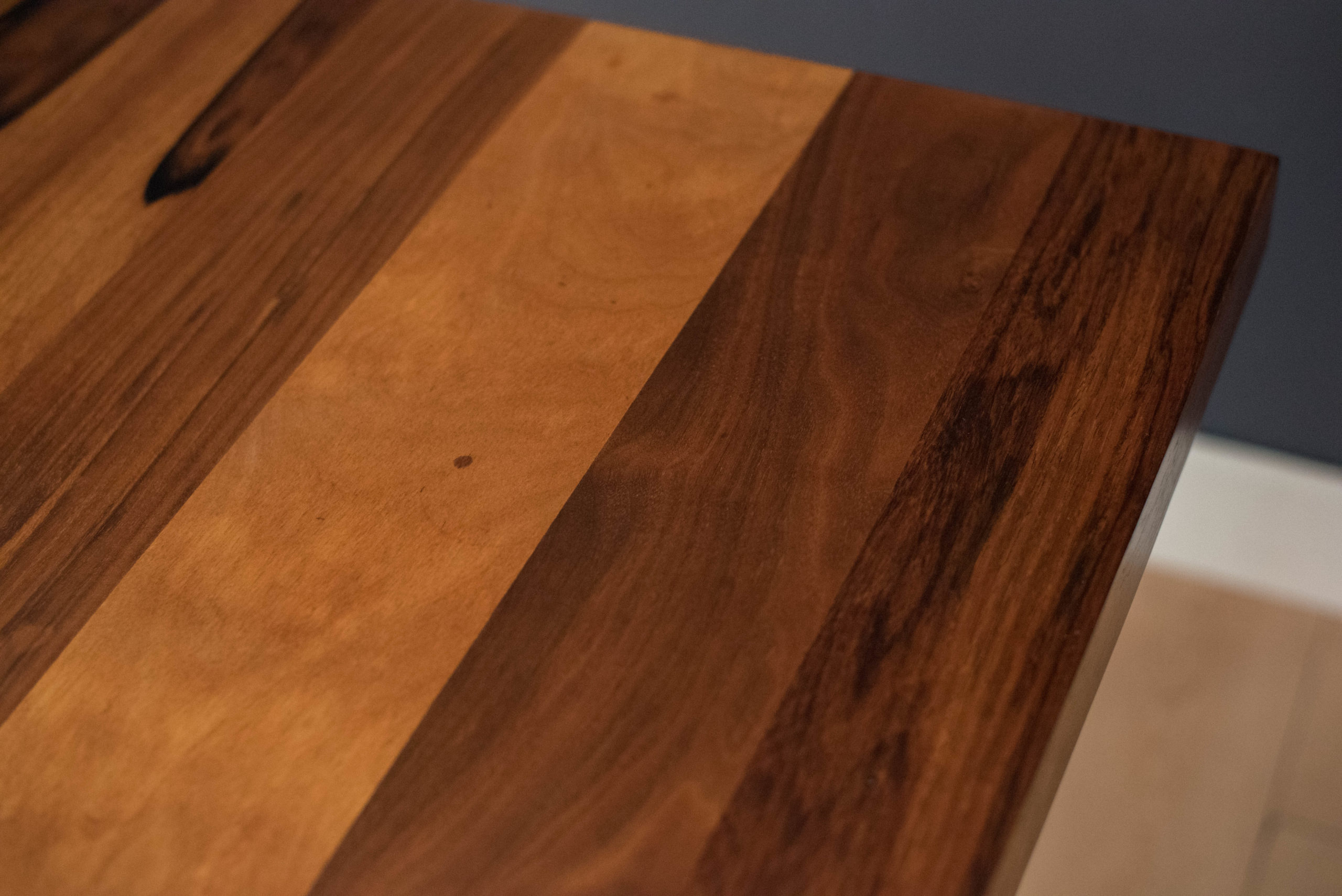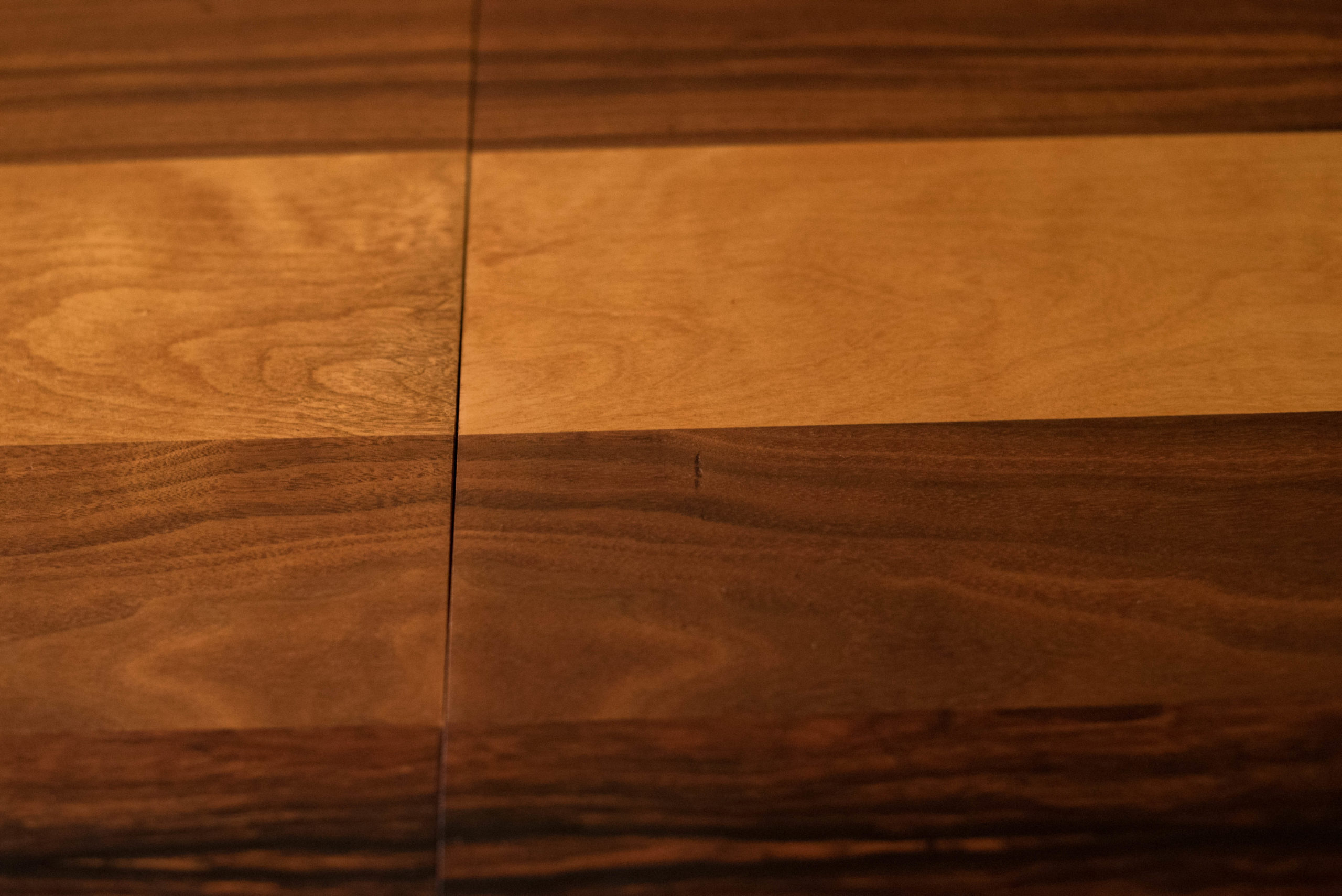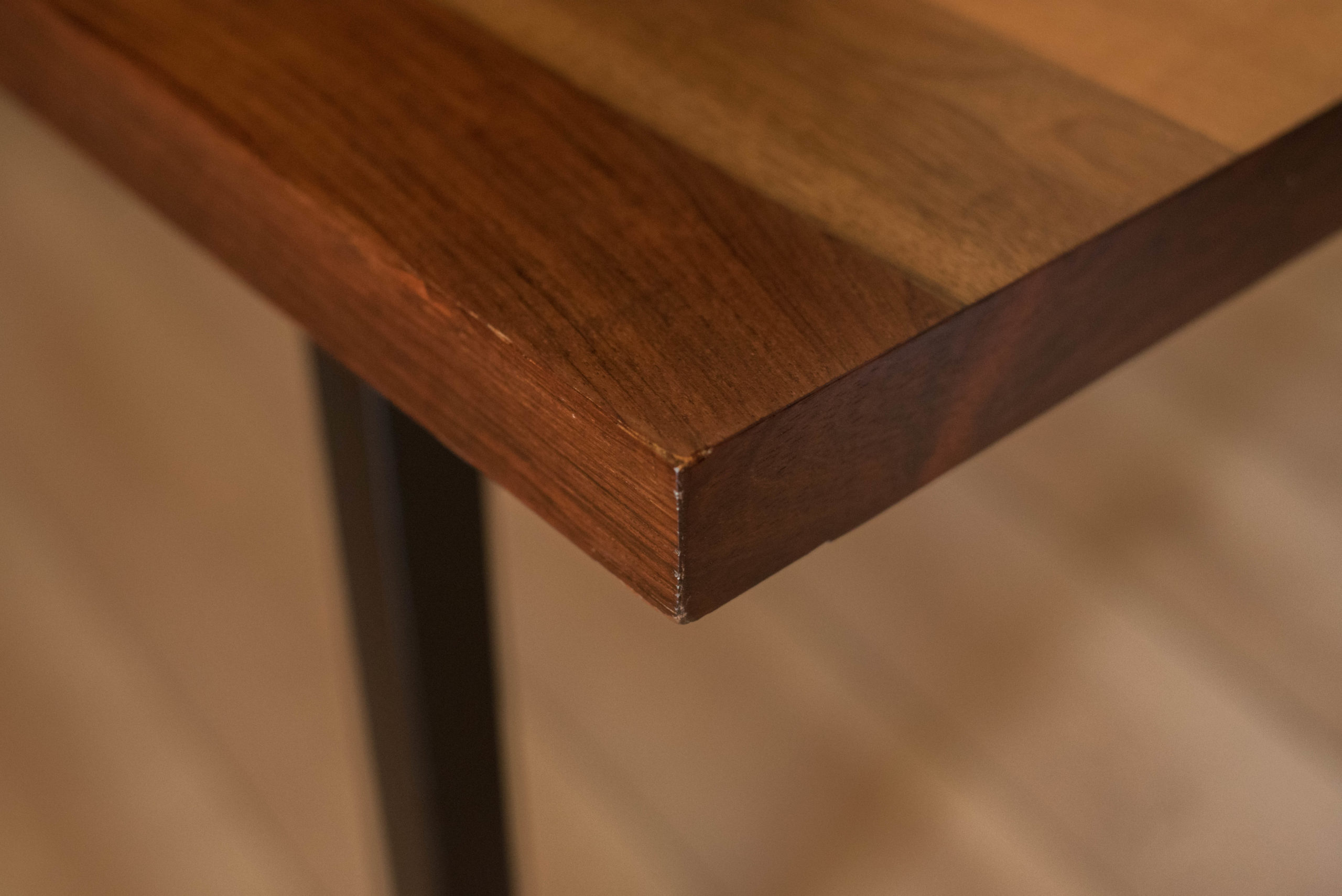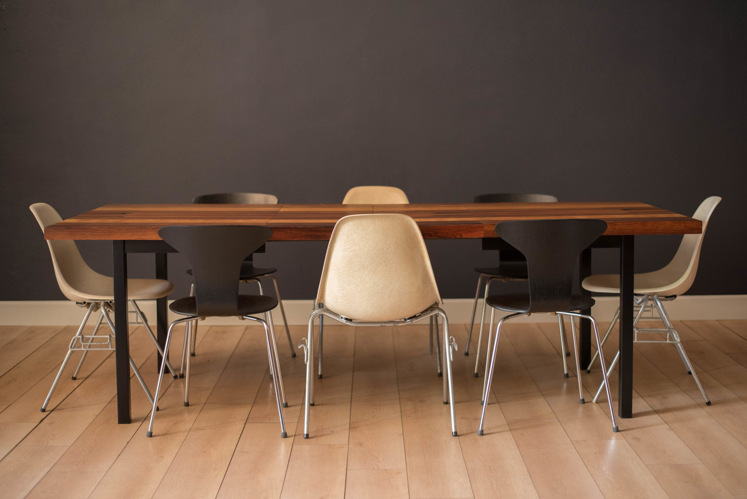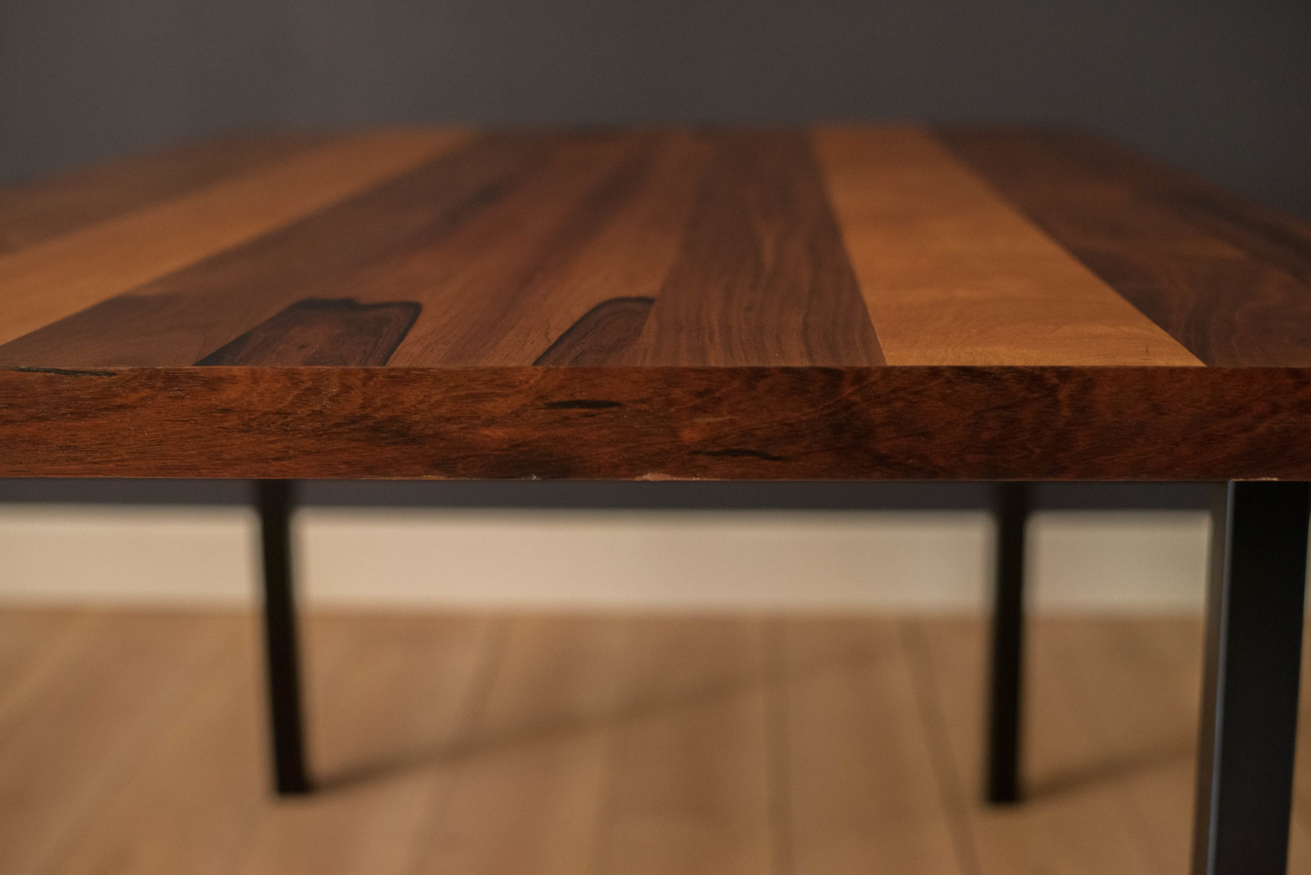 Vintage extendable dining table designed by Milo Baughman for Directional. This classic contemporary piece is comprised of 3 different contrasting wood tones: Rosewood, ash, and walnut. Supported by four black ebonized square legs and includes two additional leaves that seats up to 8-10 guests.