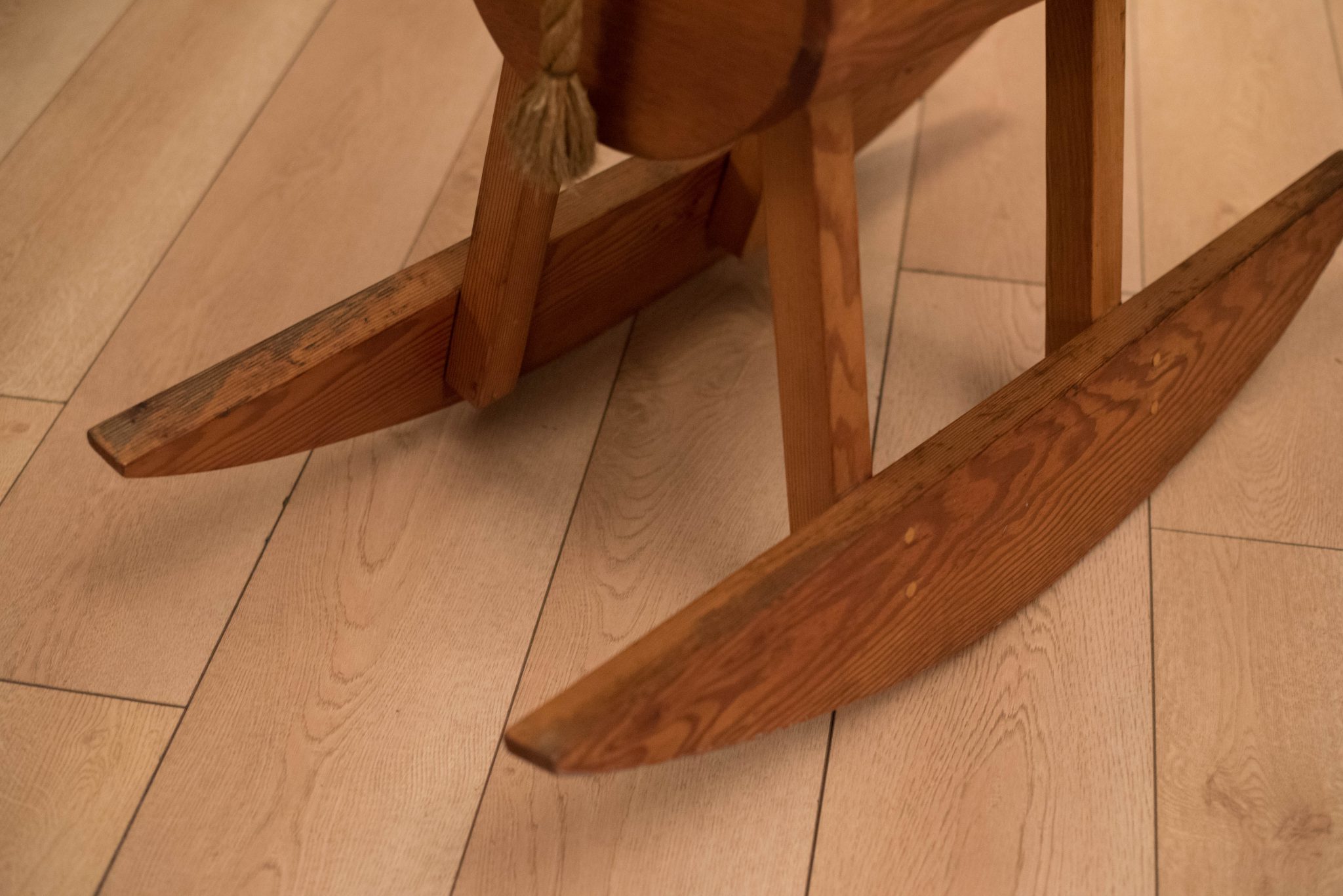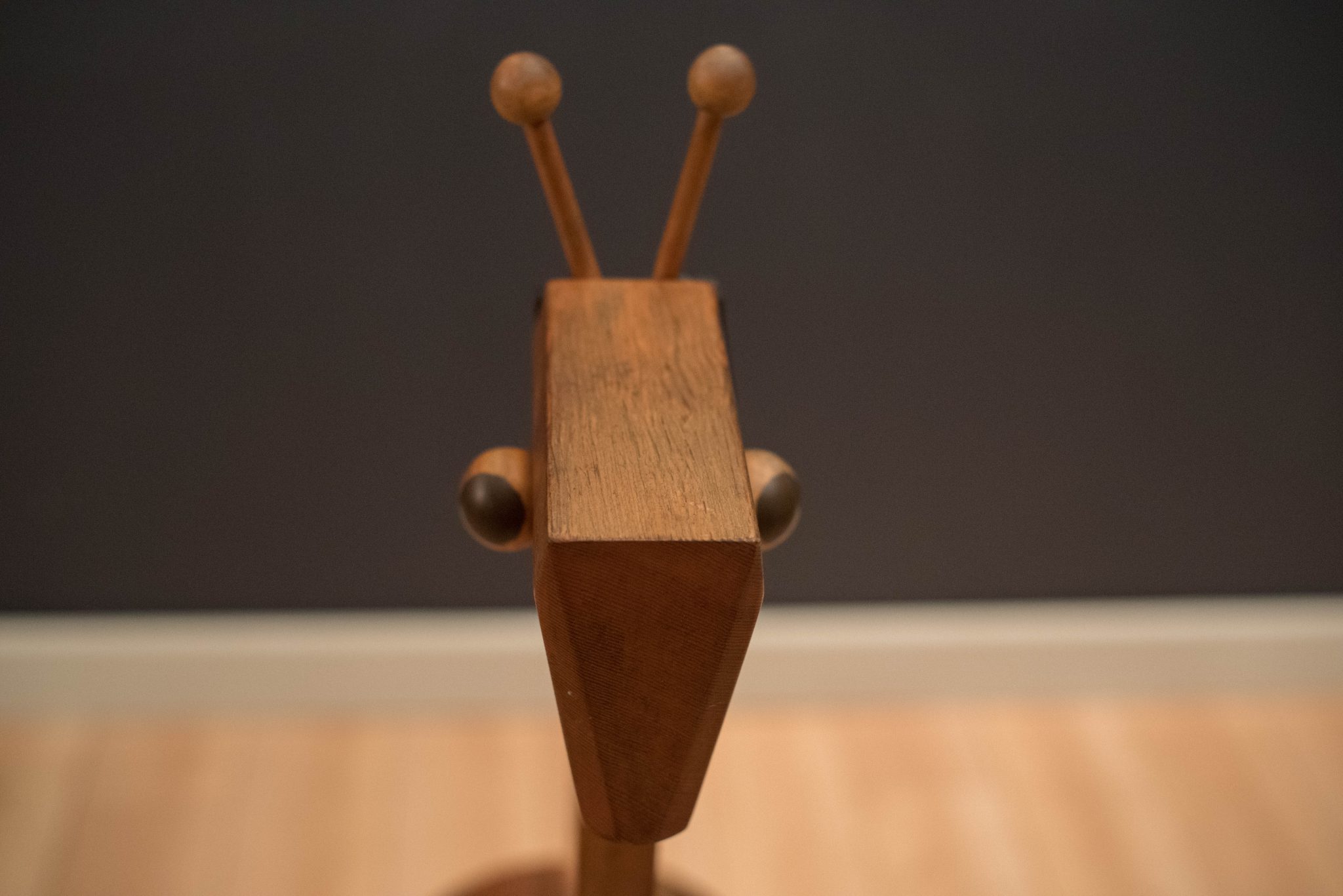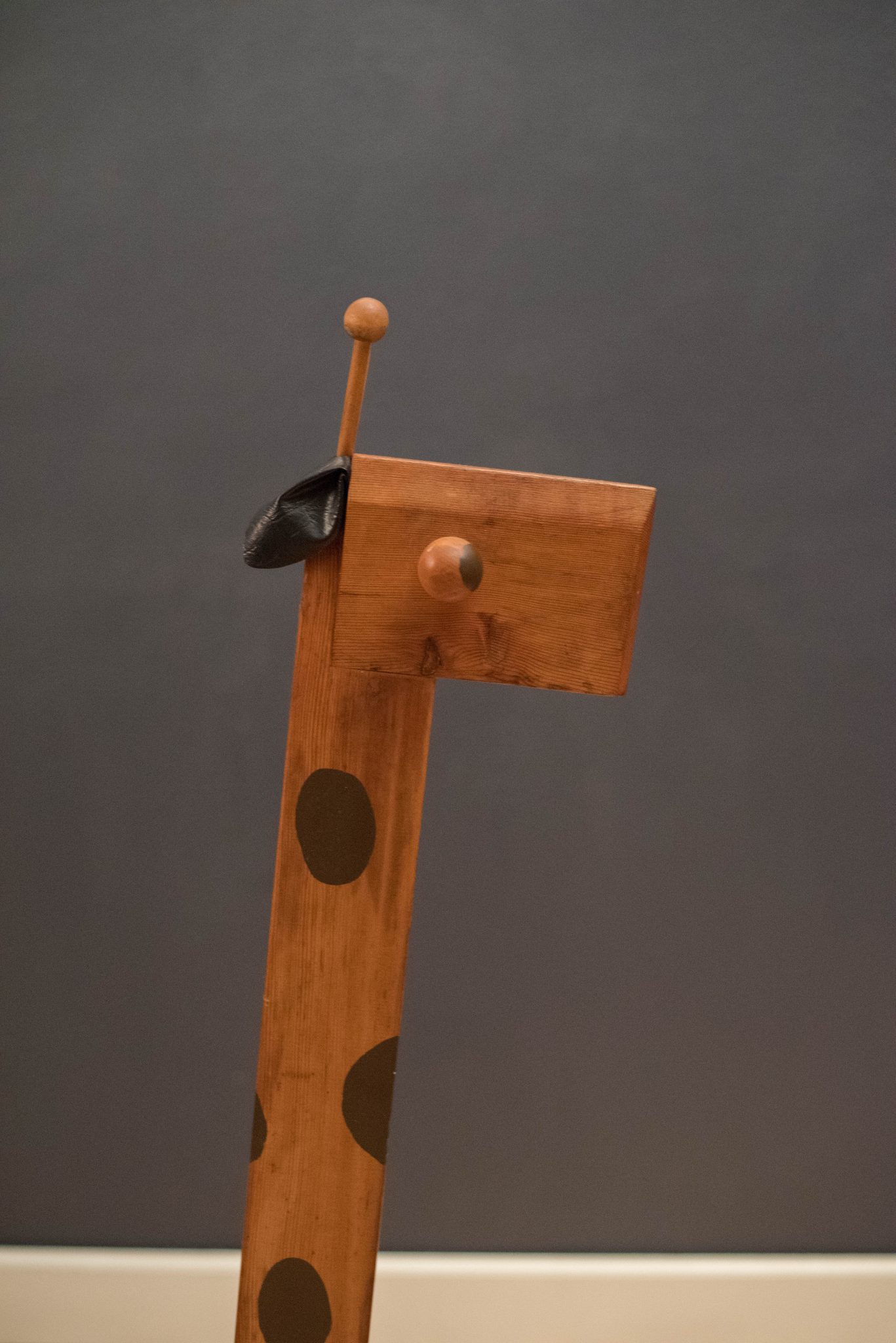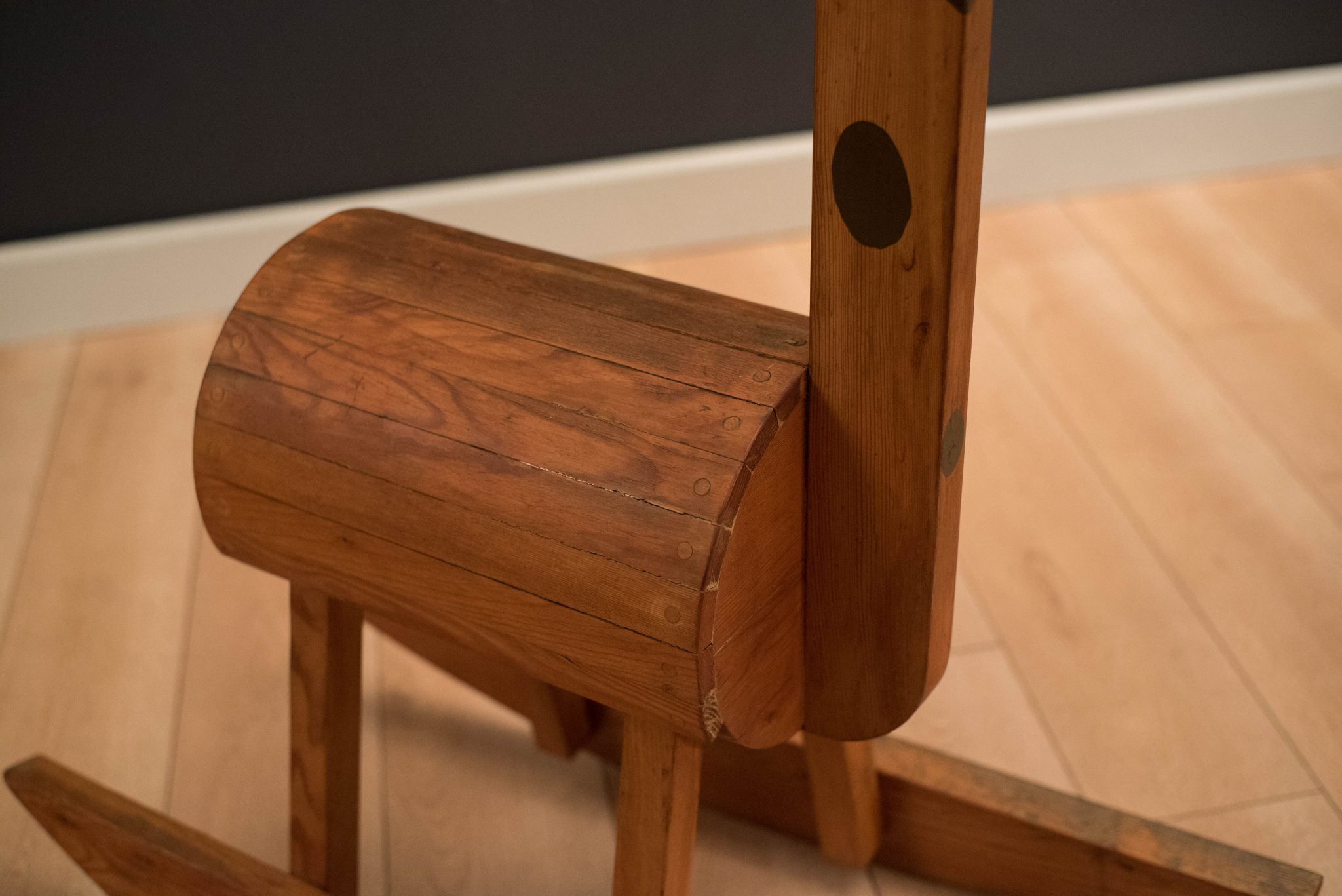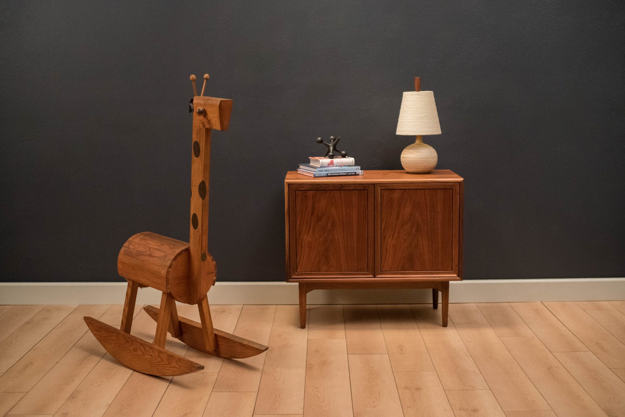 Mid century giraffe rocker toy, circa 1960s. This piece is built with a wooden frame and includes a rope tail with black leatherette ears.