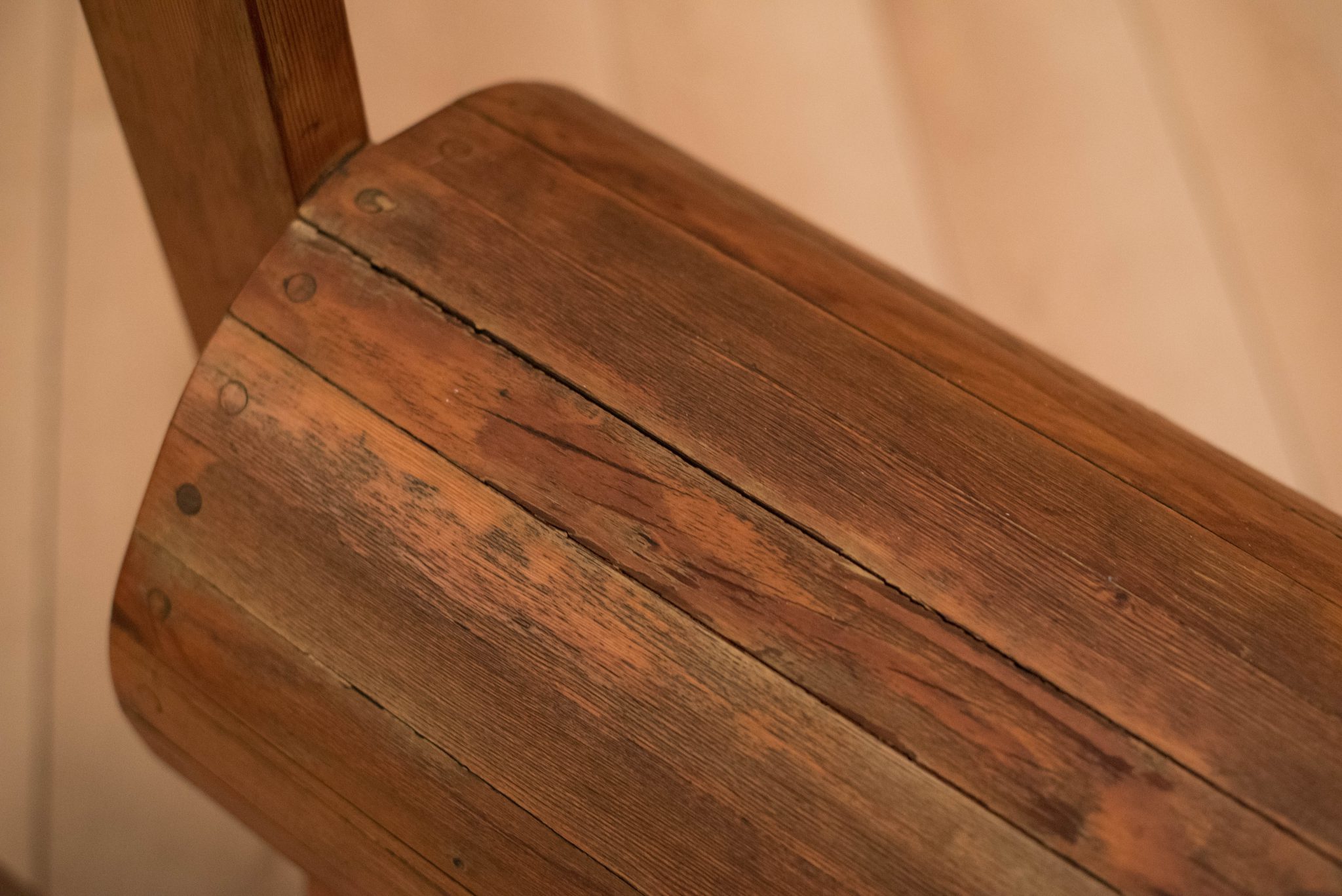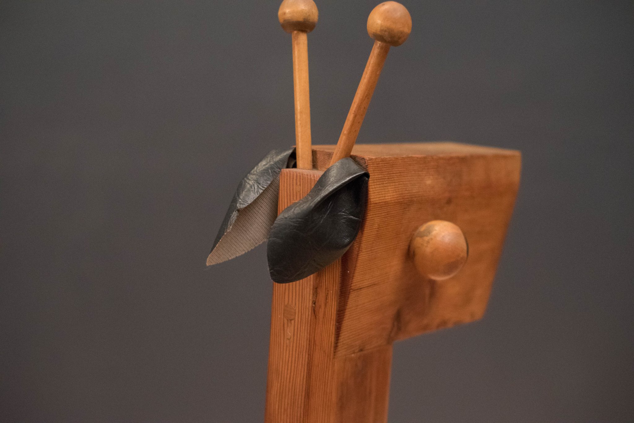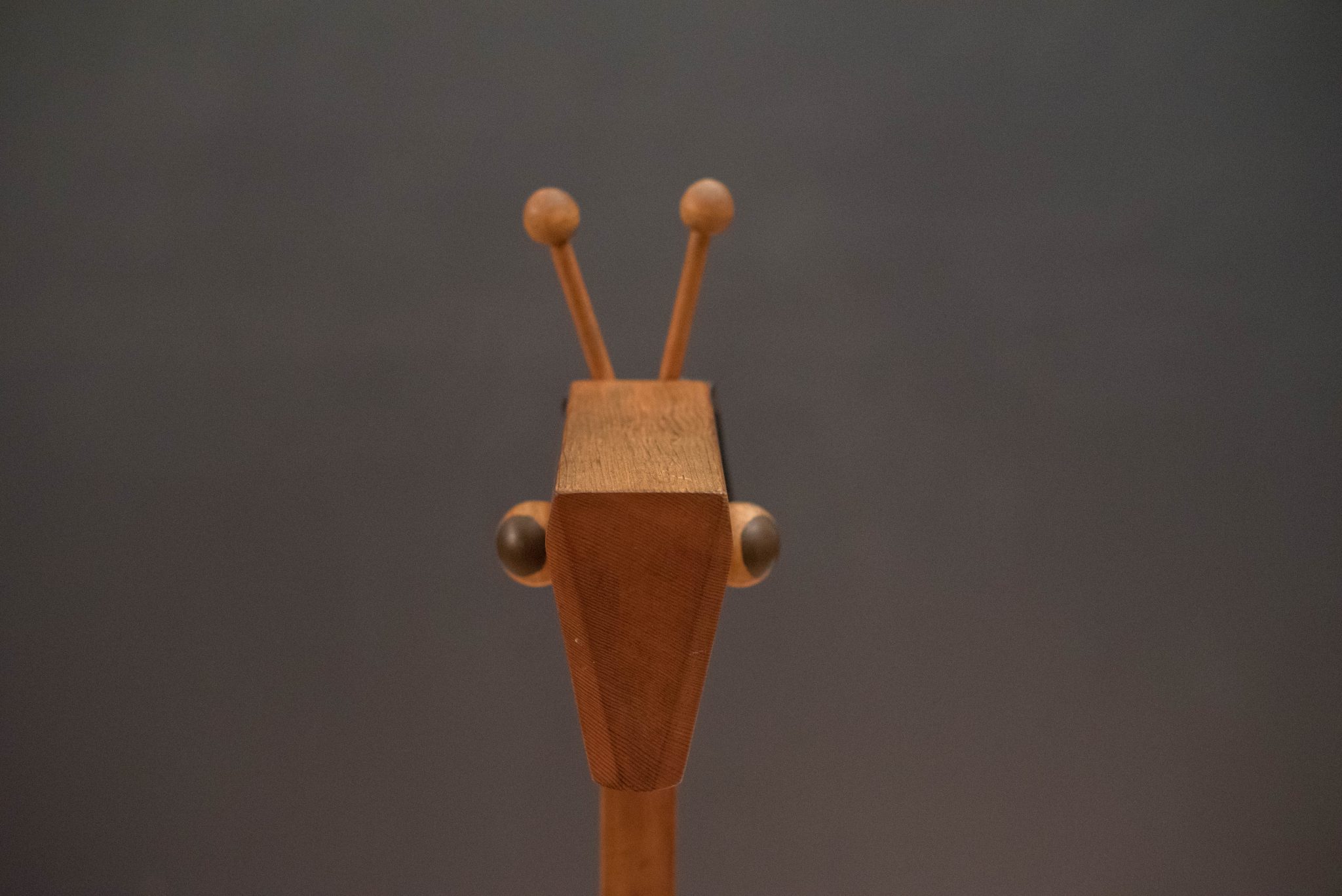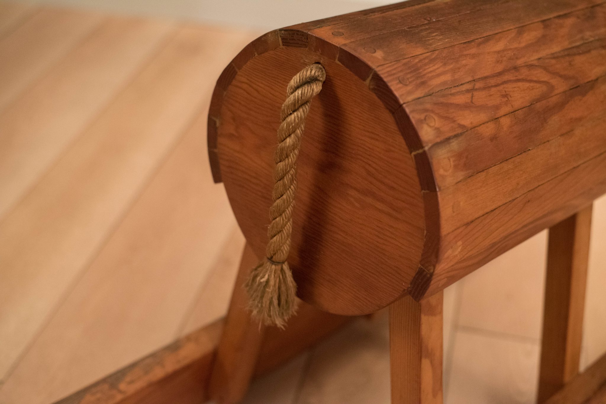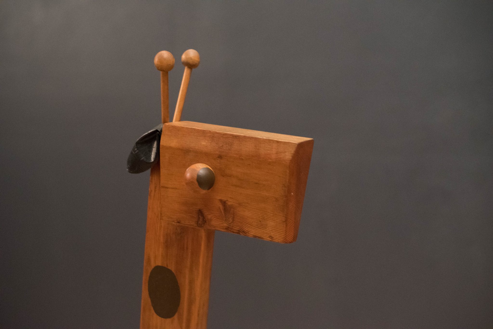 Mid century giraffe rocker toy, circa 1960s. This piece is built with a wooden frame and includes a rope tail with black leatherette ears.