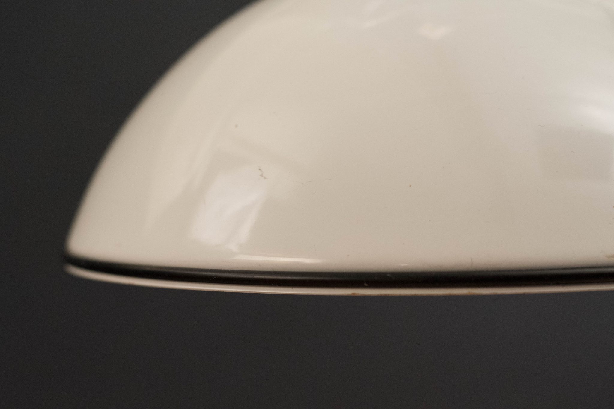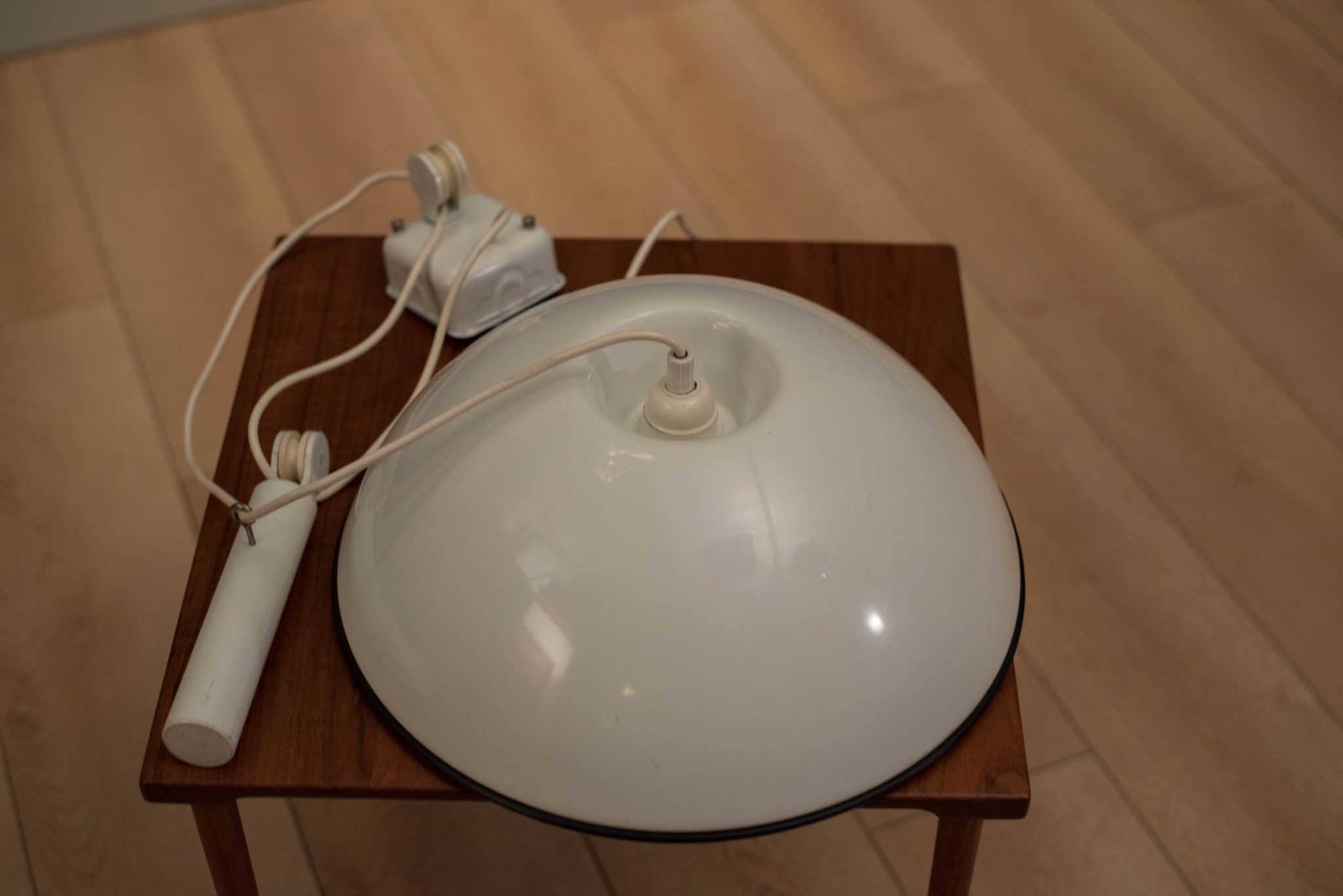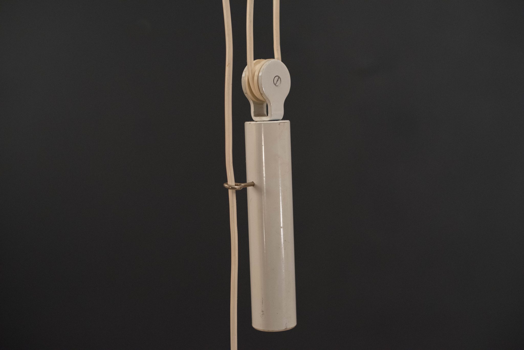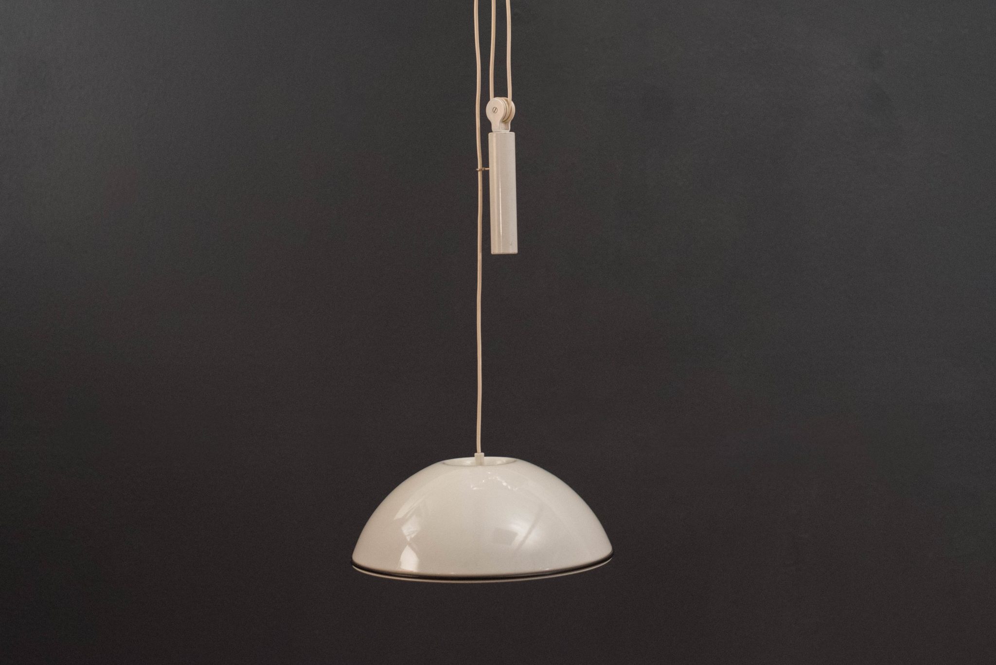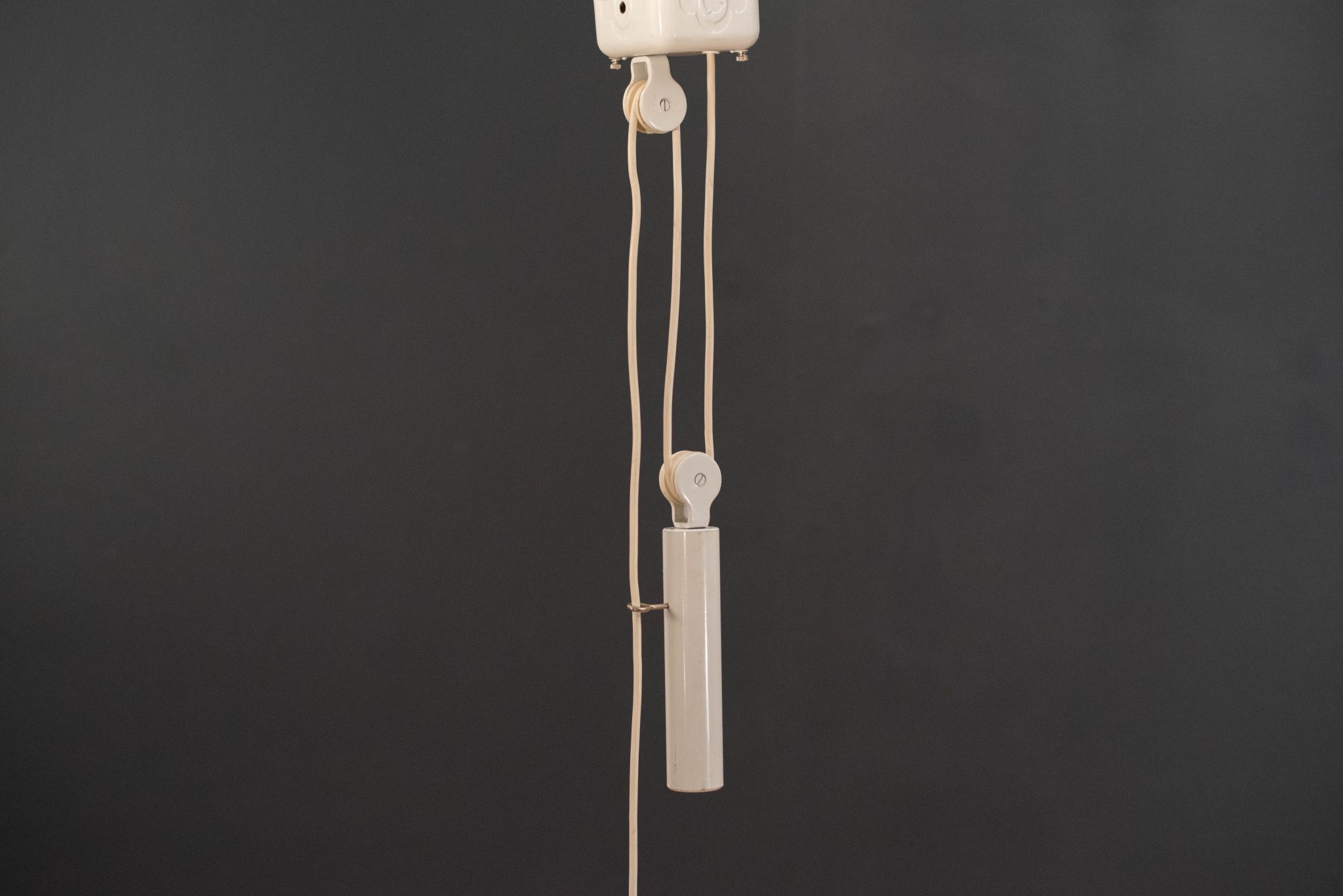 Vintage Relemme hanging pendant lamp designed by Achille and Pier Giacomo Castiglioni for Flos. This piece has a white enamel finish with black rubber trim. Counterbalance pulley is adjustable to your desired height.