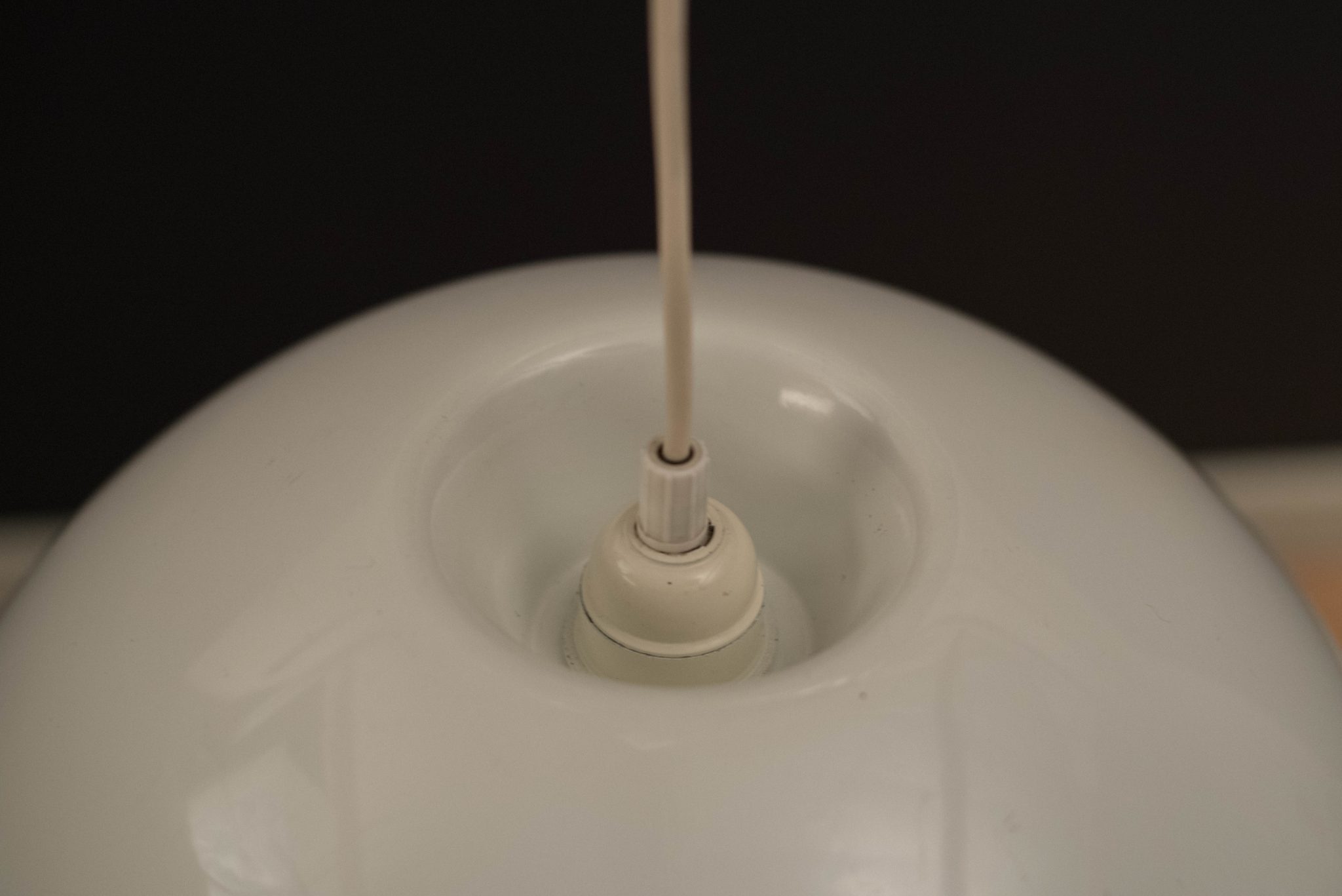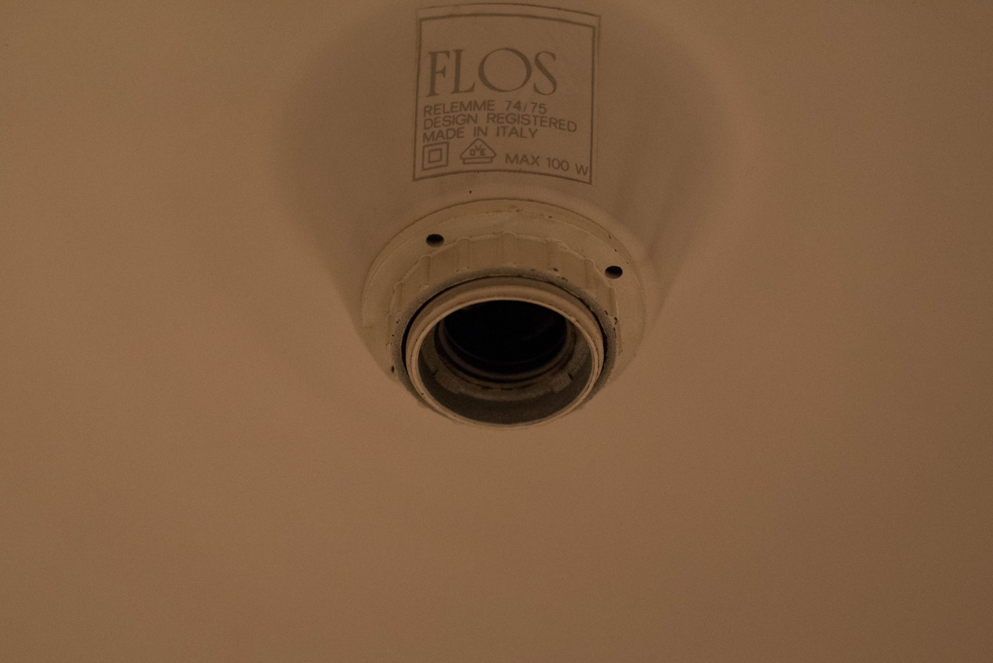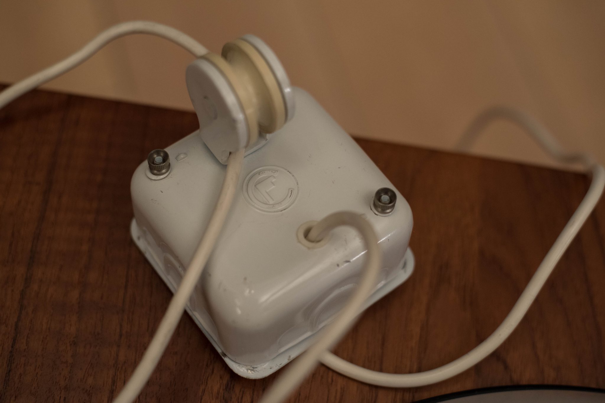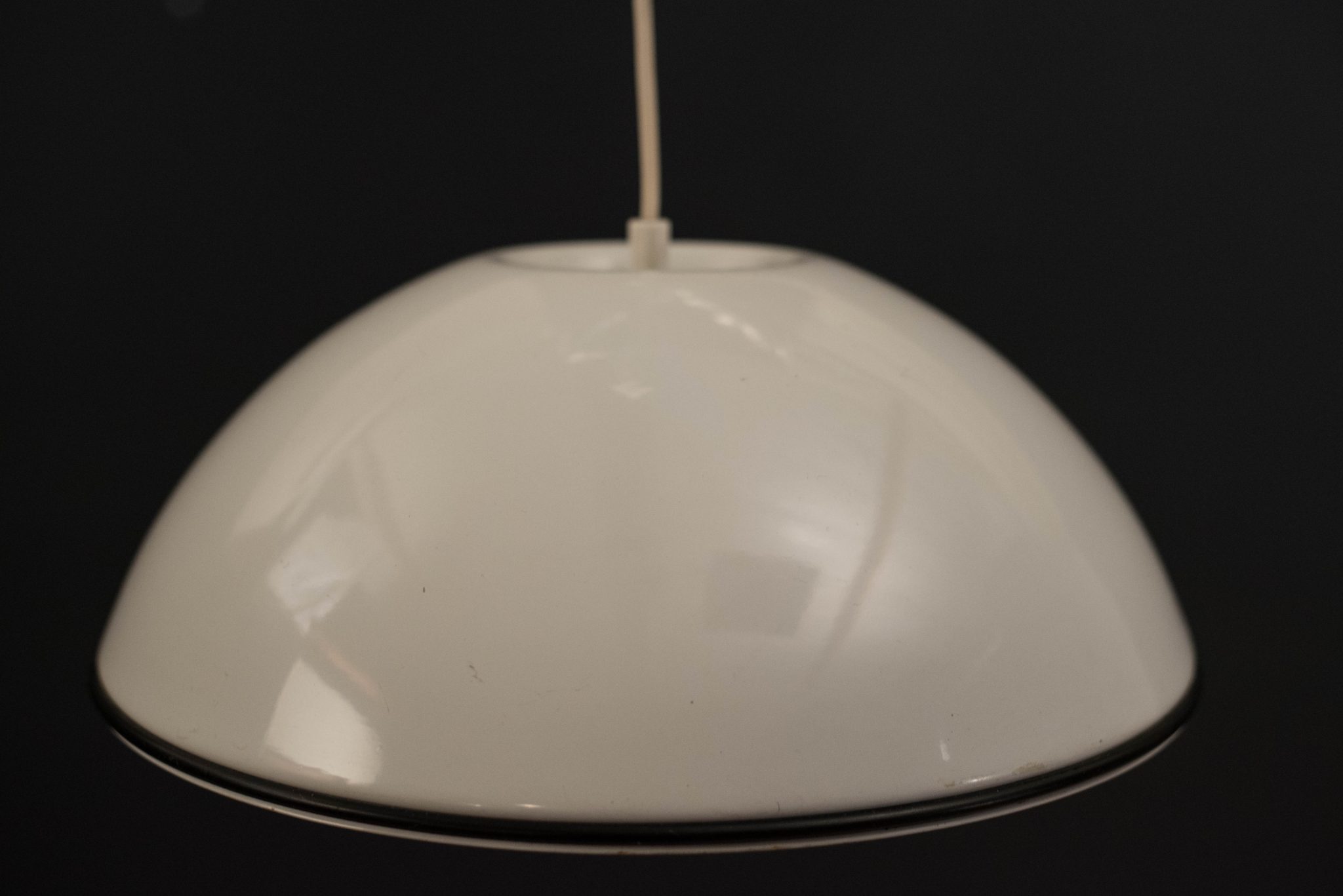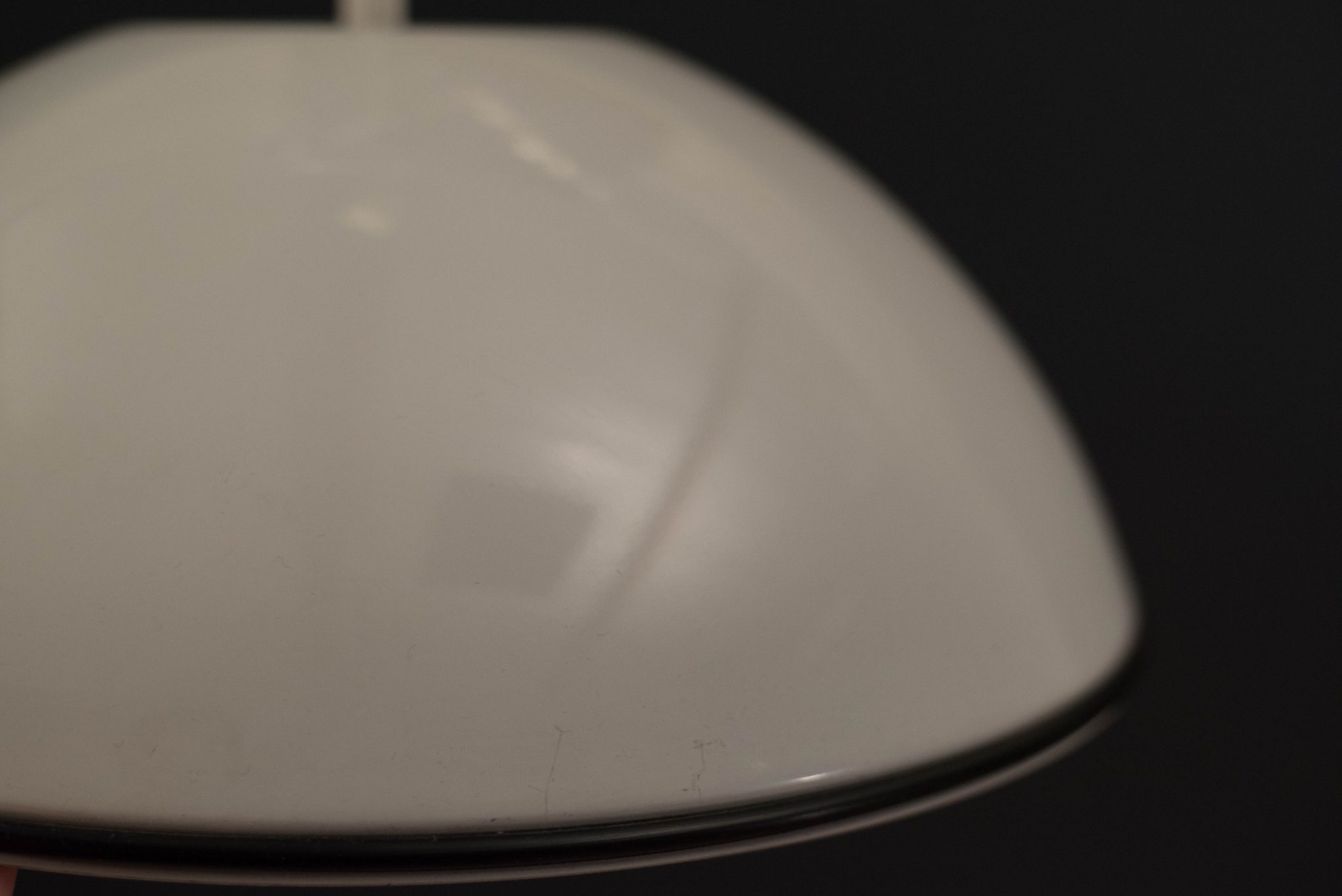 Vintage Relemme hanging pendant lamp designed by Achille and Pier Giacomo Castiglioni for Flos. This piece has a white enamel finish with black rubber trim. Counterbalance pulley is adjustable to your desired height.
