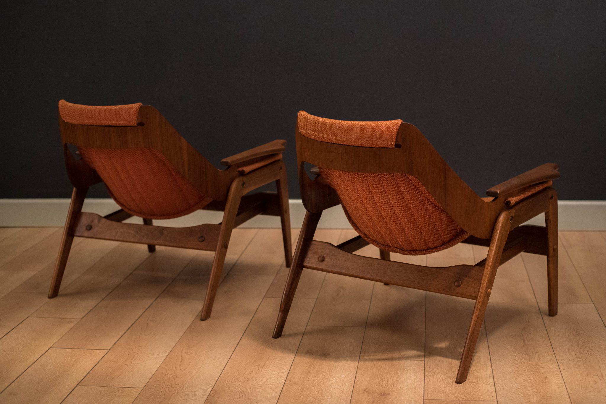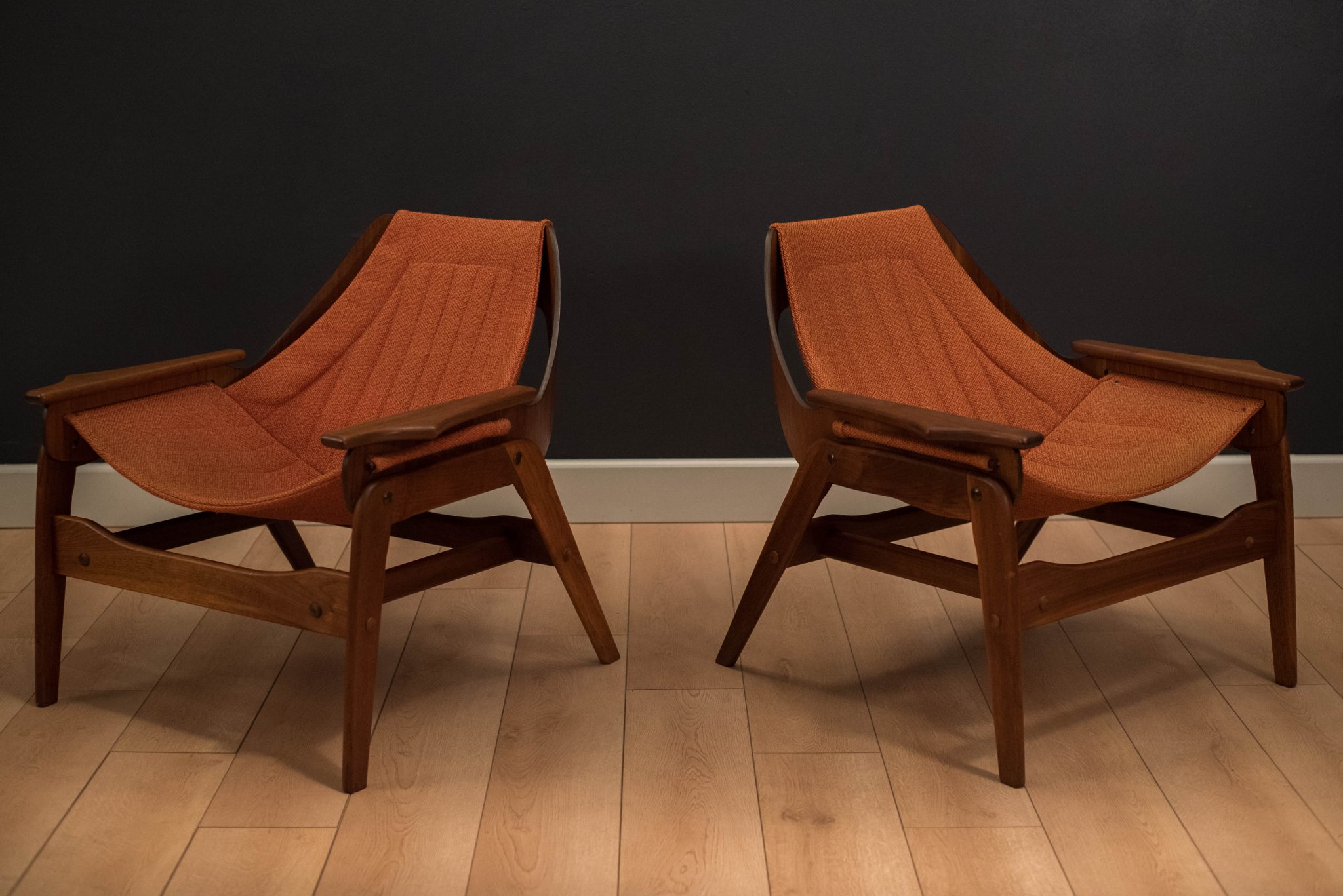 Mid-Century pair of Jerry Johnson sling chairs in walnut. This matching pair features a sculptural walnut frame and original orange tweed sling fabric. In great condition with minimal vintage wear. Price is for the pair.