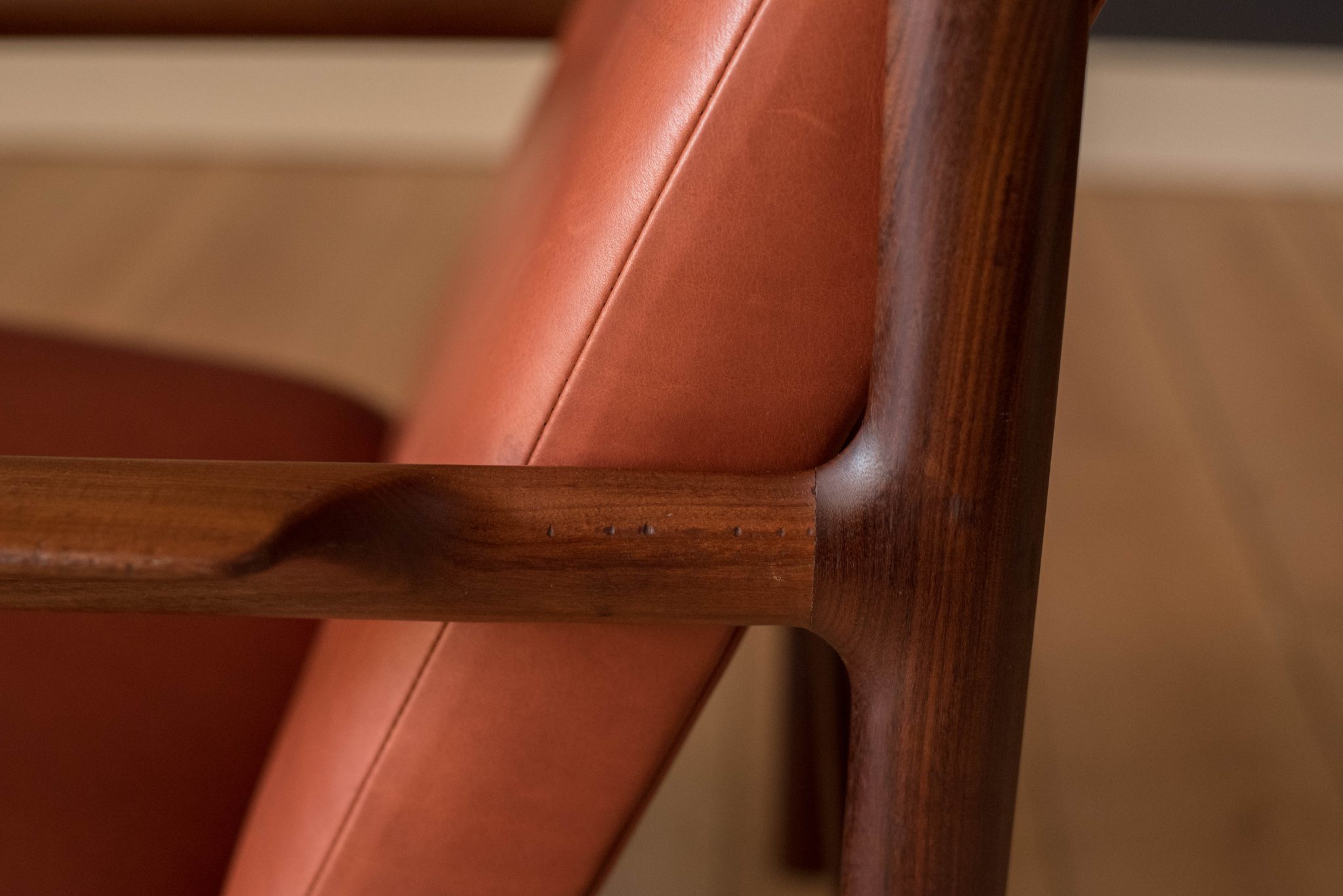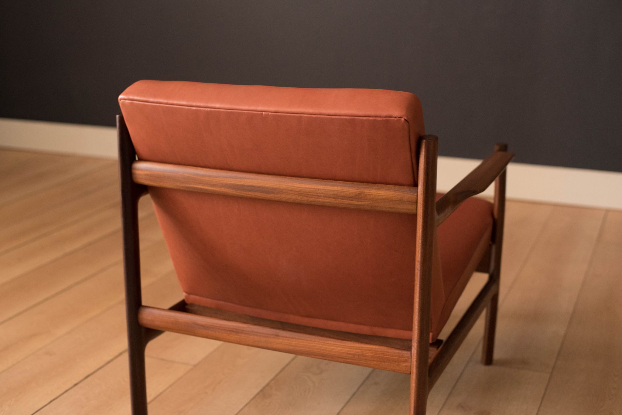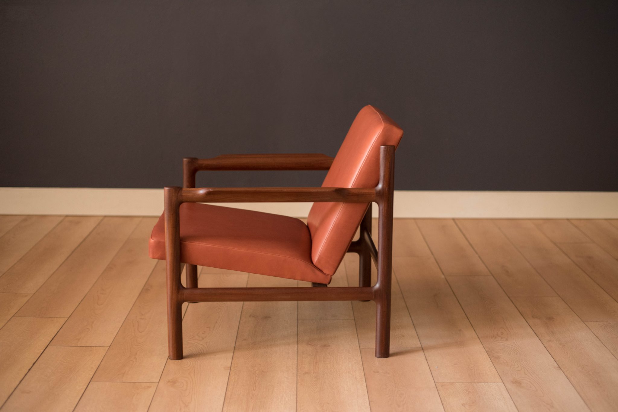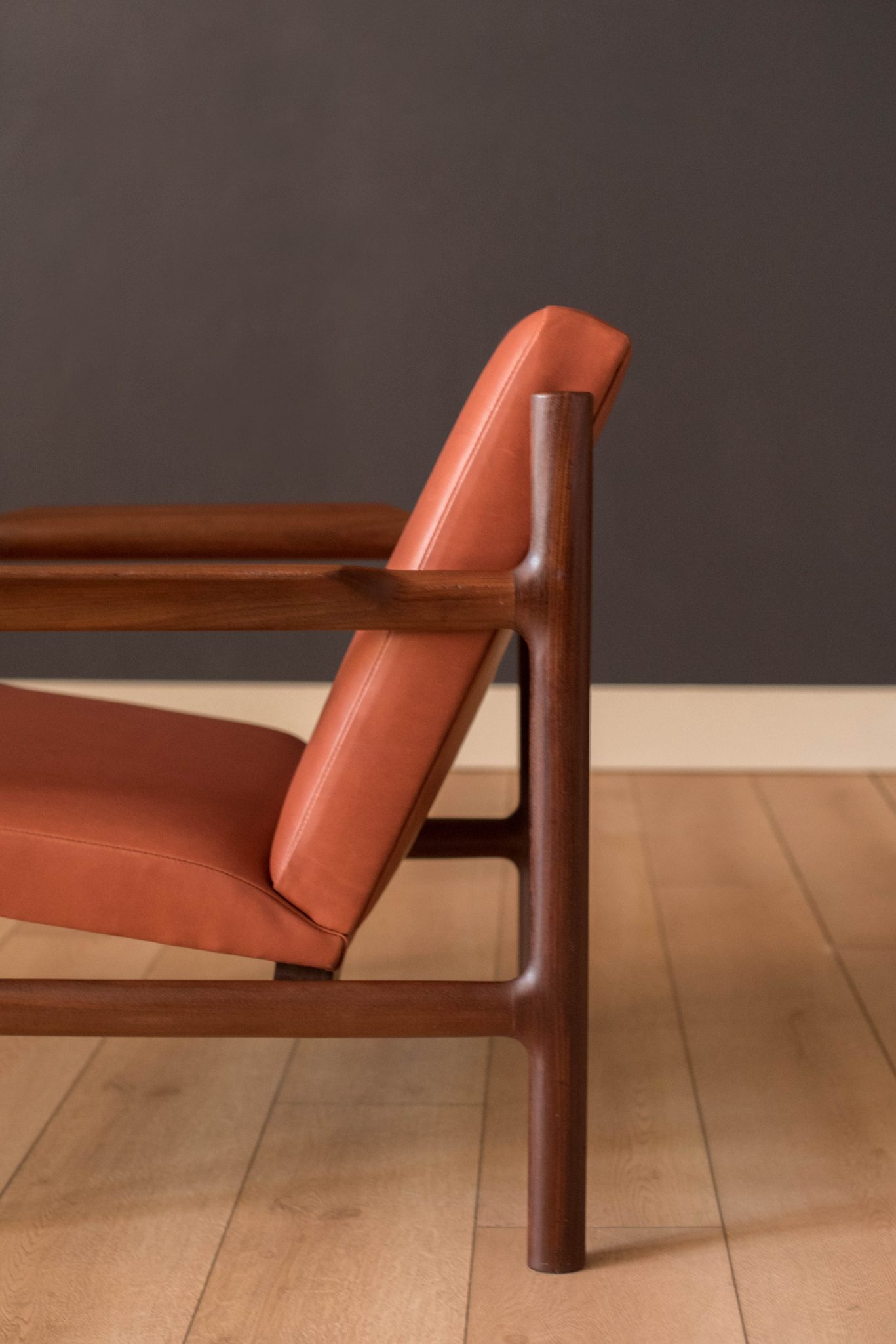 Mid-century lounge chair manufactured by Bruksbo in Norway. This piece has been professionally reupholstered in a rust red leather and features unique curved arm rests and sculpted legs.