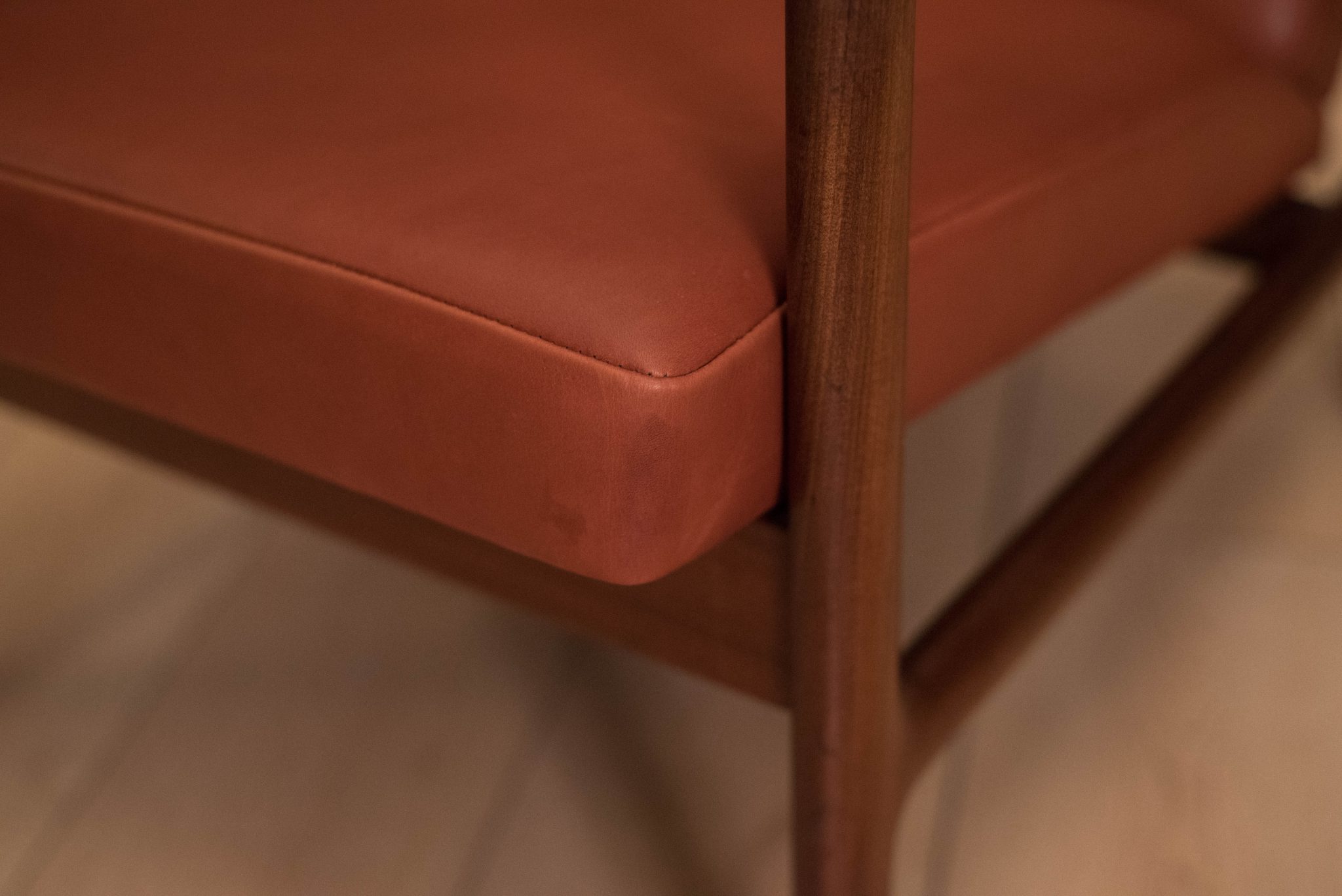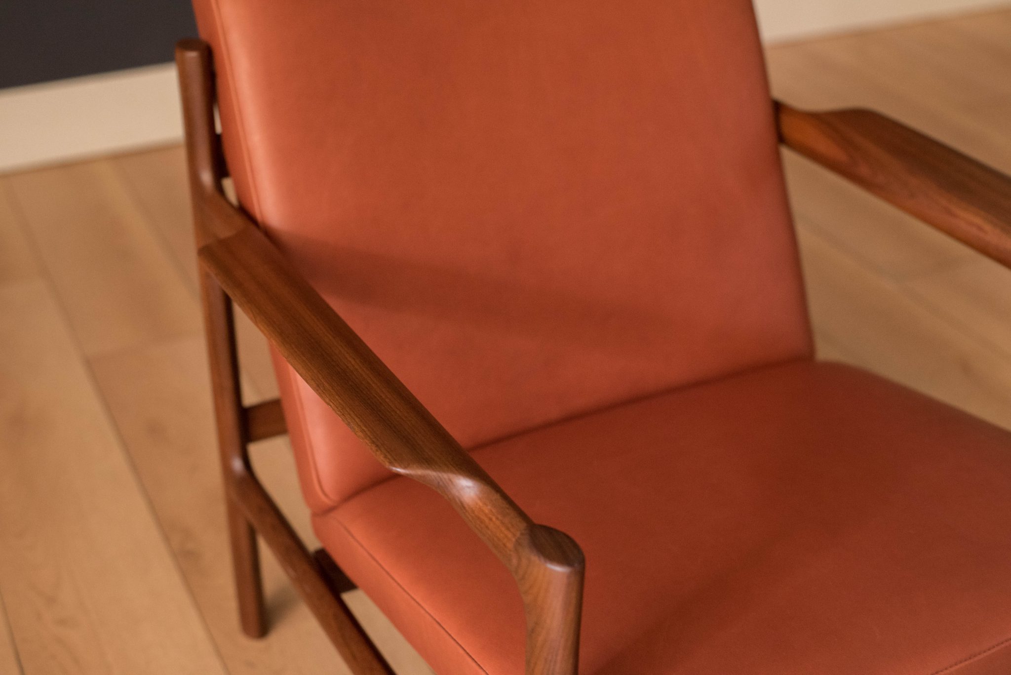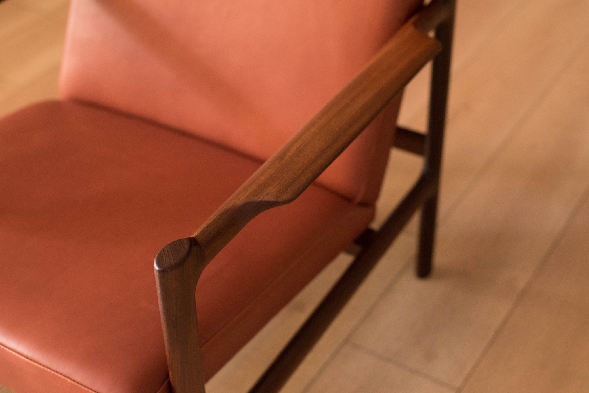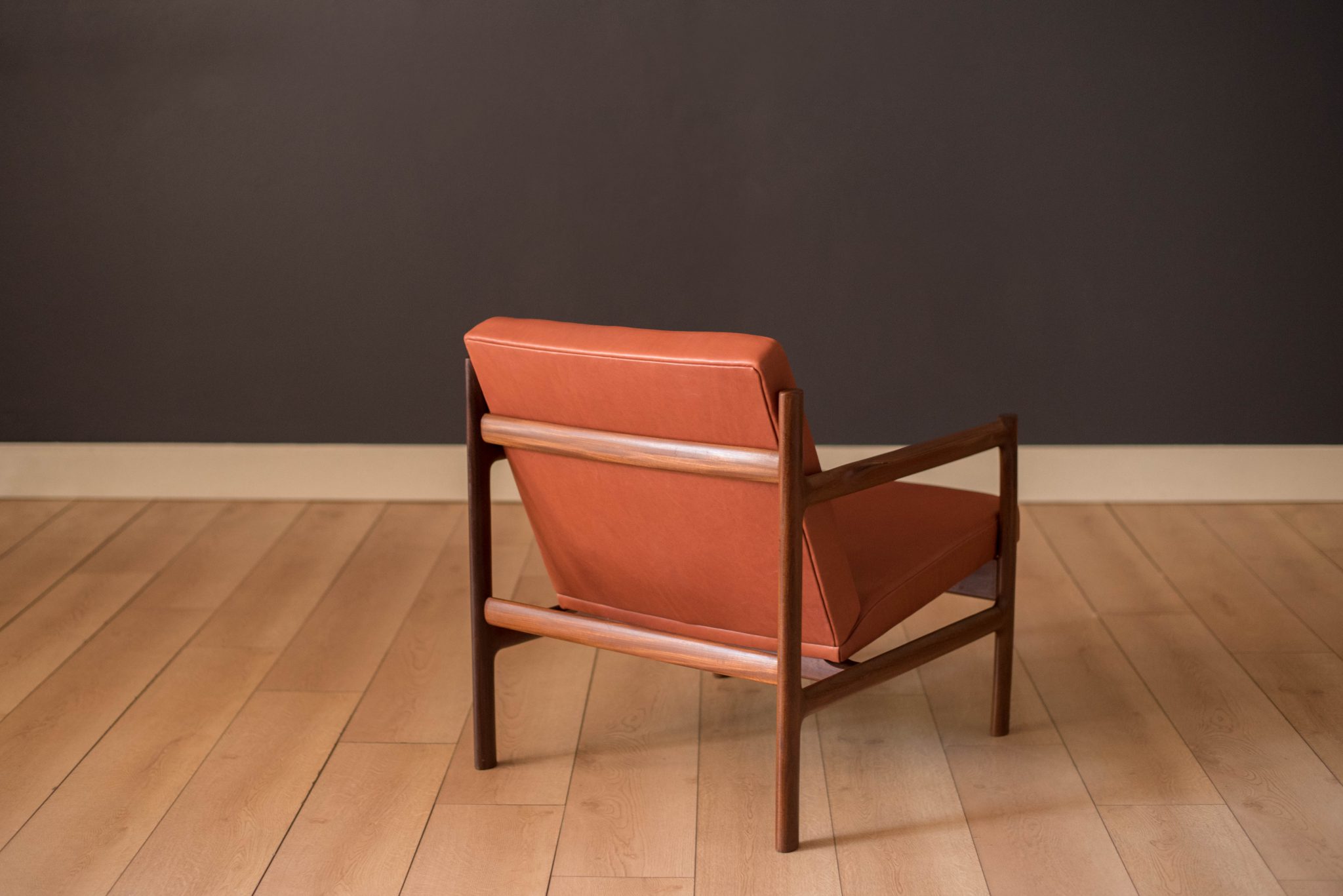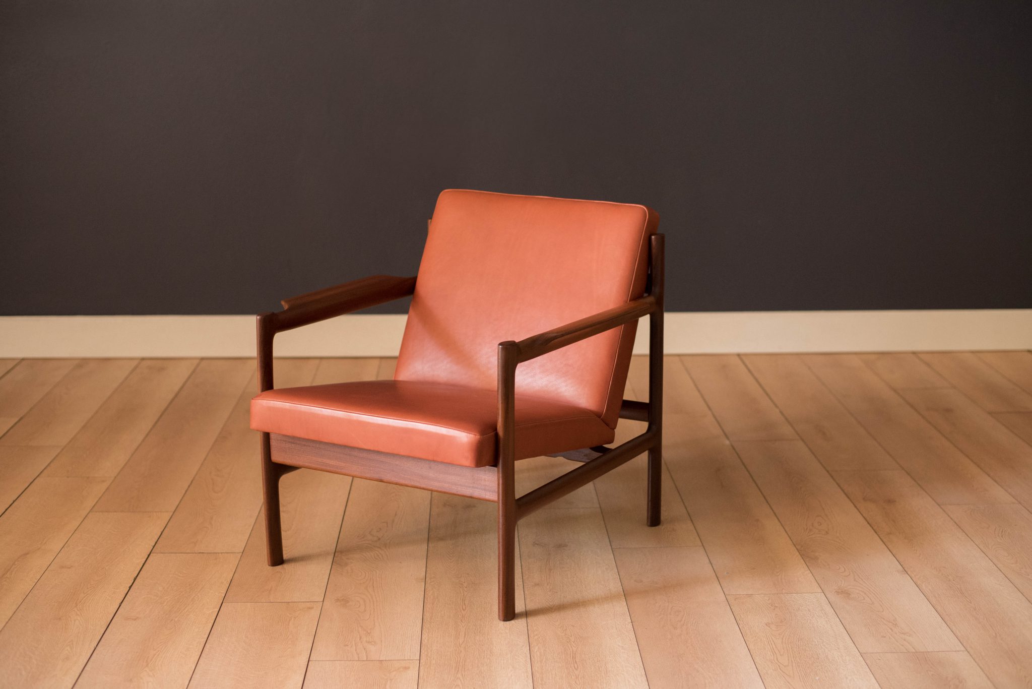 Mid-century lounge chair manufactured by Bruksbo in Norway. This piece has been professionally reupholstered in a rust red leather and features unique curved arm rests and sculpted legs.
