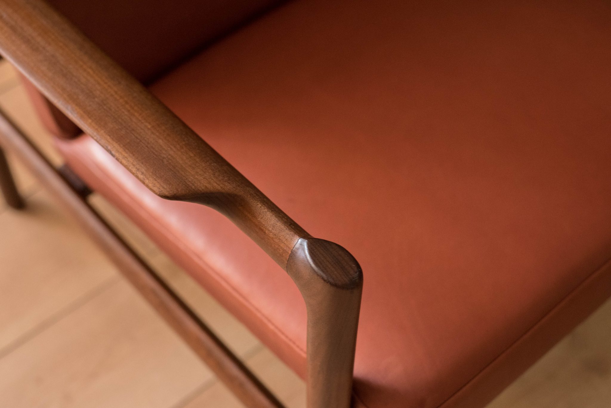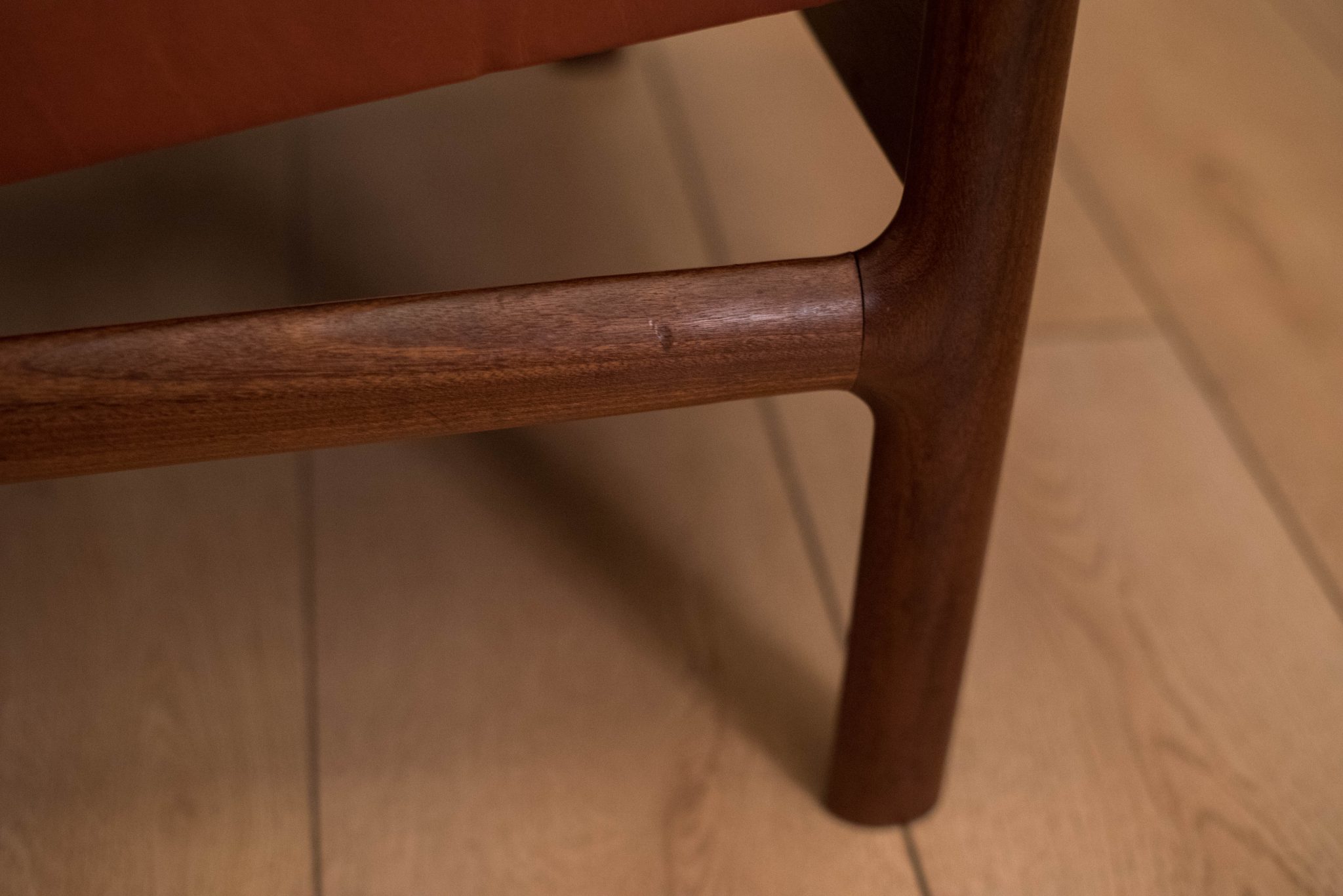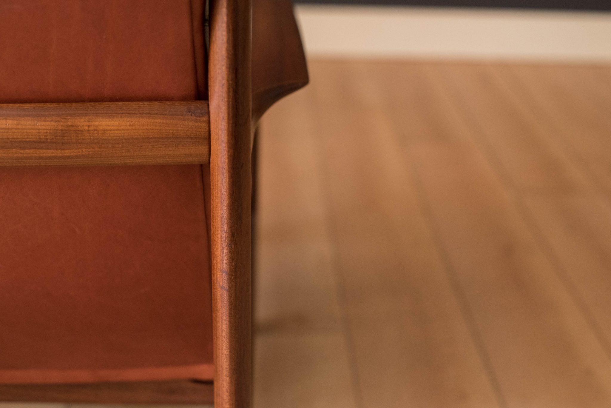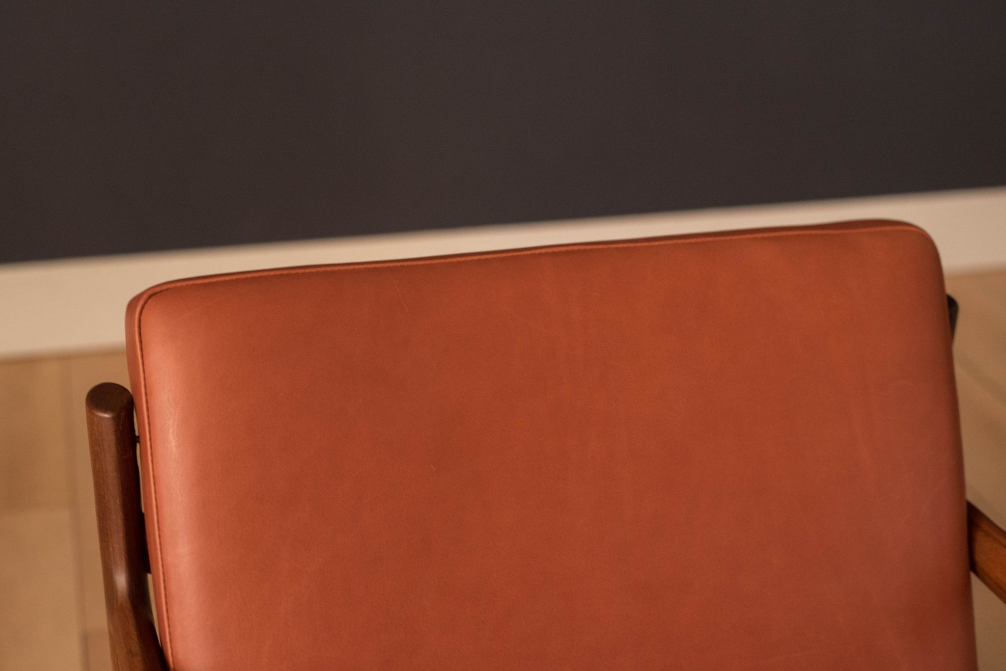 Mid-century lounge chair manufactured by Bruksbo in Norway. This piece has been professionally reupholstered in a rust red leather and features unique curved arm rests and sculpted legs.