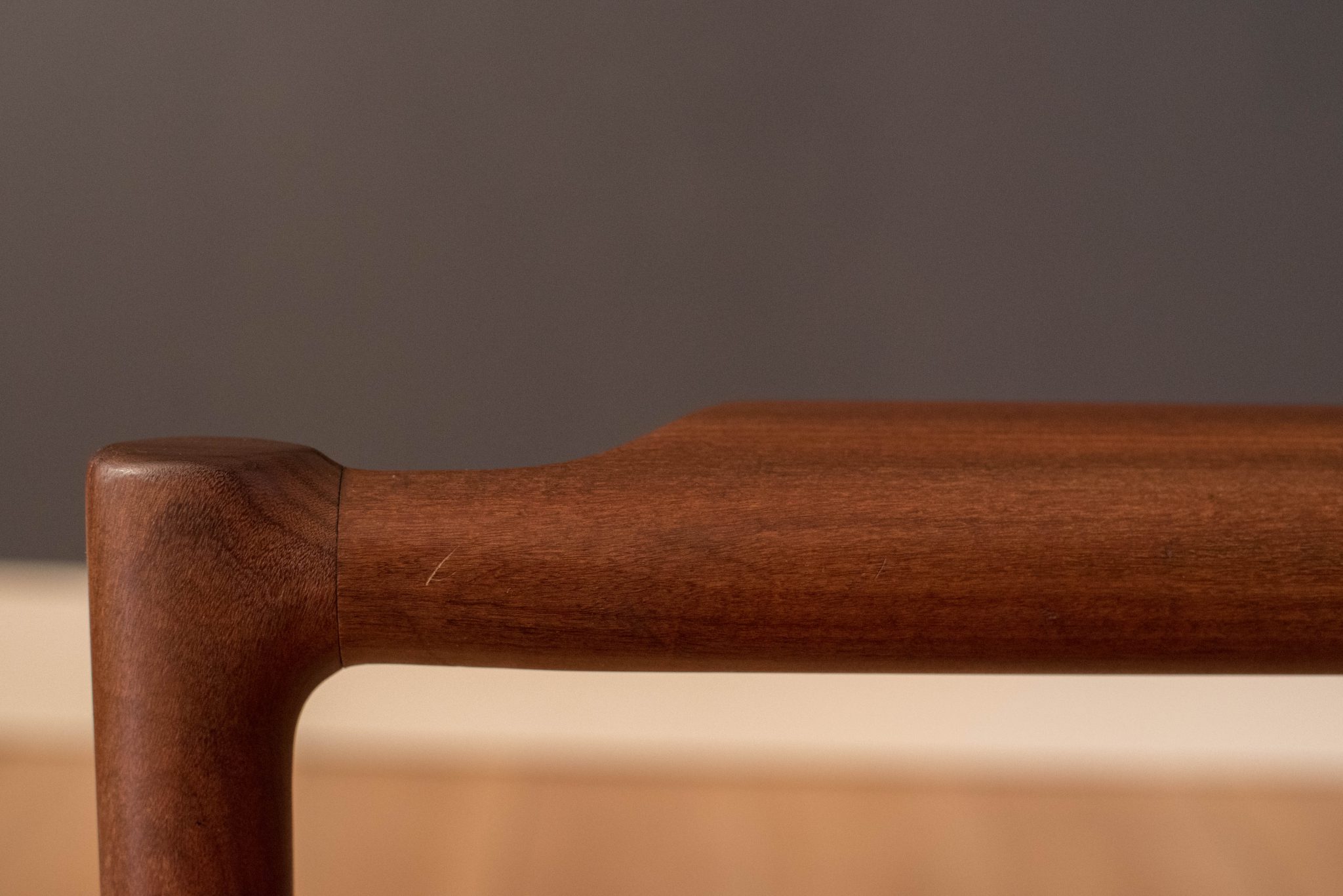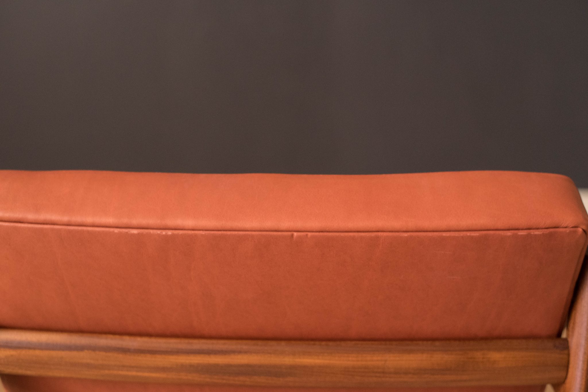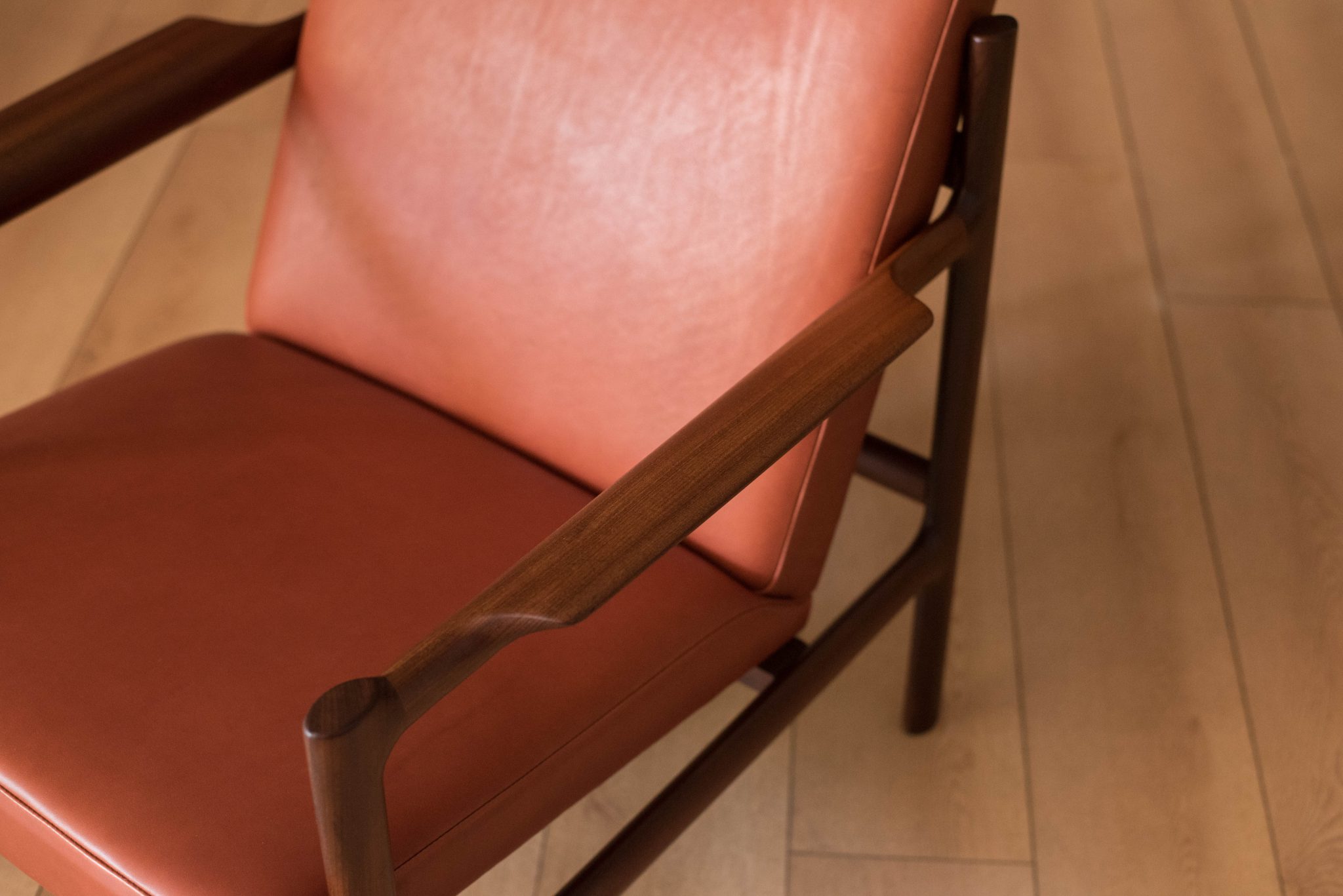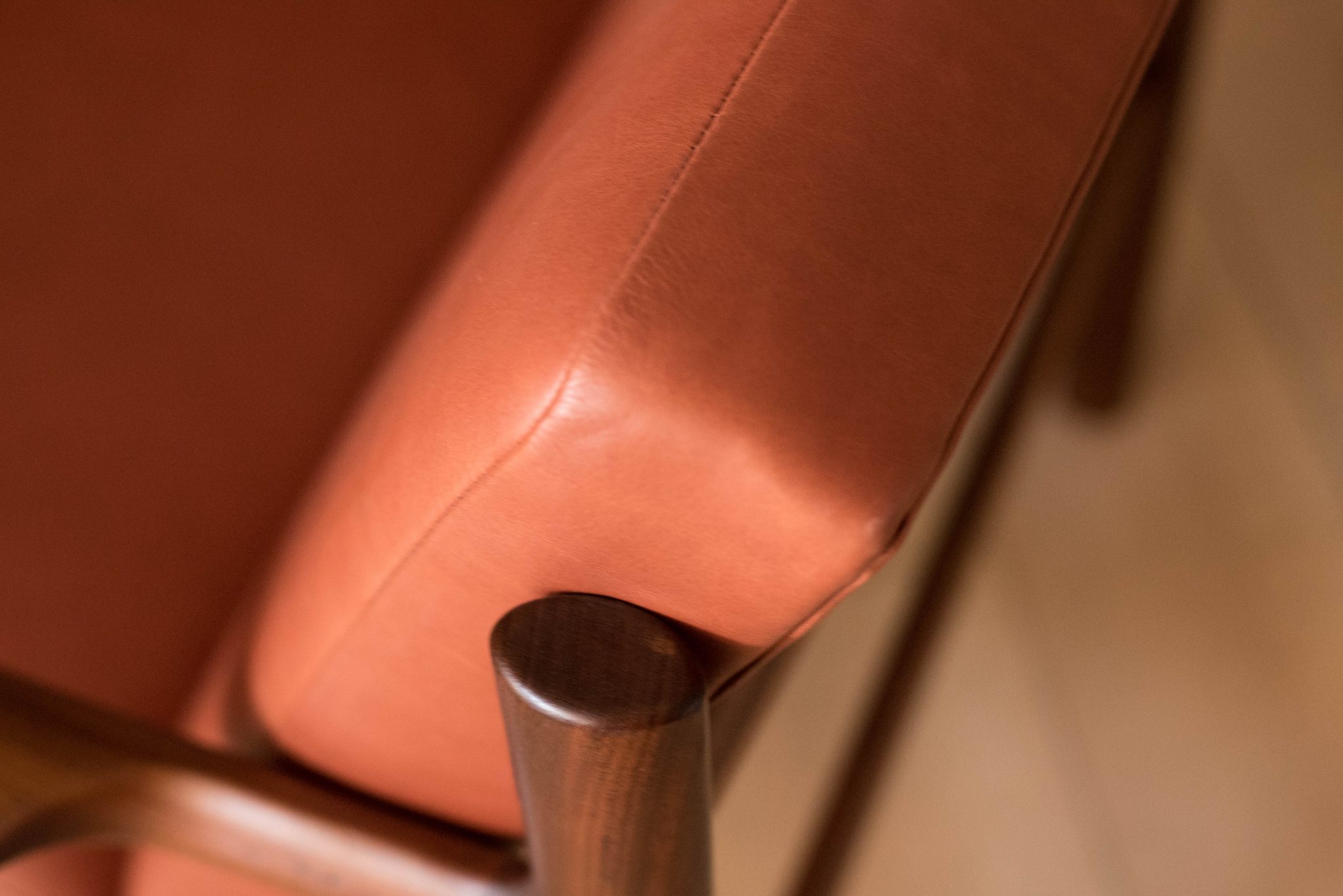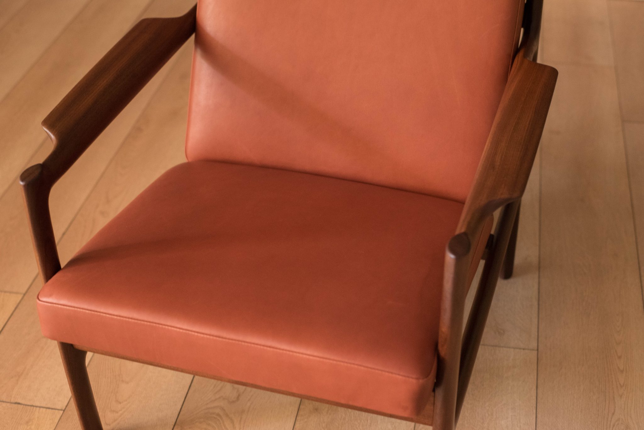 Mid-century lounge chair manufactured by Bruksbo in Norway. This piece has been professionally reupholstered in a rust red leather and features unique curved arm rests and sculpted legs.