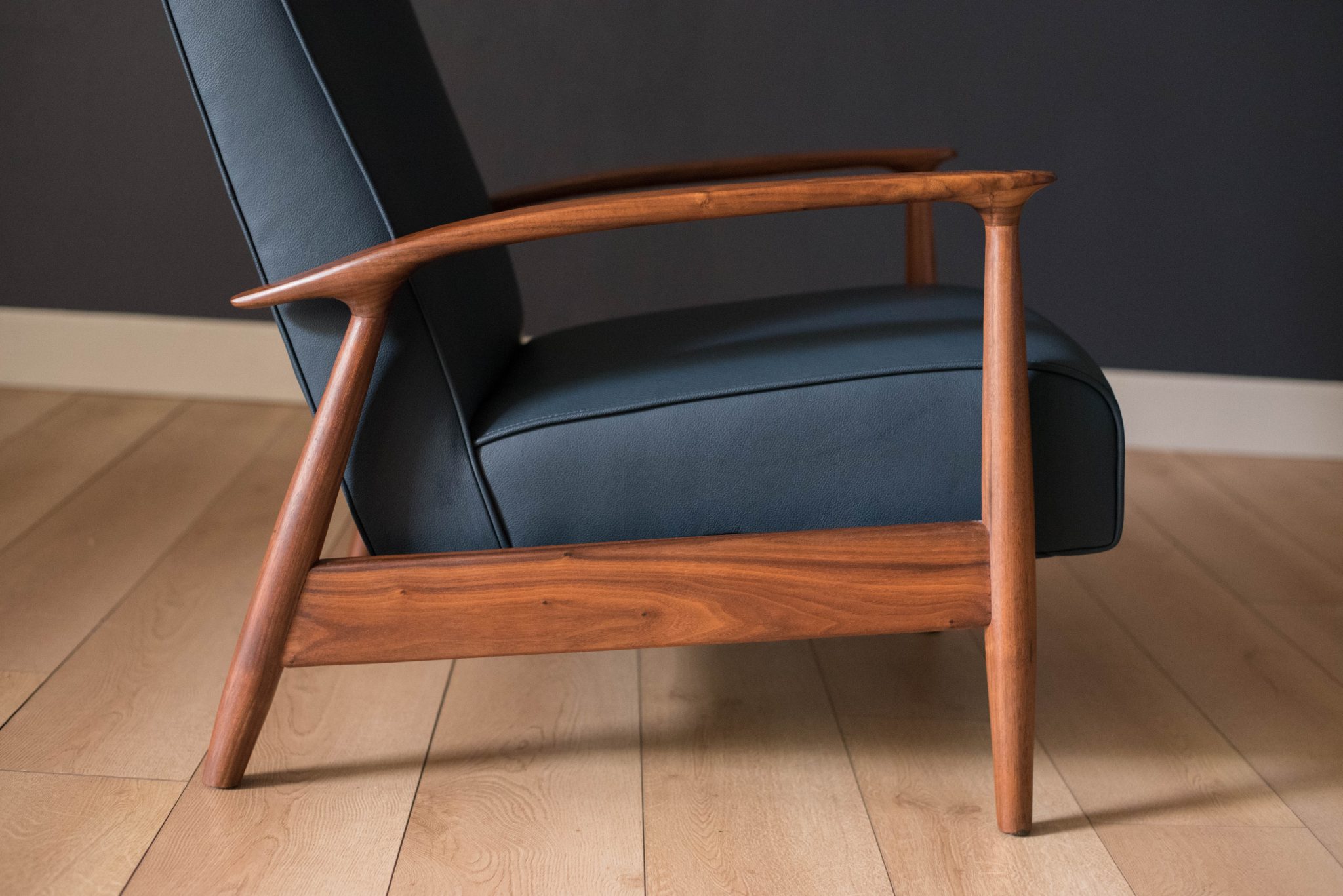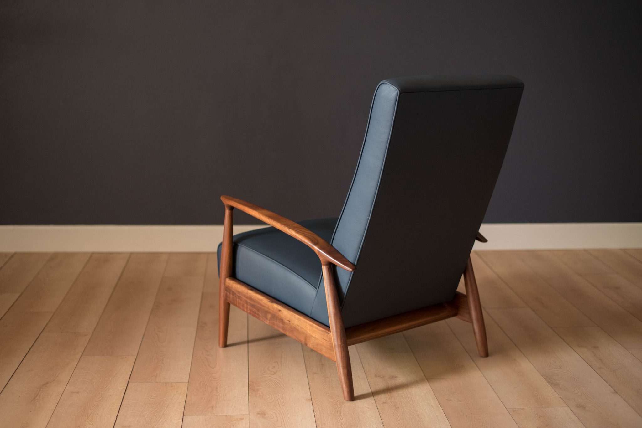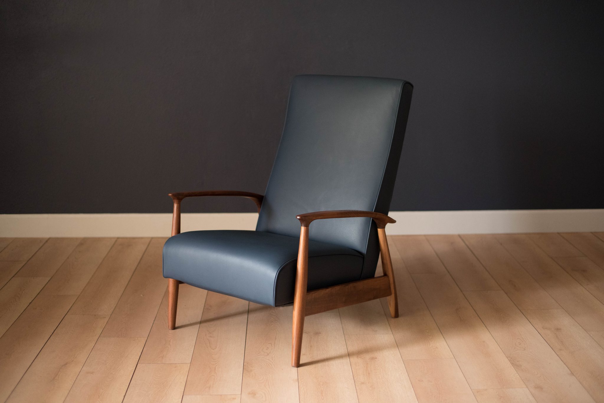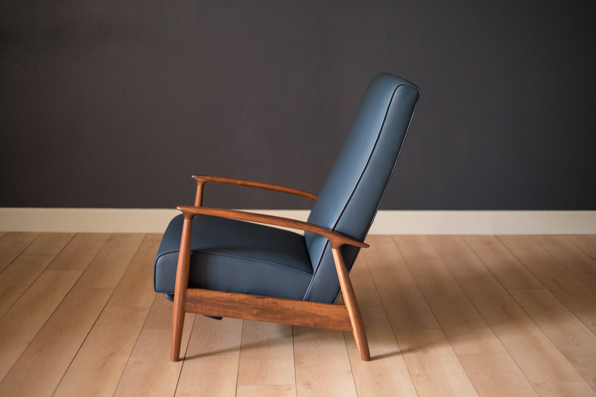 Mid century modern reclining lounge chair designed by Milo Baughman for James. Inc. This piece has a sculptural walnut frame and is reupholstered in blue leather. Reclining mechanism adjusts to three different positions.