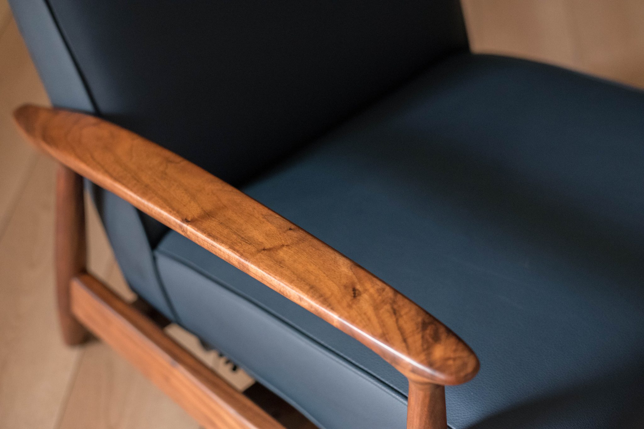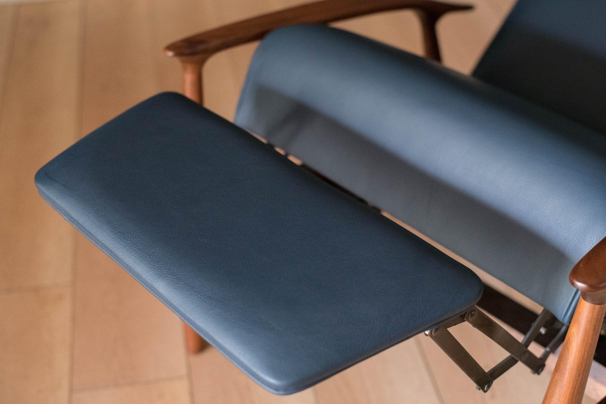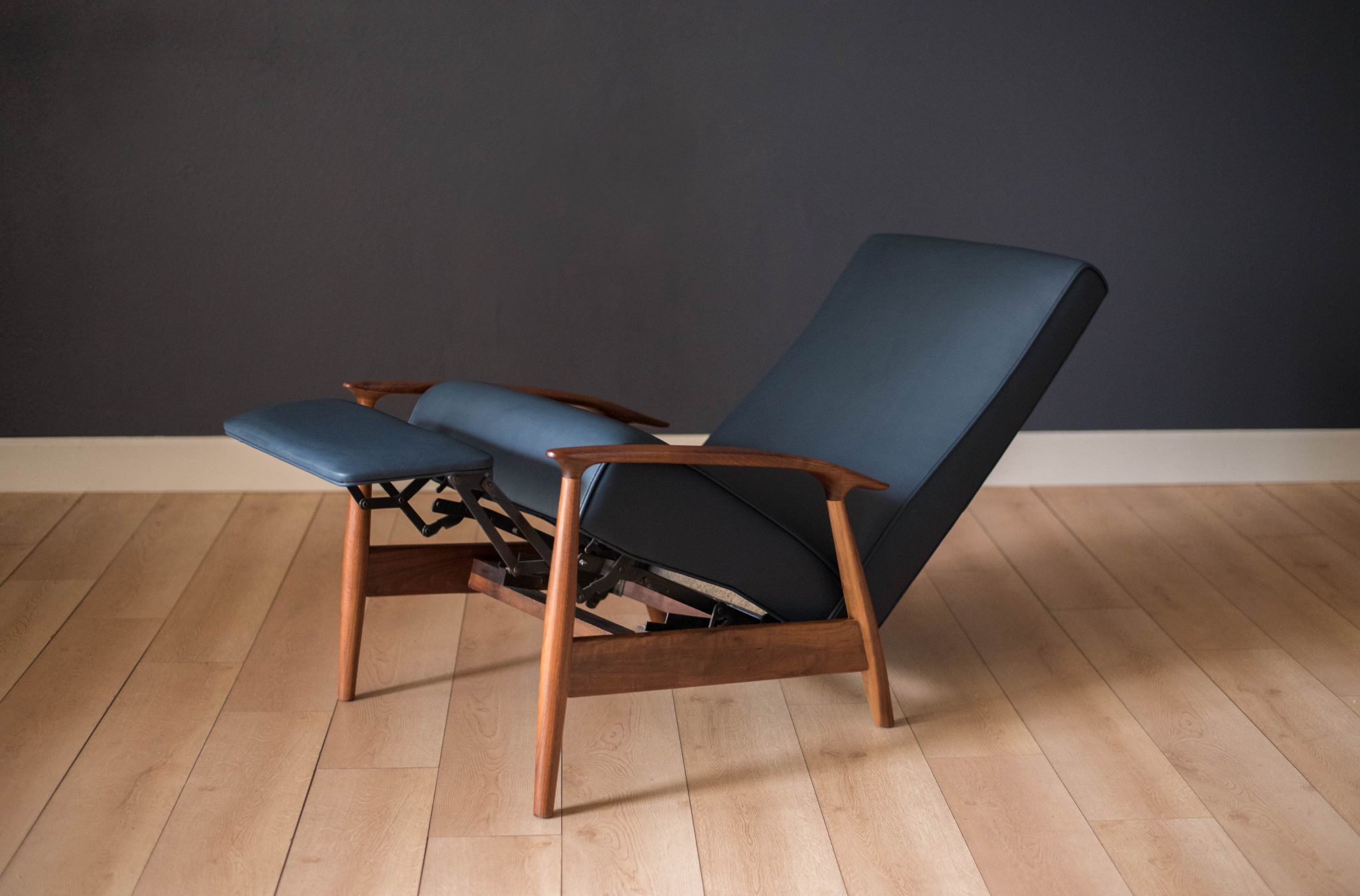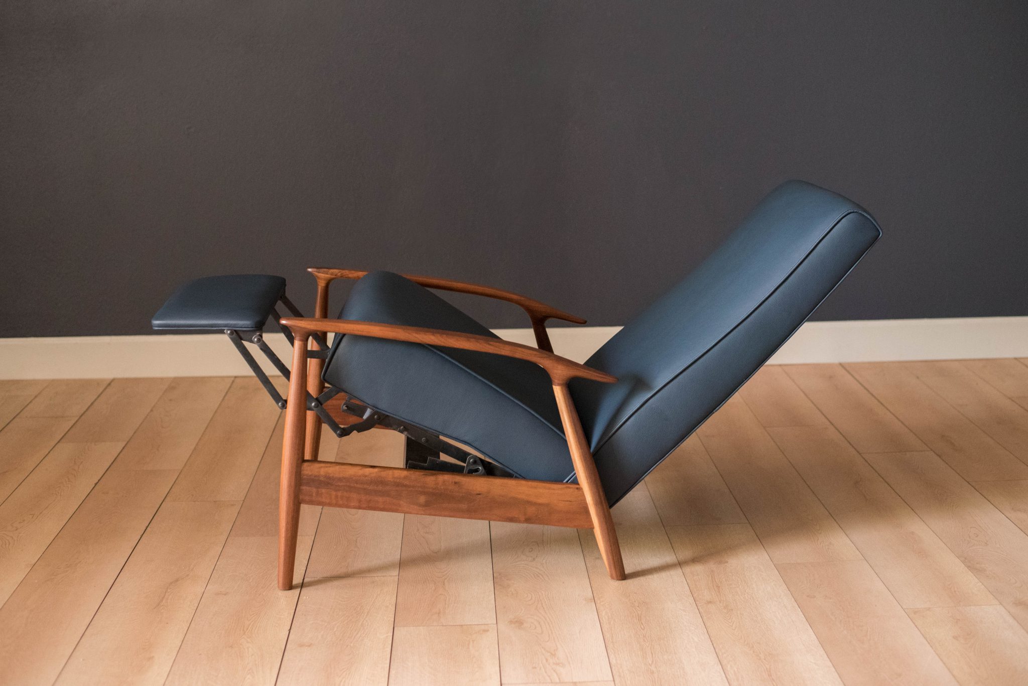 Mid century modern reclining lounge chair designed by Milo Baughman for James. Inc. This piece has a sculptural walnut frame and is reupholstered in blue leather. Reclining mechanism adjusts to three different positions.