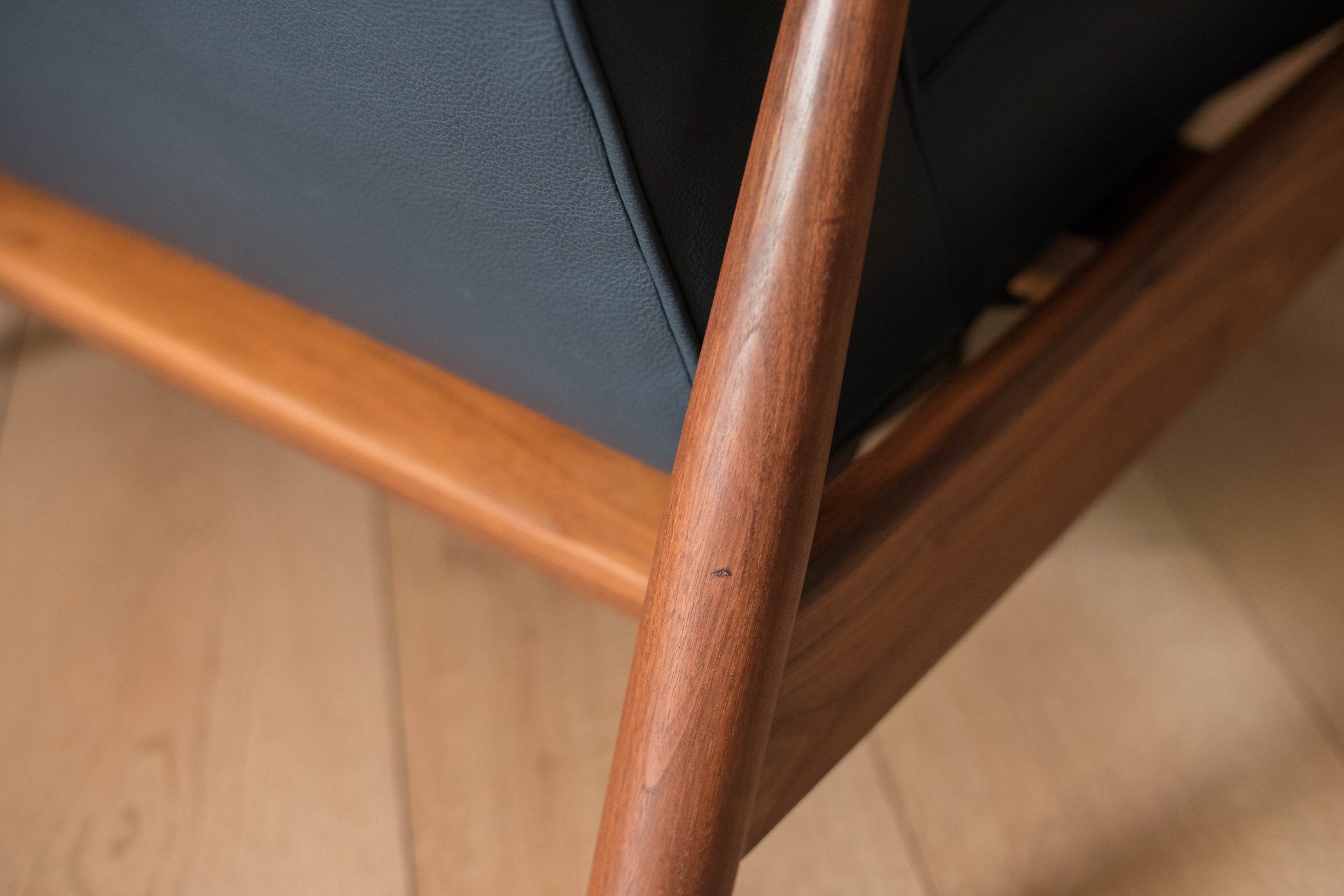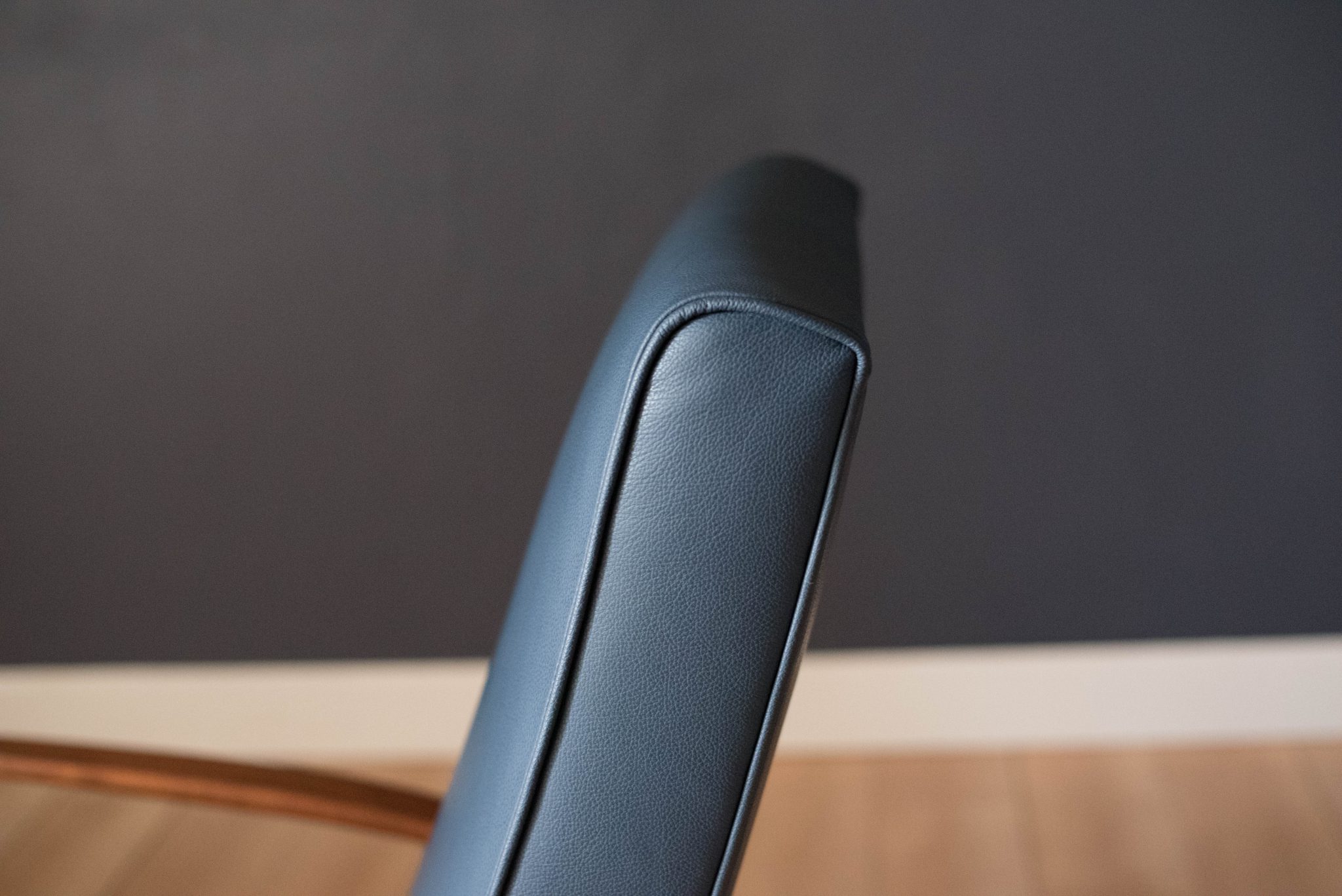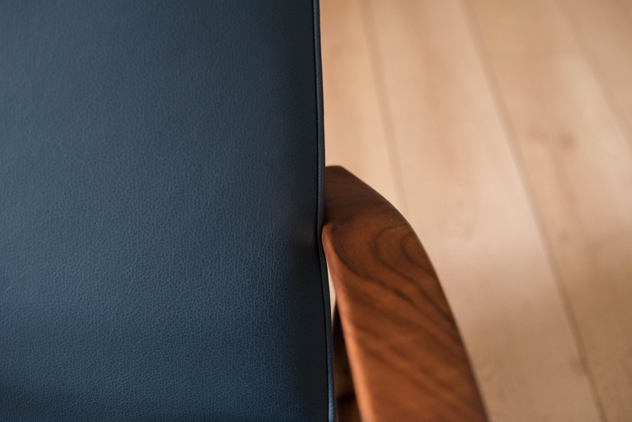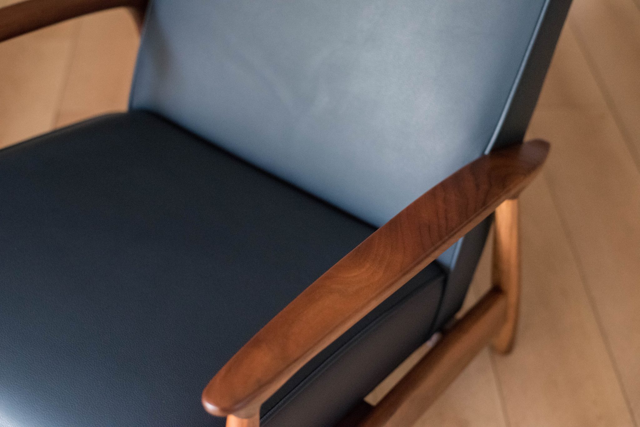 Mid century modern reclining lounge chair designed by Milo Baughman for James. Inc. This piece has a sculptural walnut frame and is reupholstered in blue leather. Reclining mechanism adjusts to three different positions.