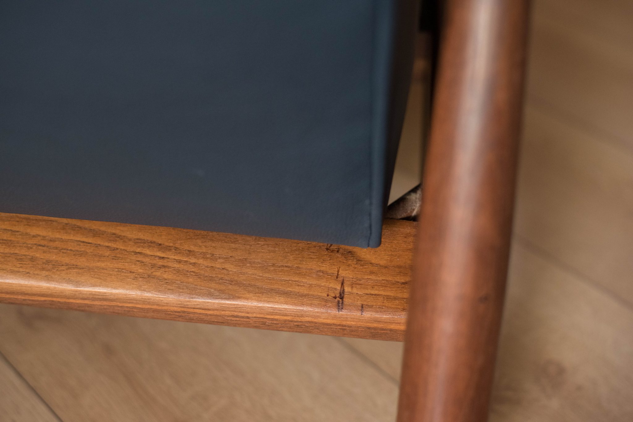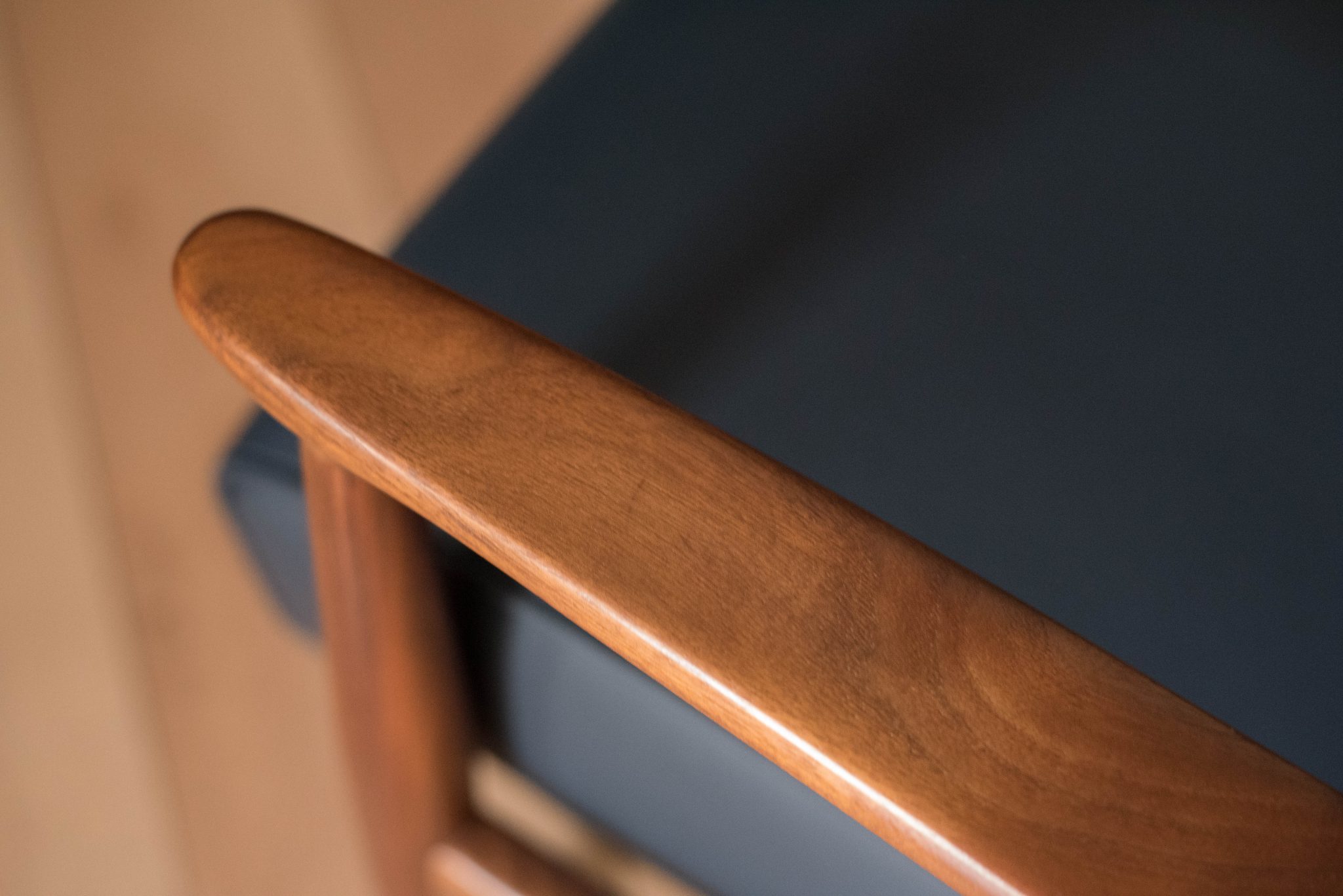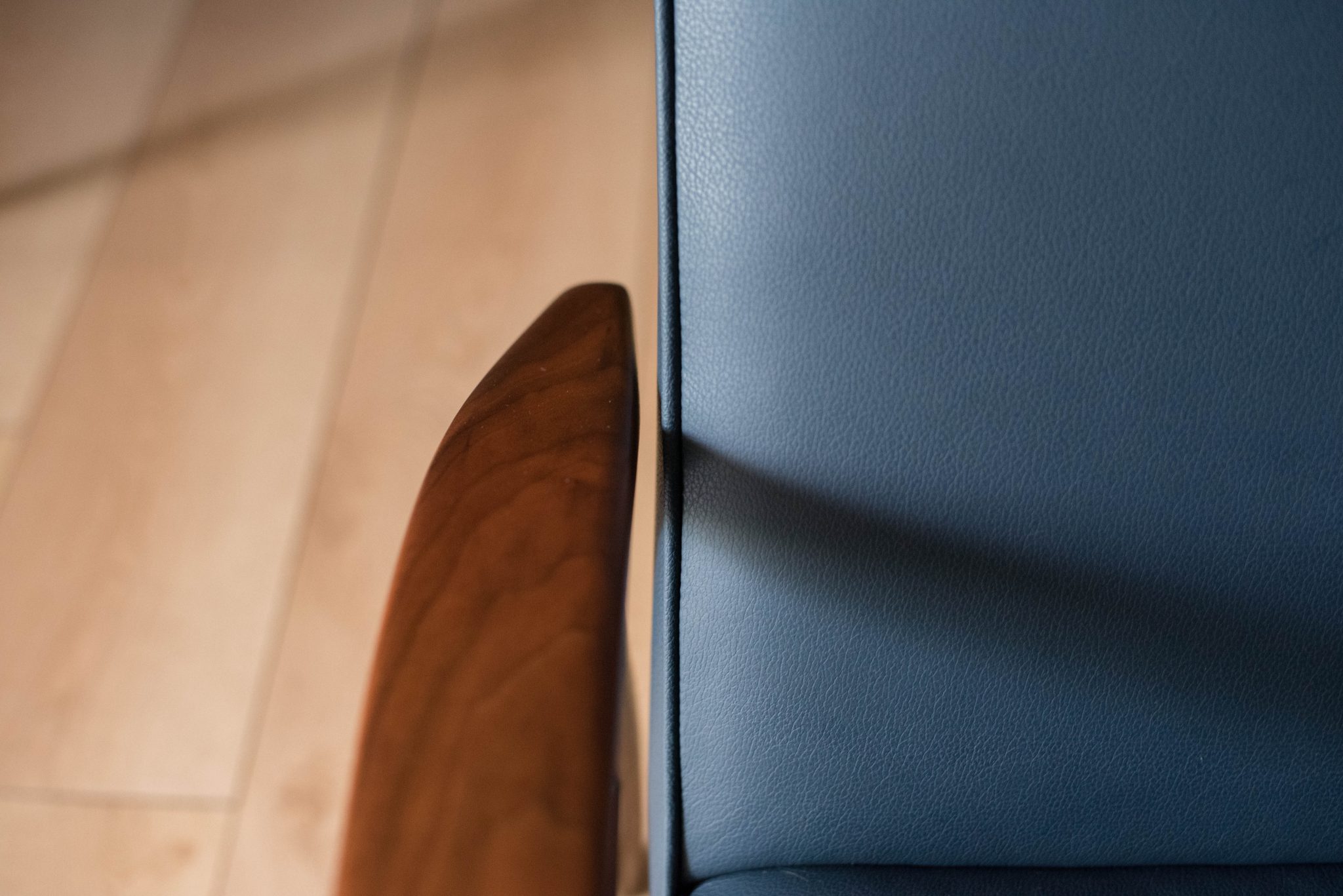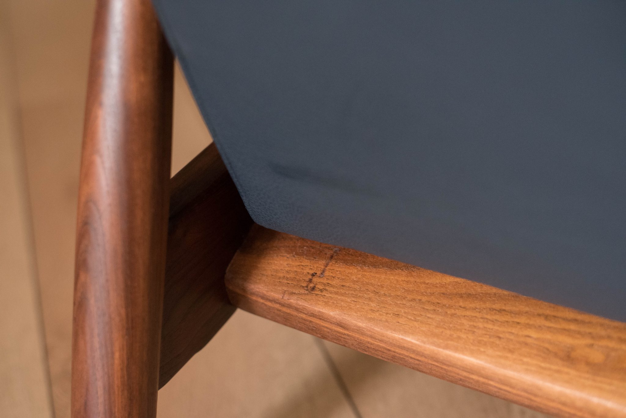 Mid century modern reclining lounge chair designed by Milo Baughman for James. Inc. This piece has a sculptural walnut frame and is reupholstered in blue leather. Reclining mechanism adjusts to three different positions.
