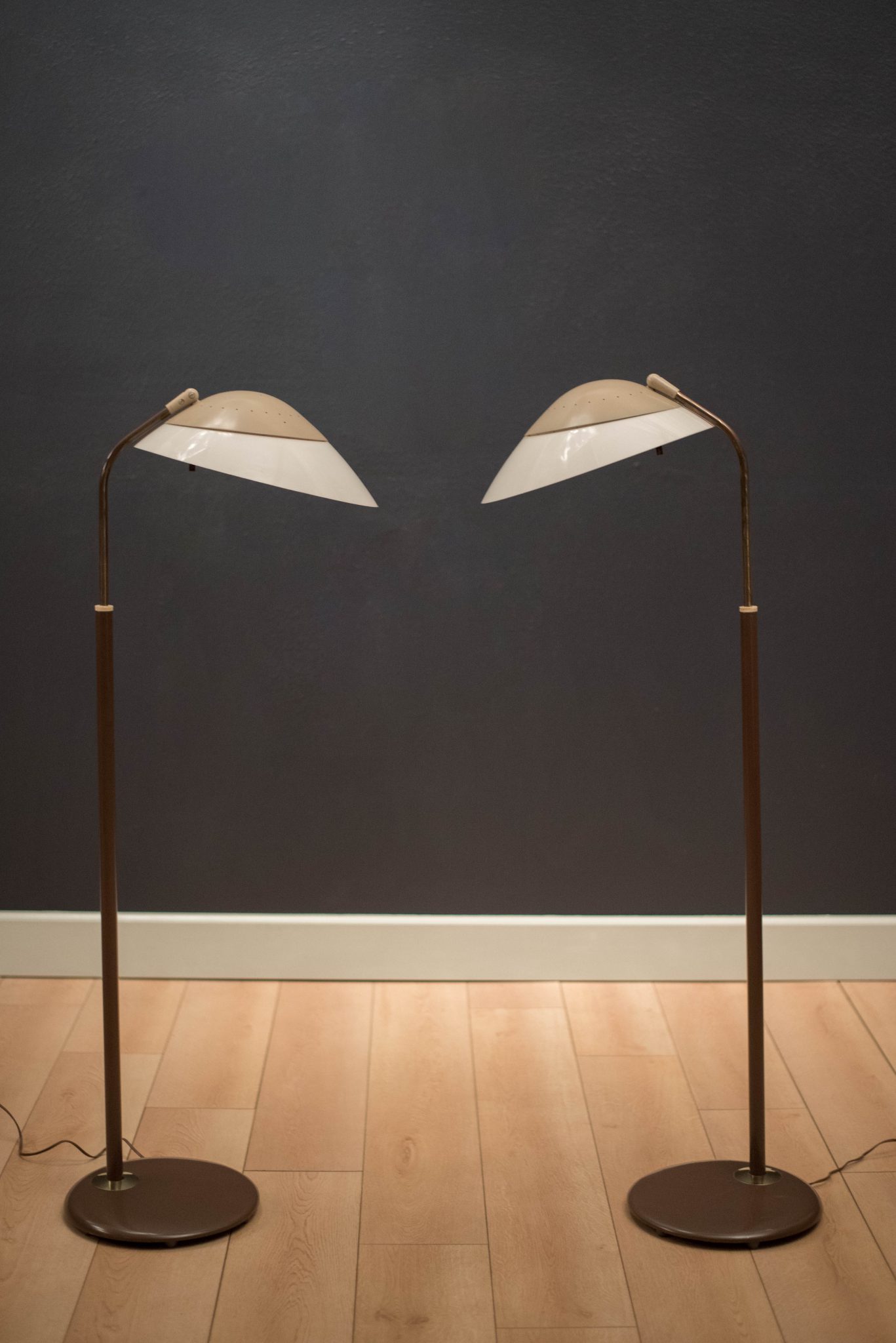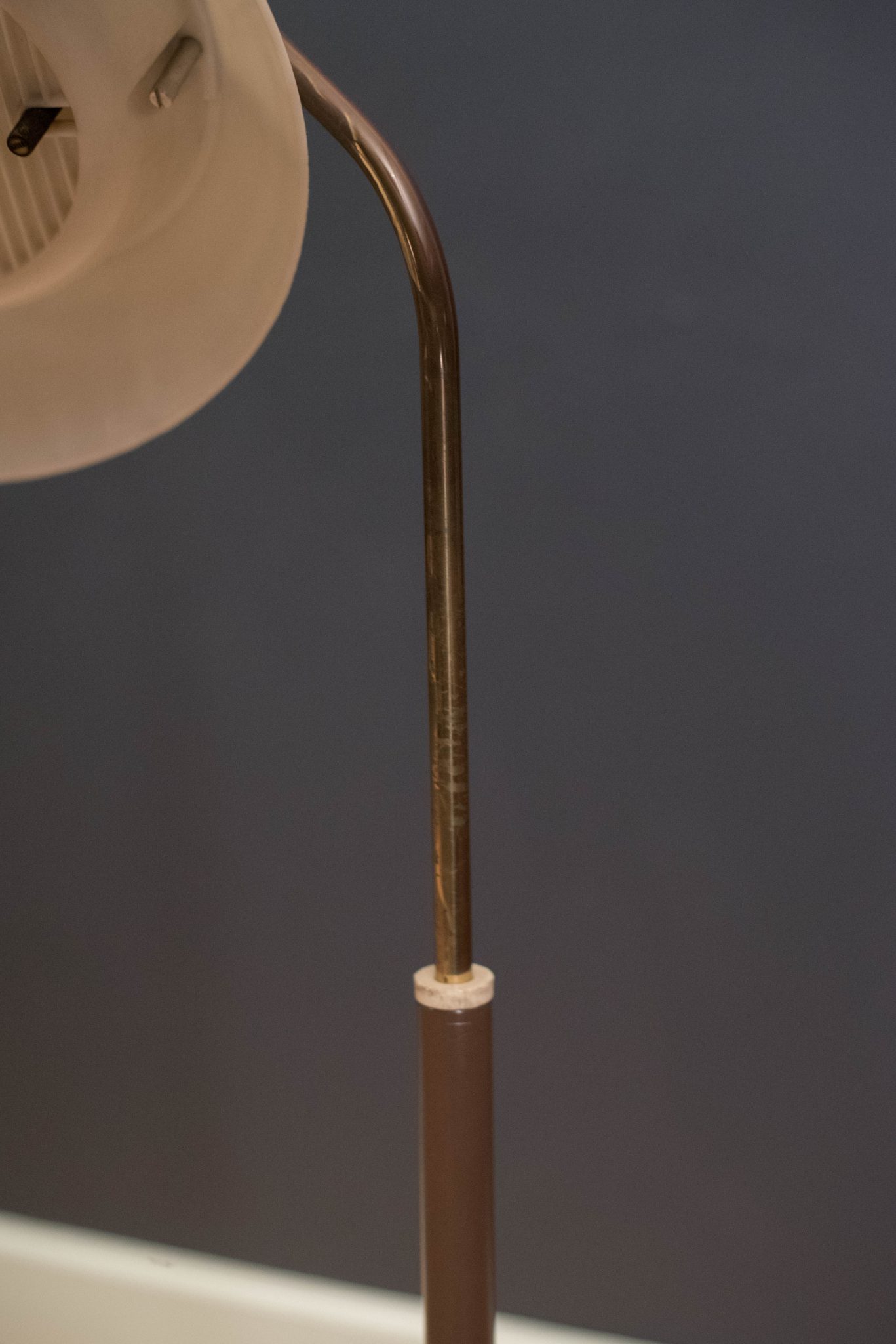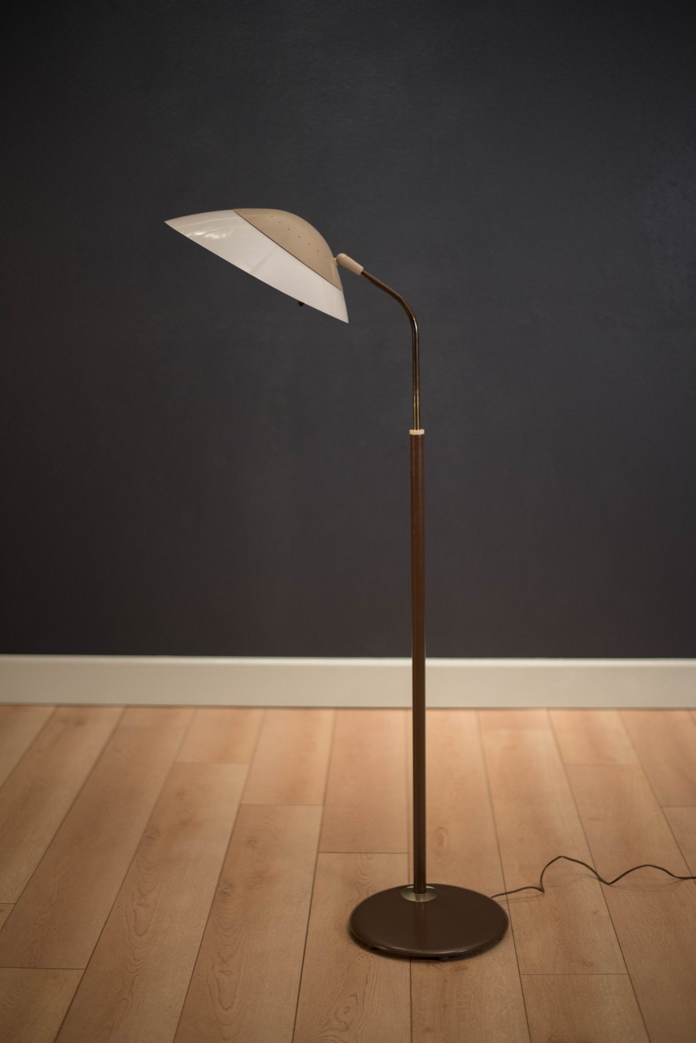 Mid Century Modern Floor Lamp designed by Gerald Thurston for Lightolier. This piece has an adjustable metal base with brass accents and plastic cover shade that pivots in any direction. In good condition with minimal vintage wear. One available.