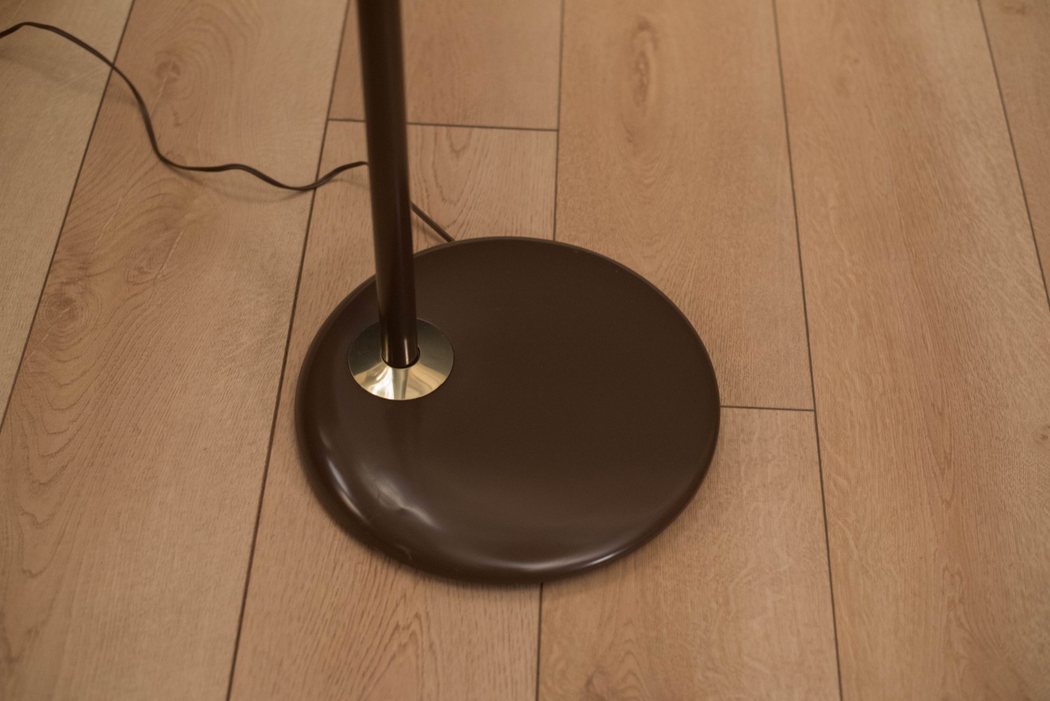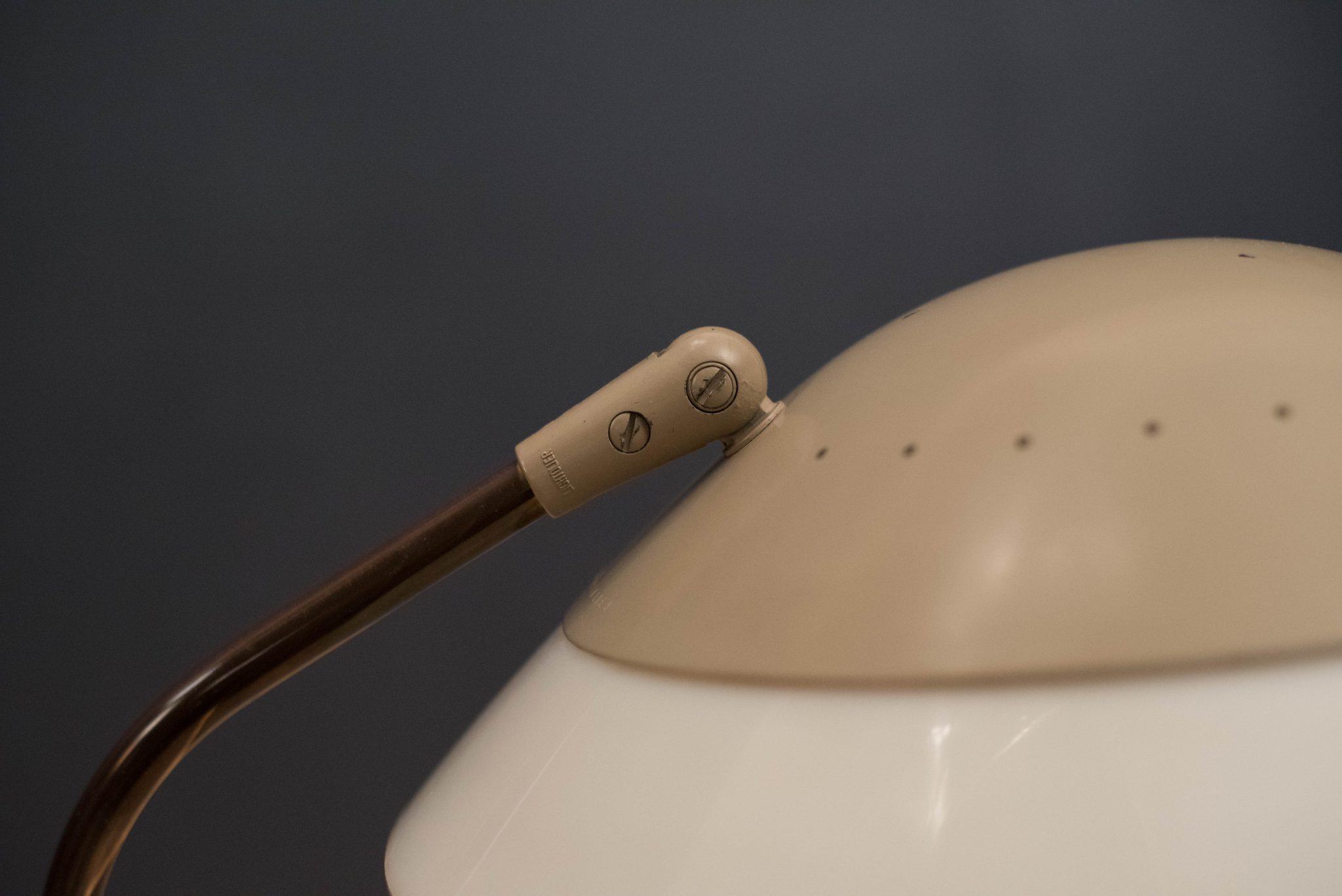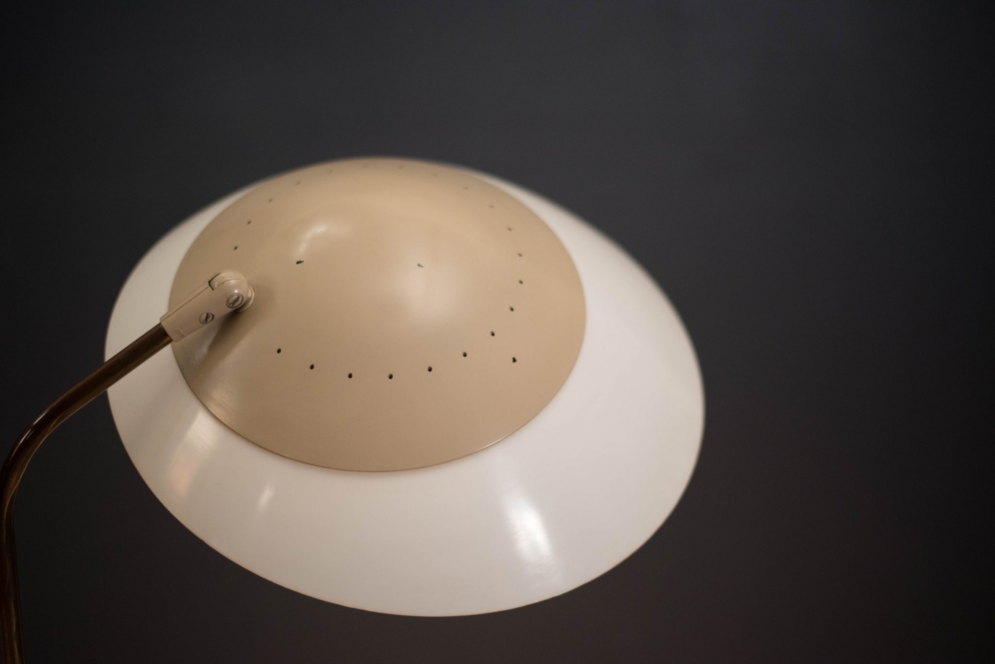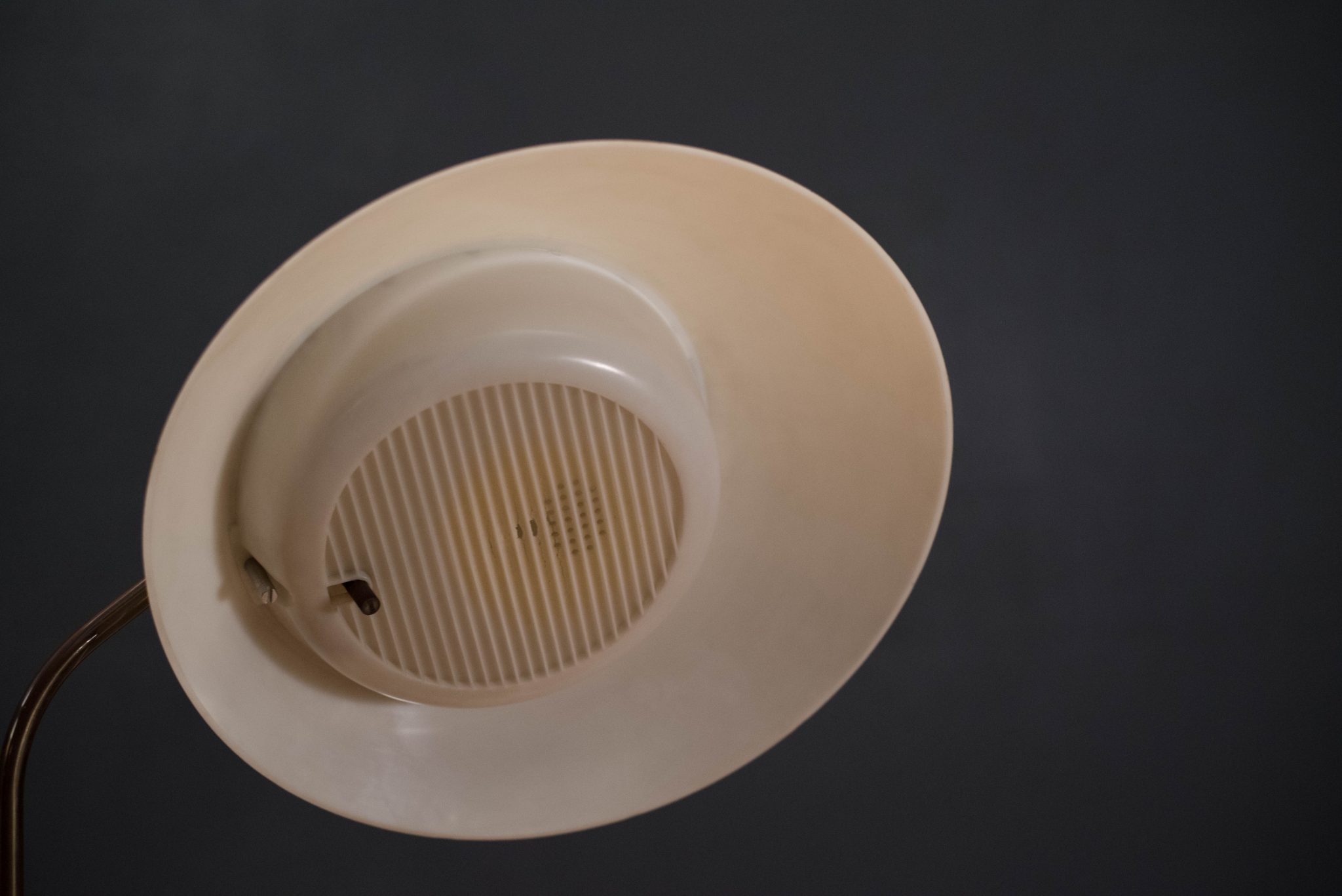 Mid Century Modern Floor Lamp designed by Gerald Thurston for Lightolier. This piece has an adjustable metal base with brass accents and plastic cover shade that pivots in any direction. In good condition with minimal vintage wear. One available.
