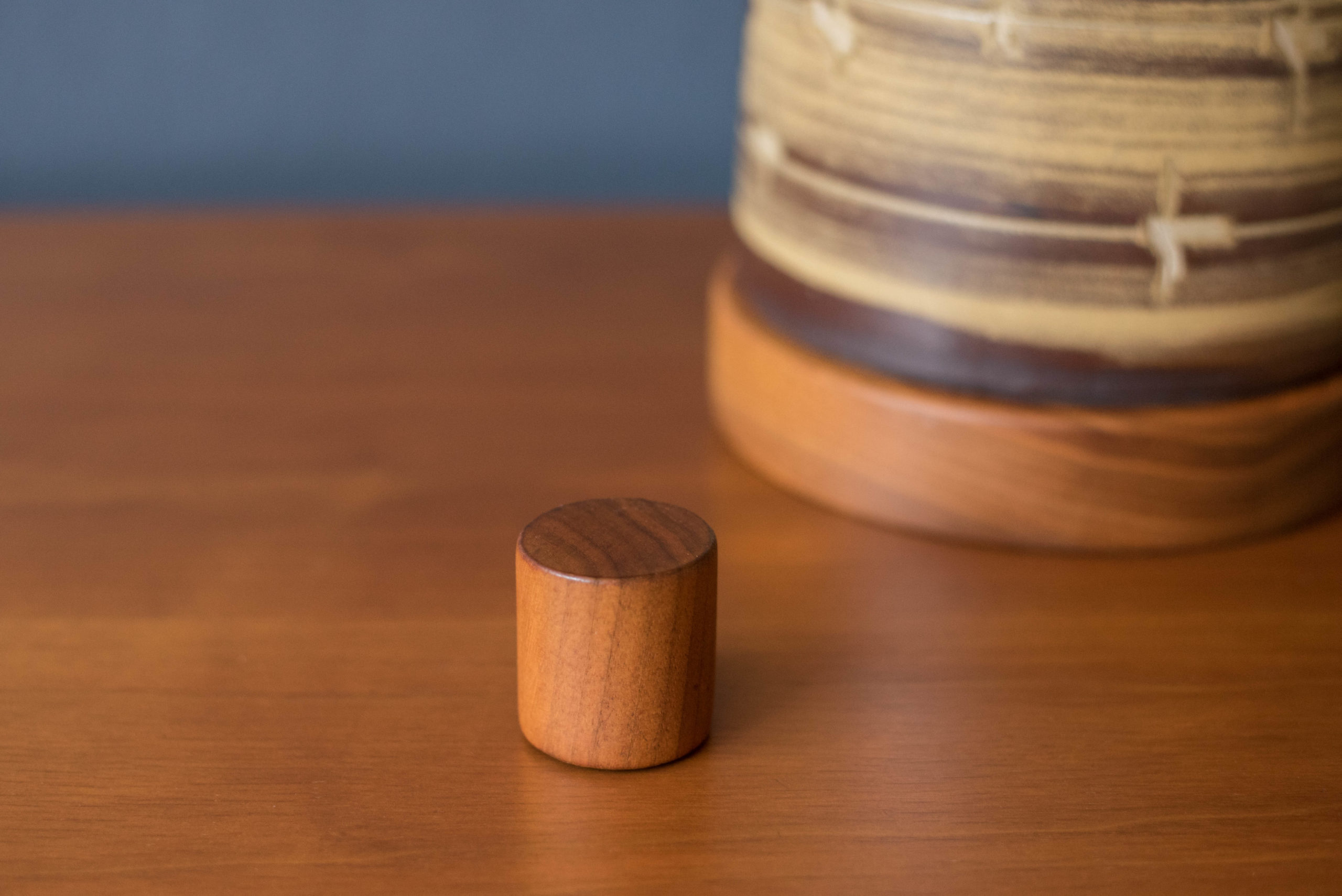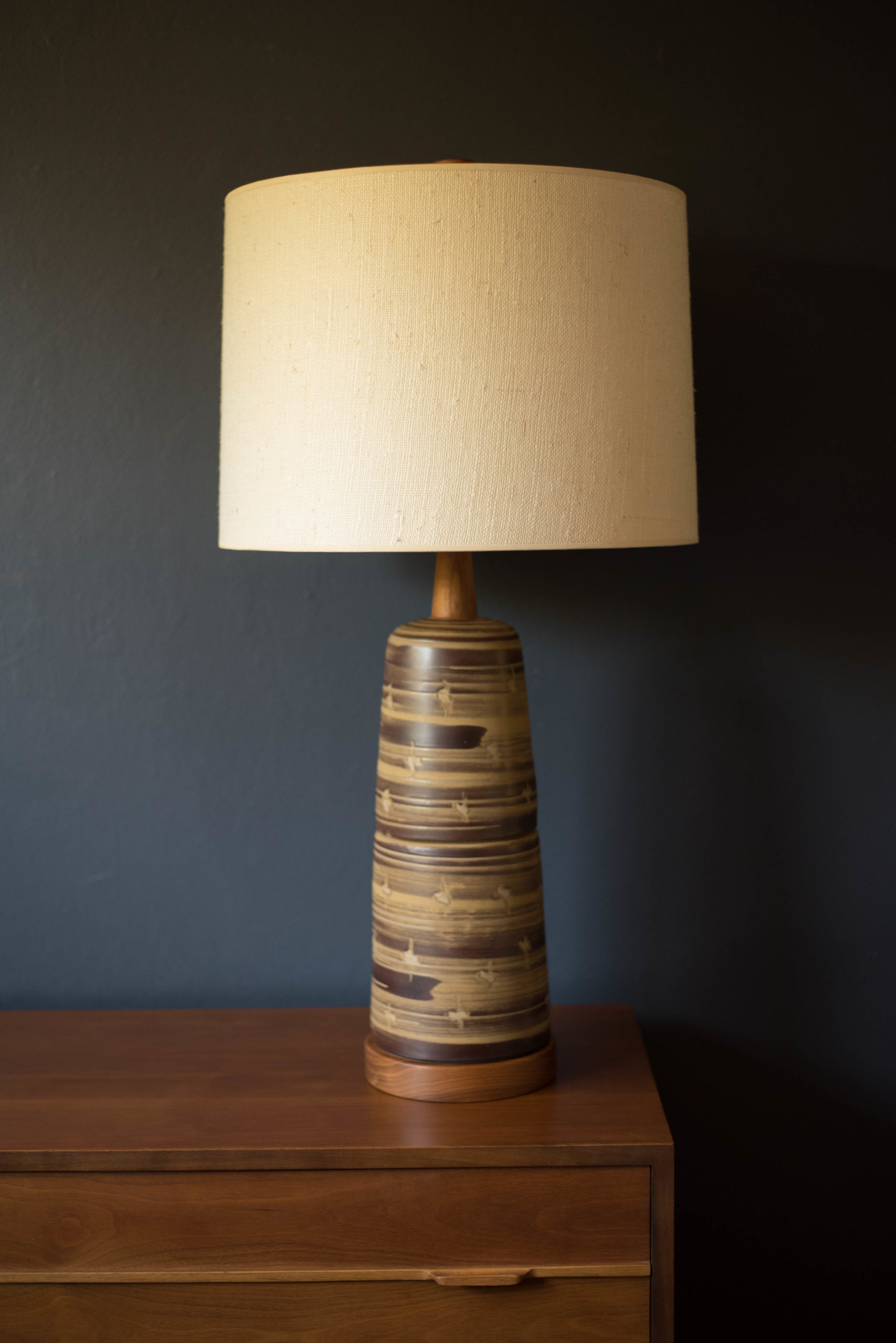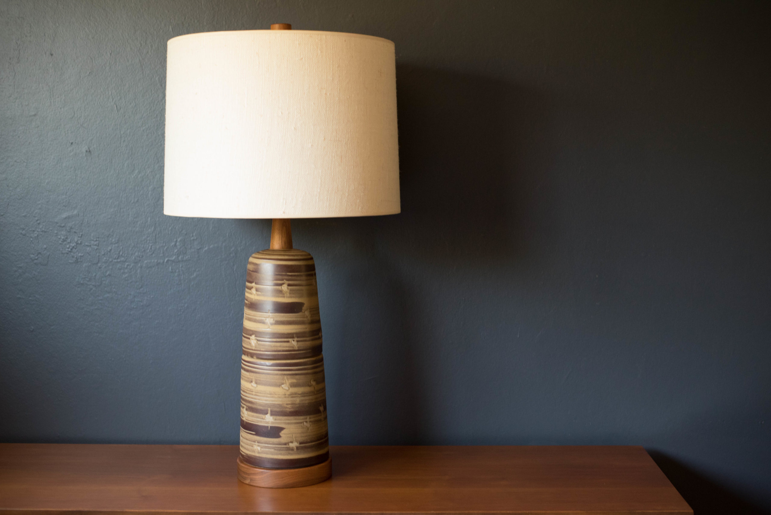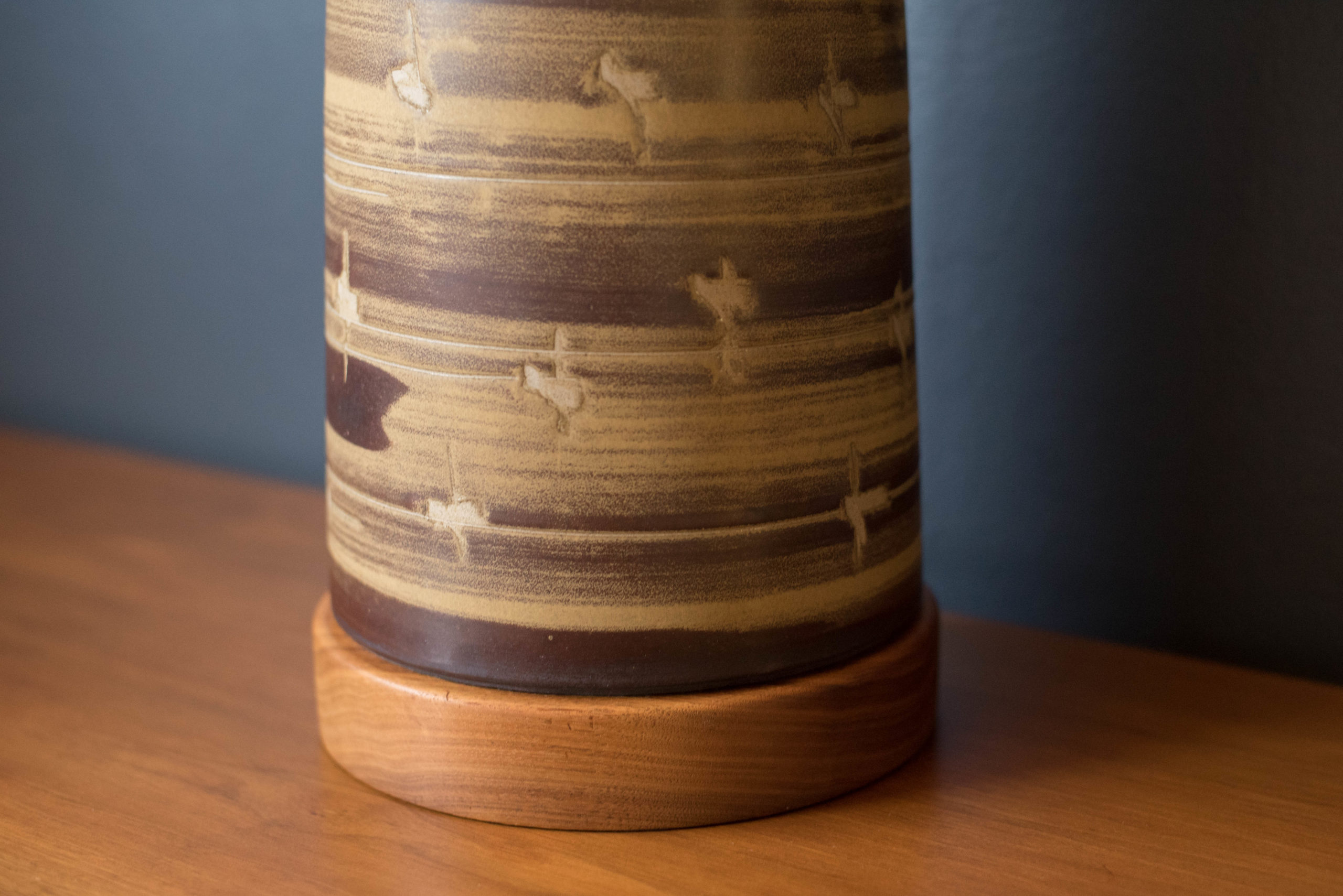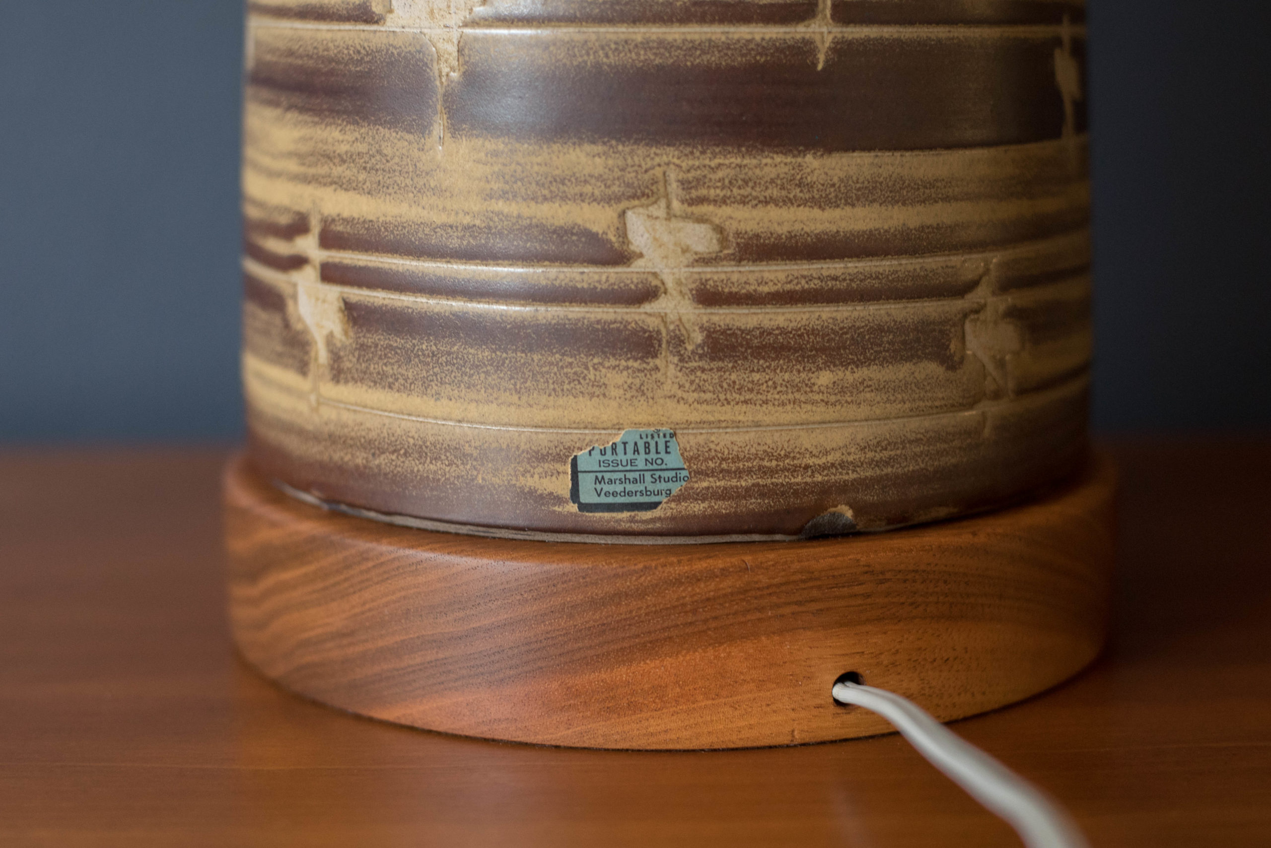 Vintage stoneware ceramic pottery lamp designed by Gordon and Jane Martz for Marshall Studios Inc., Veedersburg, Indiana. This piece features a matte tan and dark brown brushed glaze with decorative incising. This piece is handthrown with two stacked pieces to form one continuous cylindrical base. Includes a three way switch mechanism. Complete with signature walnut stem and finial. Drum shade is not included.