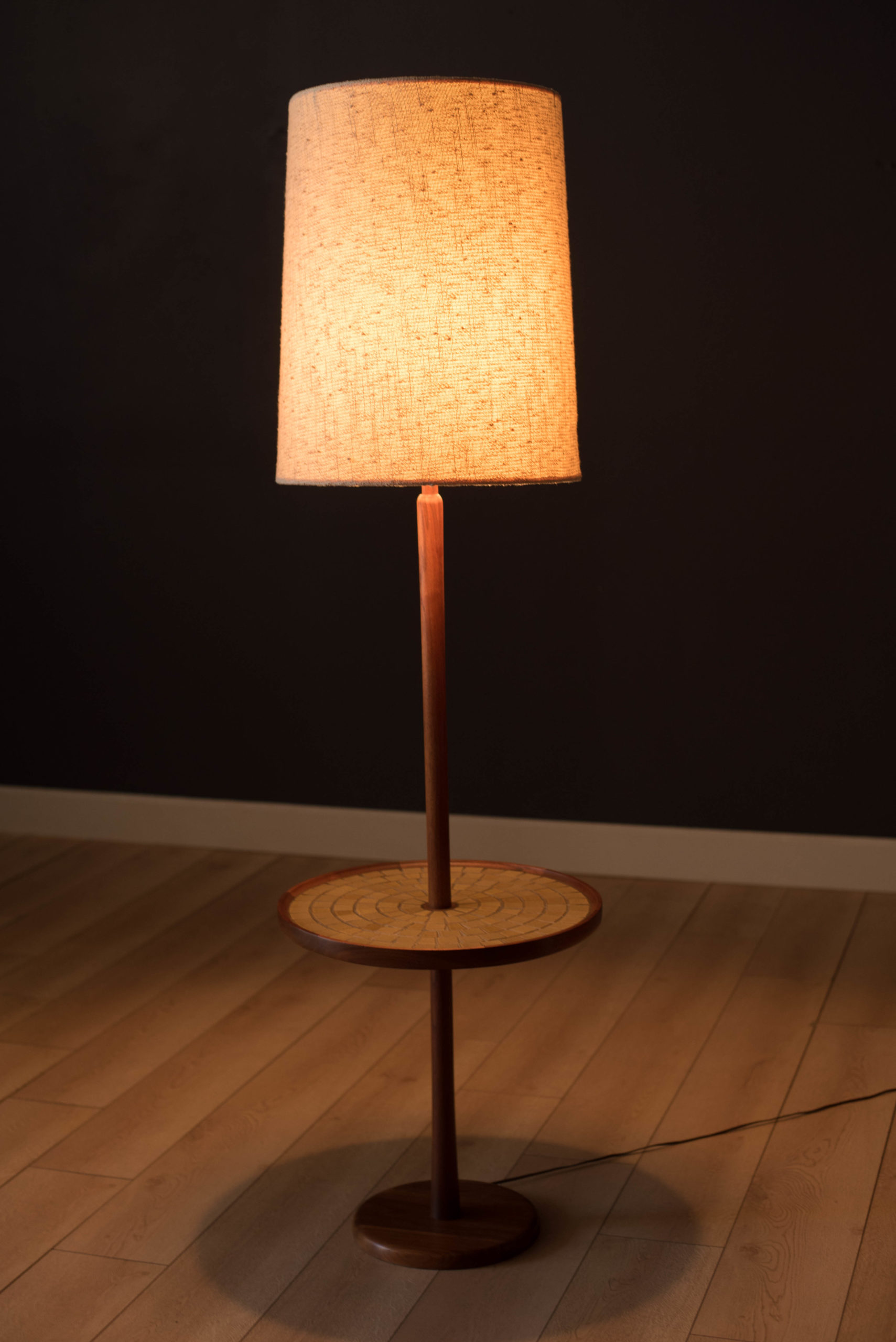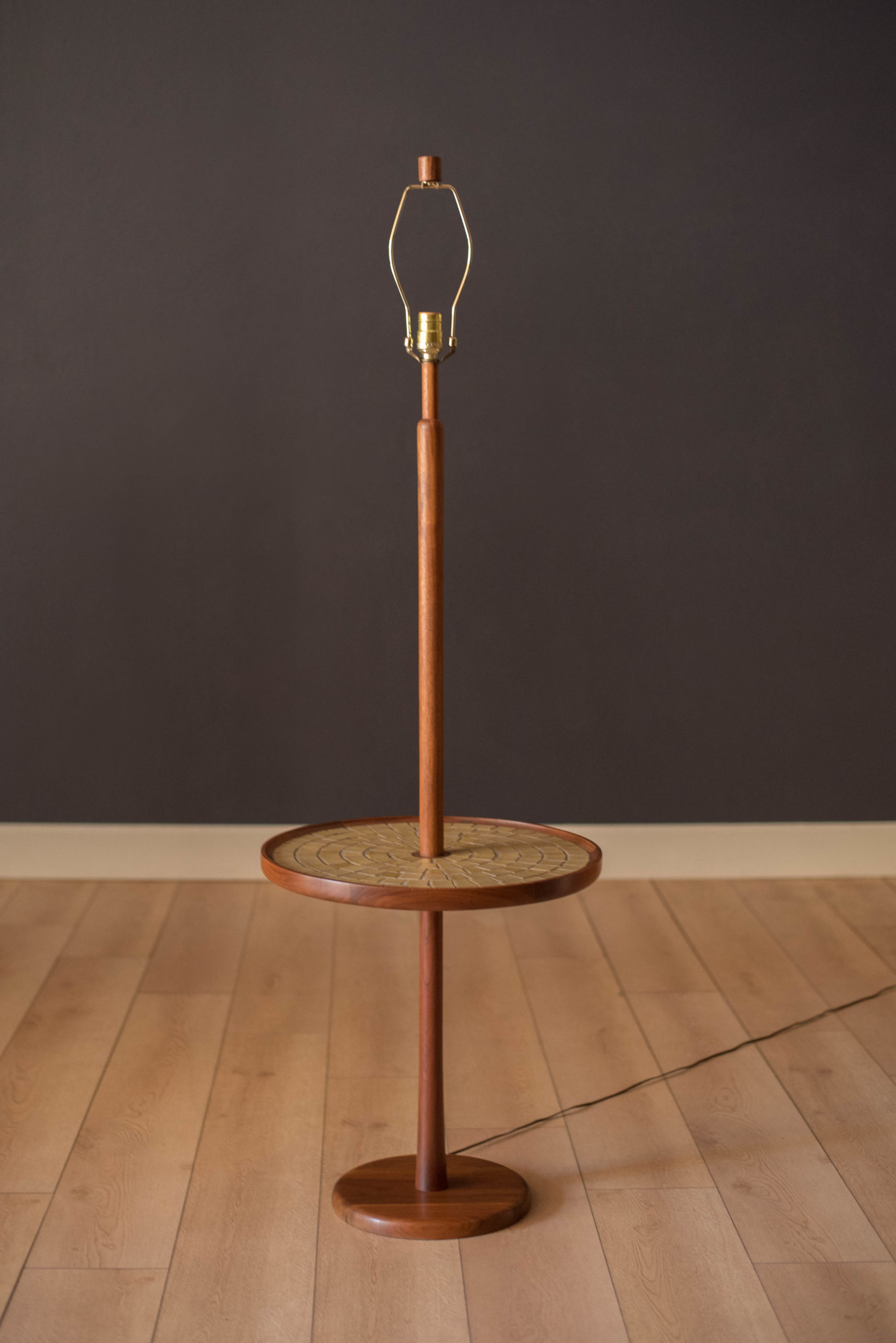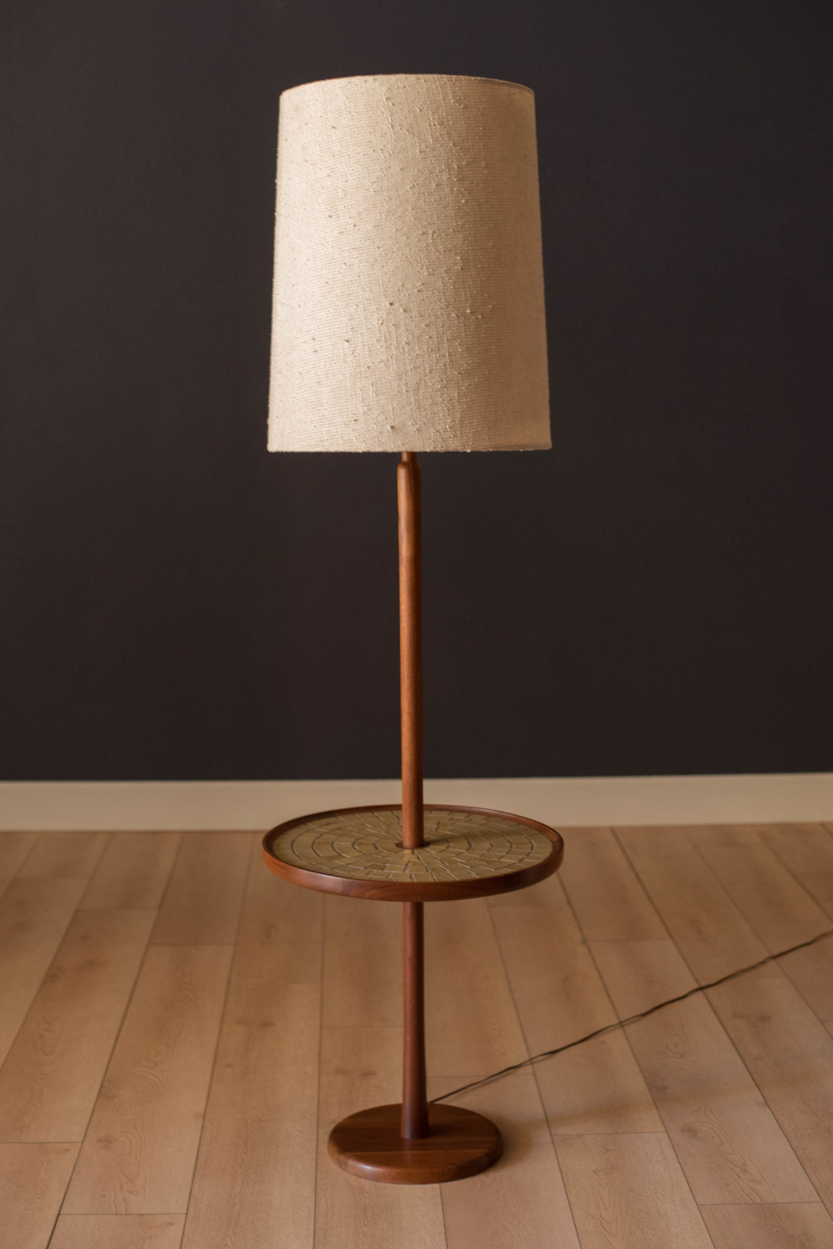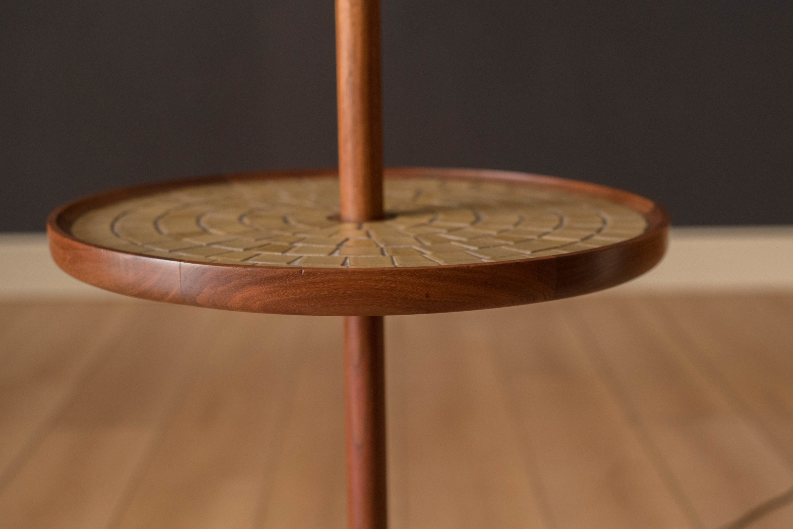 Mid Century Table Floor Lamp by Jane and Gordon Martz for Marshall Studios. The base is made of solid walnut and features a functional inlaid tile table with neutral tones. Includes a three-way switch. In great condition with minimal vintage wear. Shade is not included.