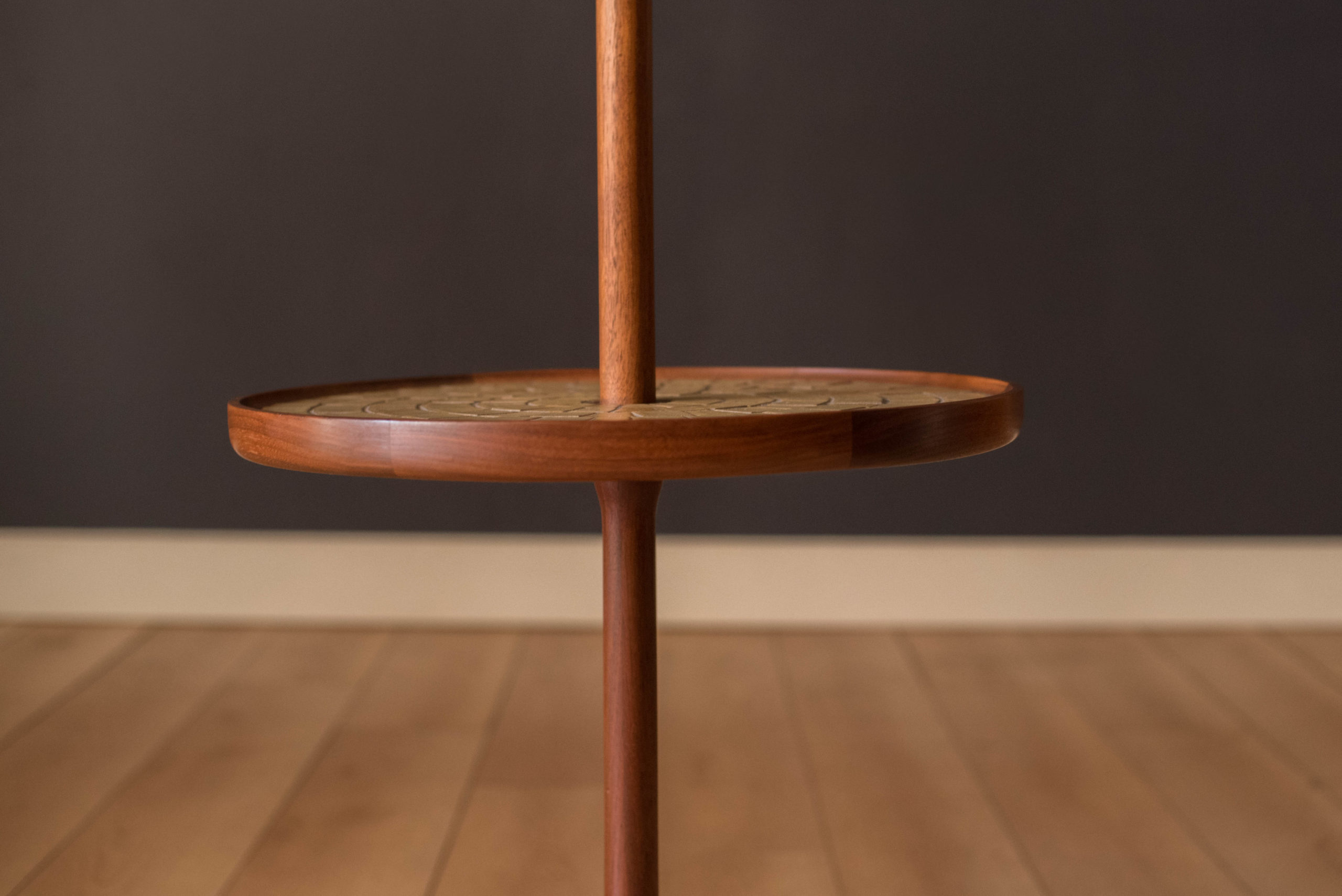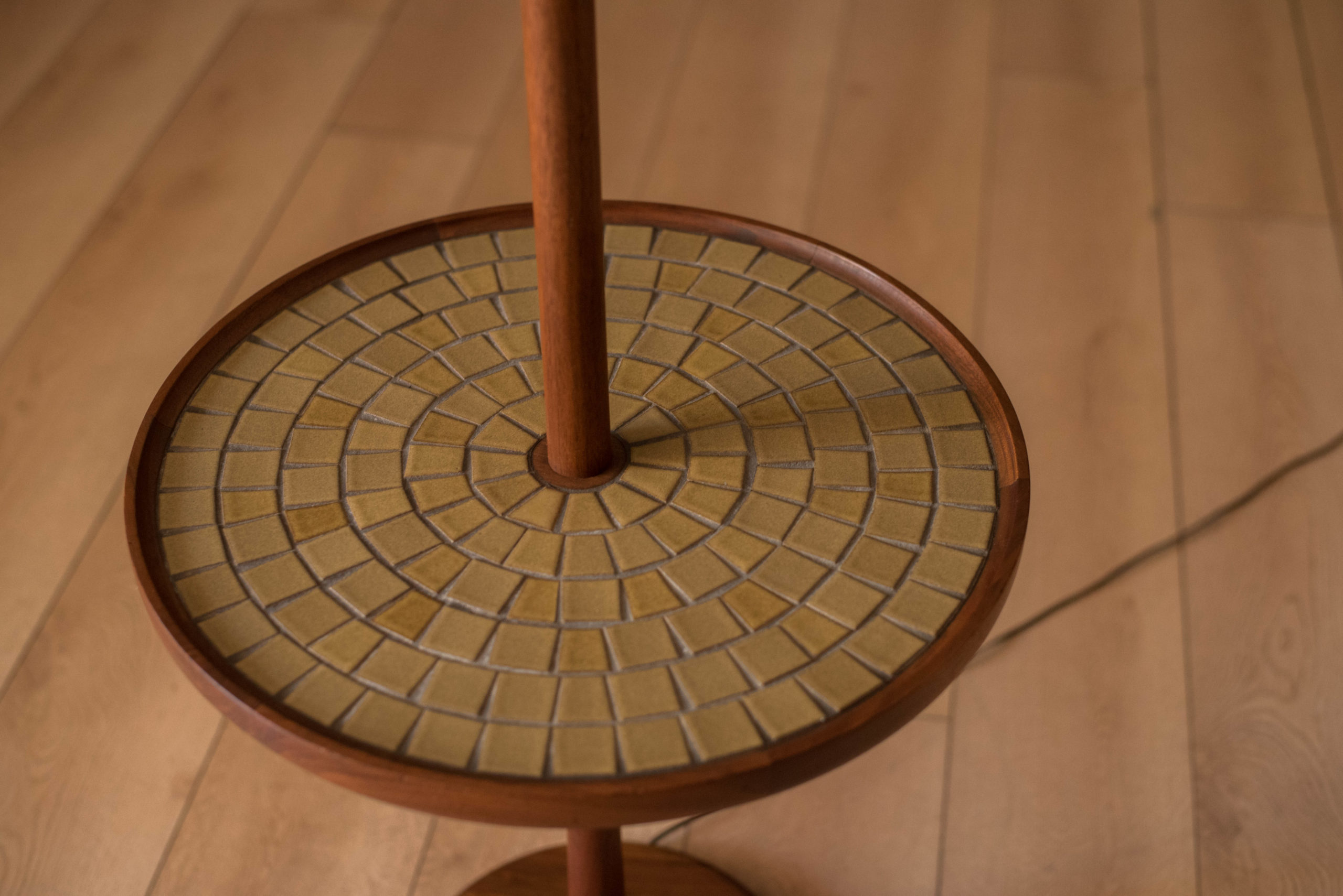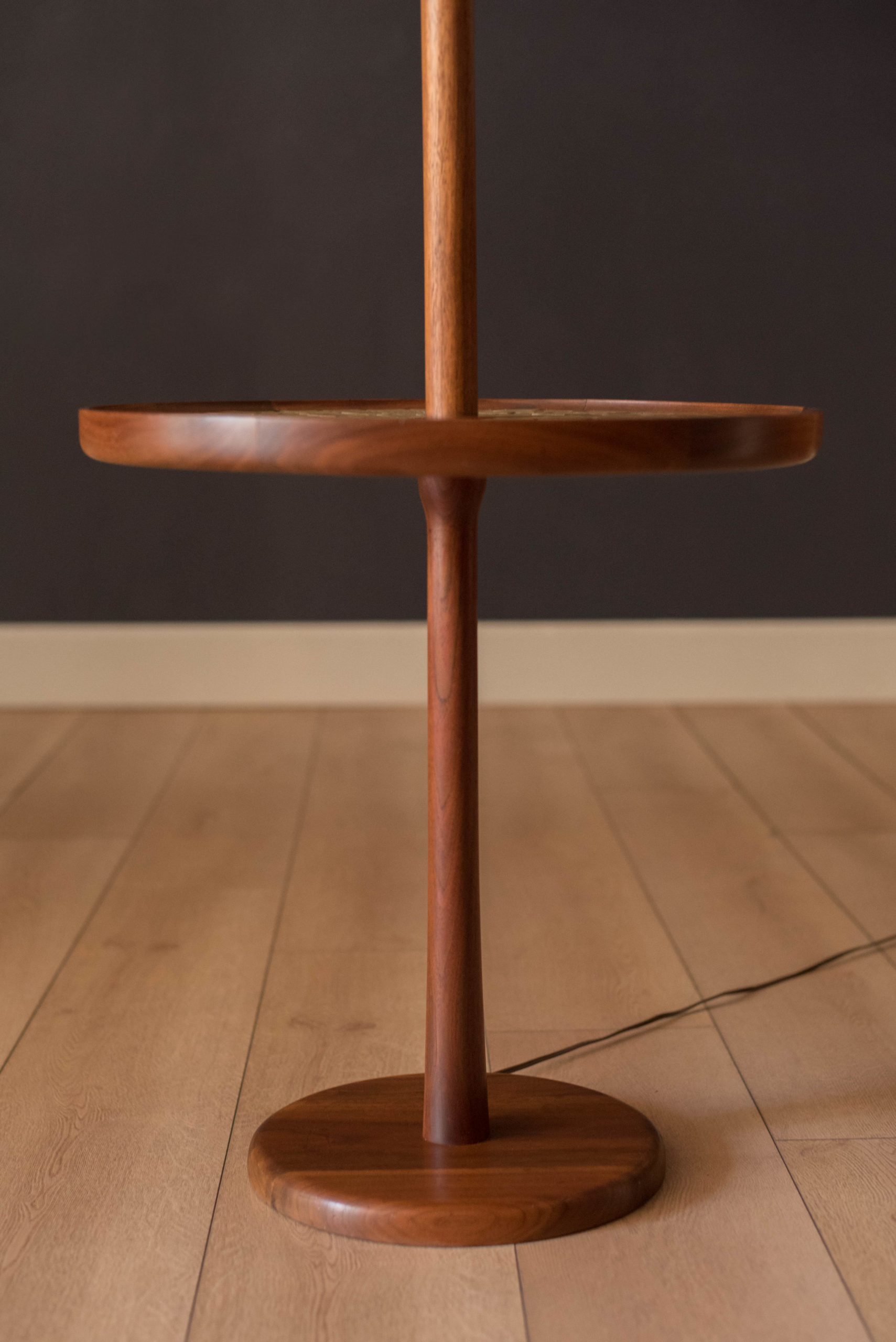 Mid Century Table Floor Lamp by Jane and Gordon Martz for Marshall Studios. The base is made of solid walnut and features a functional inlaid tile table with neutral tones. Includes a three-way switch. In great condition with minimal vintage wear. Shade is not included.
