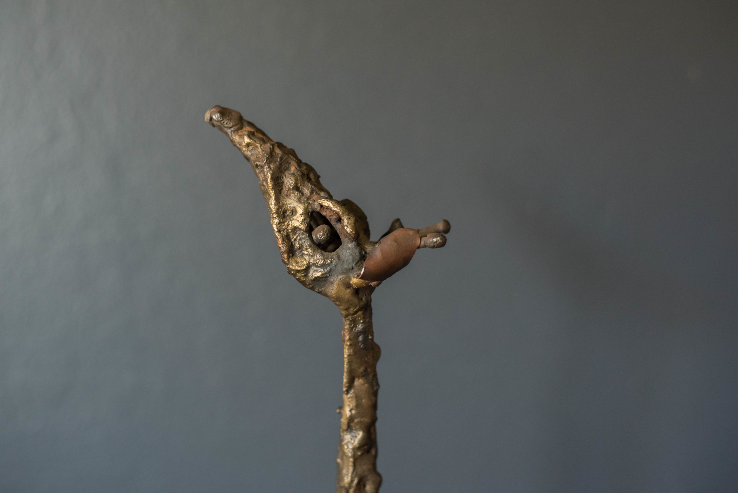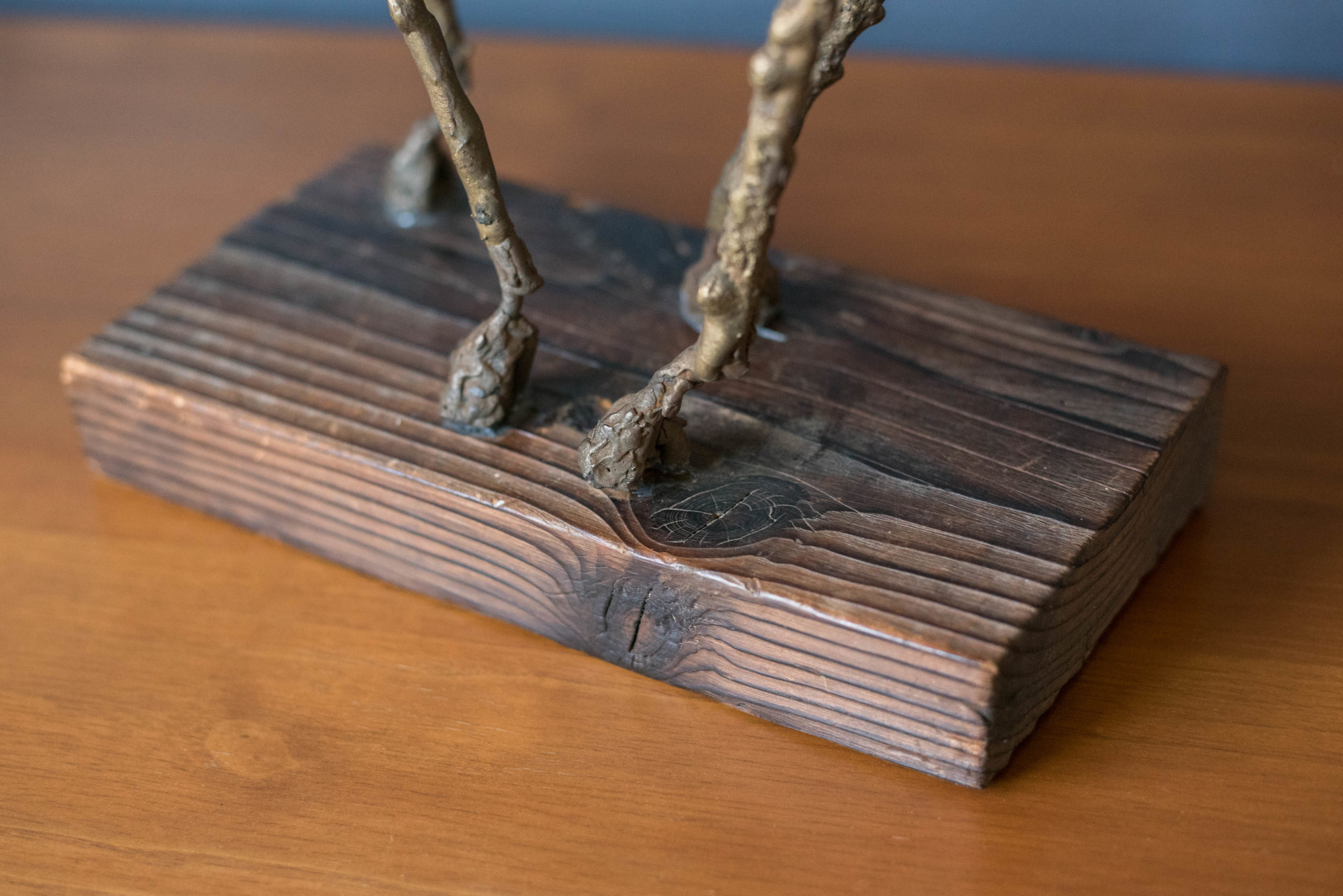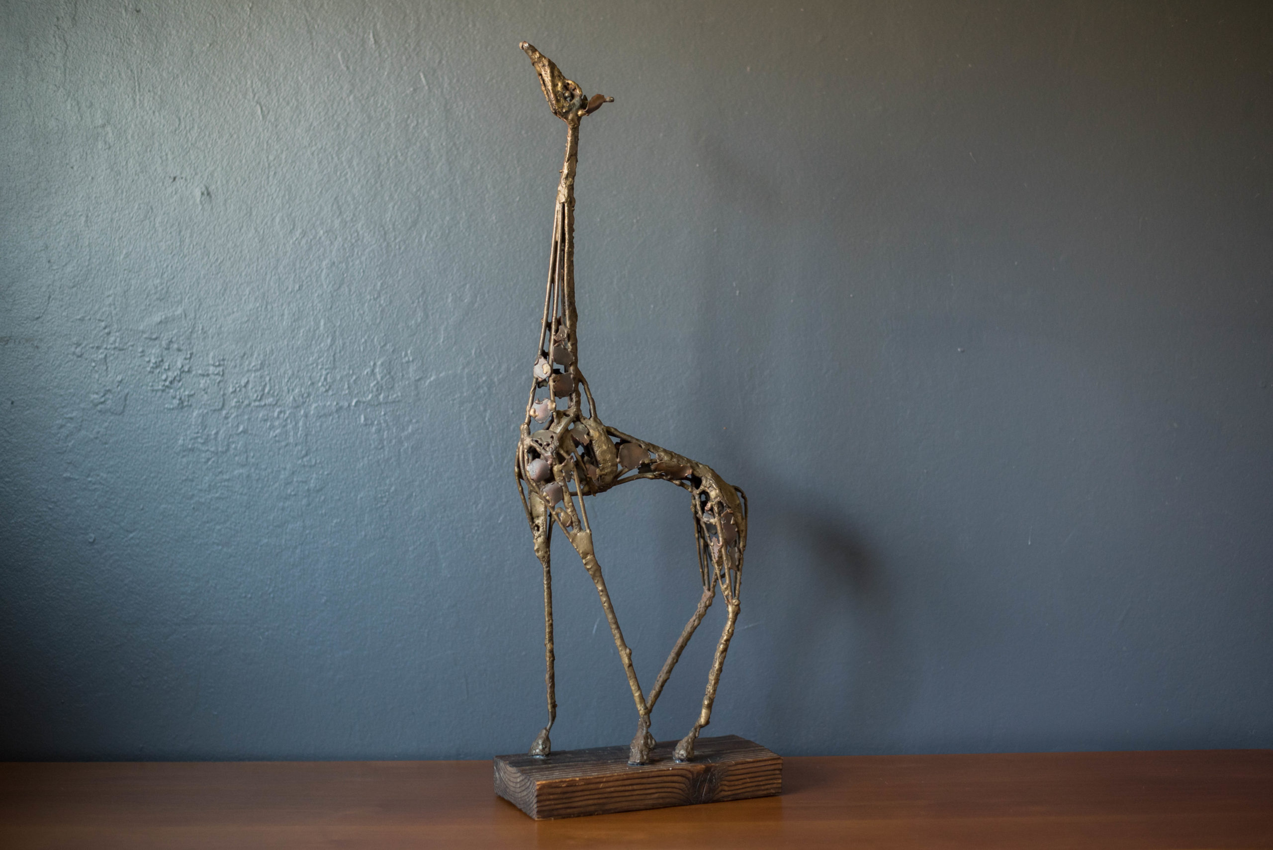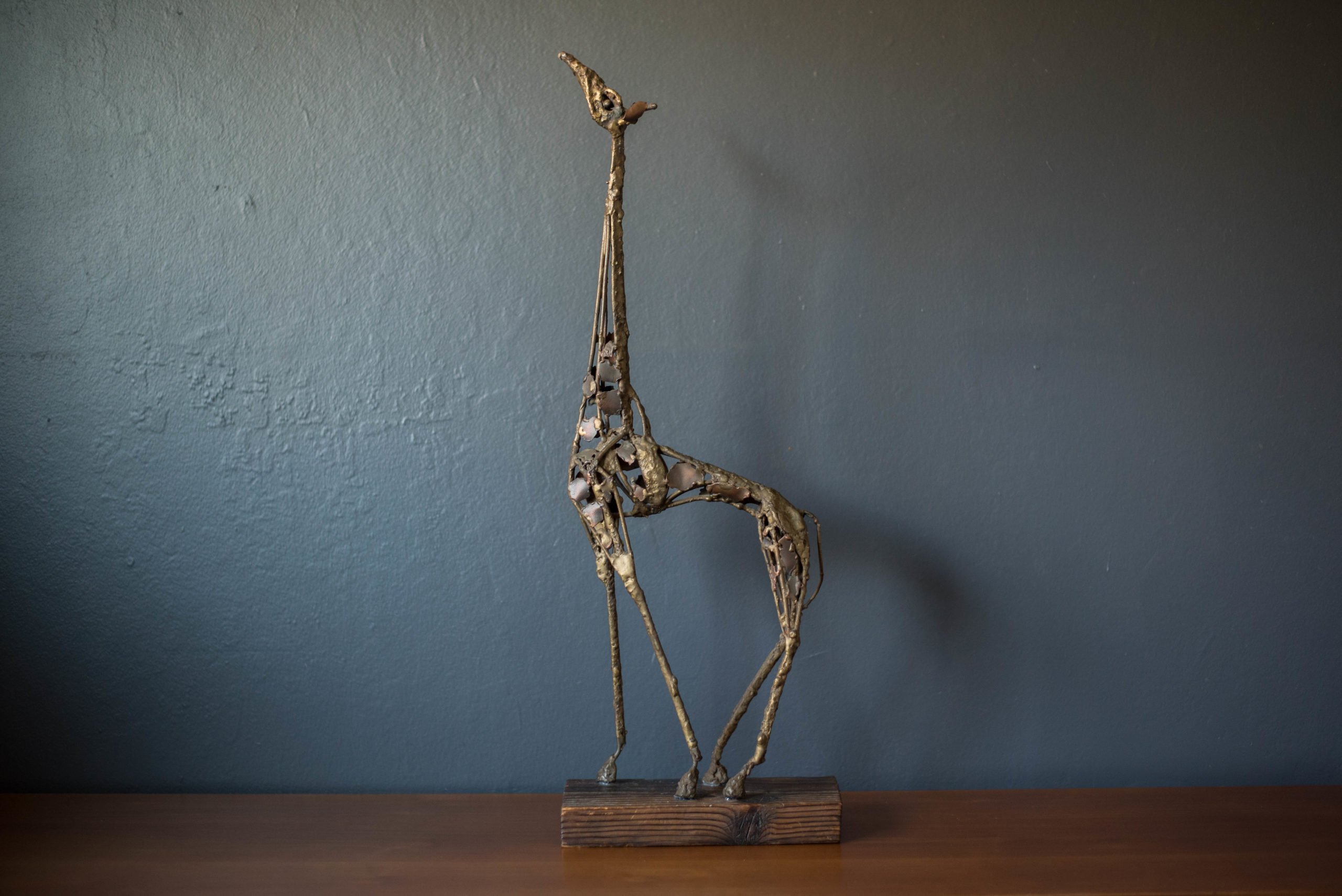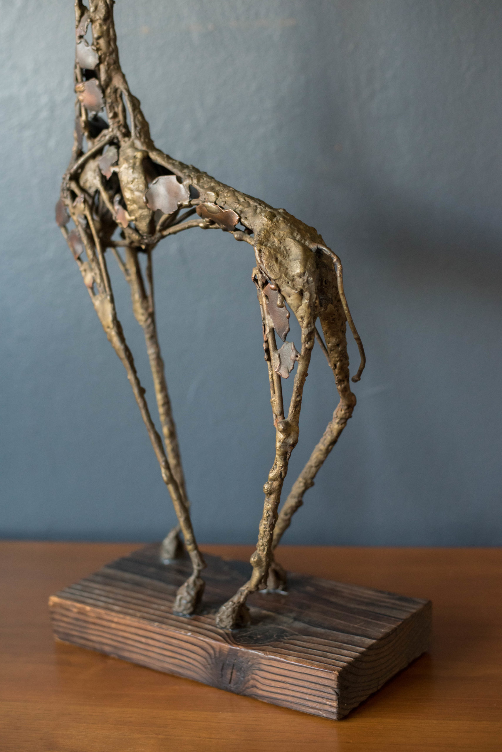 Vintage abstract Brutalist freestanding giraffe sculpture on solid wood plank c. 1960’s. This decorative accent piece adds depth and character to any space composed of mixed metals that display plenty of vintage patina. In good condition with wear such as patina on the metal, scratches and nicks on the wood base. See photos.