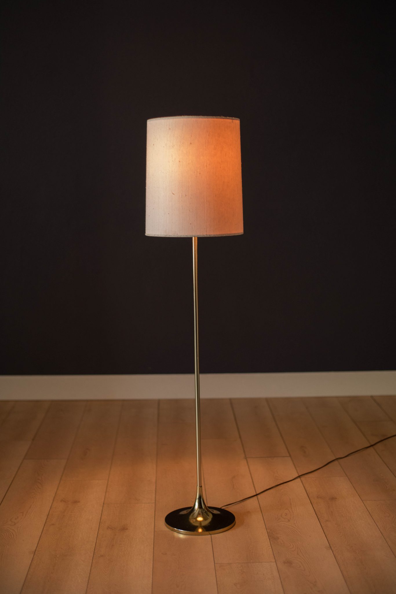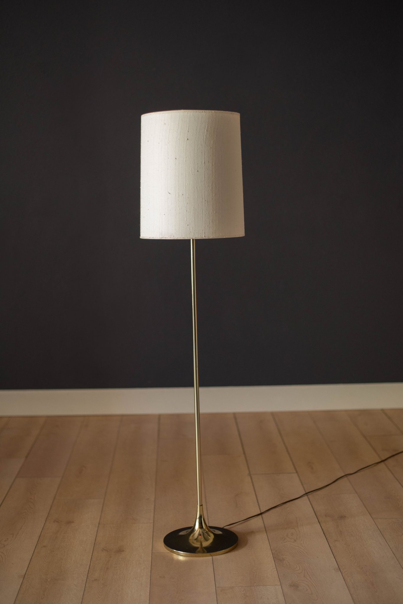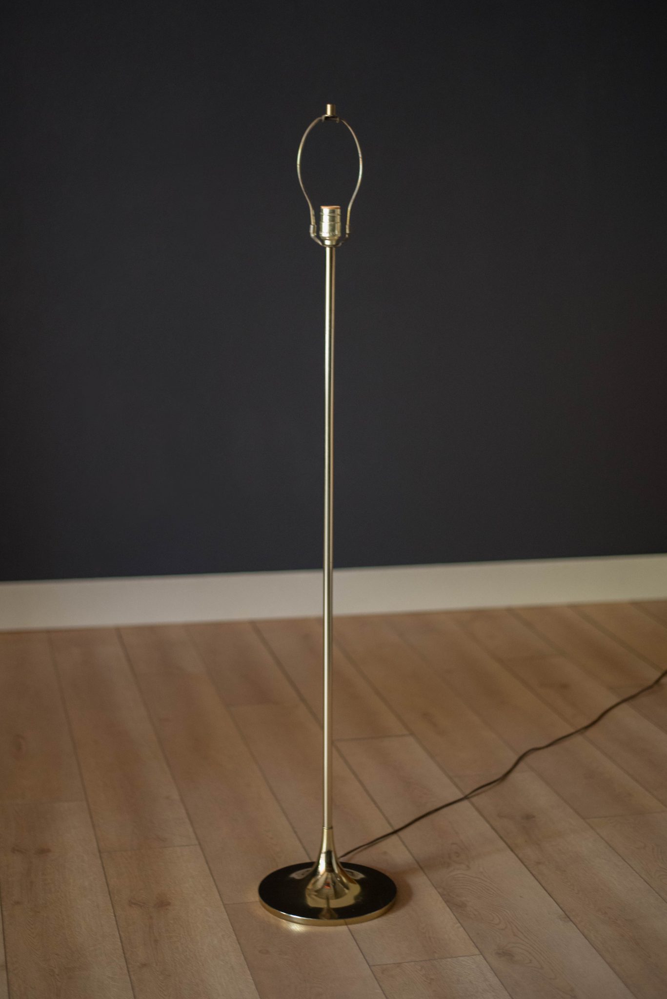 Mid-Century Modern Laurel floor lamp, circa 1960s. This sculptural piece features a weighted brass plated stem complete with Laurel lamp’s signature finial. Includes a three-way switch mechanism. Drum shade is not included.