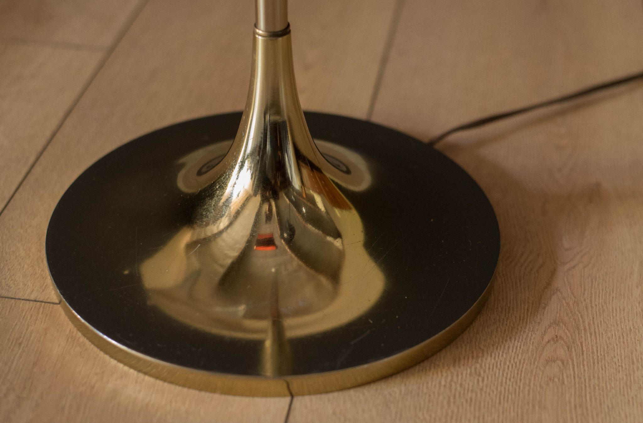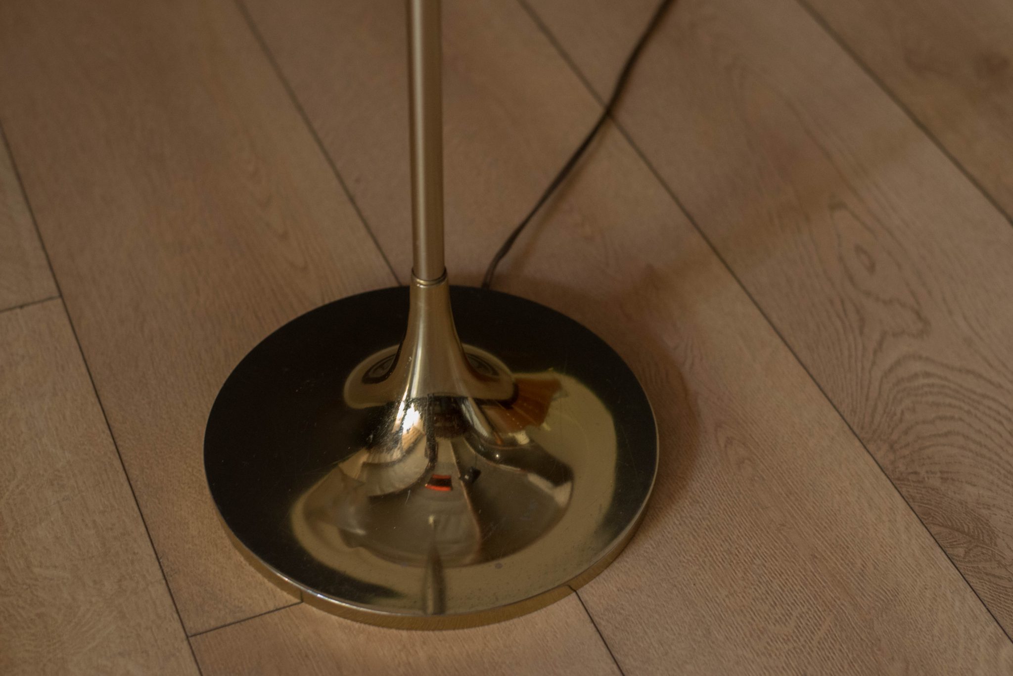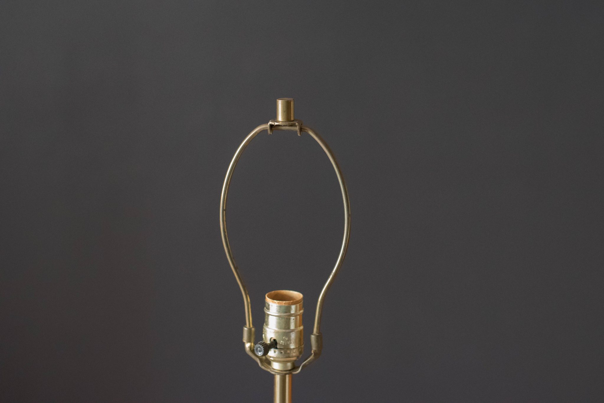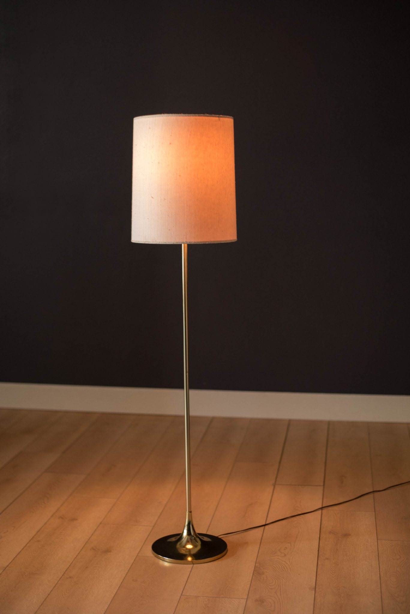 Mid-Century Modern Laurel floor lamp, circa 1960s. This sculptural piece features a weighted brass plated stem complete with Laurel lamp’s signature finial. Includes a three-way switch mechanism. Drum shade is not included.