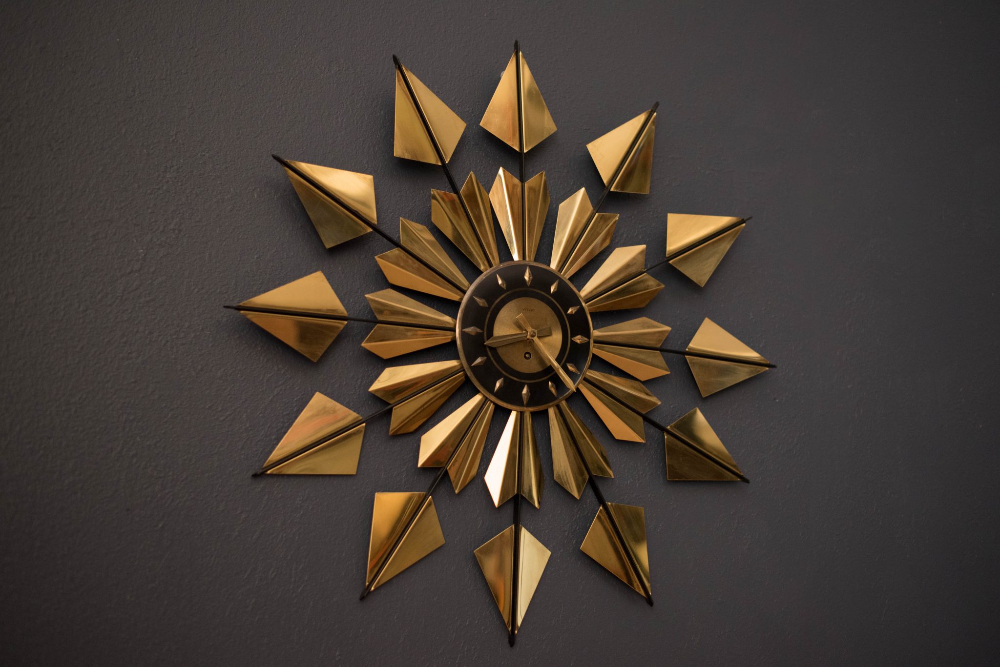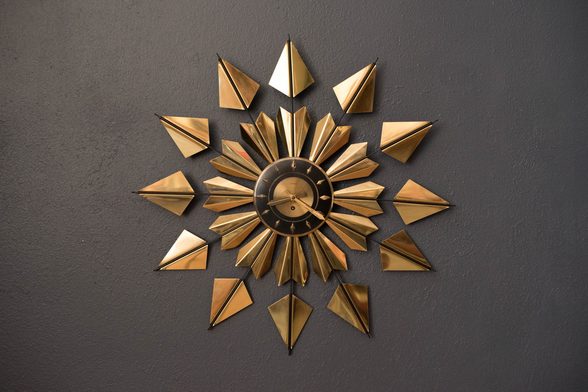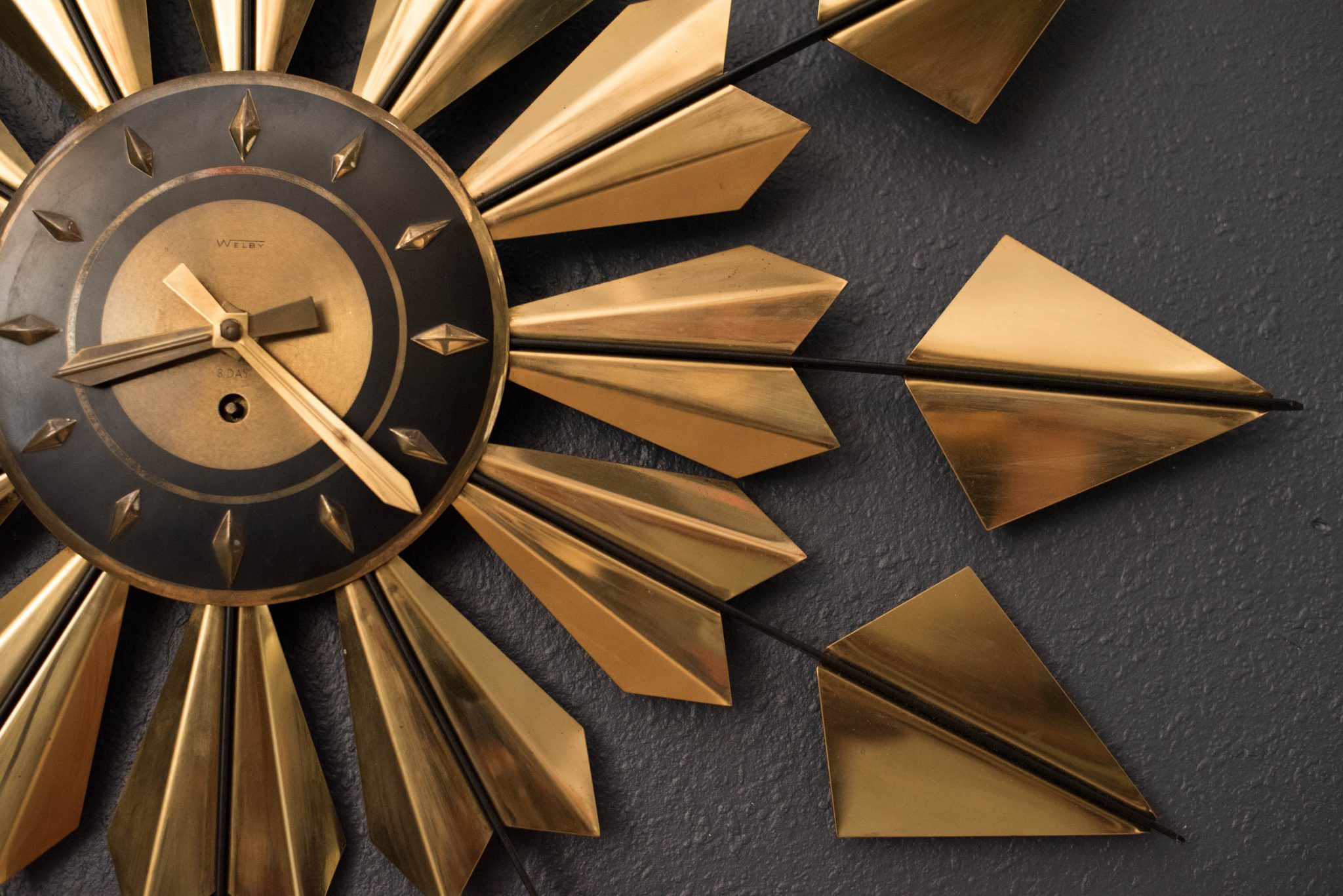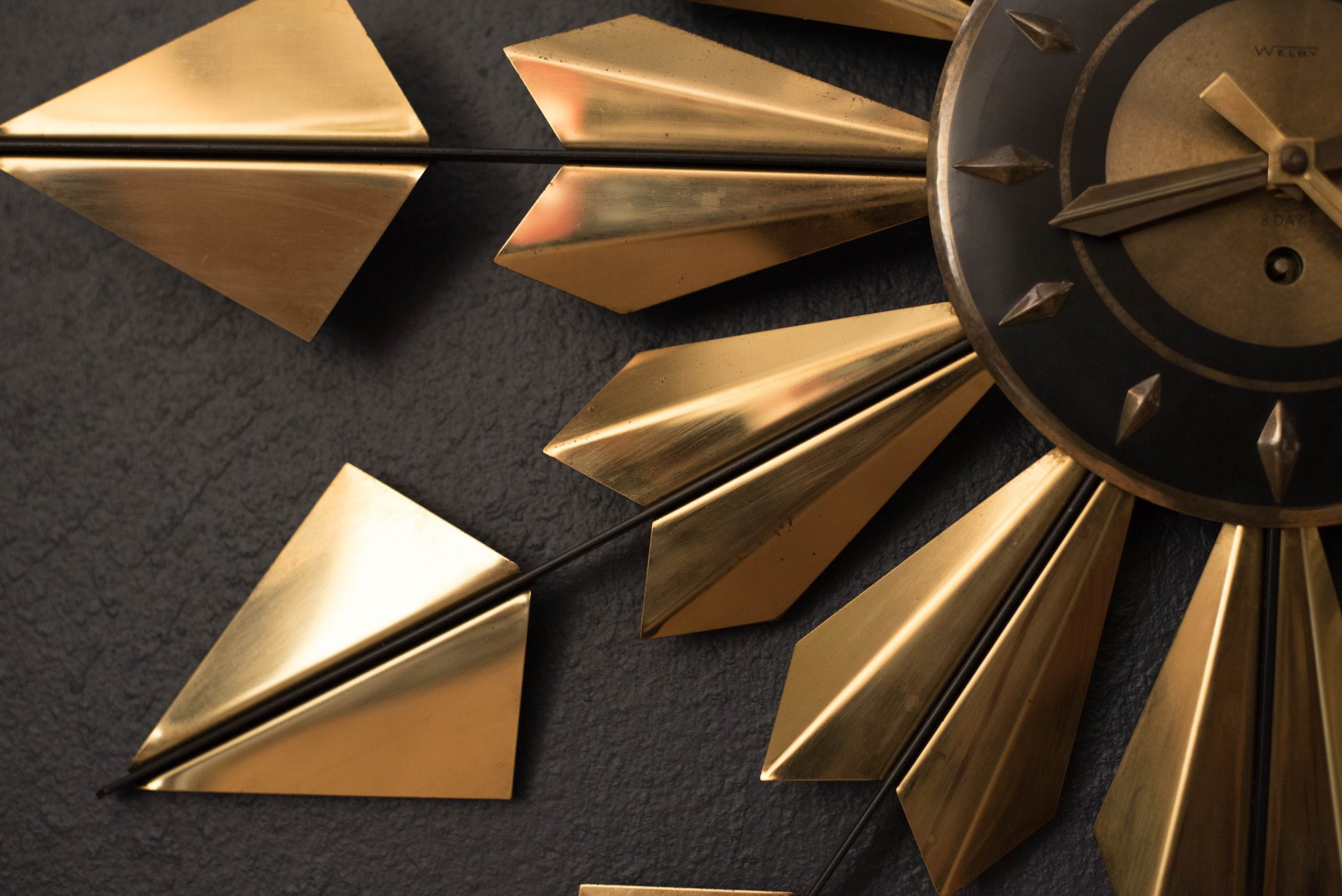 Mid century sunburst clock in brass, circa 1960s. This oversized vintage wall clock makes a bold statement in black and gold that creates a great focal point for any space. Made by Welby and includes the original wind up key.