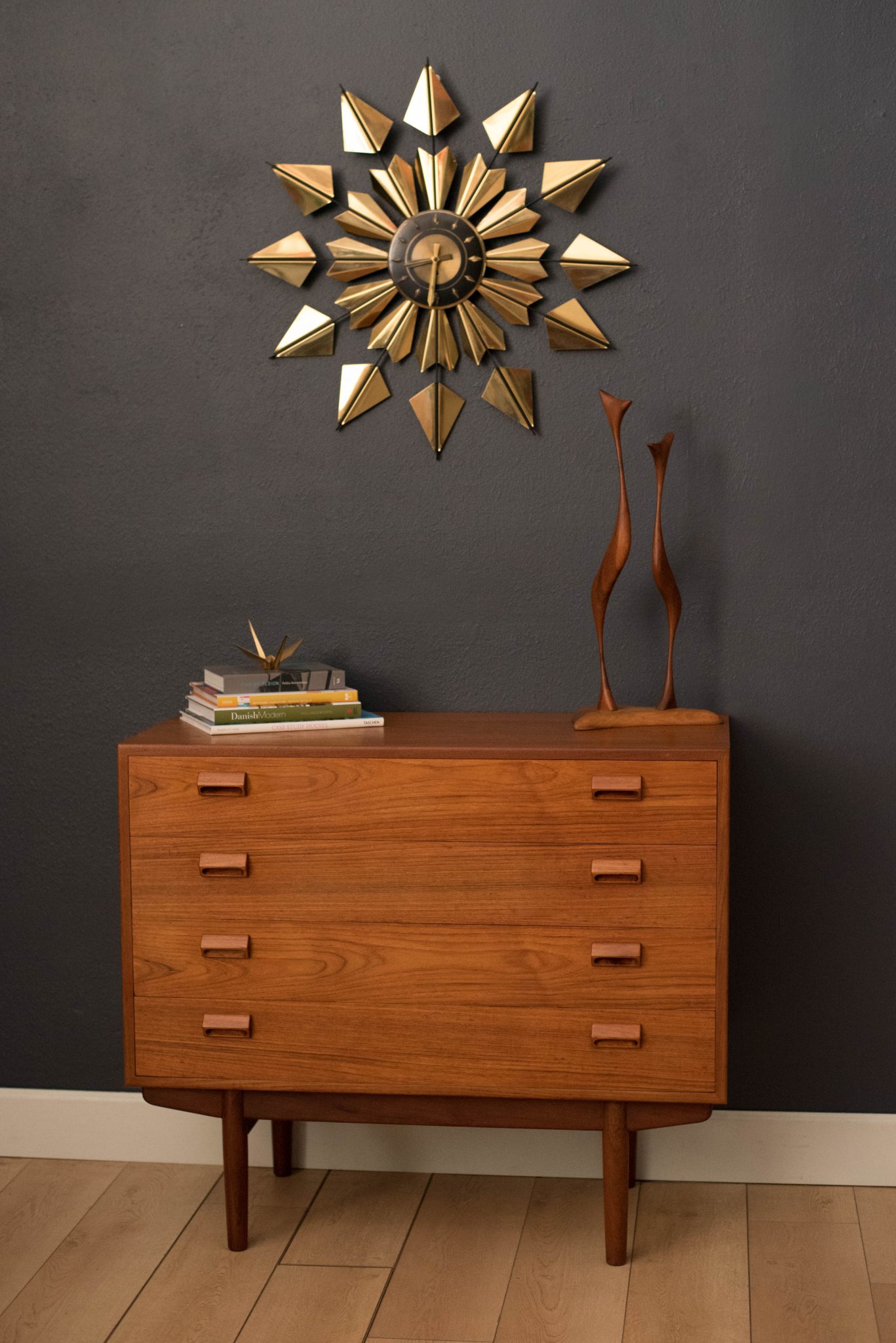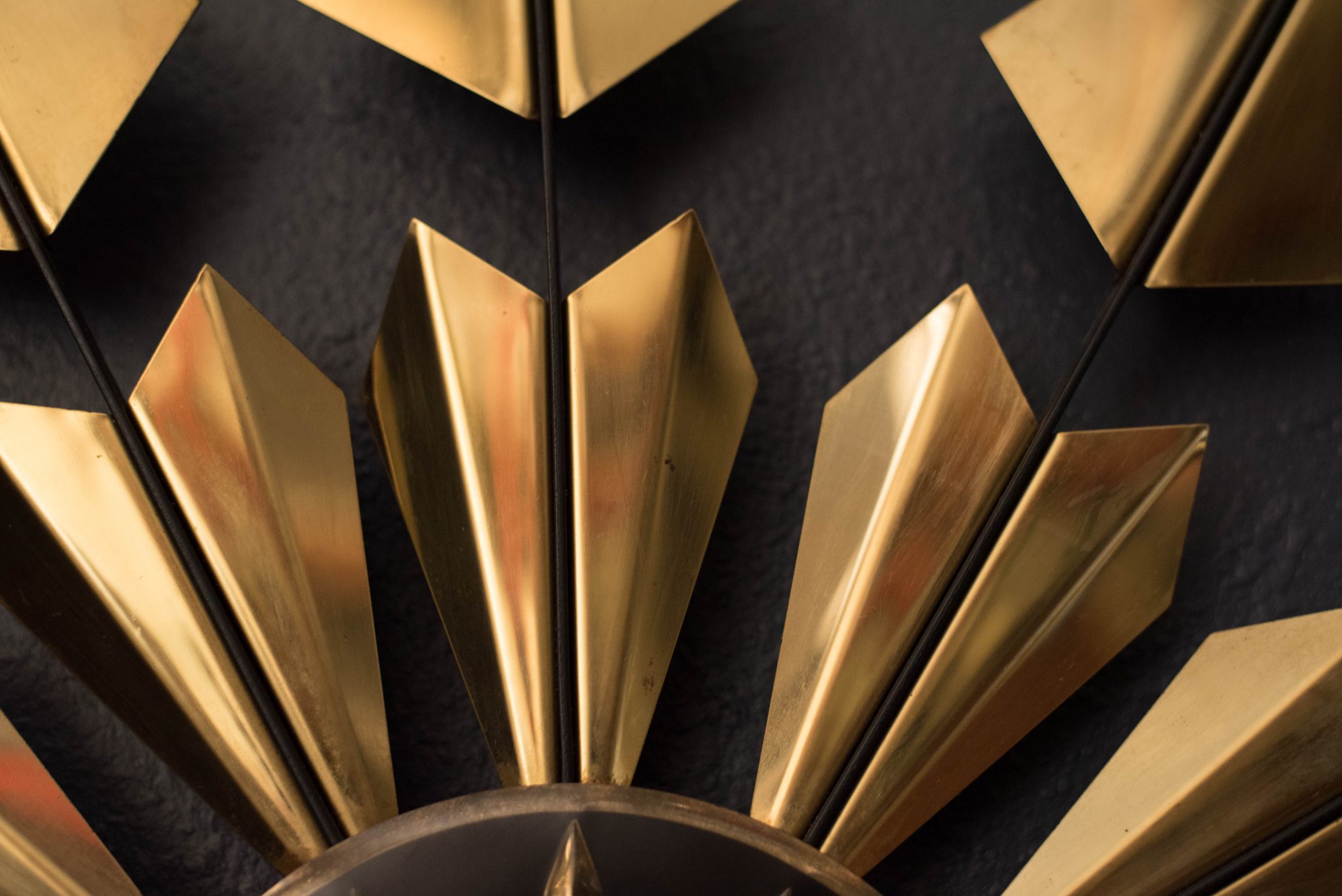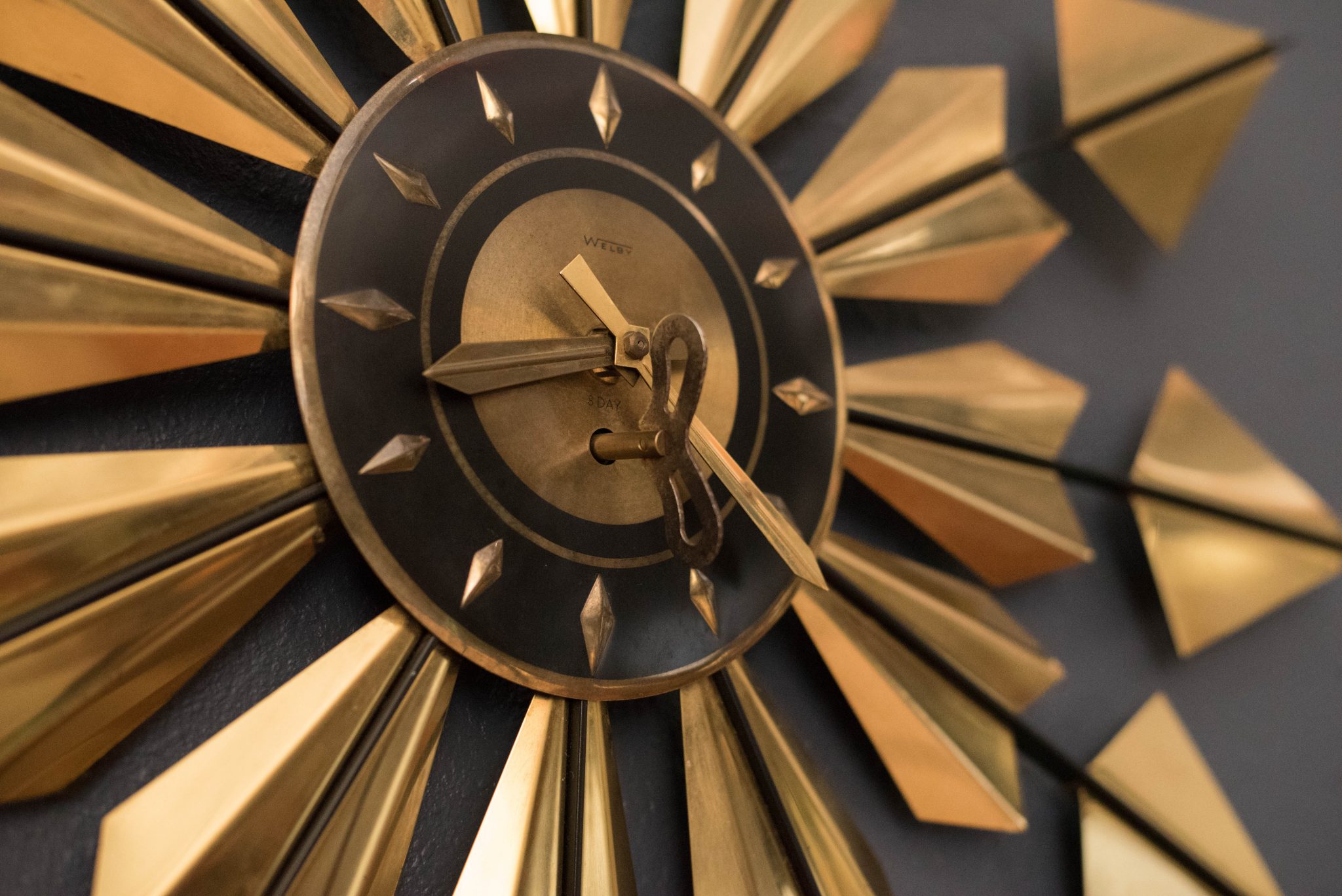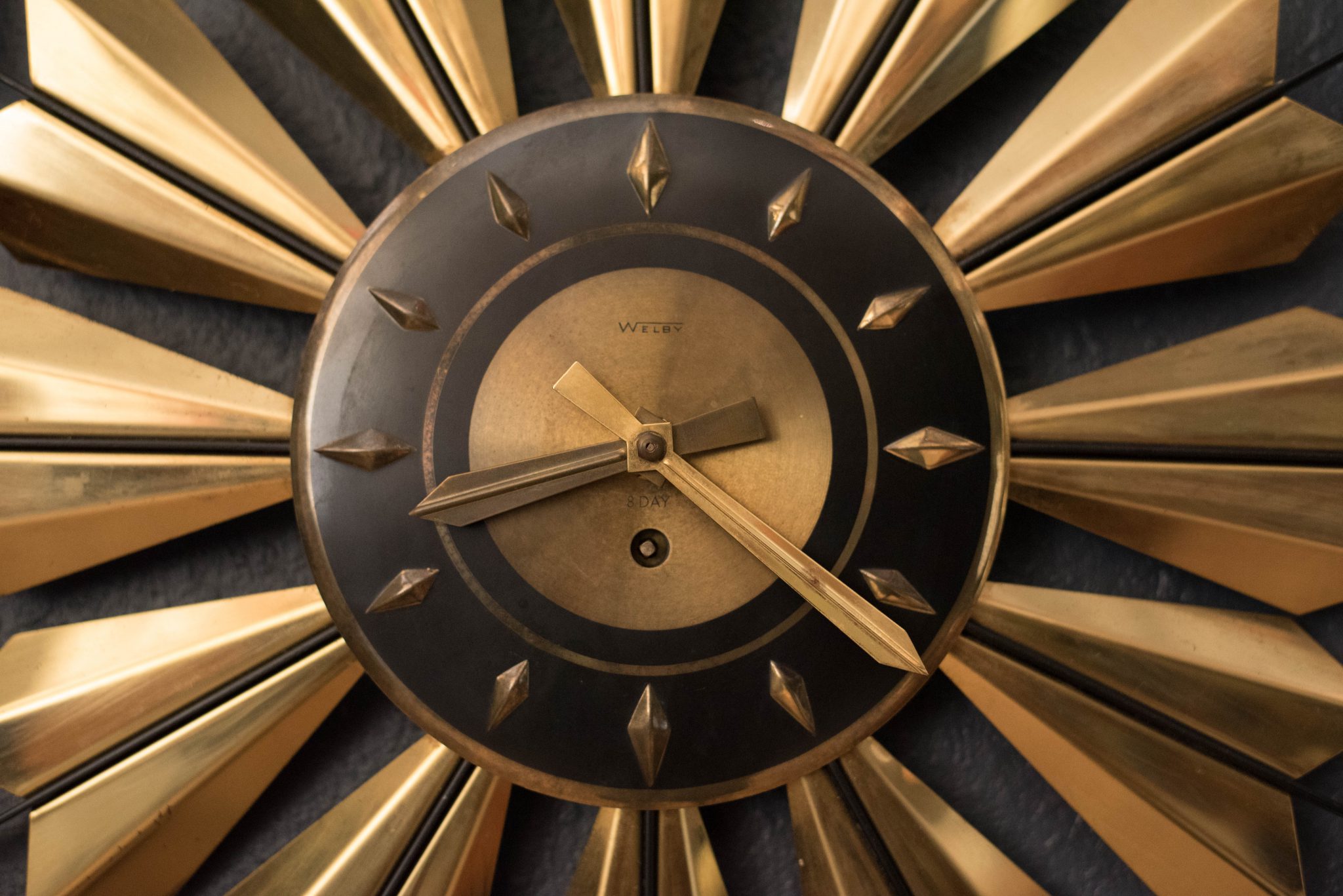 Mid century sunburst clock in brass, circa 1960s. This oversized vintage wall clock makes a bold statement in black and gold that creates a great focal point for any space. Made by Welby and includes the original wind up key.