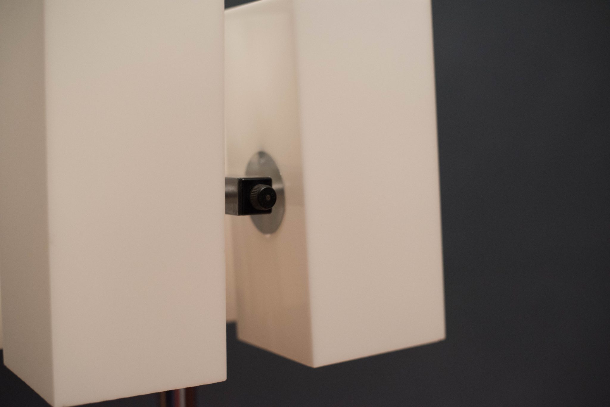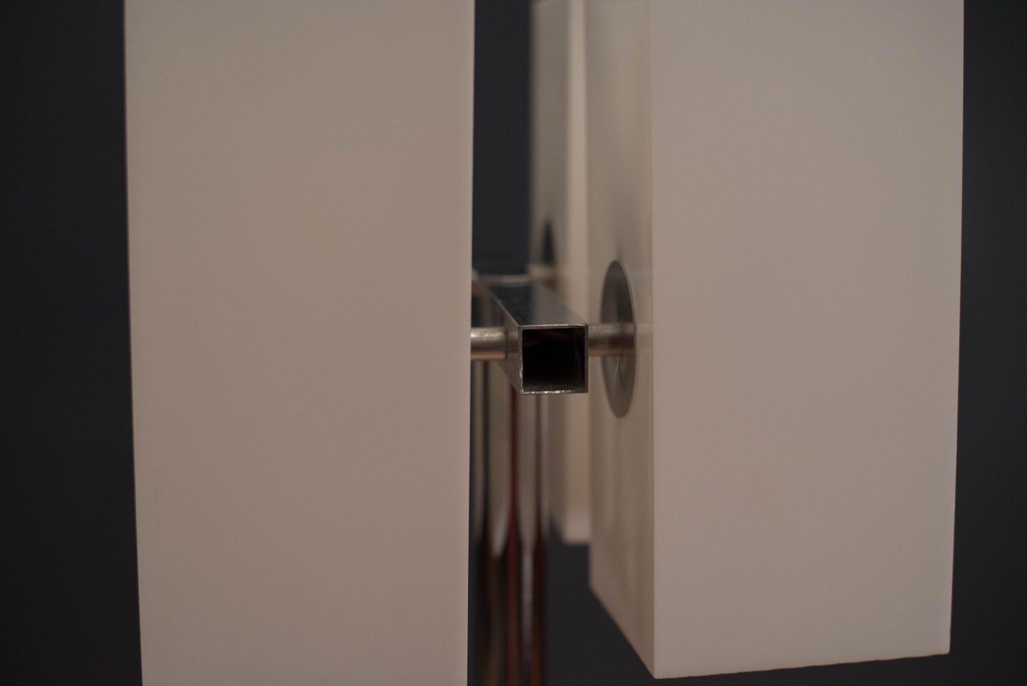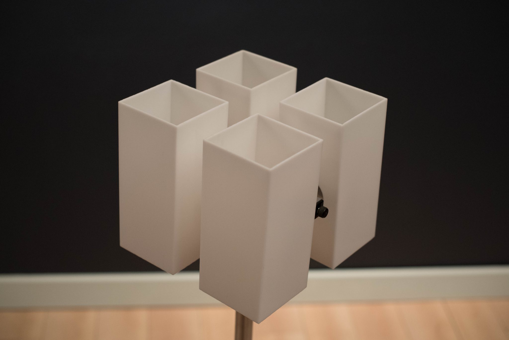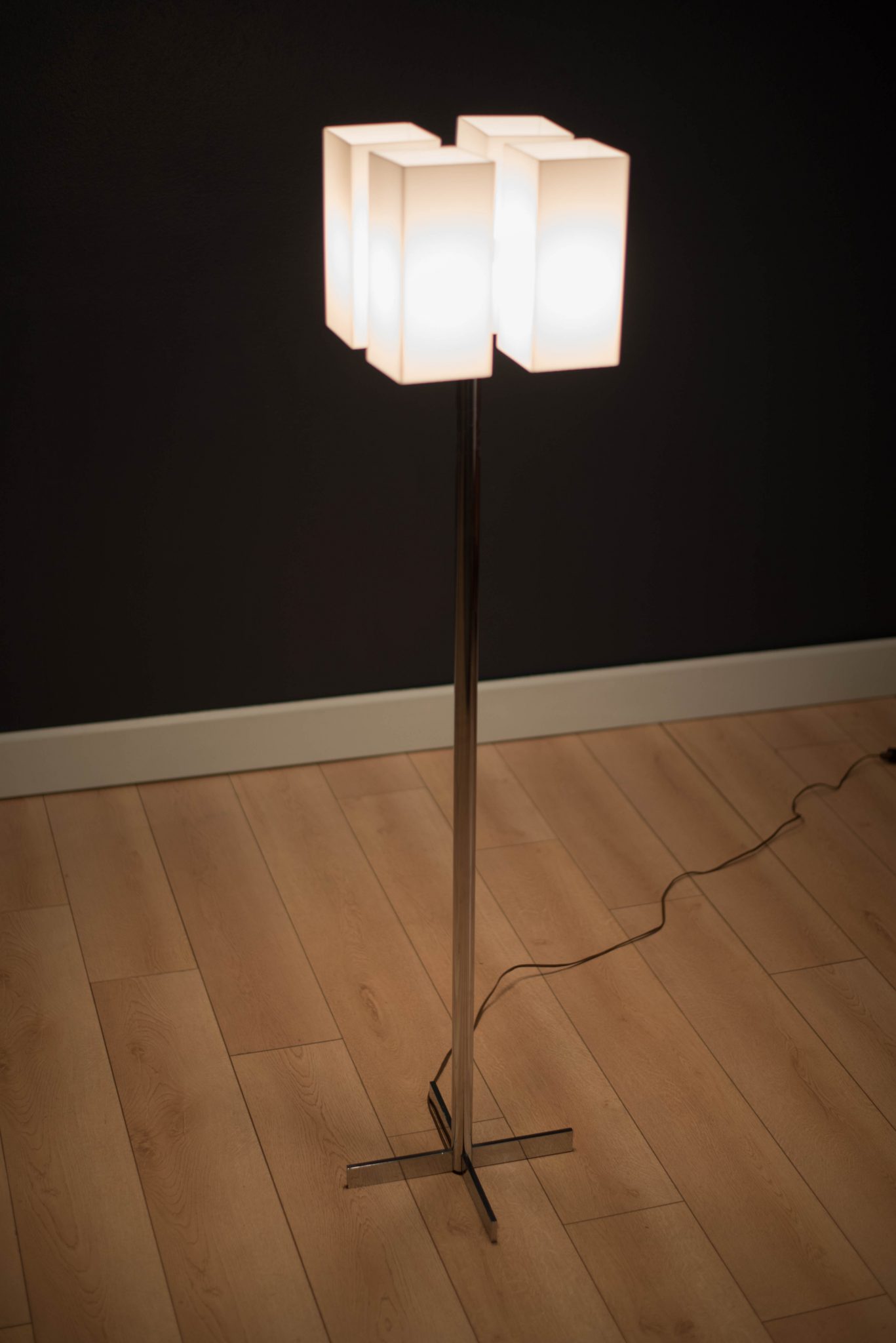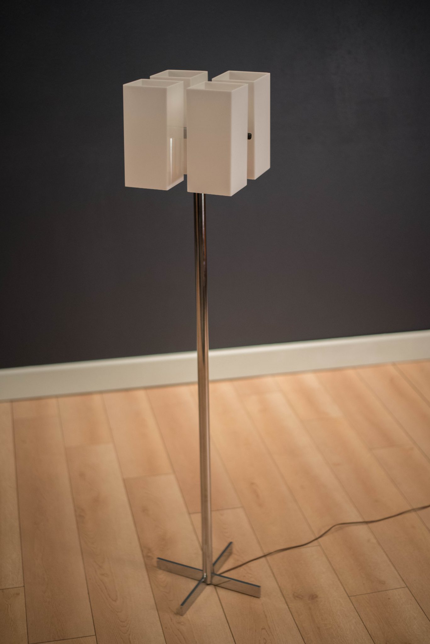 Mid Century Modern Chrome Floor Lamp c. 1970’s. This piece has four acrylic white shades and chrome X-base. It is good working condition with minimal patina on base.