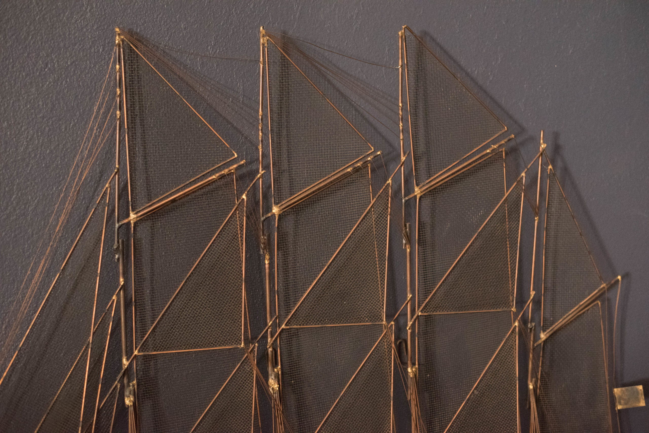 Vintage “Clipper Ship” sailboat wall hanging sculpture designed by Curtis Jere for Artisan House produced in 1975. This decorative nautical statement piece is composed of copper and mixed metal elements that have a reflective appearance as the light changes. A dramatic focal point to any space adding texture and dimension. Signed C Jere 1975.