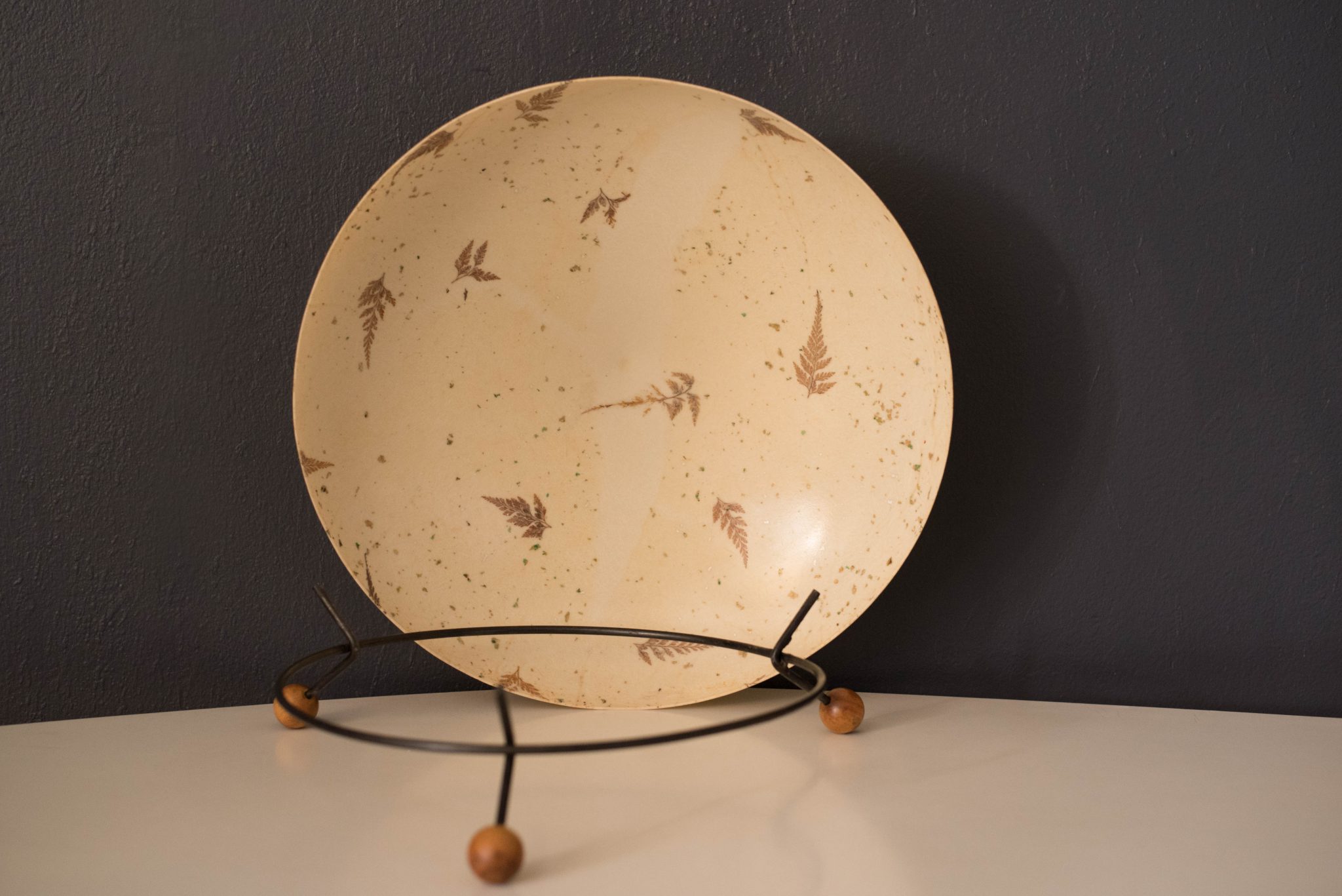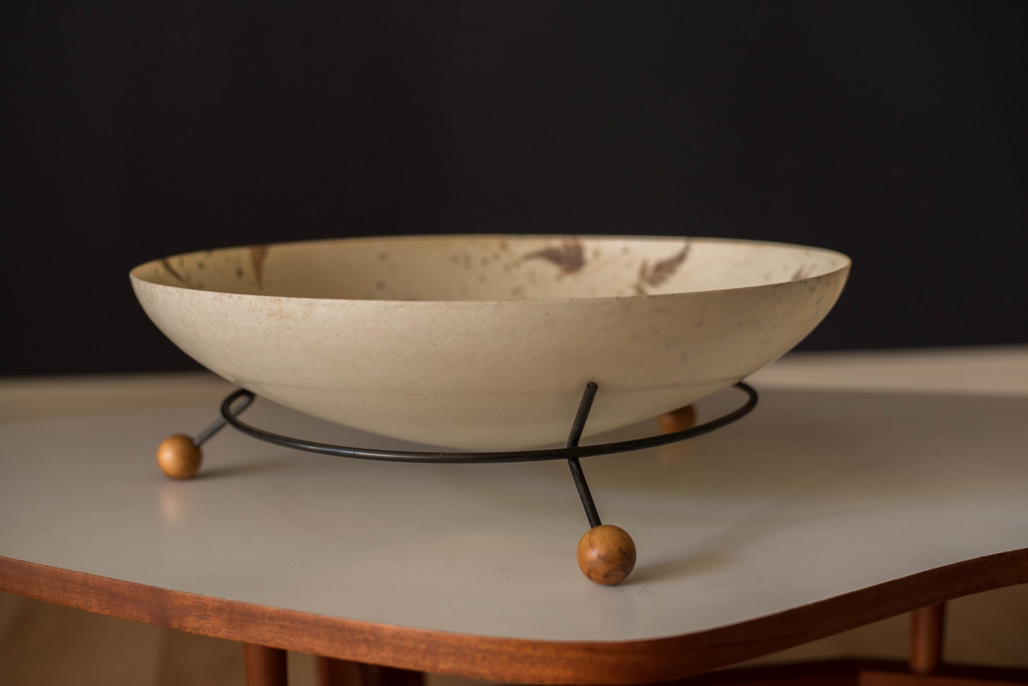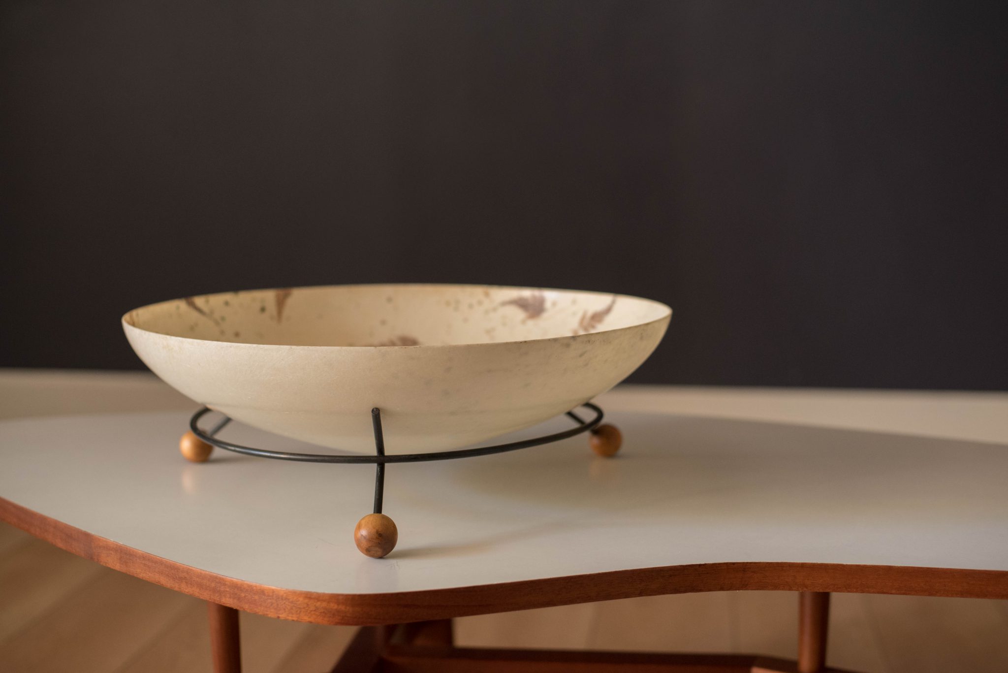 Vintage catchall decorative centerpiece tray, circa 1960s. This versatile display piece is perfect for stashing your belongings and home accessories. Includes a wide fiberglass bowl with a unique interior leaf inlay. Features a supporting iron ring stand complemented with wooden ball feet.