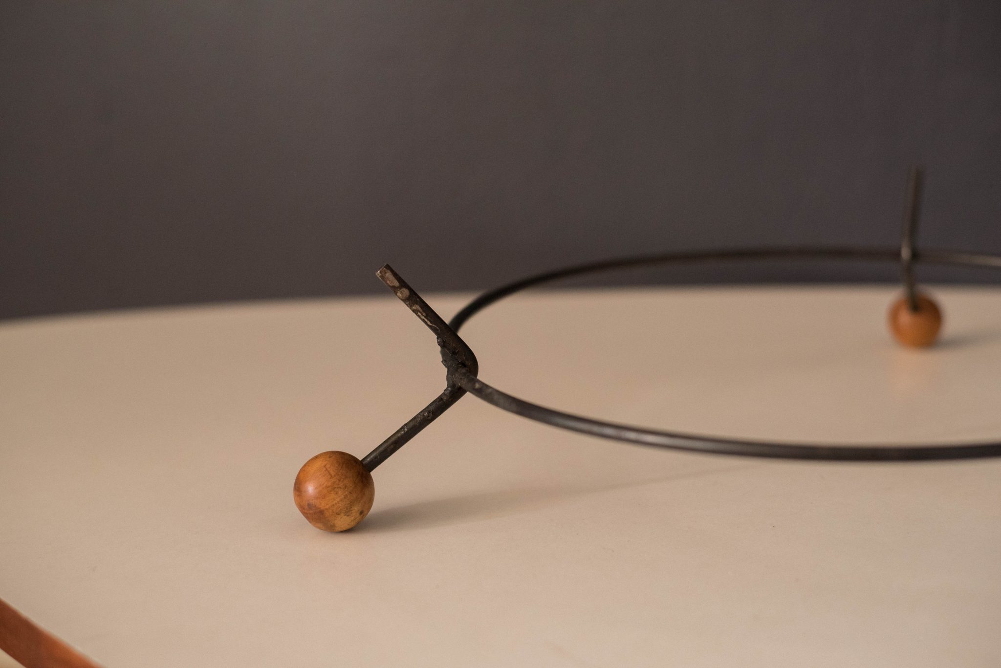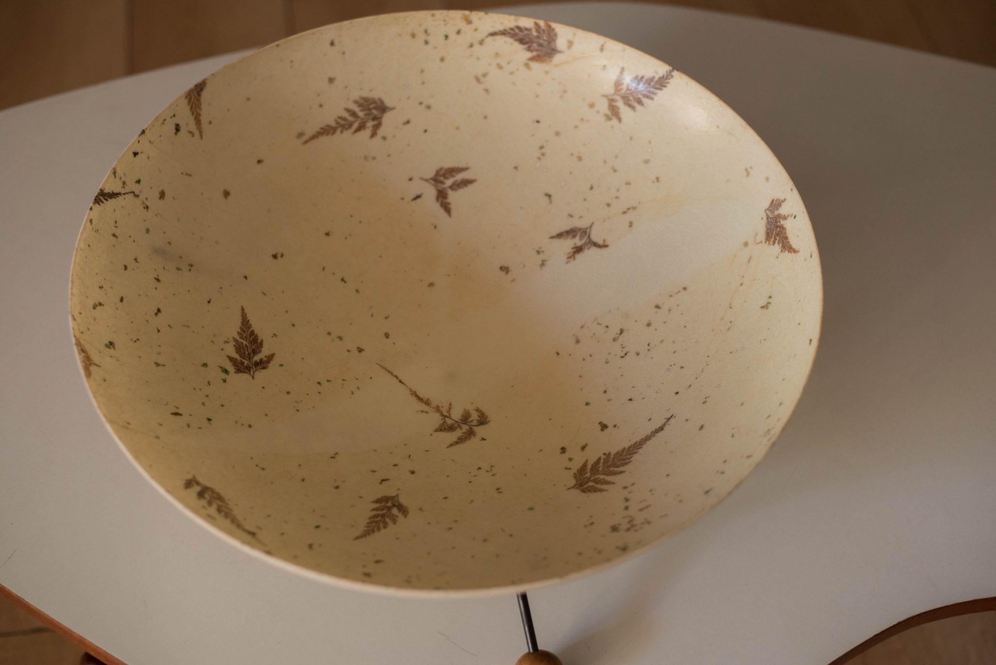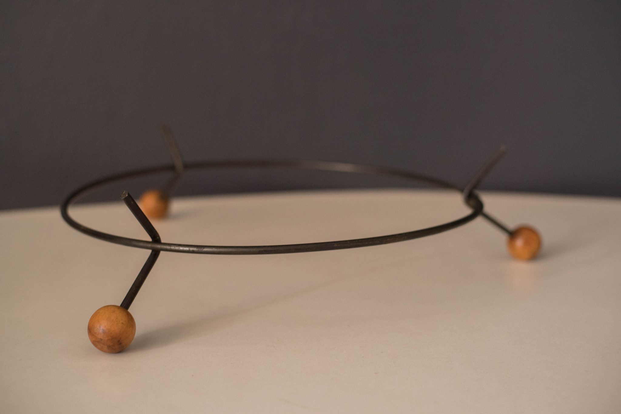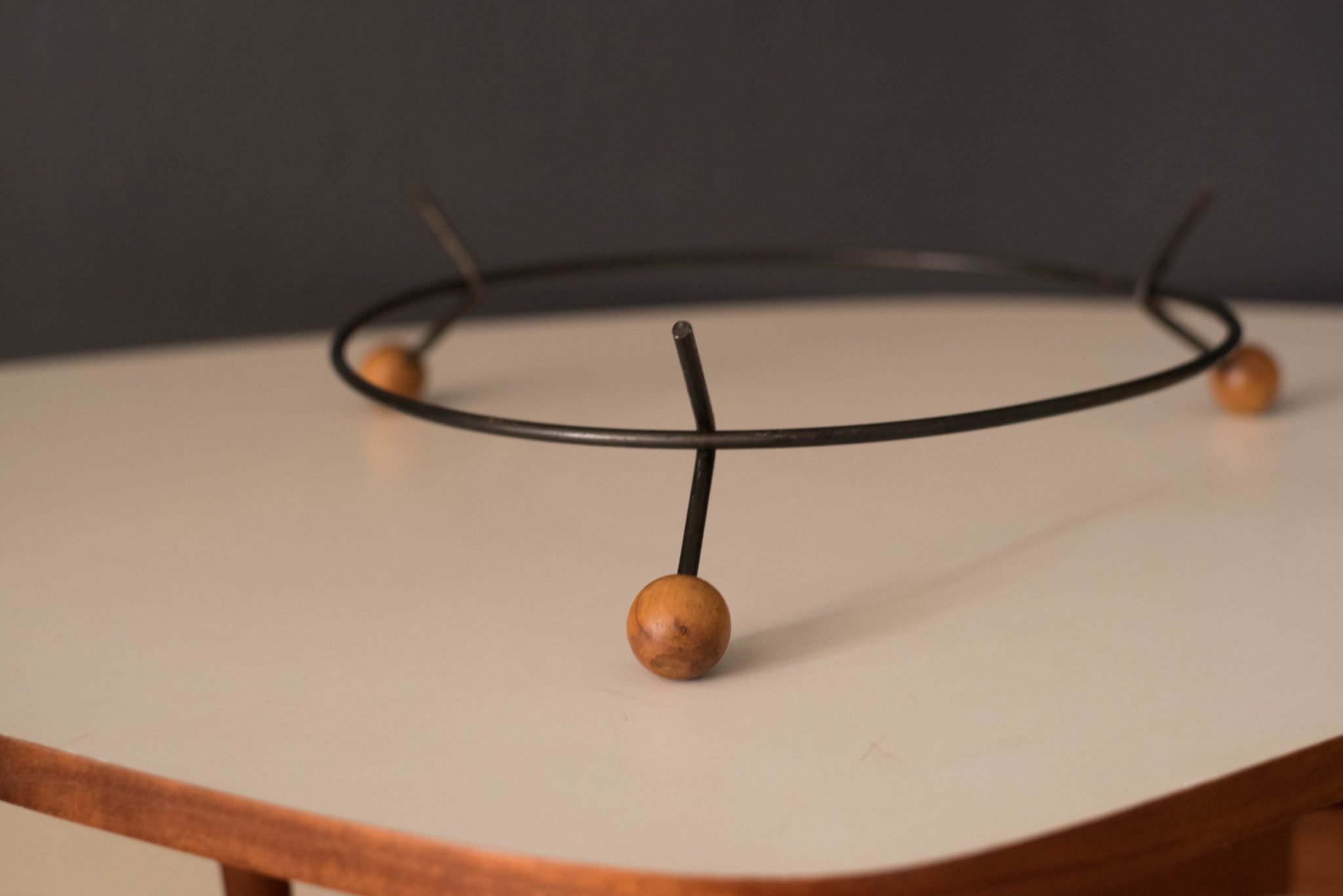 Vintage catchall decorative centerpiece tray, circa 1960s. This versatile display piece is perfect for stashing your belongings and home accessories. Includes a wide fiberglass bowl with a unique interior leaf inlay. Features a supporting iron ring stand complemented with wooden ball feet.
