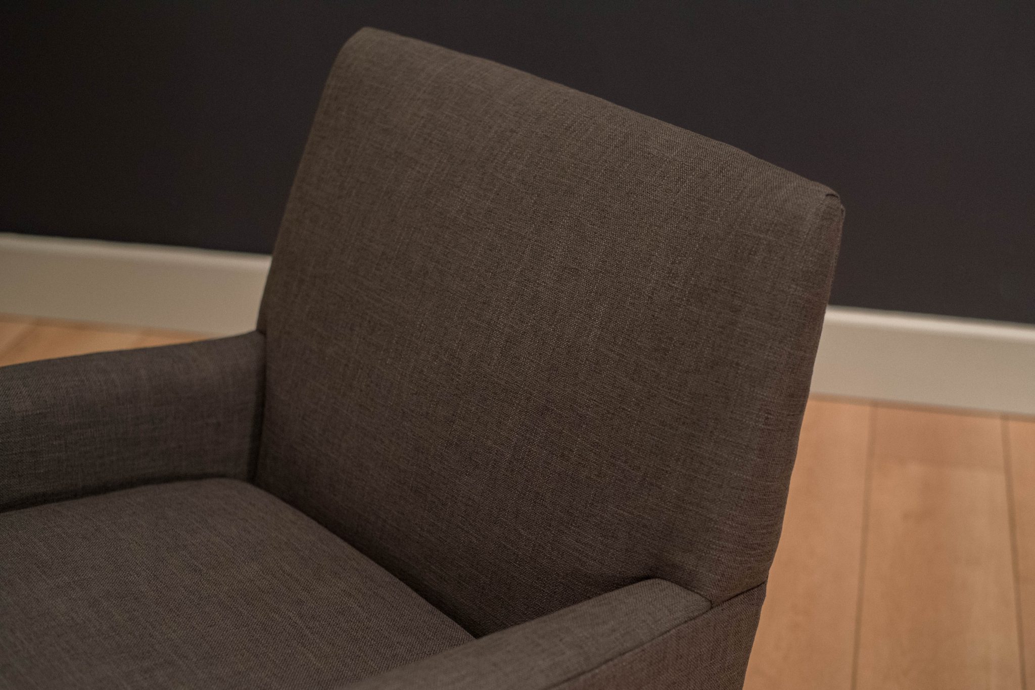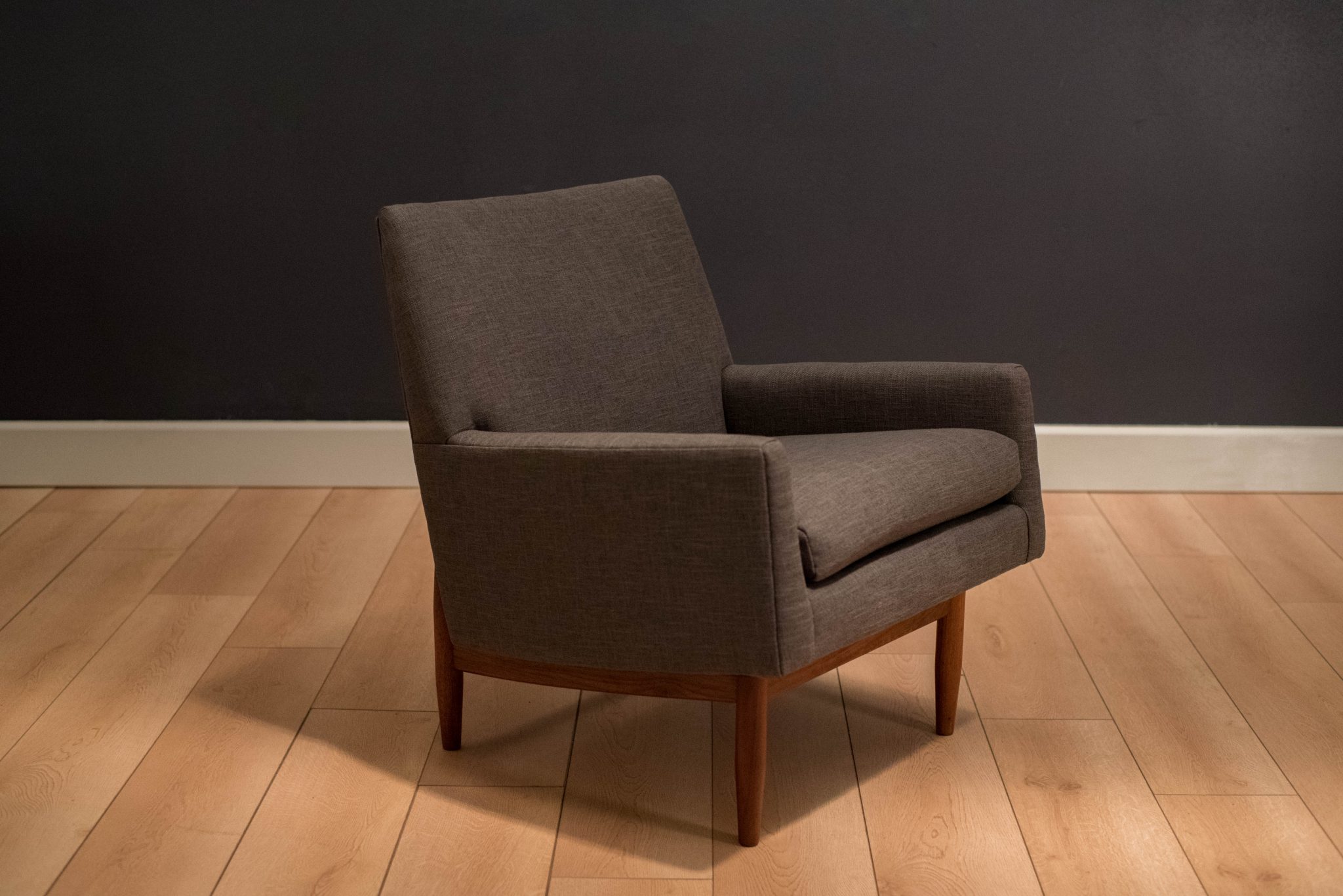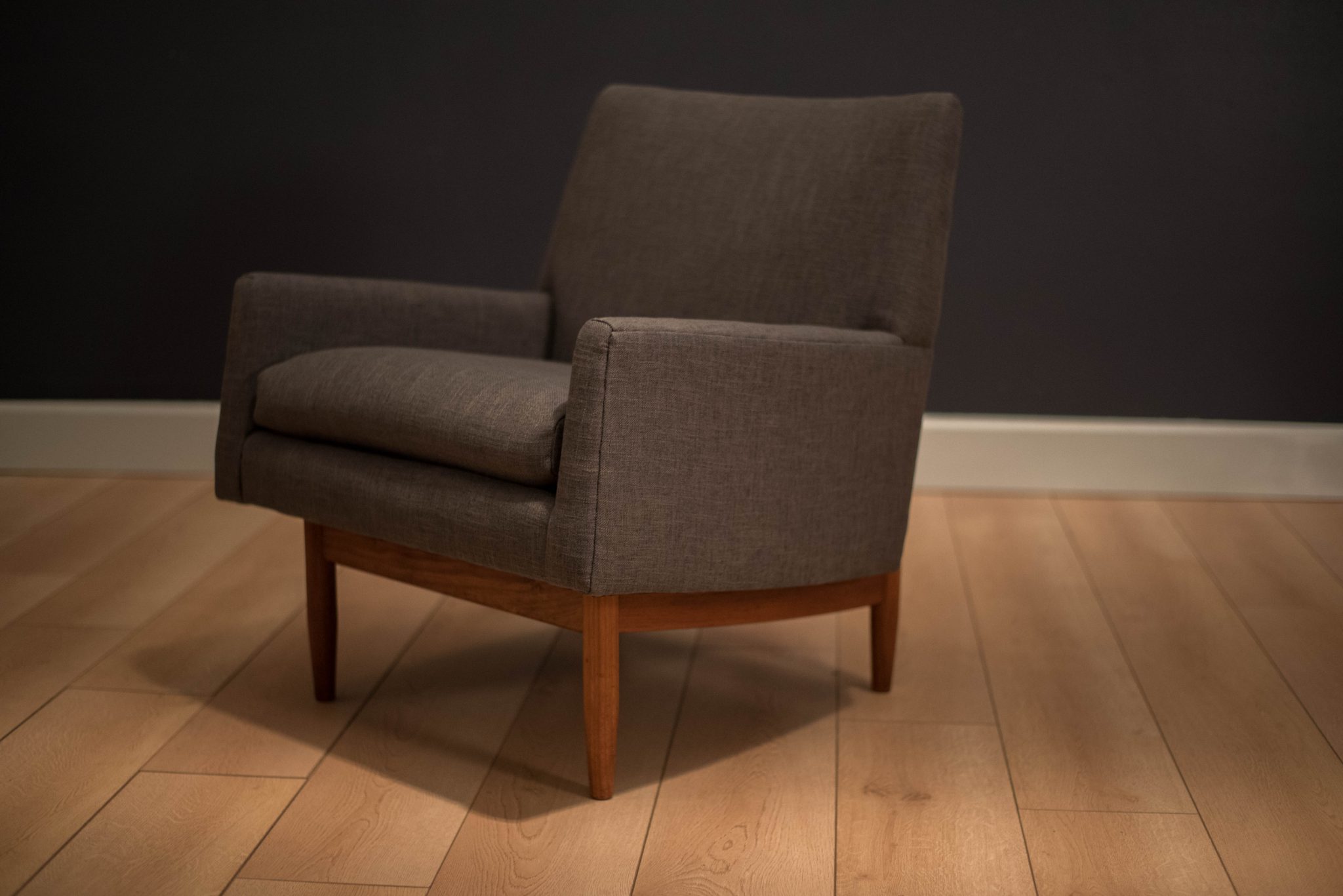 Mid-Century Club Chair designed by Jens Risom. This piece has a unique solid walnut frame and has been professionally reupholstered in a charcoal grey twill fabric. In great condition with minimal vintage wear.