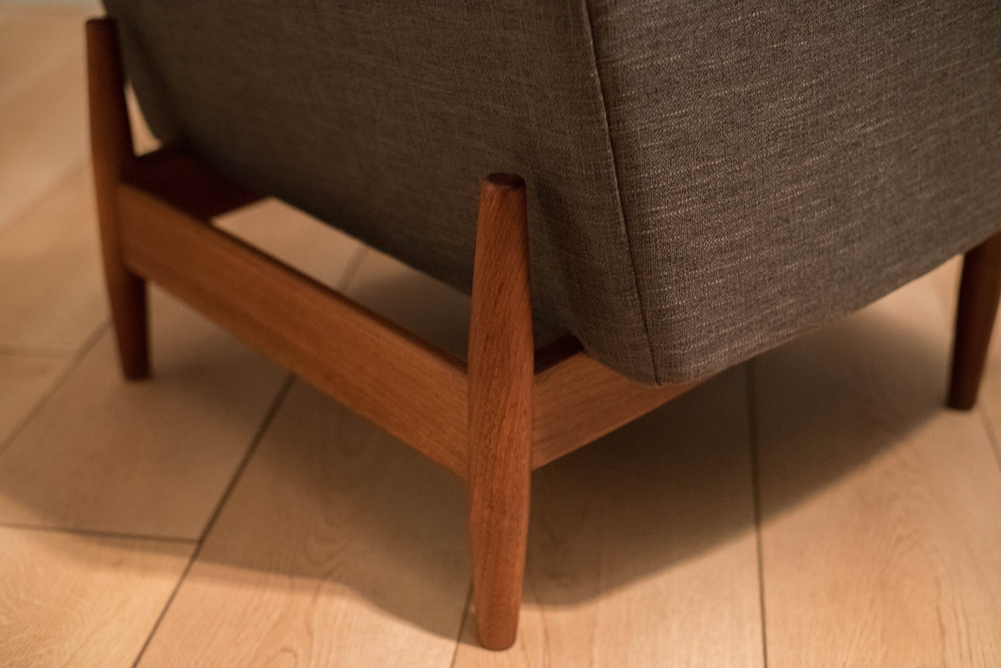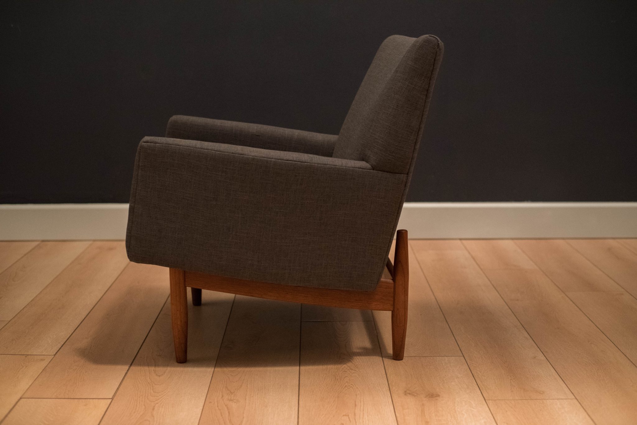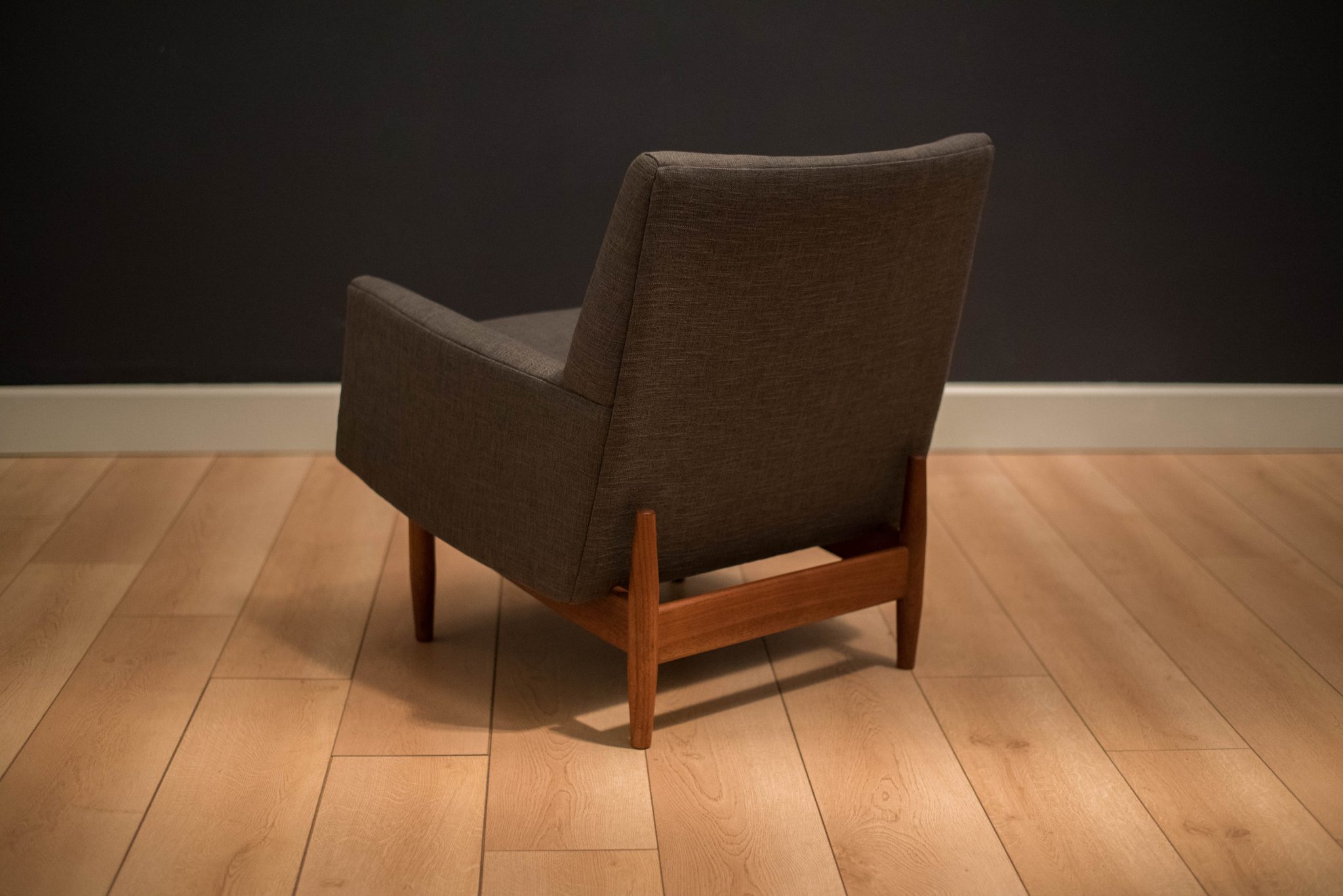 Mid-Century Club Chair designed by Jens Risom. This piece has a unique solid walnut frame and has been professionally reupholstered in a charcoal grey twill fabric. In great condition with minimal vintage wear.