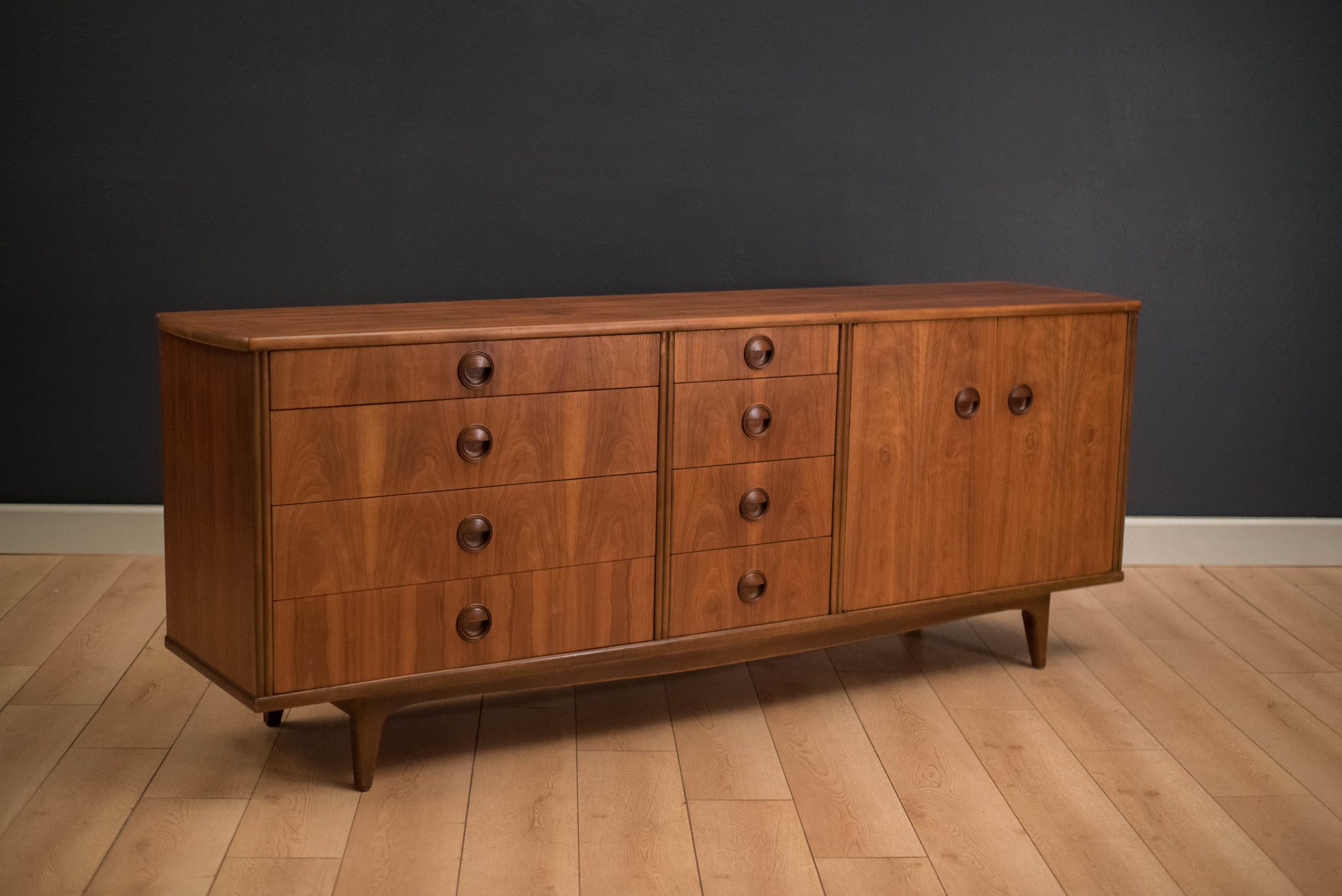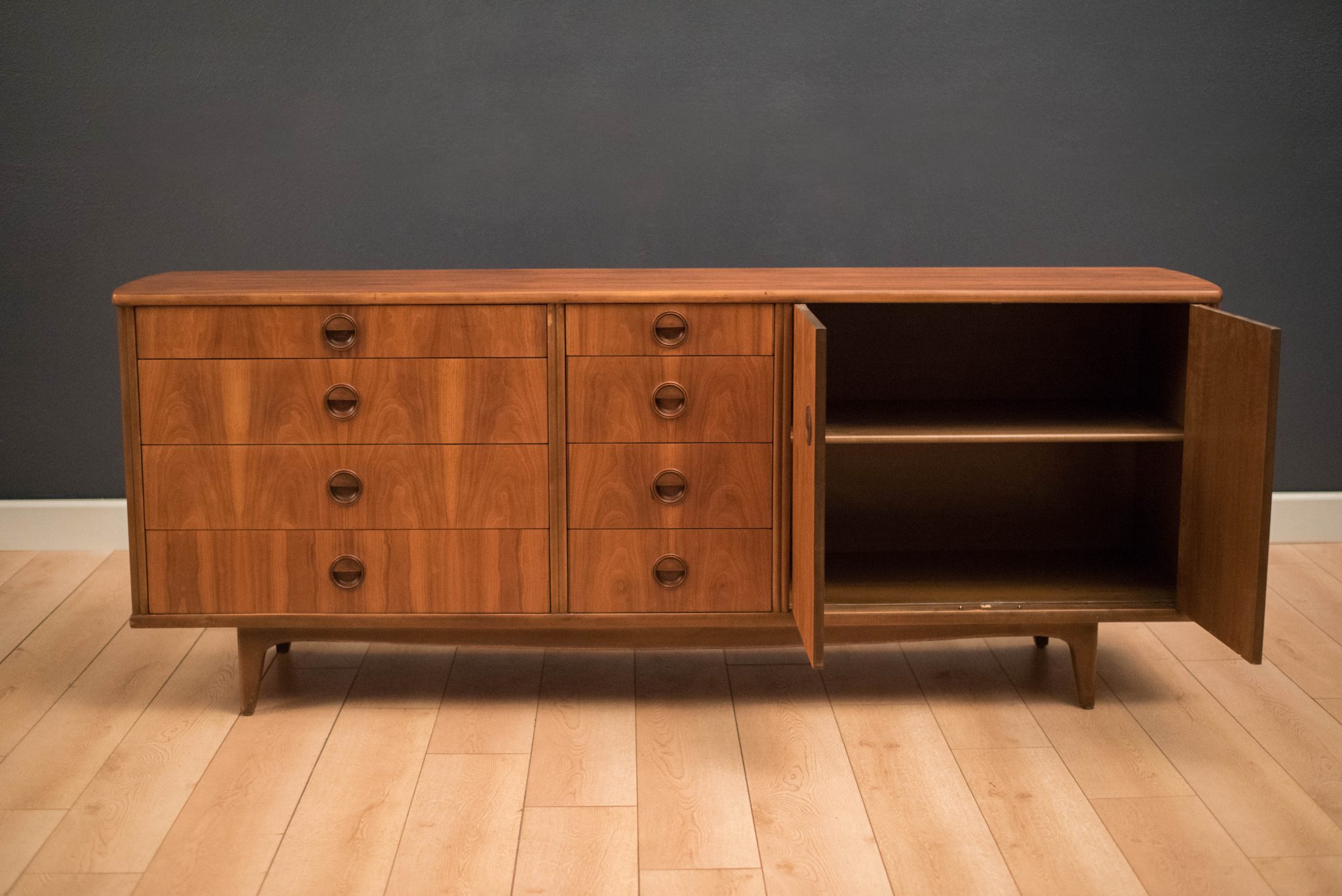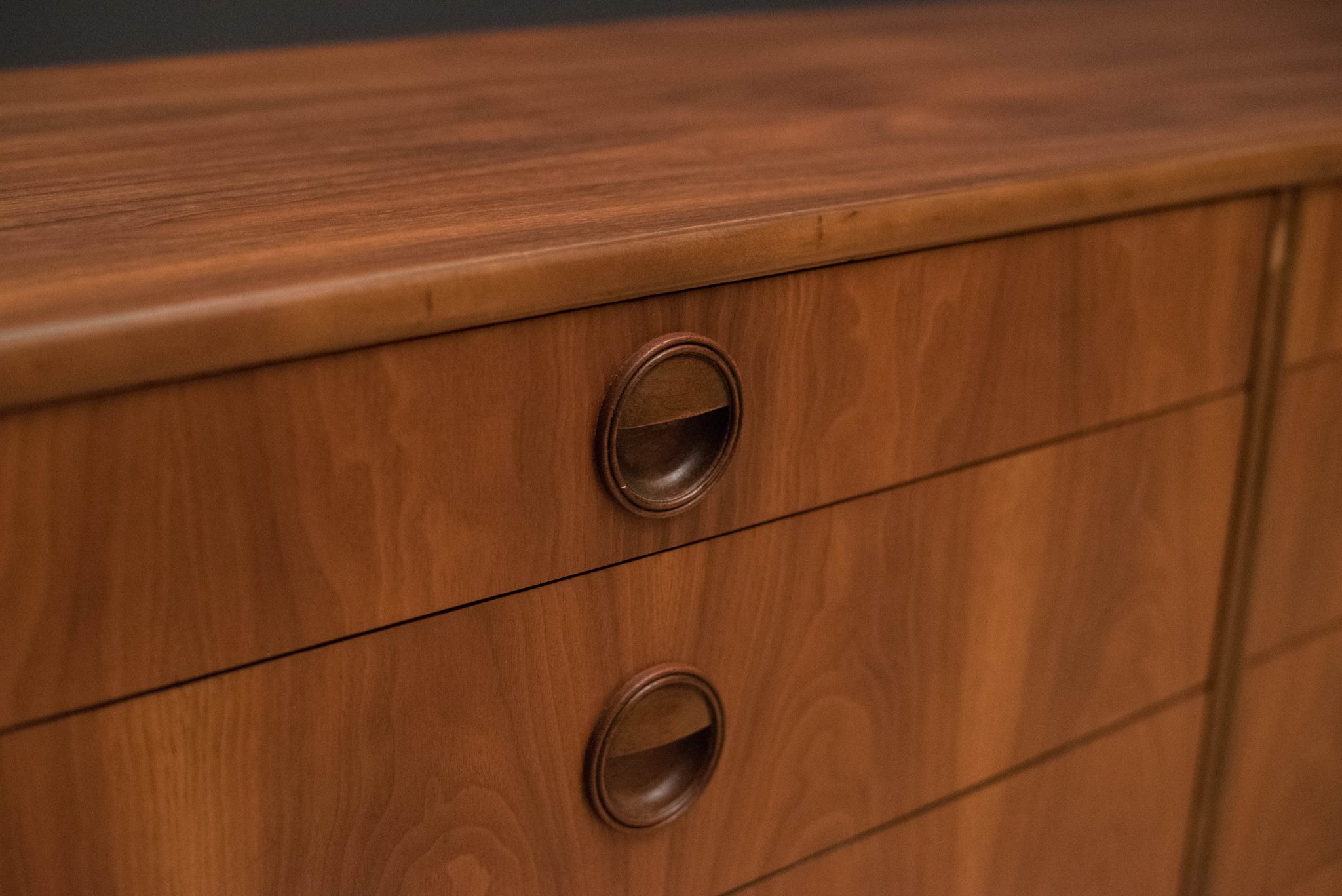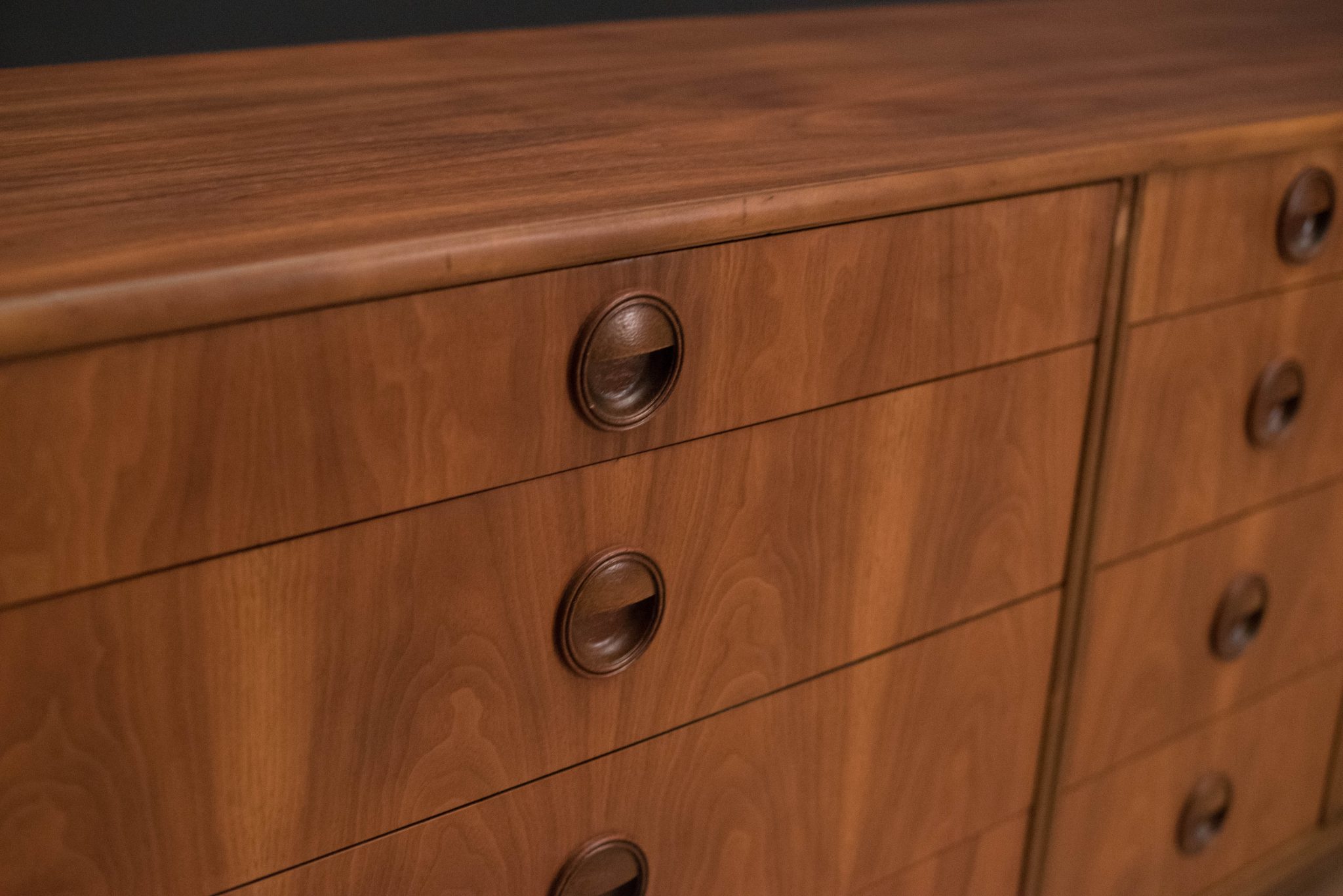 Mid century extra long dresser in walnut made by Langstrom Furniture. This piece is equipped with eight dovetailed drawers and open storage space with one adjustable shelf. This versatile piece can function as a storage credenza or dining room buffet.