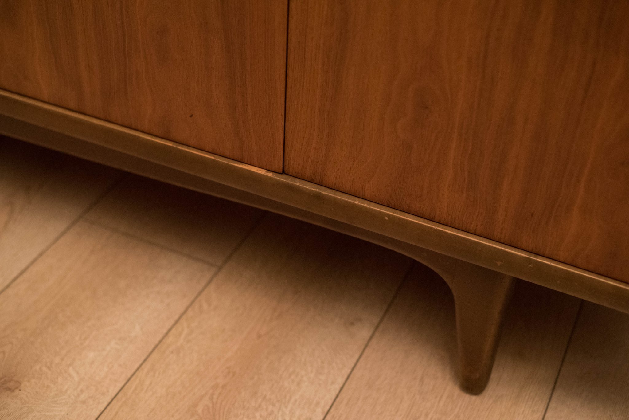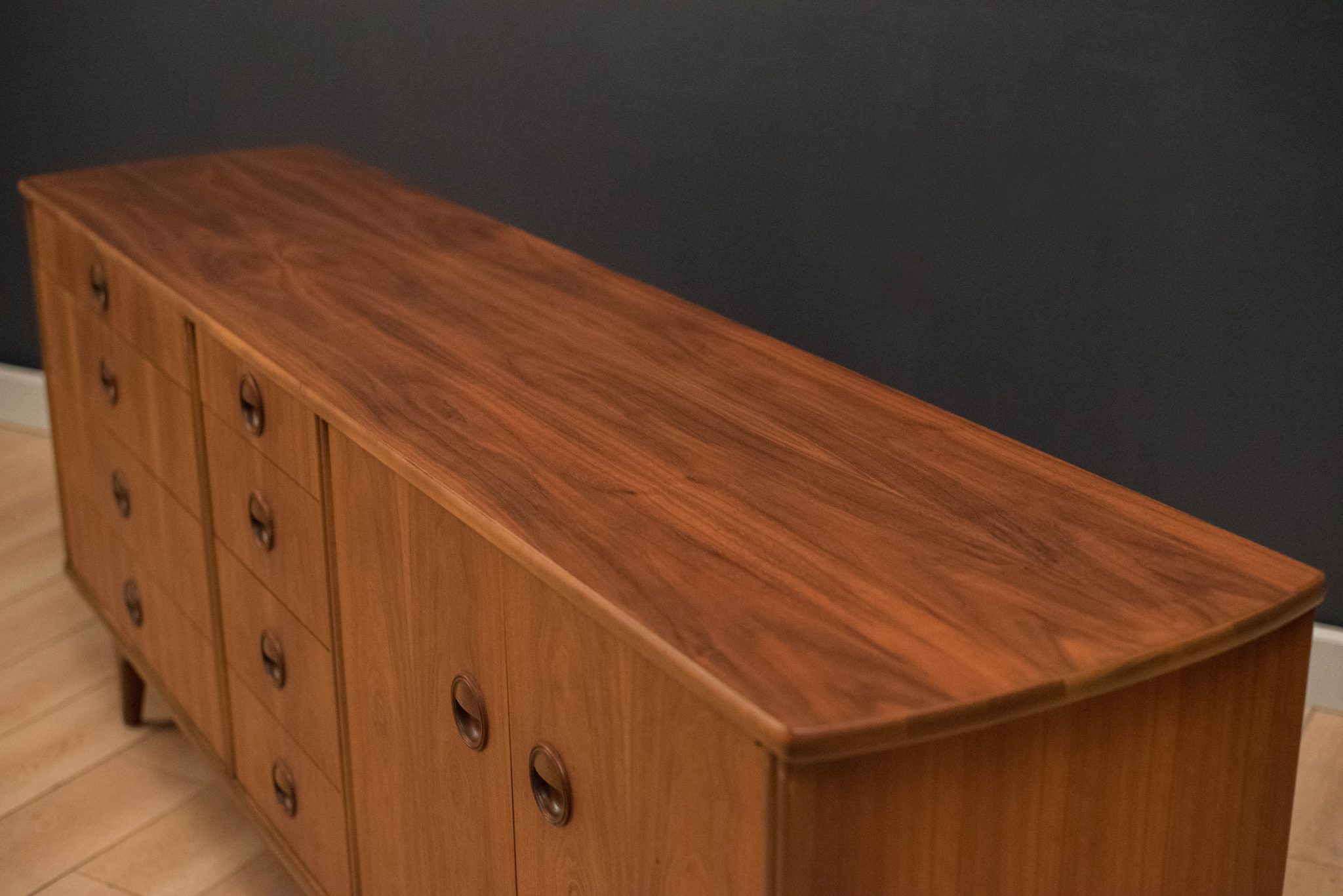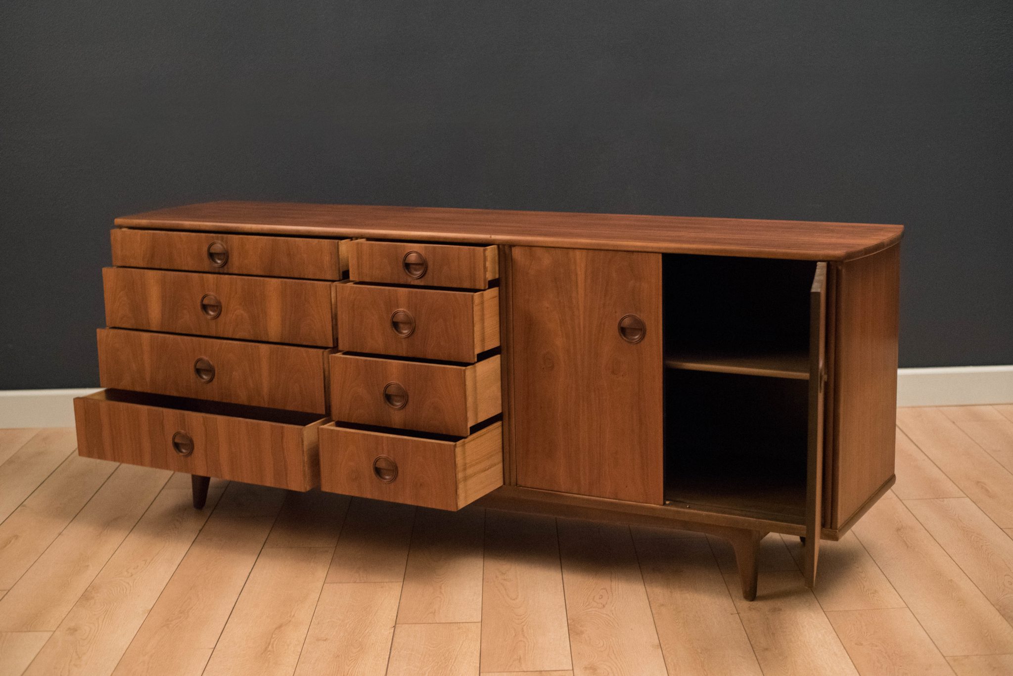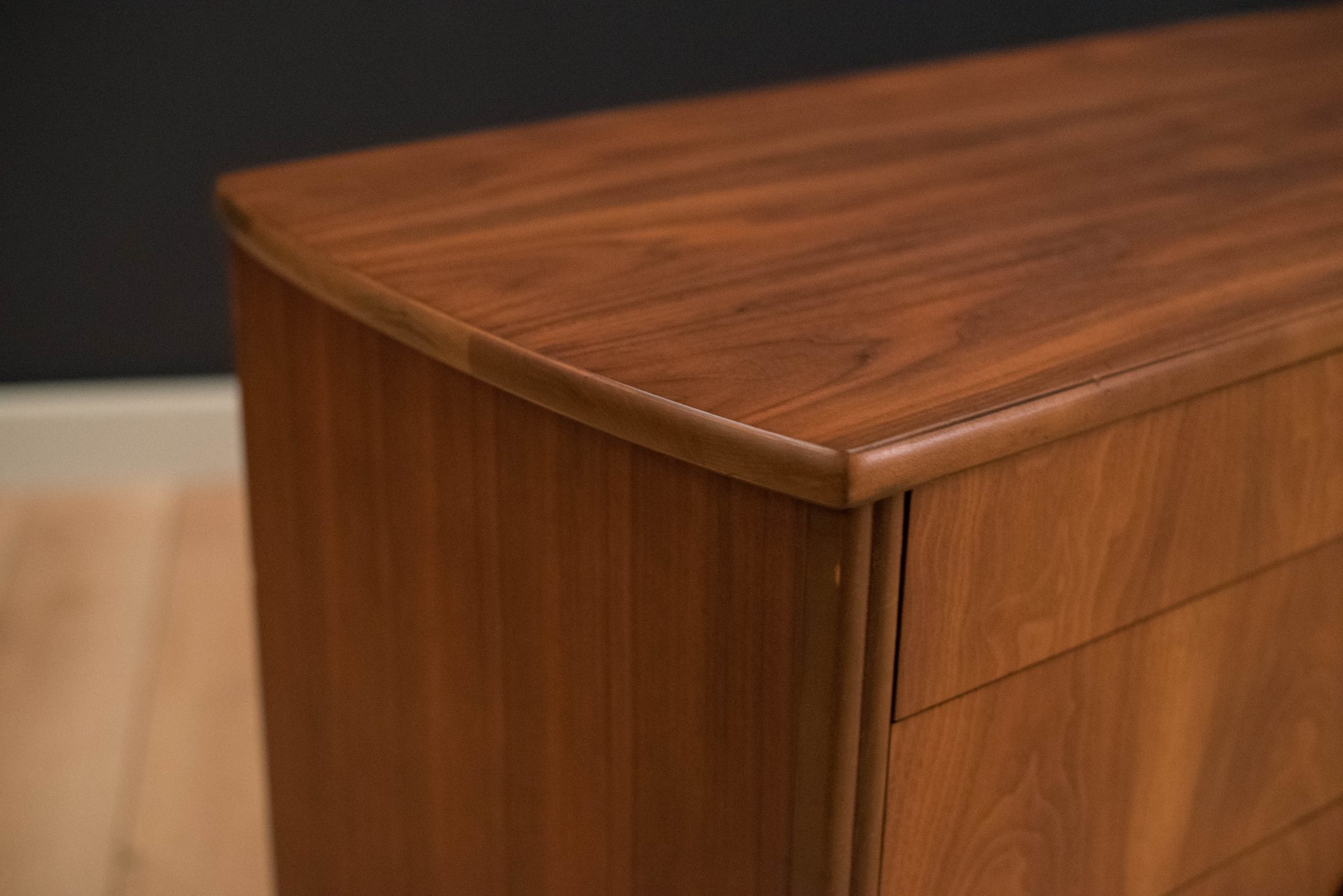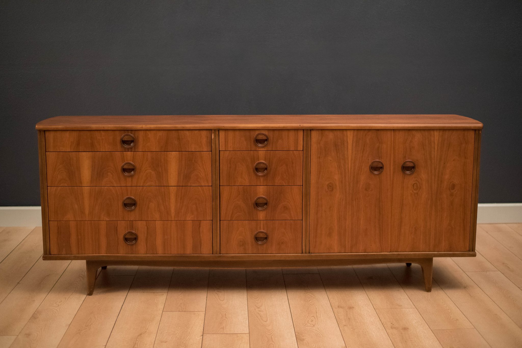 Mid century extra long dresser in walnut made by Langstrom Furniture. This piece is equipped with eight dovetailed drawers and open storage space with one adjustable shelf. This versatile piece can function as a storage credenza or dining room buffet.