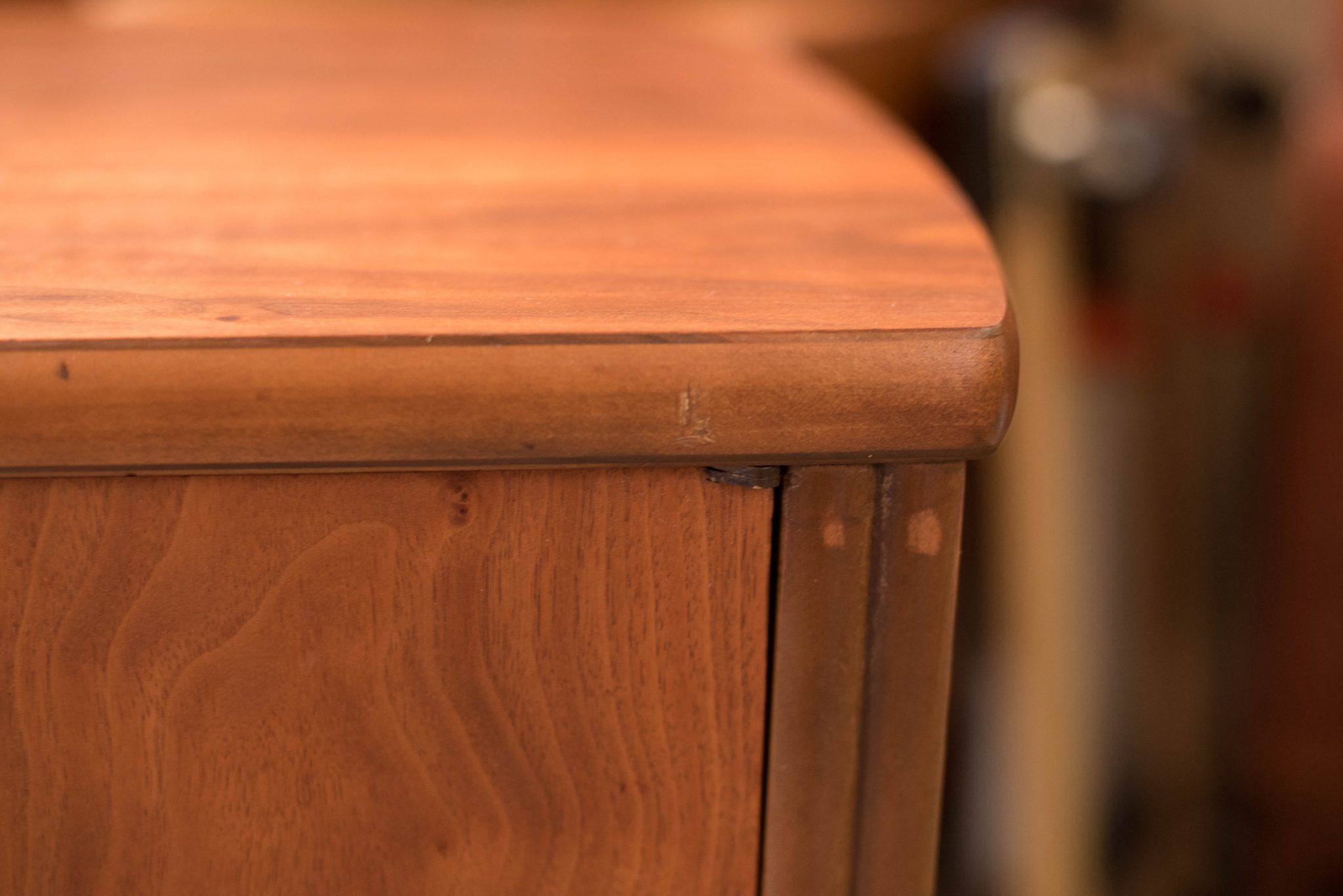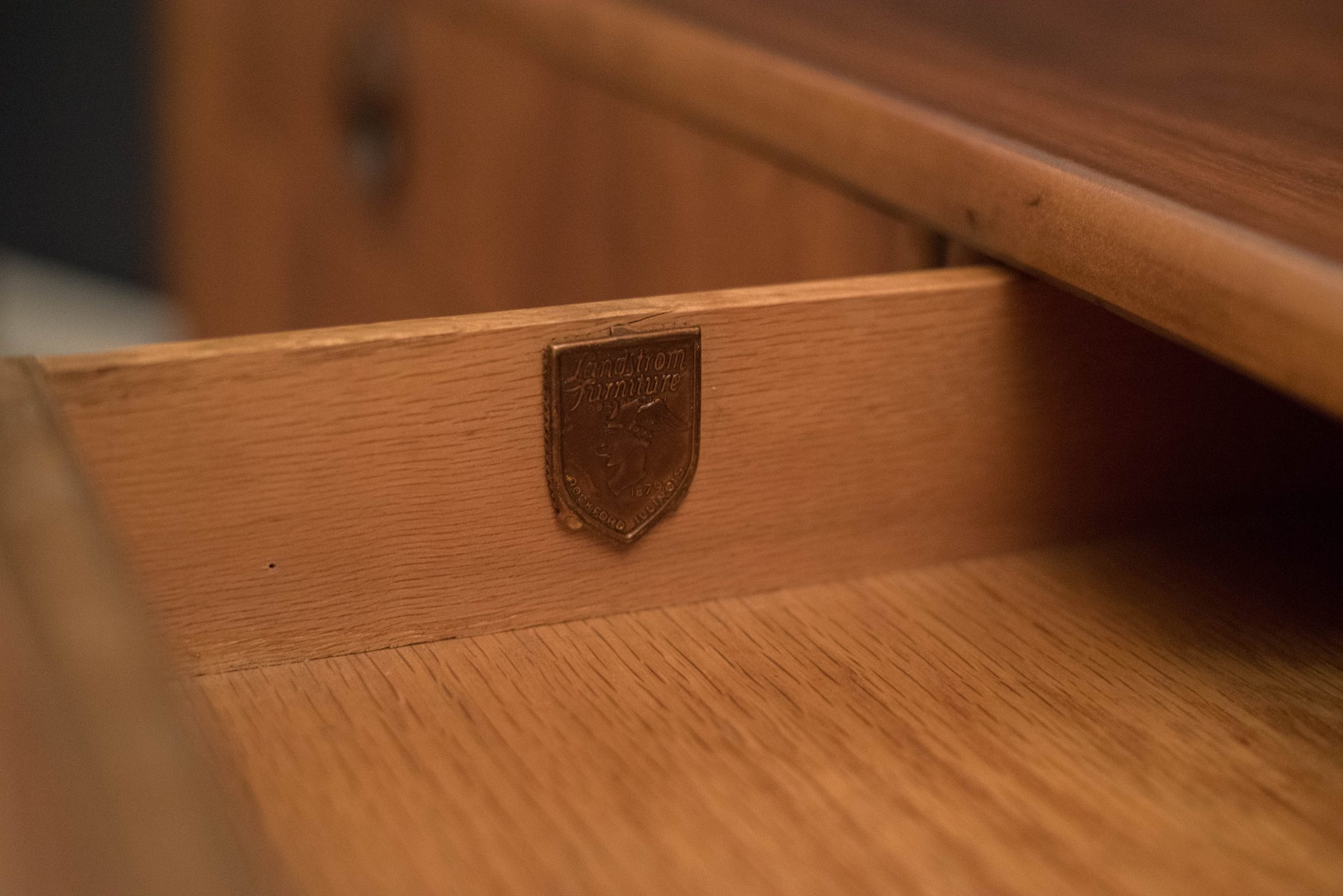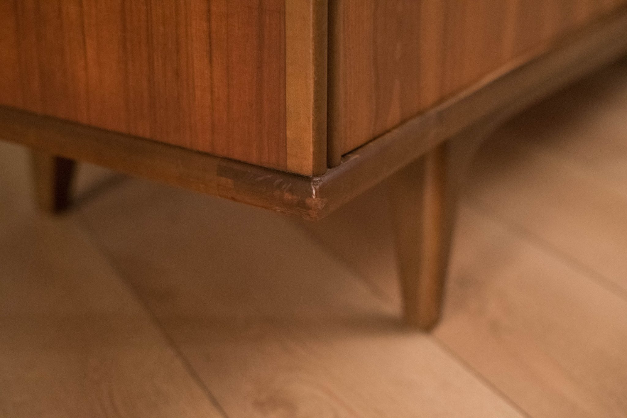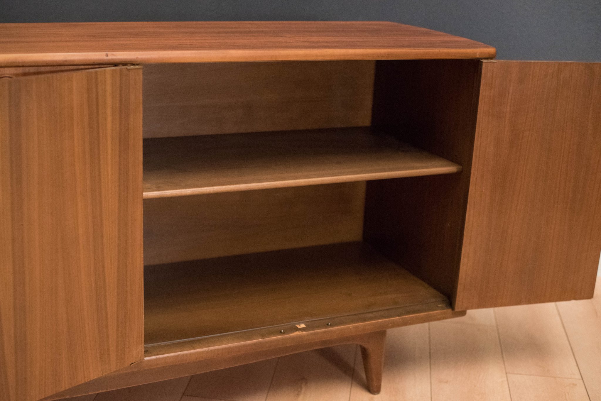 Mid century extra long dresser in walnut made by Langstrom Furniture. This piece is equipped with eight dovetailed drawers and open storage space with one adjustable shelf. This versatile piece can function as a storage credenza or dining room buffet.