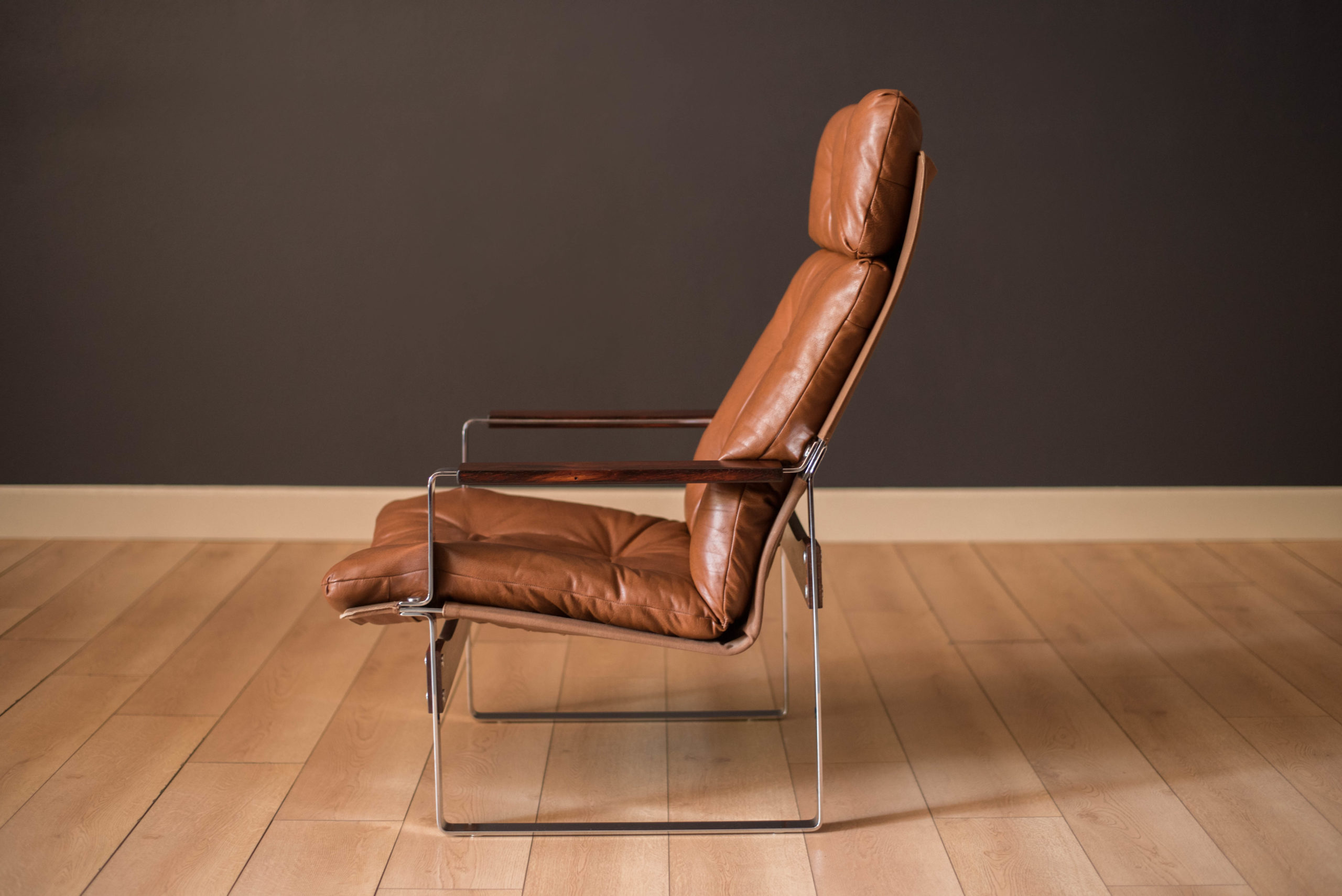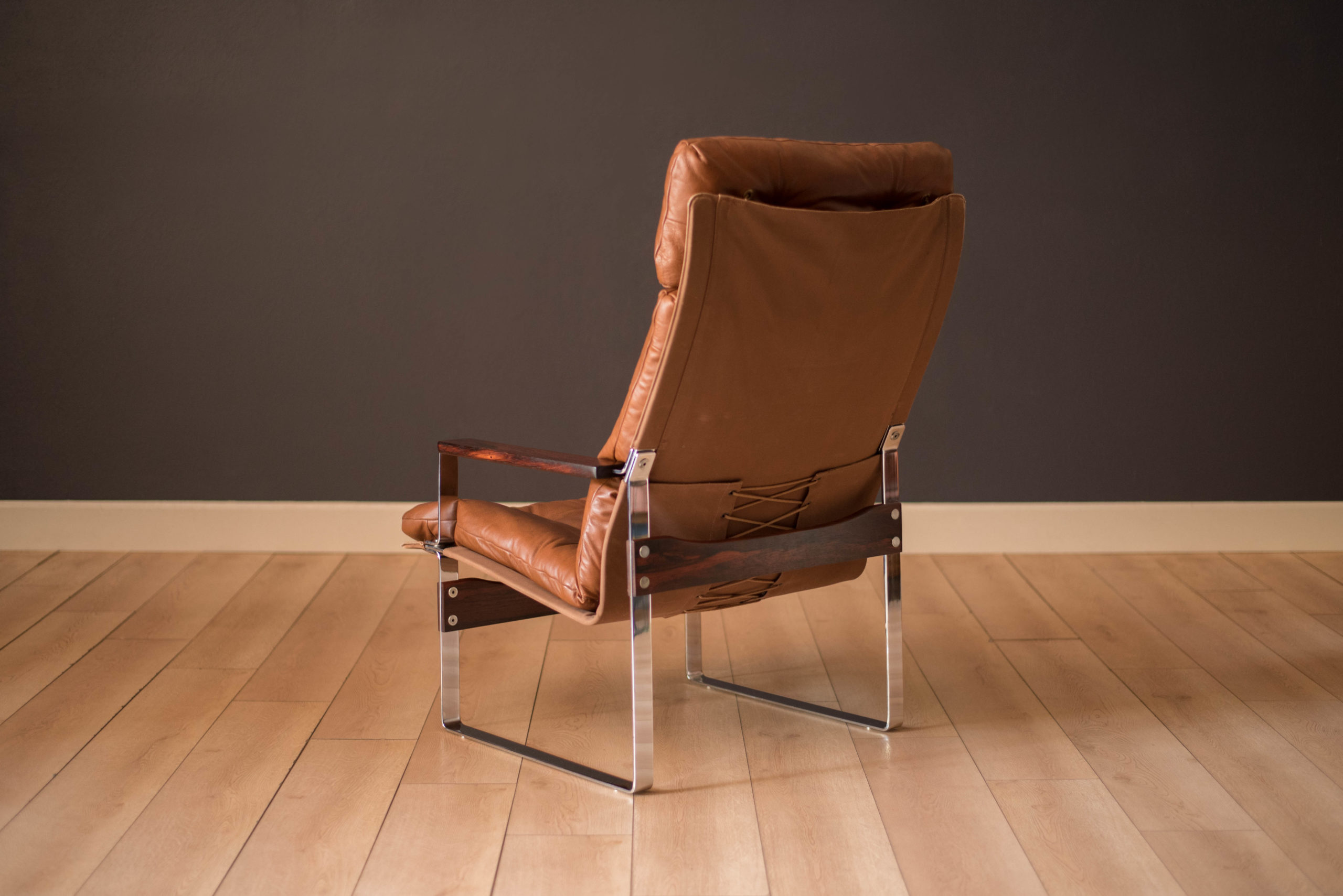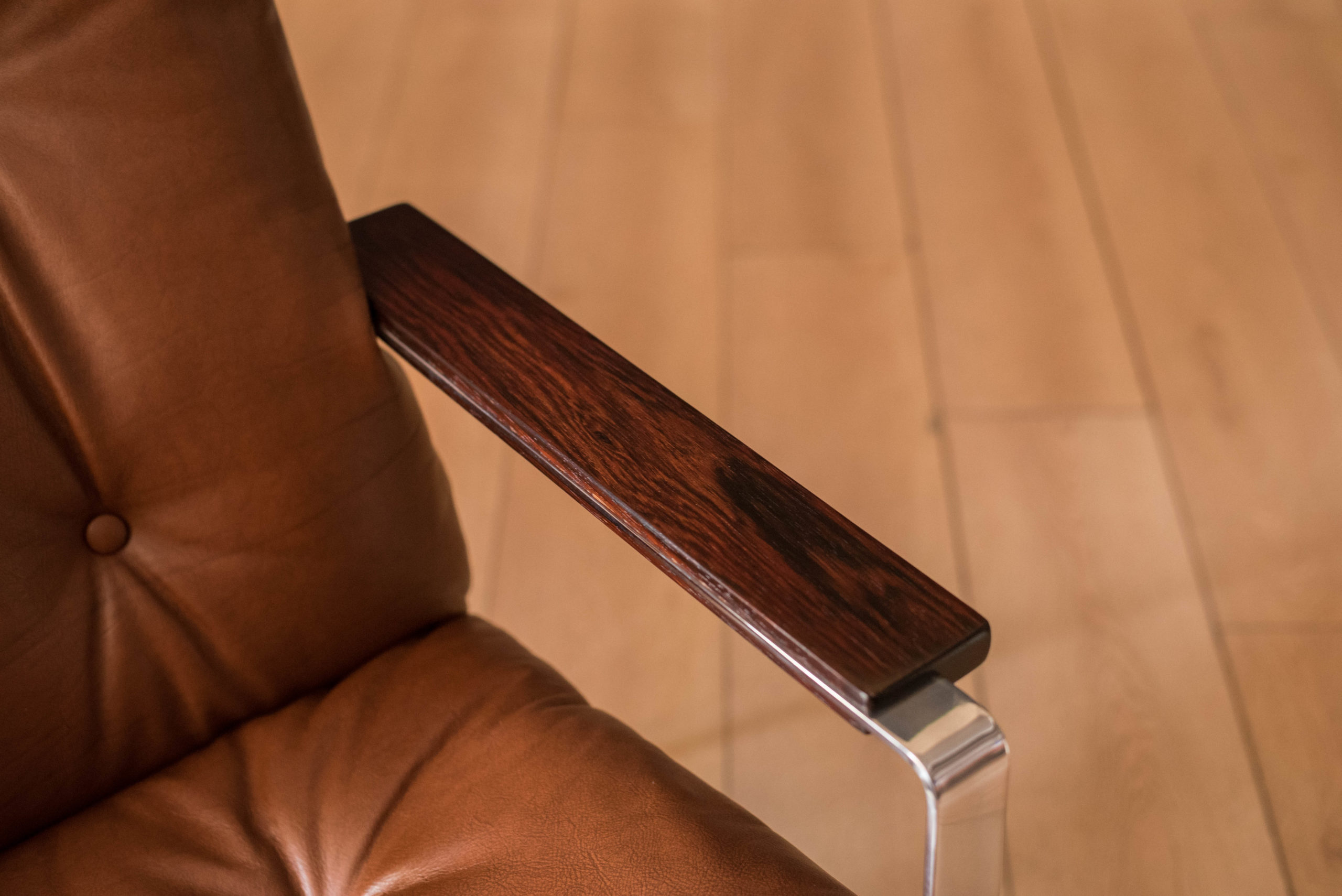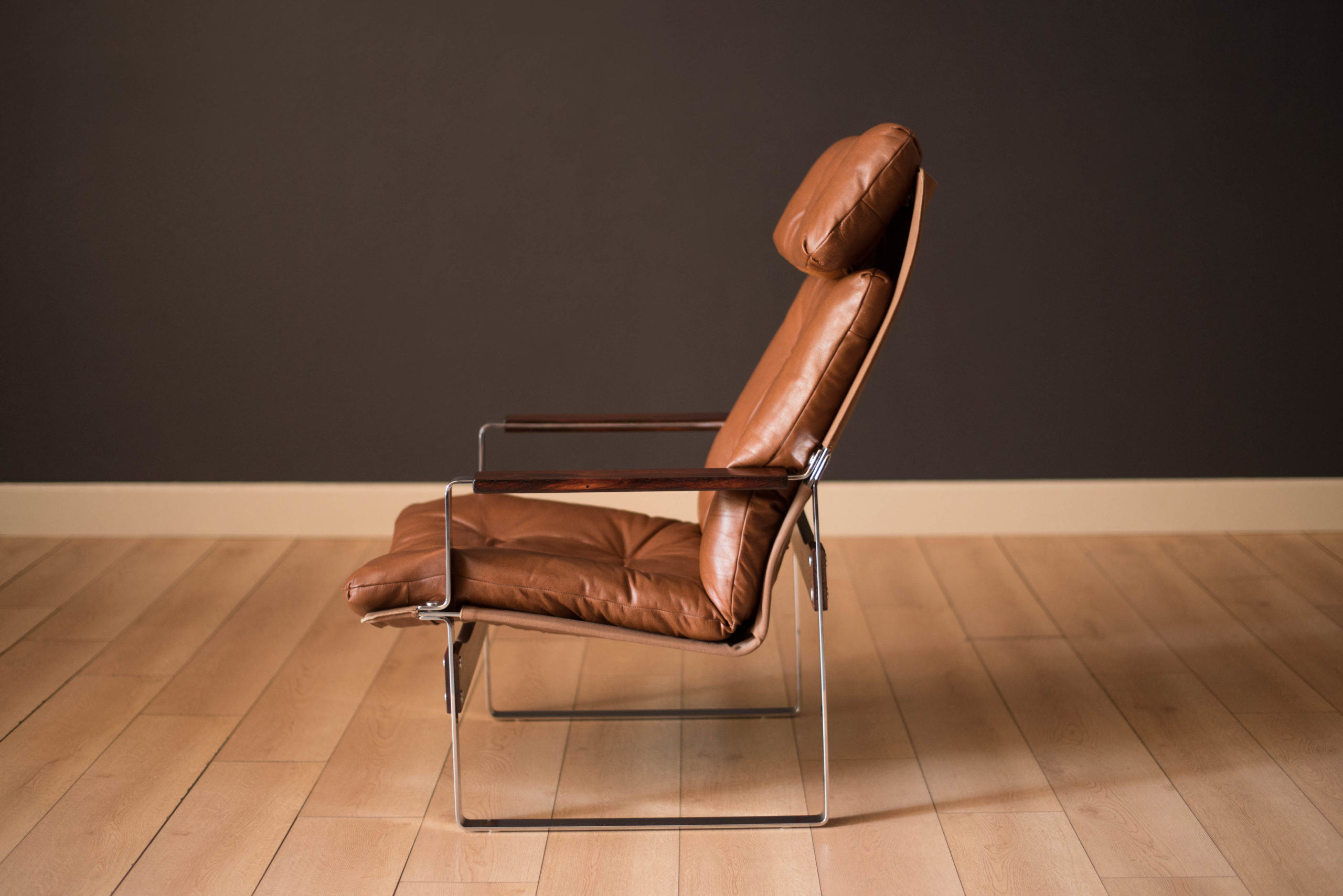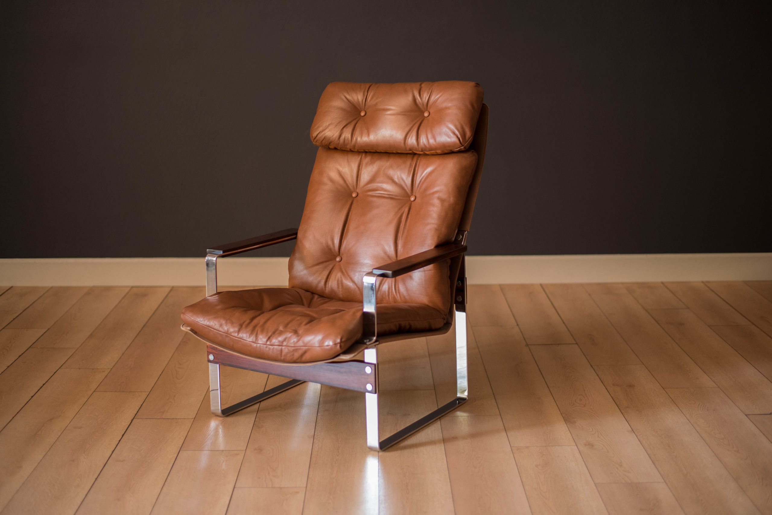 Vintage high back rosewood armchair designed by Richard Young for Merrow Associates circa 1970’s. Features comfortable down cushion seating in chestnut brown leather supported by a sculptural chrome base. Perfect to use as a corner or accent lounge chair.