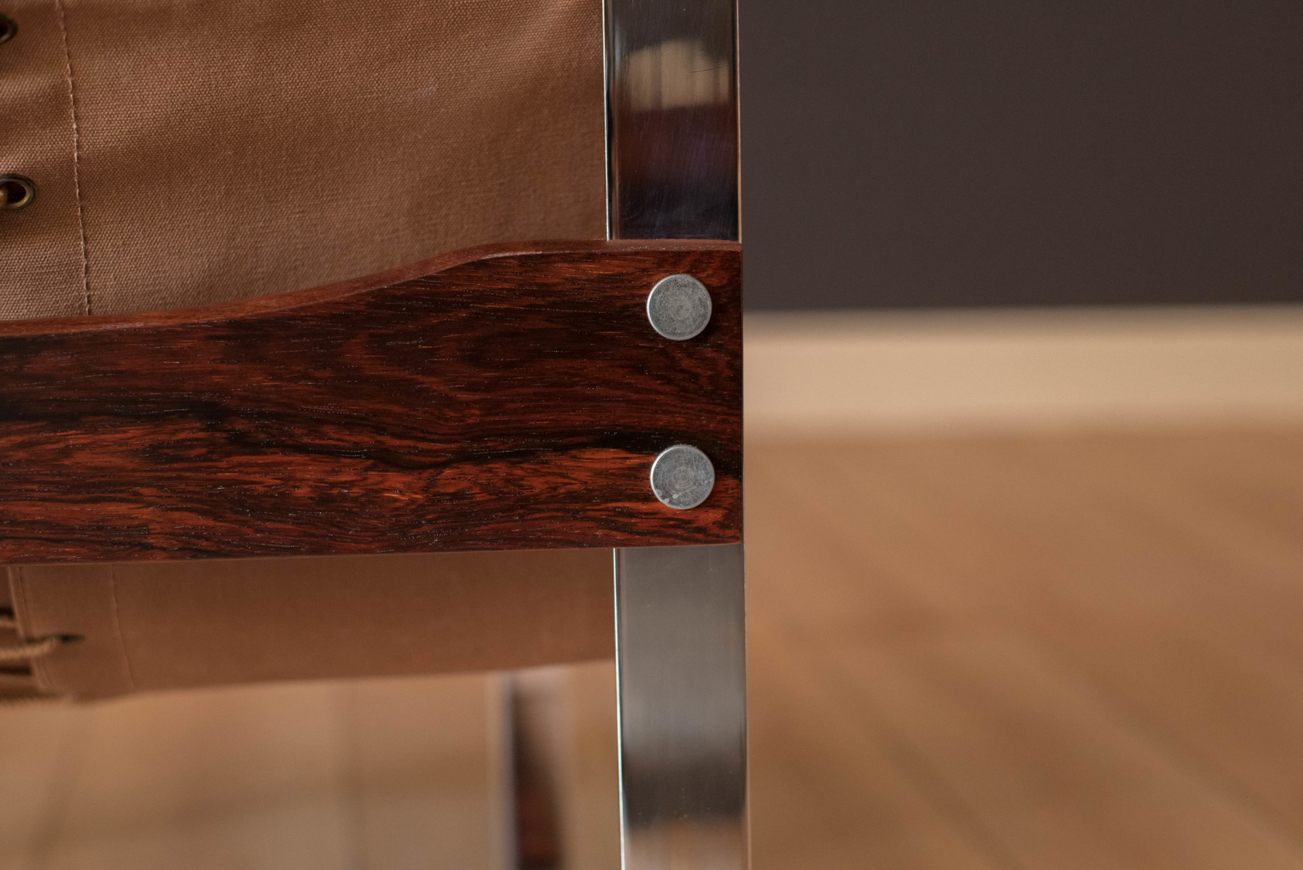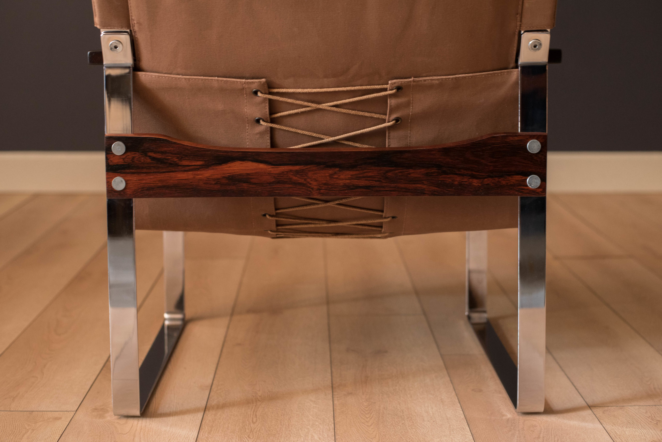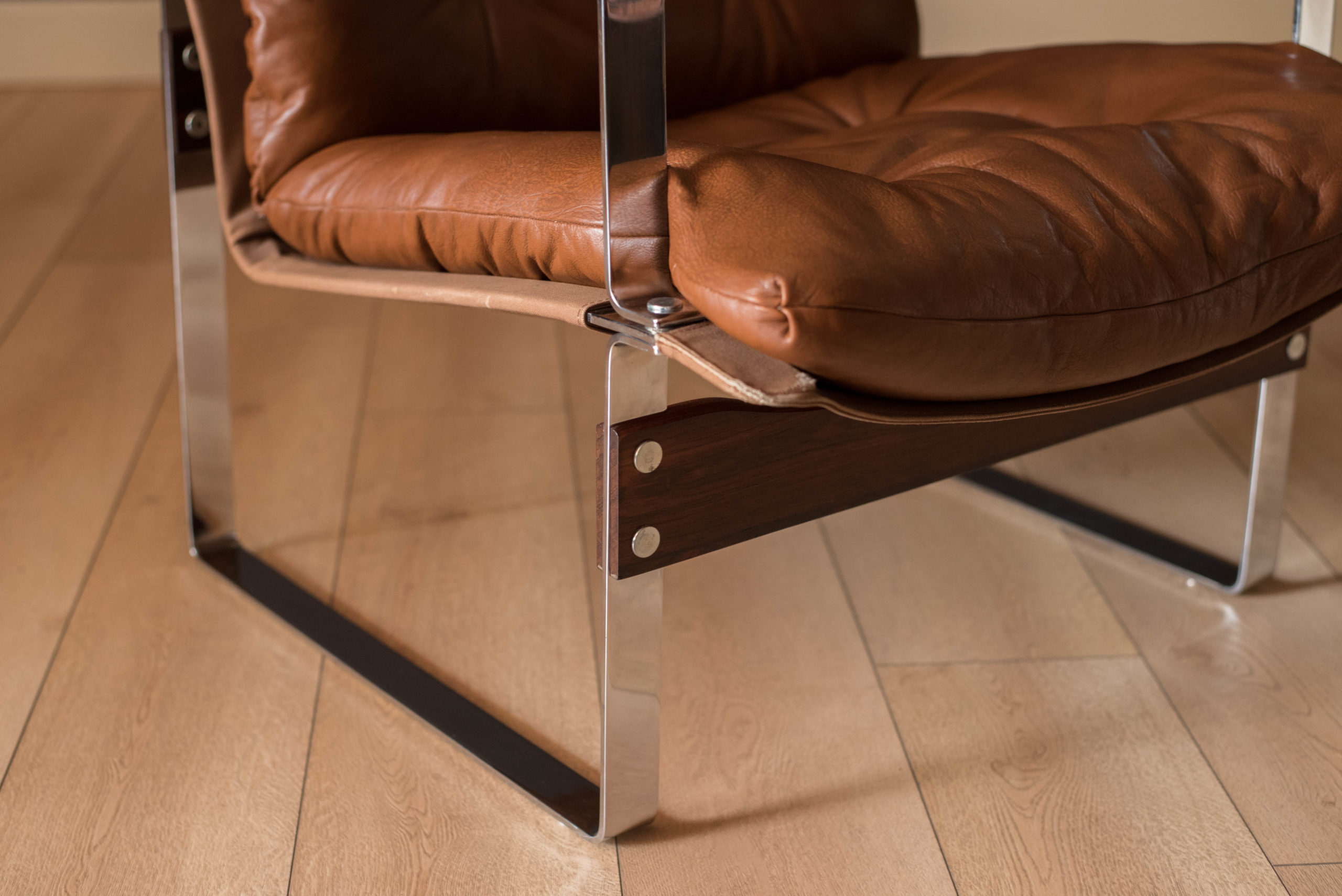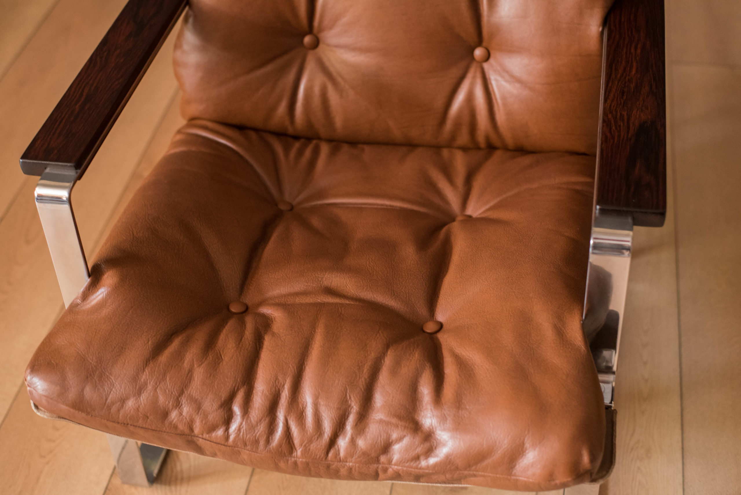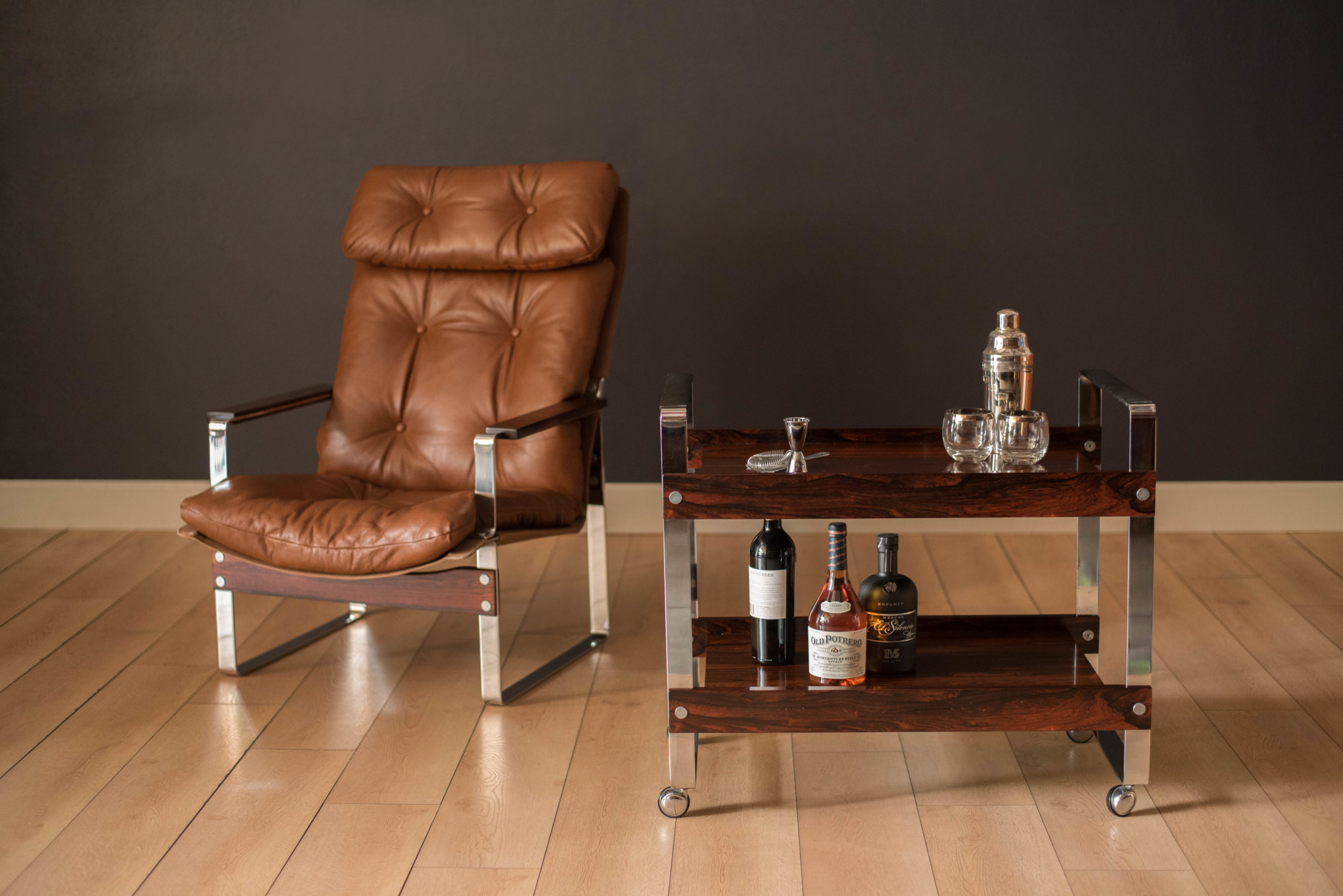 Vintage high back rosewood armchair designed by Richard Young for Merrow Associates circa 1970’s. Features comfortable down cushion seating in chestnut brown leather supported by a sculptural chrome base. Perfect to use as a corner or accent lounge chair.