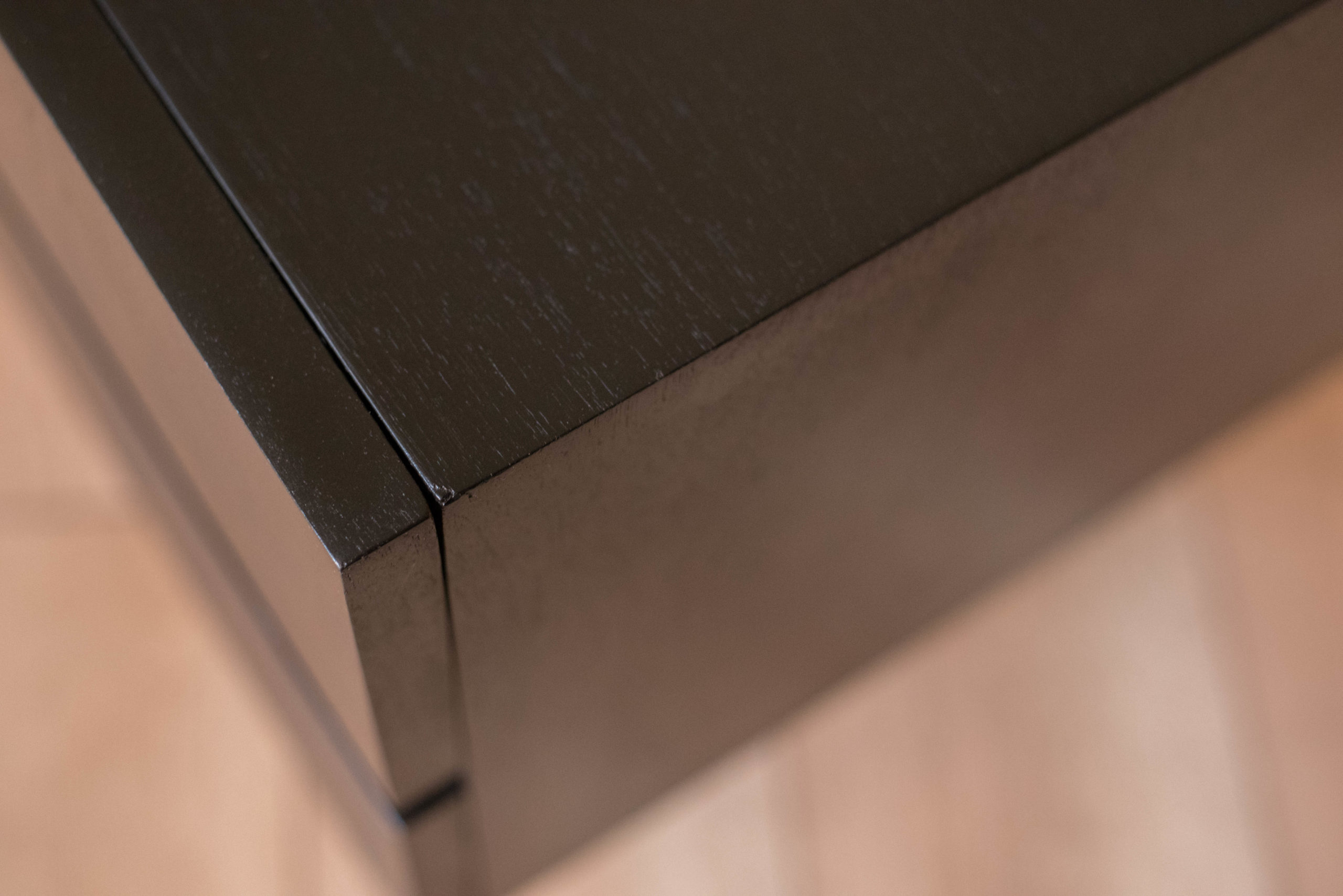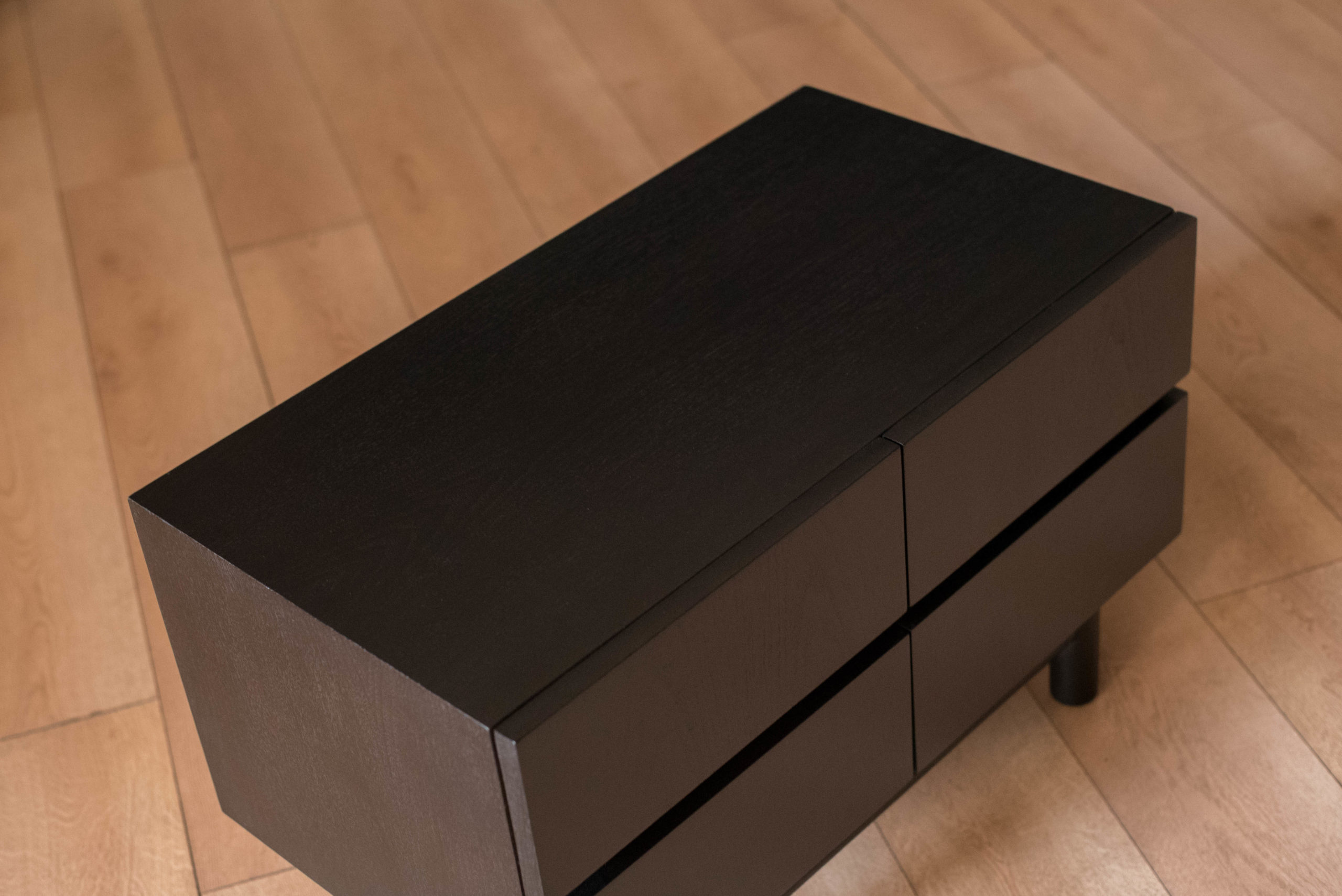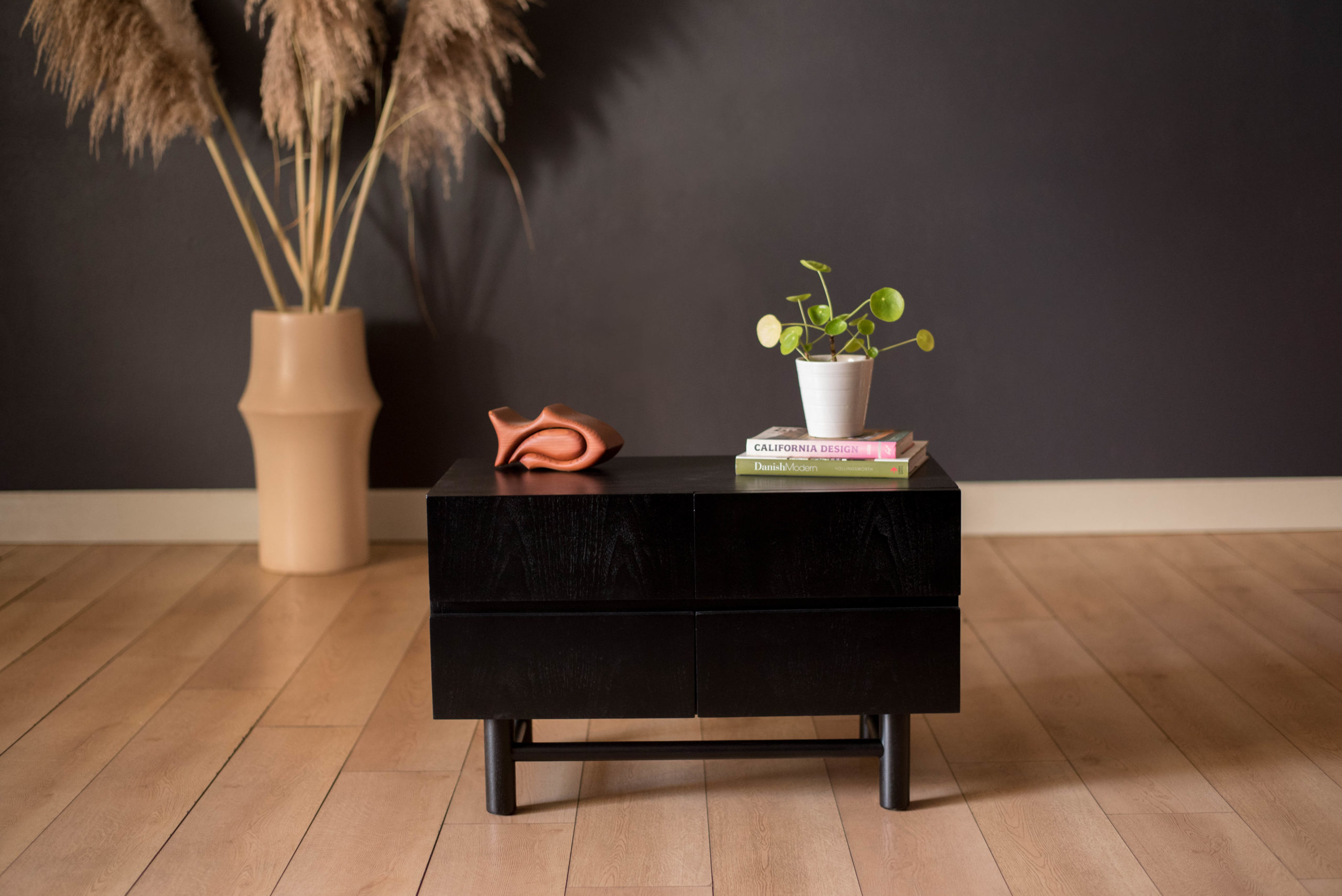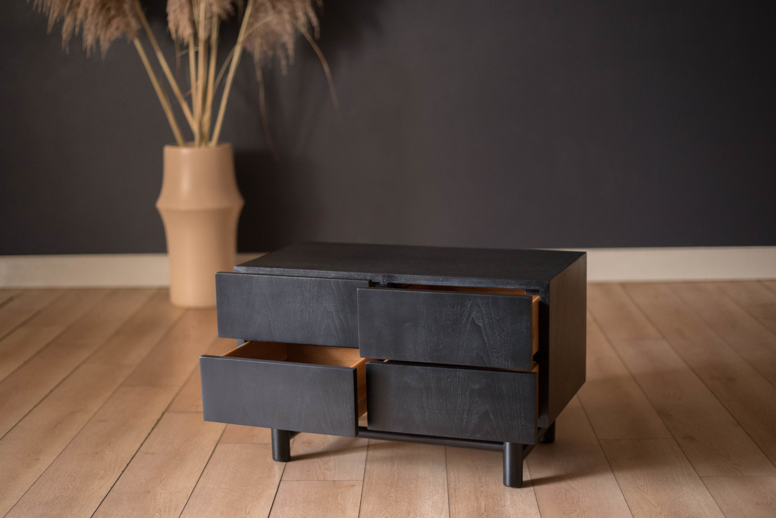 Vintage low chest of drawers manufactured by American of Martinsville, circa 1960’s. This unique piece is lacquered in an ebony black finish featuring a seamless design of four drawers and a floating base. A functional small storage solution that can be displayed as a bedside nightstand, living room media console, or entryway table.